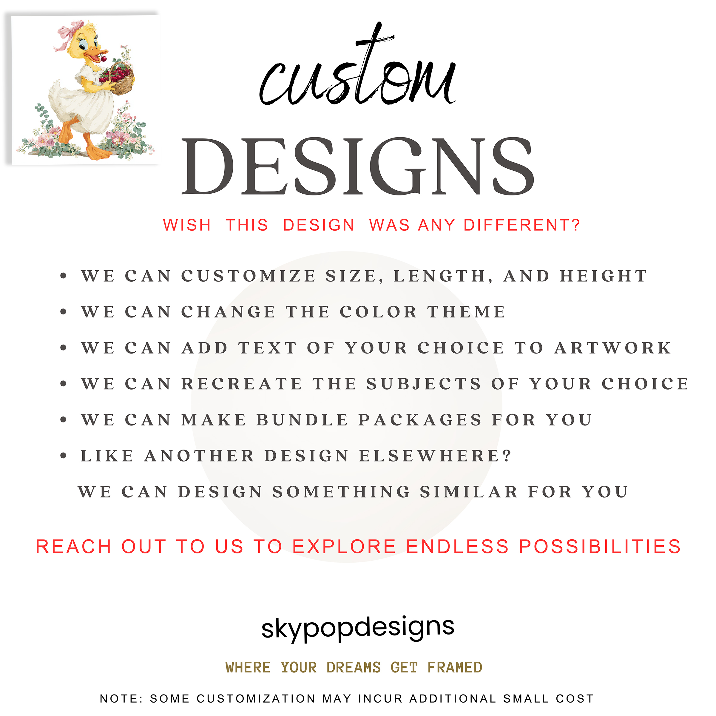 Looking for a custom design, or do you love a particular design but need it in a different size or orientation? Perhaps you’ve found a design elsewhere and wish for us to create something similar for you? Drop us a message! We’re dedicated to meeting your needs and will work closely with you to ensure your vision comes to life.