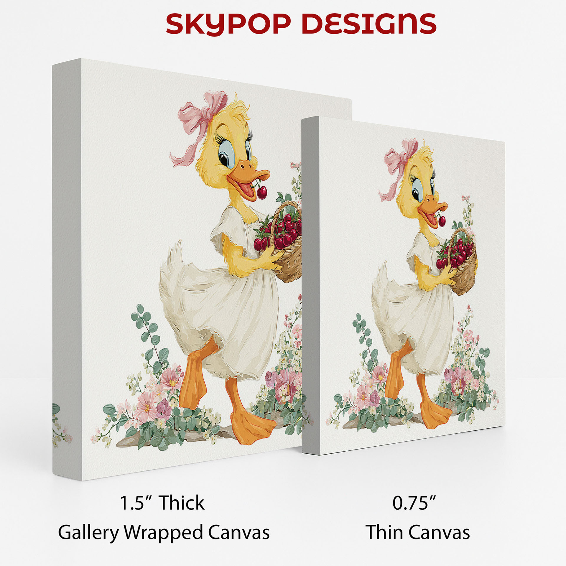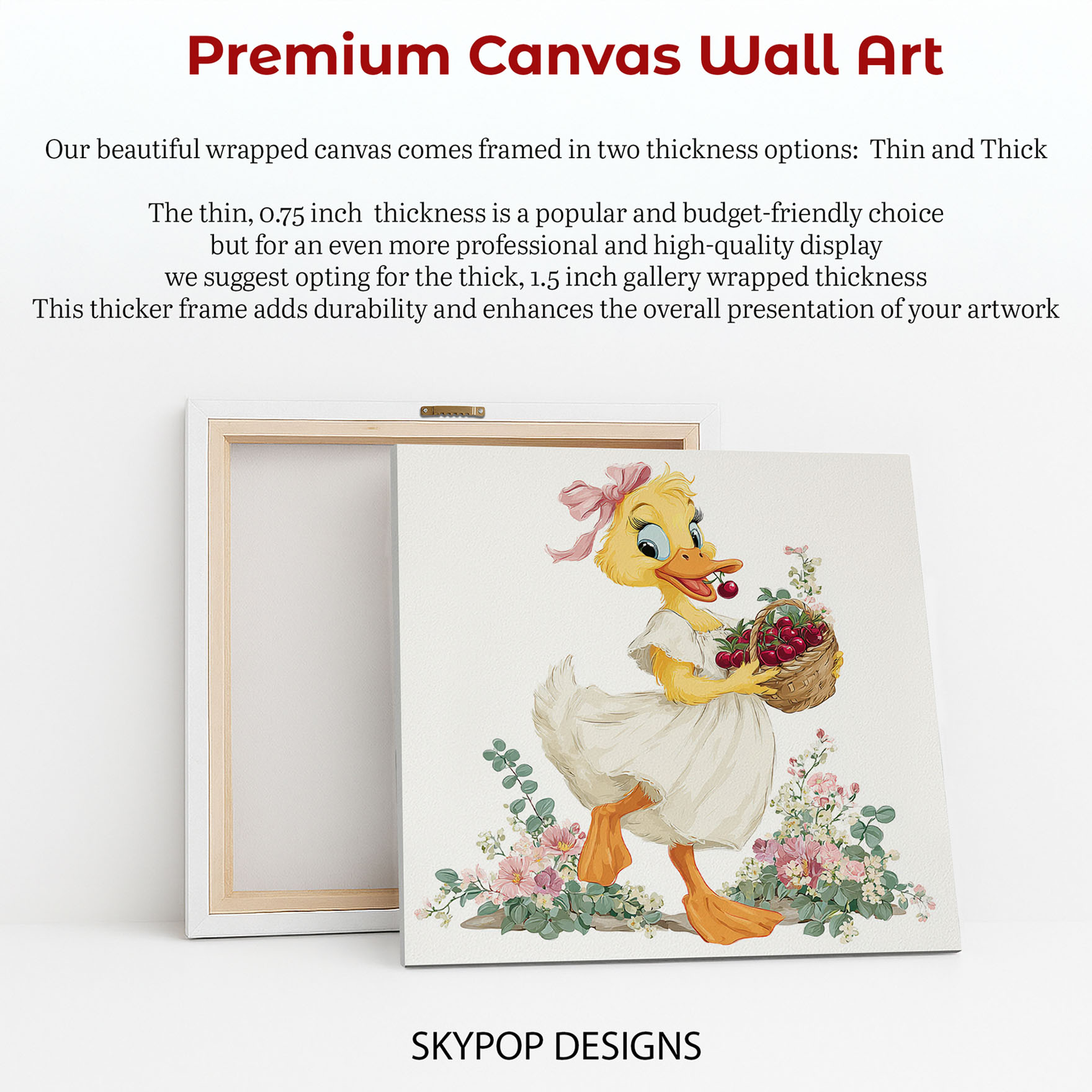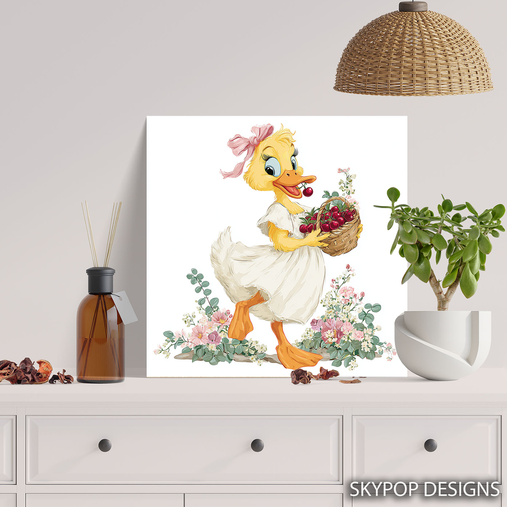 Bring a touch of whimsical charm to your space with this delightful duck canvas wall art, showcasing an adorable duckling enjoying a basket of fresh cherries.