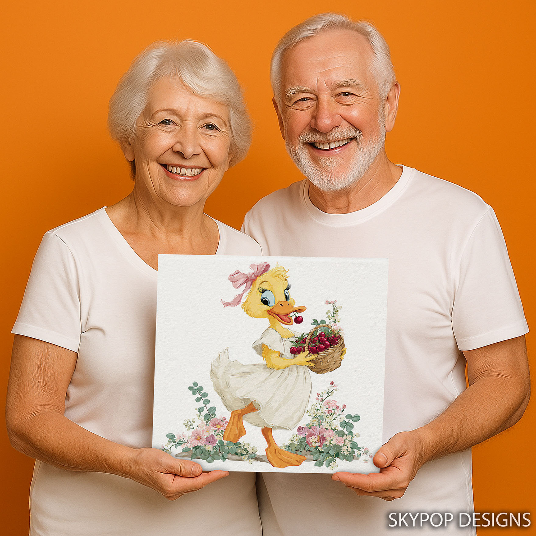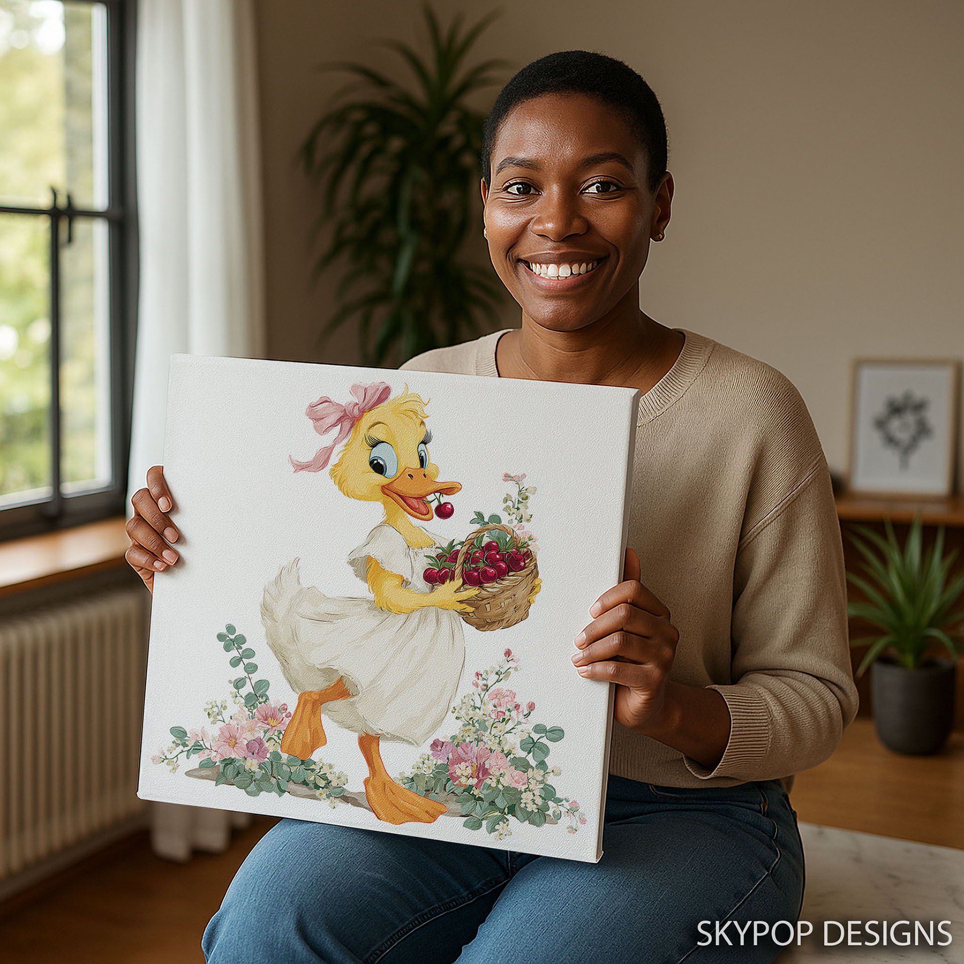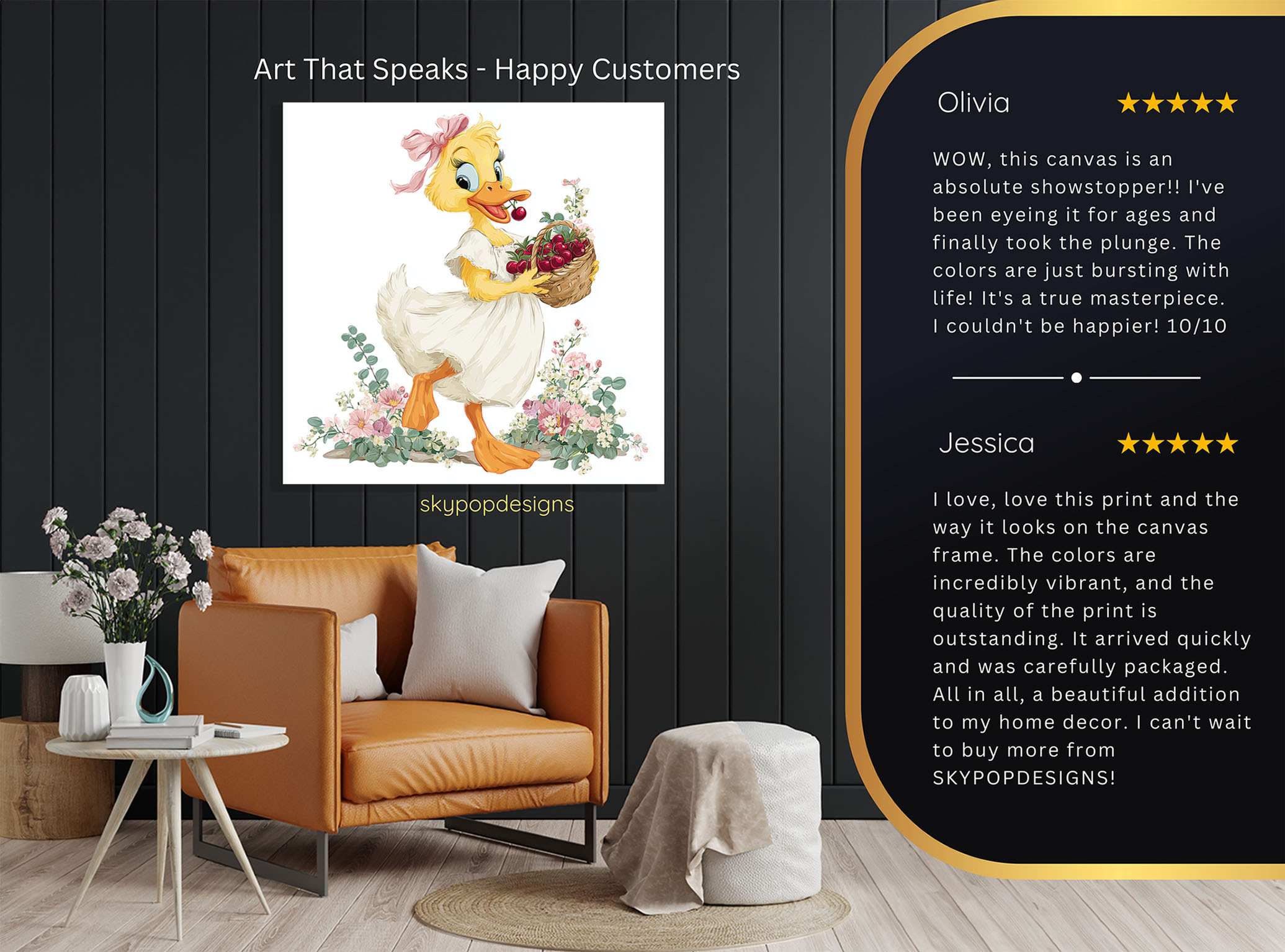 Bring a touch of whimsical charm to your space with this delightful duck canvas wall art, showcasing an adorable duckling enjoying a basket of fresh cherries.