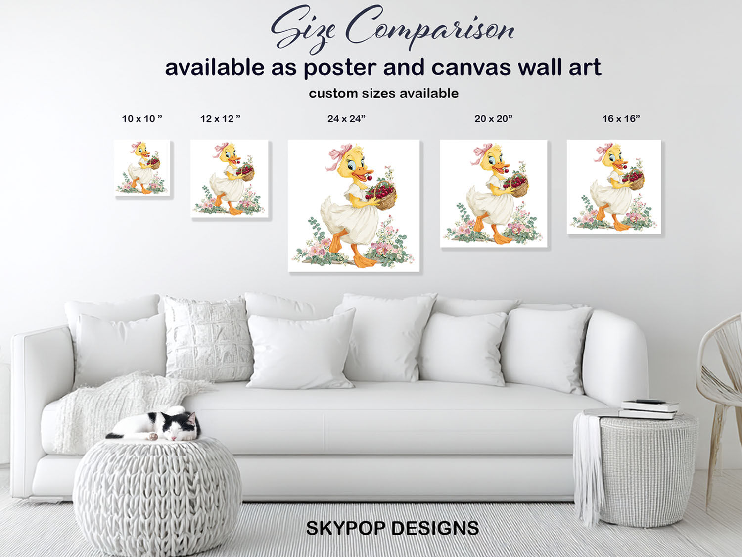 Bring a touch of whimsical charm to your space with this delightful duck canvas wall art, showcasing an adorable duckling enjoying a basket of fresh cherries. This charming poster or canvas wall art is perfect for transforming a child’s room or nursery into a playful wonderland. The vibrant pink bow and lush greenery create a visually appealing scene that is both sweet and lively. This animal art piece, with its farmhouse and shabby chic influences, adds personality and warmth to any home decor setting. The duckling’s cheerful expression and the bounty of red cherries evoke feelings of joy and abundance, making it an uplifting addition to your living spaces. Ideal for use as wall art in bedrooms, kitchens, or even a cozy reading nook, this poster brings character and a touch of nature indoors. High-quality printing ensures the intricate details of the duckling’s feathers and the basket’s texture are beautifully rendered, creating a stunning piece of wall art. This versatile canvas art is also a wonderful gift for baby showers, birthdays, or holidays, celebrating childhood innocence and simple pleasures. The blend of natural elements and whimsical character makes this duck canvas wall art a captivating focal point. Elevate your home with this heartwarming artwork that celebrates the beauty of nature and the innocence of childhood. Make this charming duck poster the highlight of your wall art collection today.