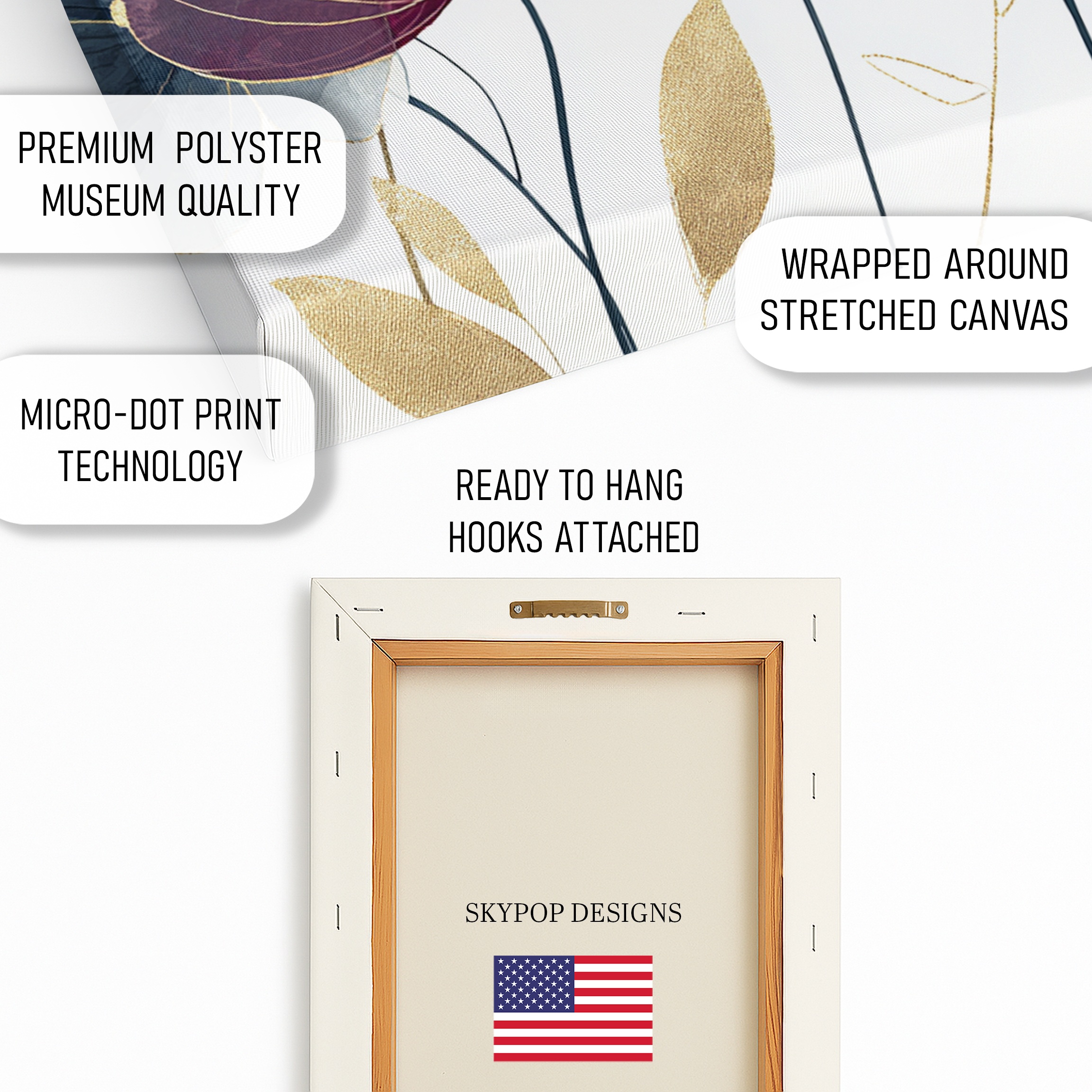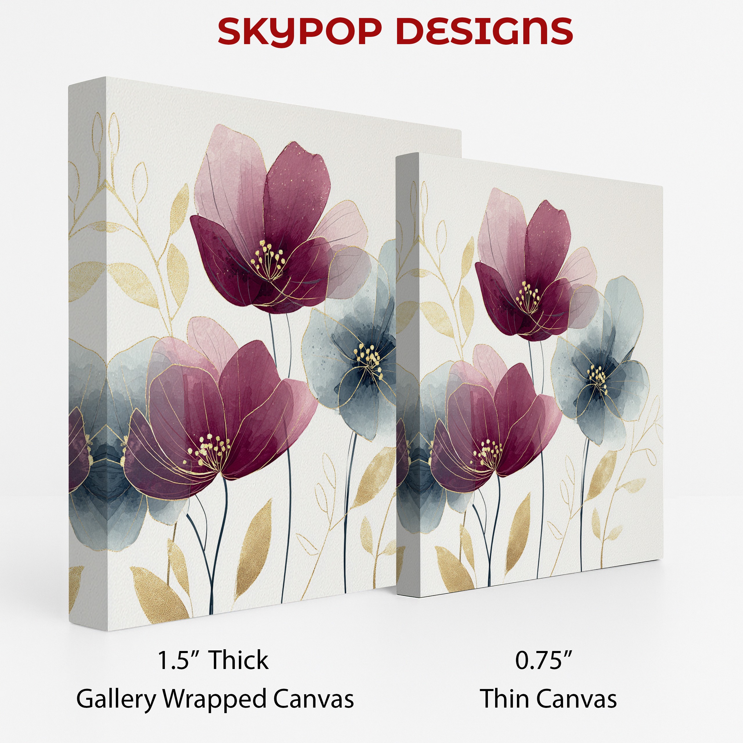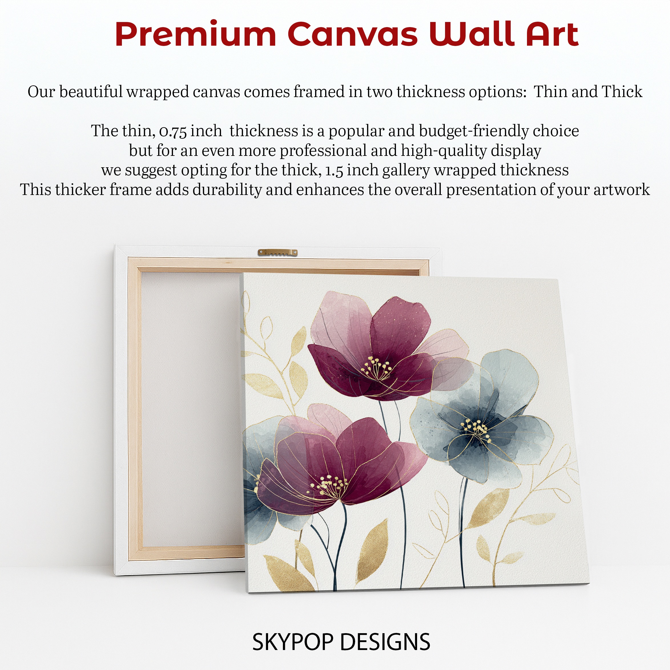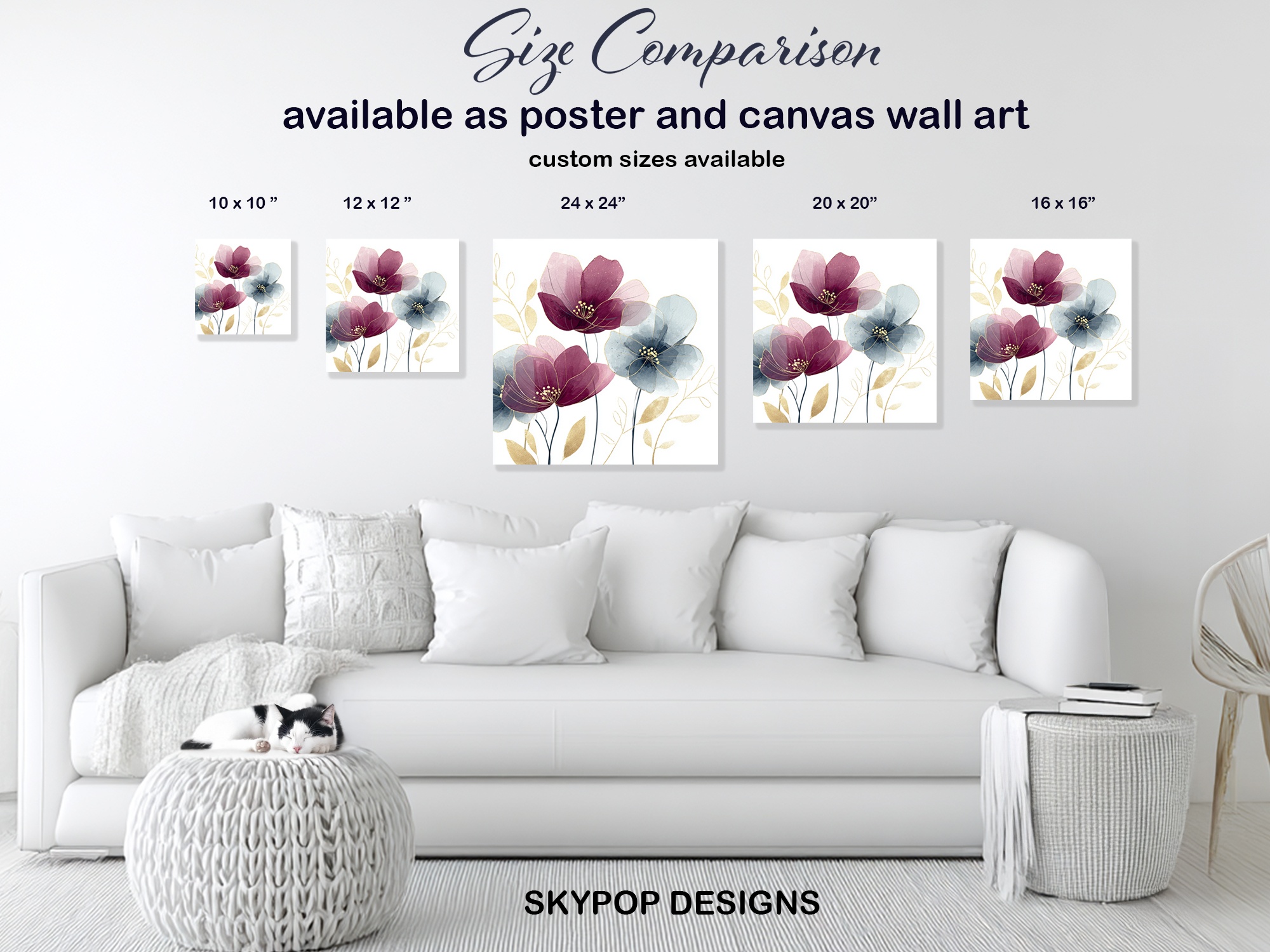 Transform your space with this stunning floral canvas wall art, featuring elegant watercolor blooms in rich purple and soft blue hues. This contemporary poster or canvas print brings a touch of nature’s beauty indoors, perfect for elevating modern living rooms or creating a serene bedroom retreat. The delicate gold accents add a luxurious shimmer, enhancing the artwork’s sophisticated appeal. Ideal for minimalist or Scandinavian decor styles, this piece effortlessly combines simplicity with eye-catching elegance. The translucent petals and graceful stems create a sense of movement, bringing life and energy to any wall. Whether displayed in a home office for inspiration or as a focal point in your dining room, this versatile artwork adapts beautifully to various interior themes. The soothing color palette of purples, blues, and pinks promotes relaxation and creativity, making it a perfect addition to spaces where you unwind or work. High-quality printing captures every nuanced brushstroke, ensuring this canvas wall art looks exquisite from every angle. Gift this artwork to nature lovers or as a thoughtful housewarming present. Elevate your home decor with this timeless floral piece that celebrates the beauty of nature in a modern, artistic style. Transform your walls and refresh your space with this captivating floral canvas art today.