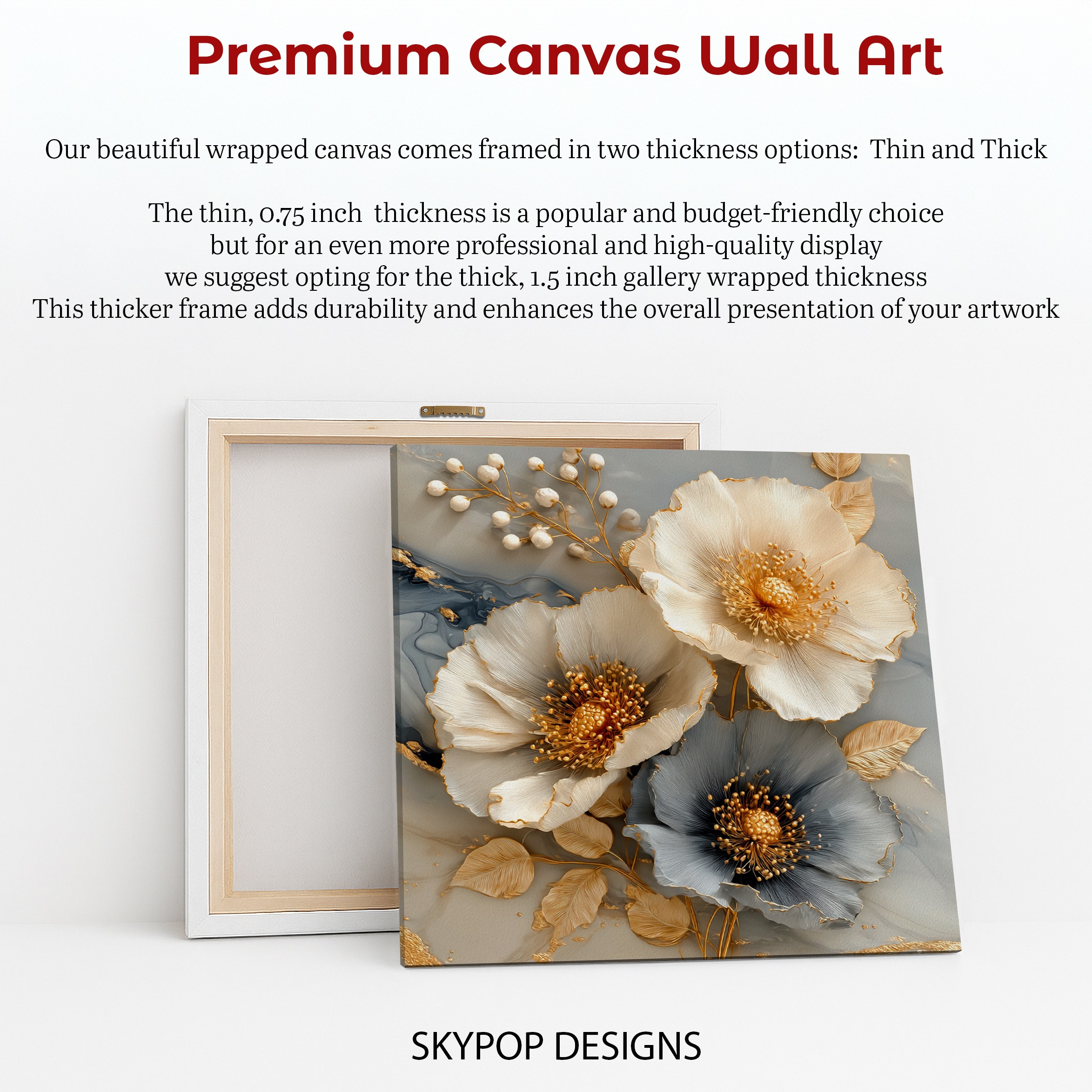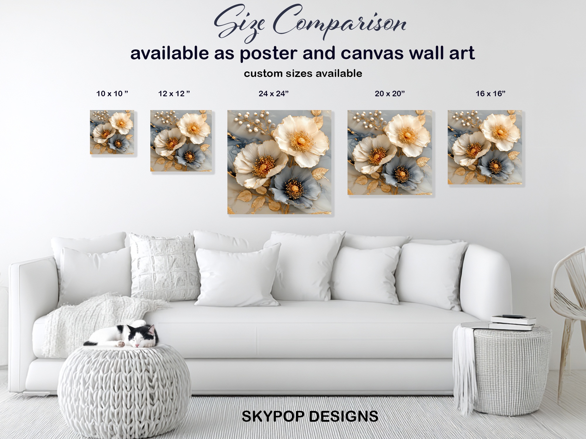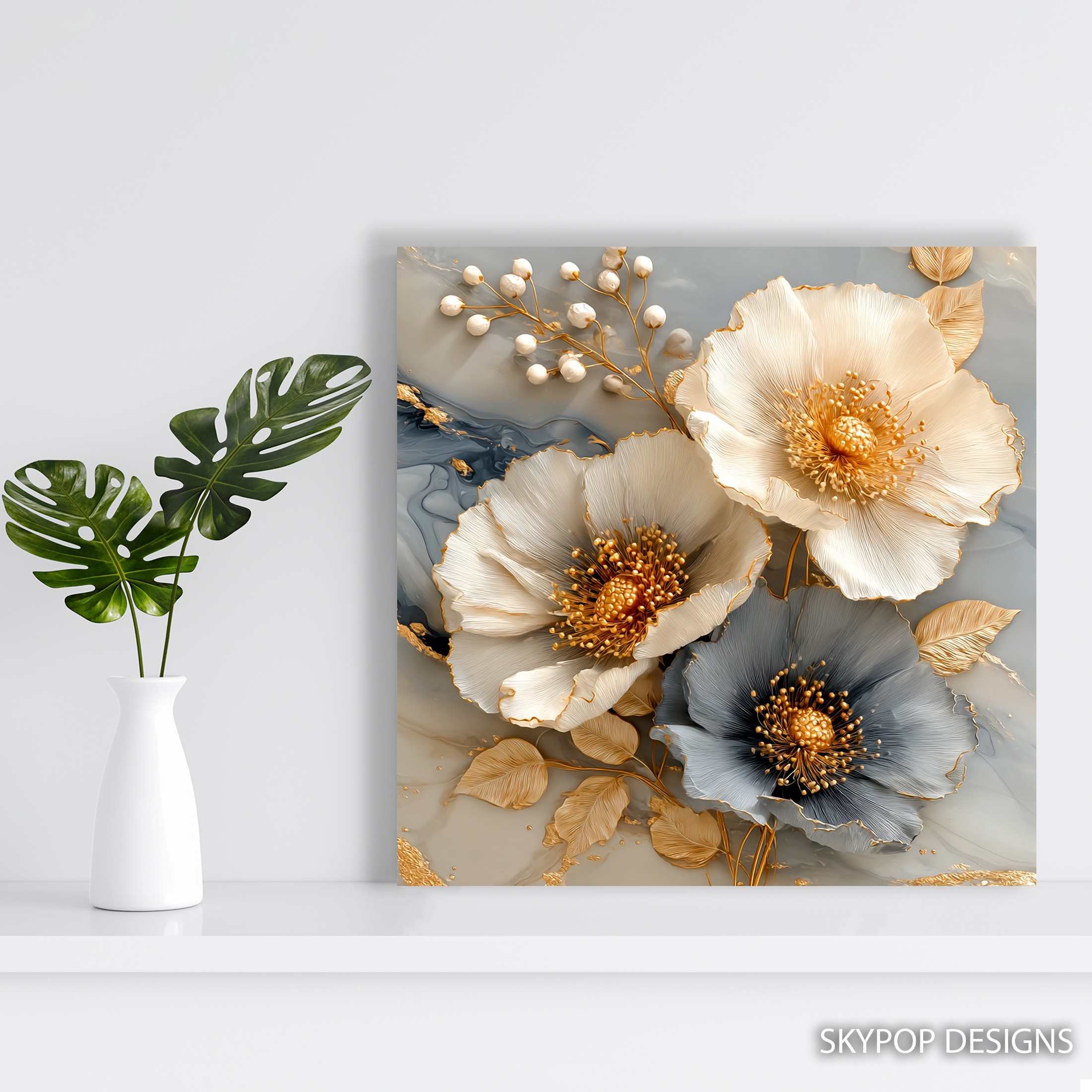 Elevate your space with this stunning floral canvas wall art, featuring exquisite white and gold blooms against a soothing grey background. This captivating piece transforms any room with its modern elegance and timeless appeal. Perfect for contemporary living rooms or chic bedrooms, this poster seamlessly blends nature-inspired beauty with sleek, minimalist design. The delicate petals and intricate details of each flower are rendered in striking clarity, creating a focal point that draws the eye and sparks conversation. Ideal for those seeking to add a touch of glamour to their home decor, this canvas wall art brings a sense of sophistication and serenity to any space. The soft color palette of whites, golds, and greys creates a calming atmosphere, while the subtle blue accents add depth and interest. Whether displayed in a dining room to enhance dinner parties or in a home office to inspire creativity, this versatile piece adapts beautifully to various interior styles. The high-quality printing ensures every brushstroke and texture is captured, making this artwork a lasting investment in your home’s aesthetic. Transform your walls today with this breathtaking floral canvas, and experience the joy of bringing nature’s elegance into your everyday life.