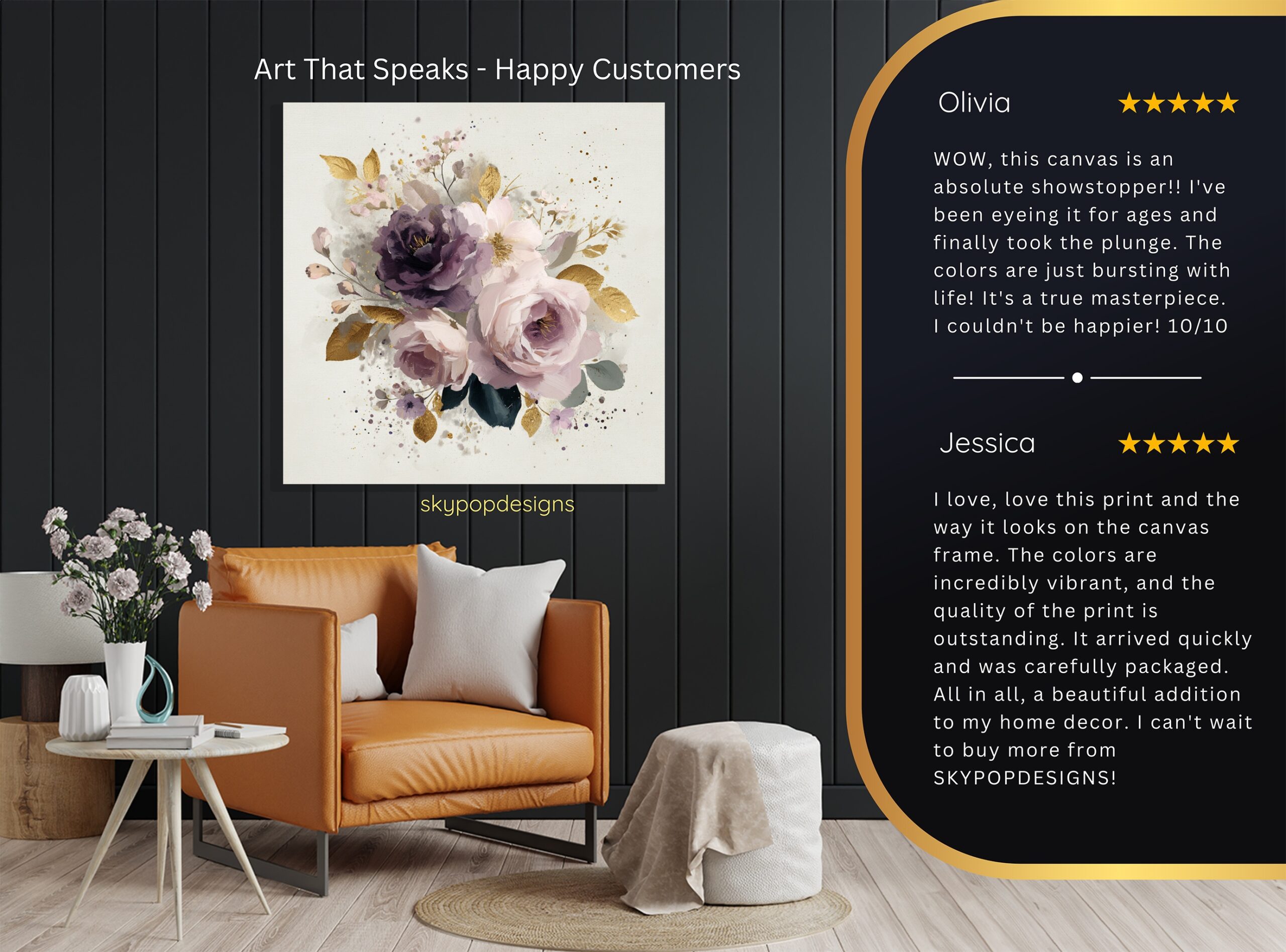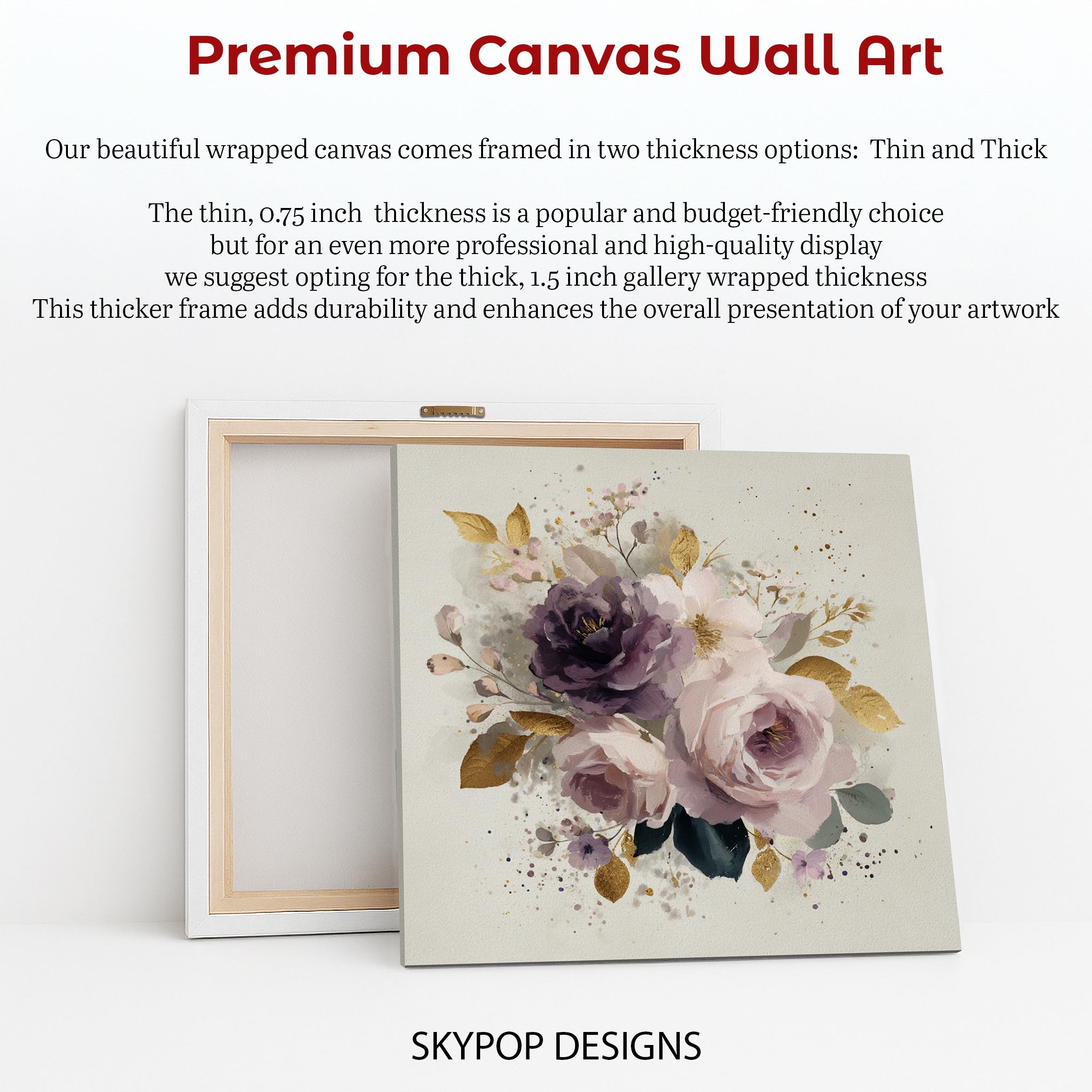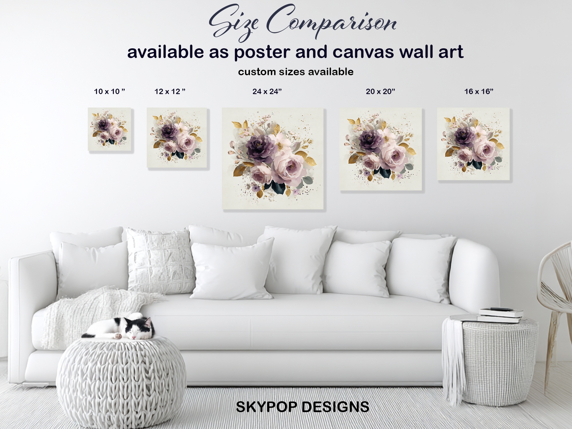 Elevate your space with this stunning floral canvas wall art featuring a luxurious bouquet of roses in soft pinks and deep purples. This captivating poster brings a touch of elegance and romance to any room, perfect for creating a focal point in your bedroom or living area. The delicate brushstrokes and muted color palette give this piece a timeless, vintage-inspired feel while maintaining a contemporary edge. Ideal for shabby chic or modern decor styles, this canvas wall art effortlessly blends classic beauty with trendy gold accents. The rich purple rose takes center stage, surrounded by softer pink blooms and accented with golden leaves, creating a harmonious and visually striking composition. This versatile piece works beautifully in dining rooms, offices, or as part of a gallery wall, adding a touch of sophistication to your home. The soothing colors and gentle floral theme can help create a calming atmosphere, perfect for unwinding after a long day. High-quality printing ensures every petal and leaf is captured in exquisite detail, making this poster a true work of art. Whether you’re looking to refresh your seasonal decor or searching for the perfect housewarming gift, this elegant floral art is sure to impress. Transform your living space with this romantic and eye-catching floral canvas wall art today.