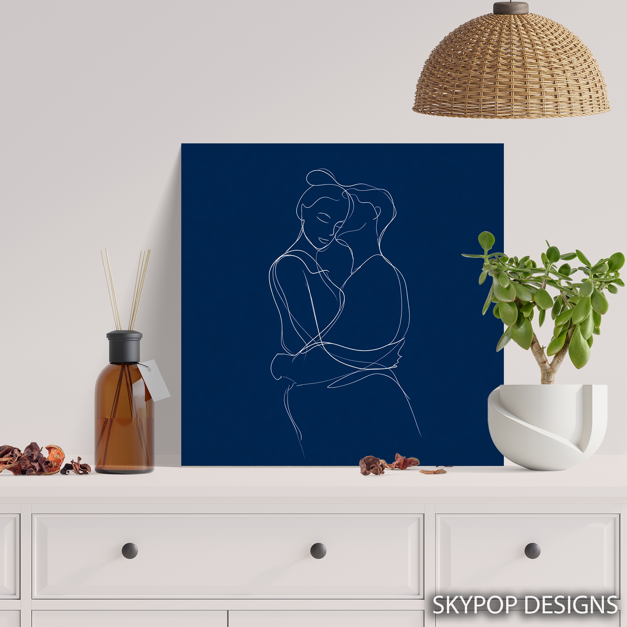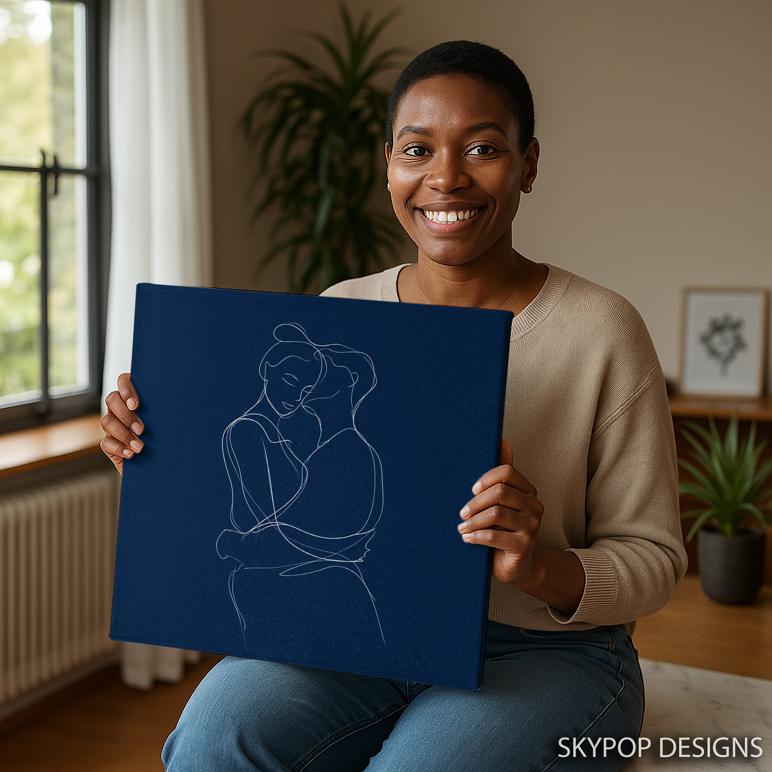 Transform your space with this striking minimalist canvas wall art featuring an elegant line drawing of a feminine figure. The simple yet powerful white lines on a deep blue background create a captivating contrast that instantly draws the eye. Perfect for modern living rooms or serene bedroom decor, this poster brings a touch of sophistication to any space. The fluid, continuous line technique showcases the beauty of simplicity, making it an ideal choice for minimalist and Scandinavian-inspired interiors. This contemporary wall art celebrates the grace of the human form, evoking a sense of calm and introspection. The deep blue backdrop adds a soothing element, perfect for creating a relaxing atmosphere in your home office or bathroom. Versatile in size, this canvas art adapts beautifully to various room layouts, serving as a striking focal point or complementing existing decor. The clean, uncluttered design of this poster aligns perfectly with current trends in home decor, emphasizing mindfulness and tranquility. Whether you’re looking to refresh your space or searching for a thoughtful housewarming gift, this timeless piece offers enduring appeal. Elevate your walls with this modern line art that seamlessly blends artistry and simplicity, transforming your living space into a gallery-like haven of contemporary style.