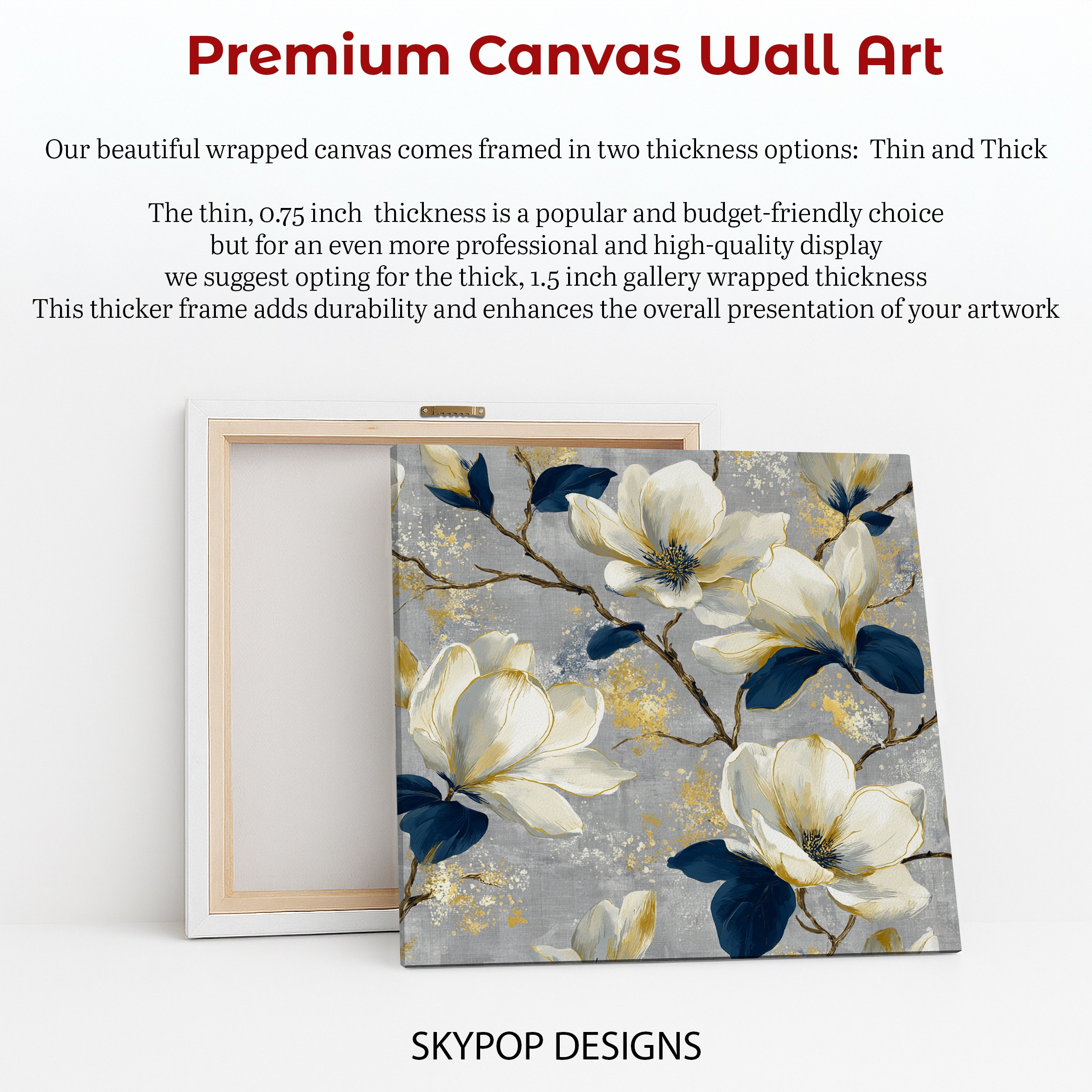 Transform your space with this stunning magnolia canvas wall art, featuring elegant white blooms against a sophisticated grey background. This eye-catching poster seamlessly blends contemporary style with timeless floral beauty, making it perfect for modern living rooms or minimalist bedrooms. The striking contrast of navy blue leaves and delicate gold accents adds depth and luxury to the composition, elevating any room’s decor instantly. Ideal for those seeking a touch of nature-inspired glamour, this piece works beautifully in dining rooms or home offices, creating a serene yet stylish atmosphere. The large, lifelike magnolia flowers captivate viewers with their intricate details and soft, creamy petals, while splashes of metallic gold bring a sense of opulence and warmth. This versatile canvas art adapts effortlessly to various interior styles, from sleek modern spaces to more traditional settings. Perfect as a statement piece or part of a gallery wall, it’s sure to spark conversations and admiration. The high-quality printing ensures every brushstroke and golden highlight is captured in vivid detail, making this a long-lasting addition to your home decor. Whether you’re redecorating or searching for the perfect housewarming gift, this magnolia wall art offers timeless elegance and contemporary flair. Elevate your space today with this captivating blend of nature and artistry.