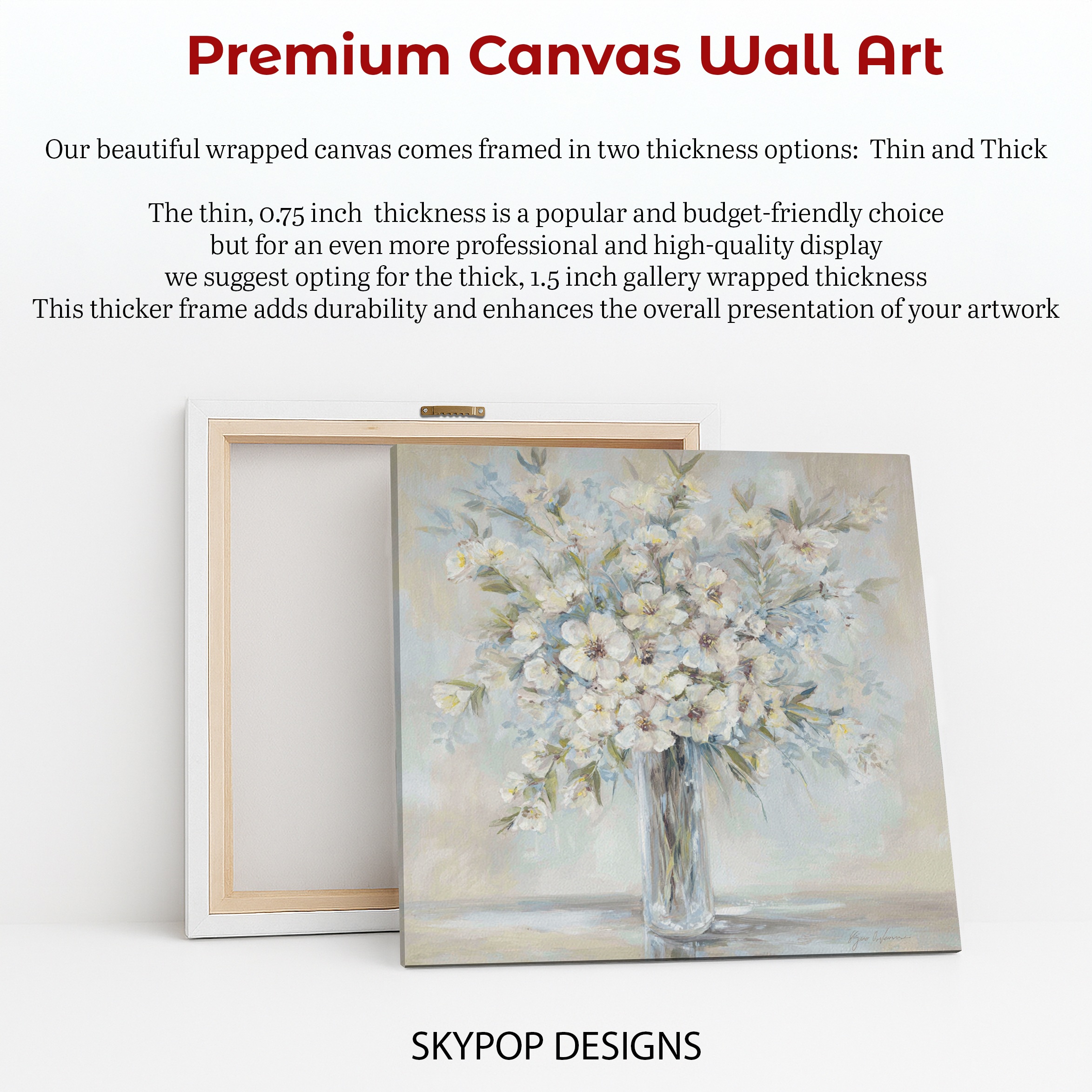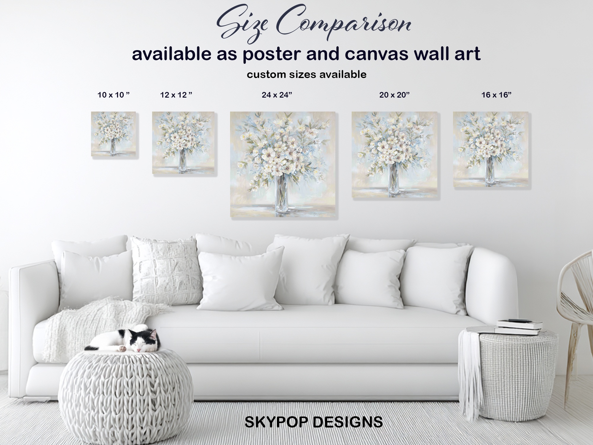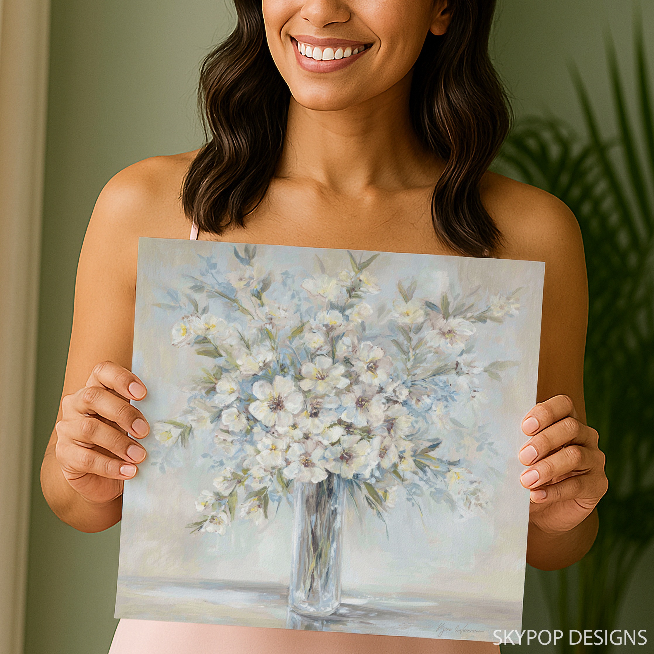 Transform your space with this breathtaking white floral canvas wall art that captures the essence of spring’s delicate beauty. This stunning still life poster showcases a lush bouquet of white blossoms in a clear glass vase, painted with soft, impressionistic brushstrokes that add depth and texture. Perfect for elevating your living room, bedroom, or dining area, this elegant canvas art brings a touch of nature’s serenity indoors. The gentle blue and green hues in the background create a calming atmosphere, ideal for contemporary or French country decor styles. This versatile piece works beautifully as a focal point above a fireplace or as part of a gallery wall in your entryway. The high-quality printing ensures every petal and leaf is rendered in exquisite detail, making it a timeless addition to your home. Whether you’re looking to refresh your space for spring or searching for the perfect housewarming gift, this floral wall art offers a blend of classic charm and modern simplicity. The soft color palette enhances any room’s ambiance, promoting a sense of peace and tranquility. Embrace the beauty of nature and the elegance of impressionist art with this captivating floral canvas. Add a touch of romance and sophistication to your home decor today with this stunning white blossom artwork.
