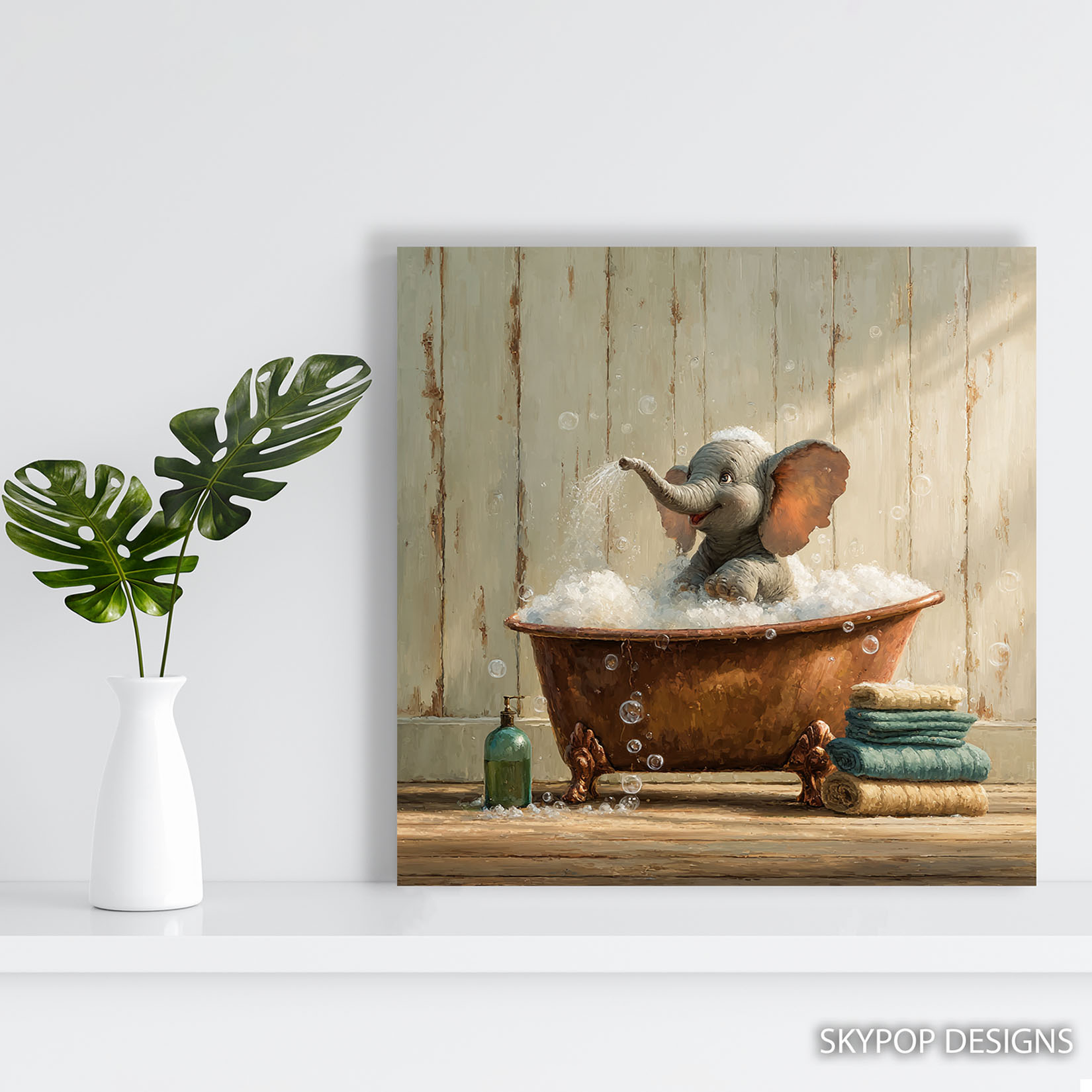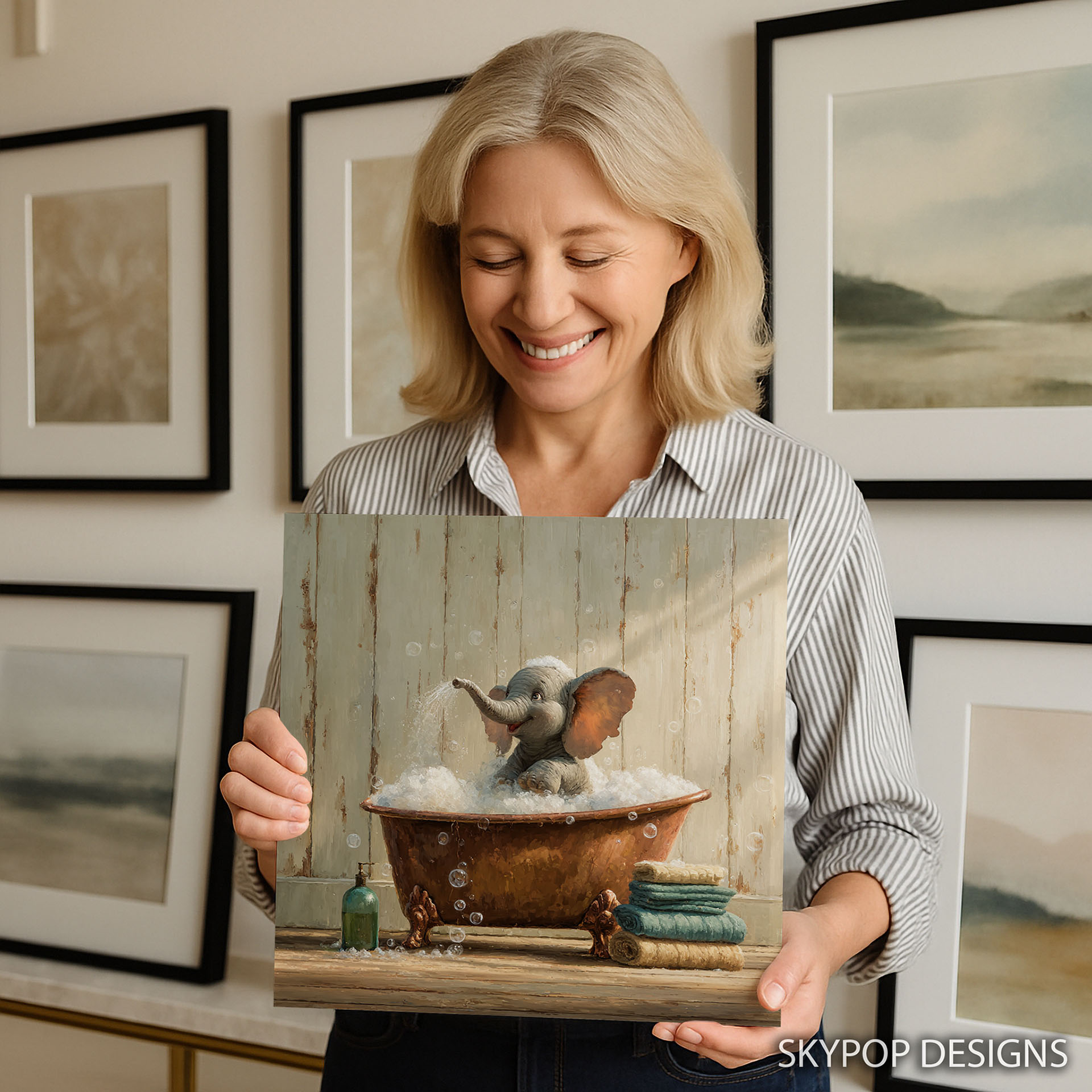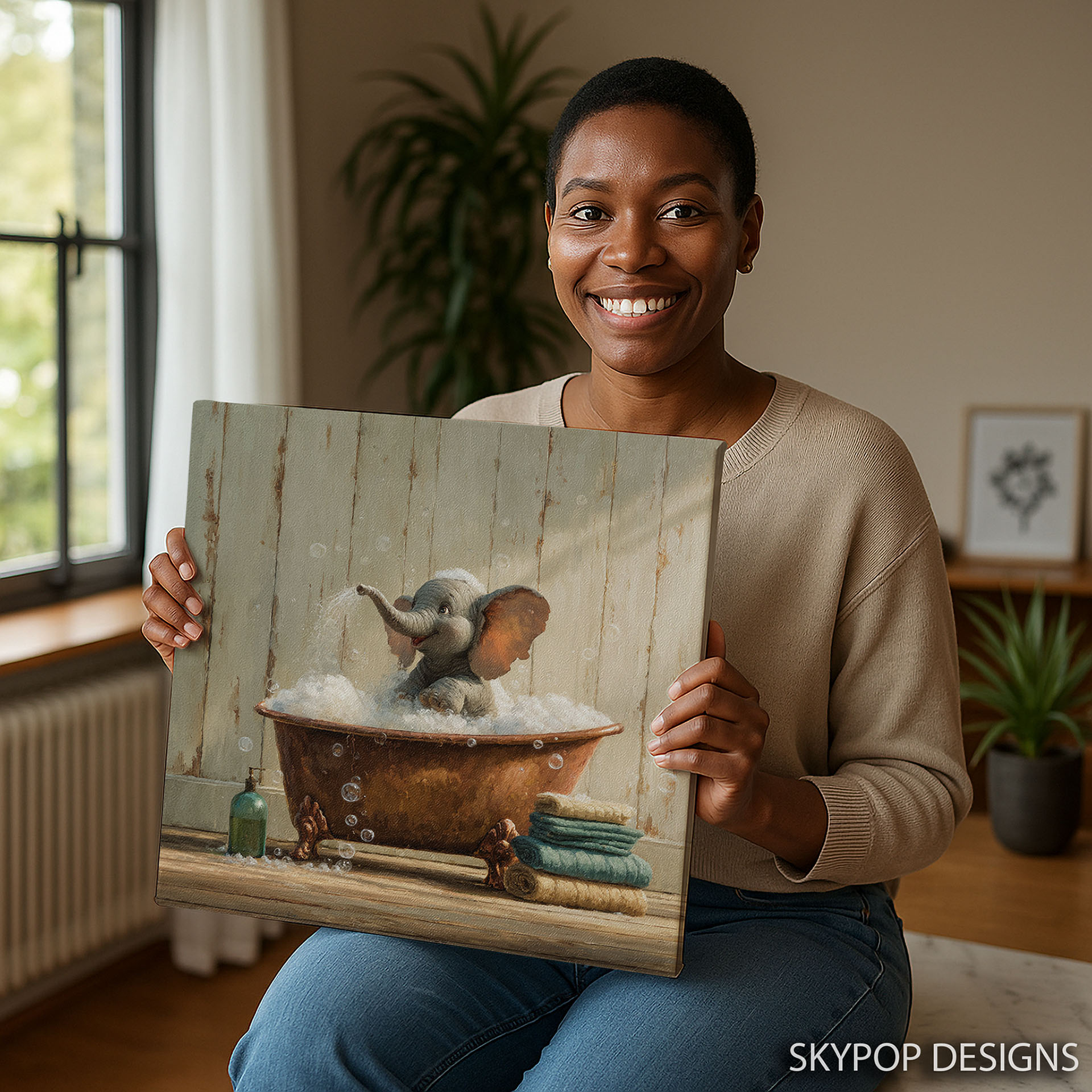 Bring joy and playfulness to your home with this charming elephant canvas wall art, perfect for any space that needs a touch of whimsy. This delightful poster features a smiling baby elephant enjoying a bubble bath, bringing a sense of fun and relaxation to your decor. The vibrant splash of water and fluffy bubbles create a captivating scene, ideal for children’s rooms or bathrooms. This cheerful elephant artwork transforms your walls, bringing a lighthearted atmosphere to your living space. Perfect for modern or Scandinavian decor styles, this canvas wall art adds a unique character that’s both endearing and stylish. The earthy tones of the bathtub and wooden floor complement the elephant’s grey skin and the white bubbles, creating a warm and inviting palette. High-quality printing ensures the details of this playful scene are captured beautifully on canvas or as a poster. This animal art is a wonderful gift for new parents, baby showers, or birthdays, adding a sweet touch to a nursery or child’s bedroom. It’s also a delightful addition to bohemian-themed spaces seeking a touch of playful charm. Elevate your home with this heartwarming elephant canvas wall art that celebrates the simple pleasures of bath time fun. Make this adorable elephant poster a focal point of your wall decor and inspire smiles every day. Transform your bathroom into a sanctuary of peace and fun with this delightful wall art.