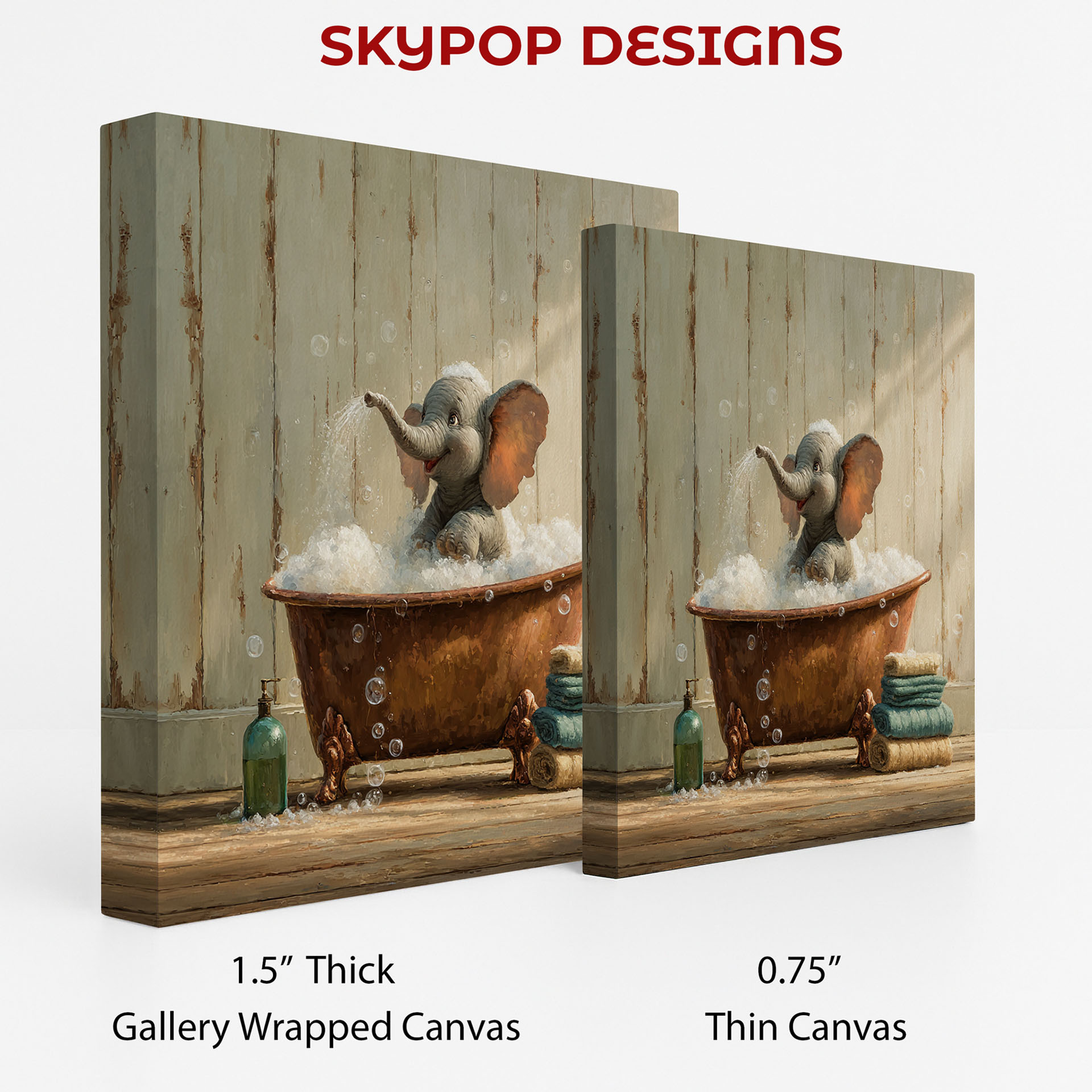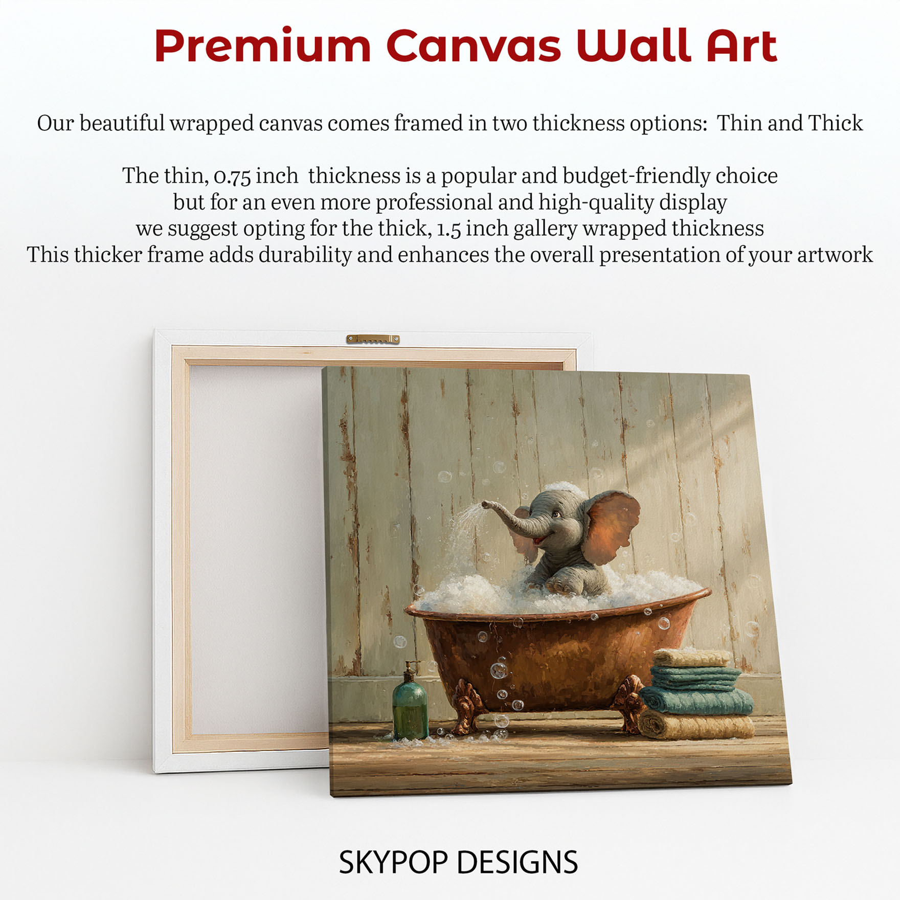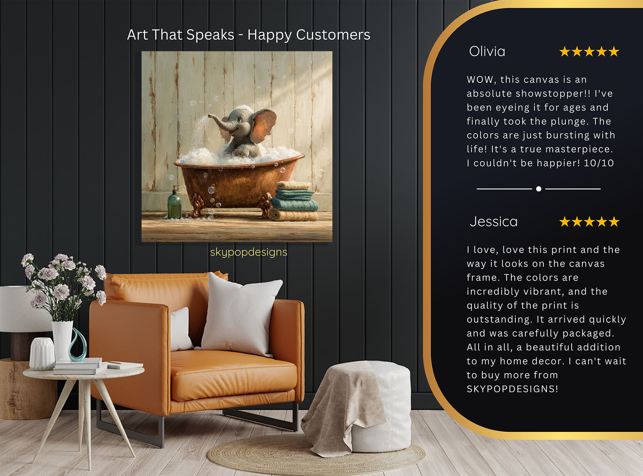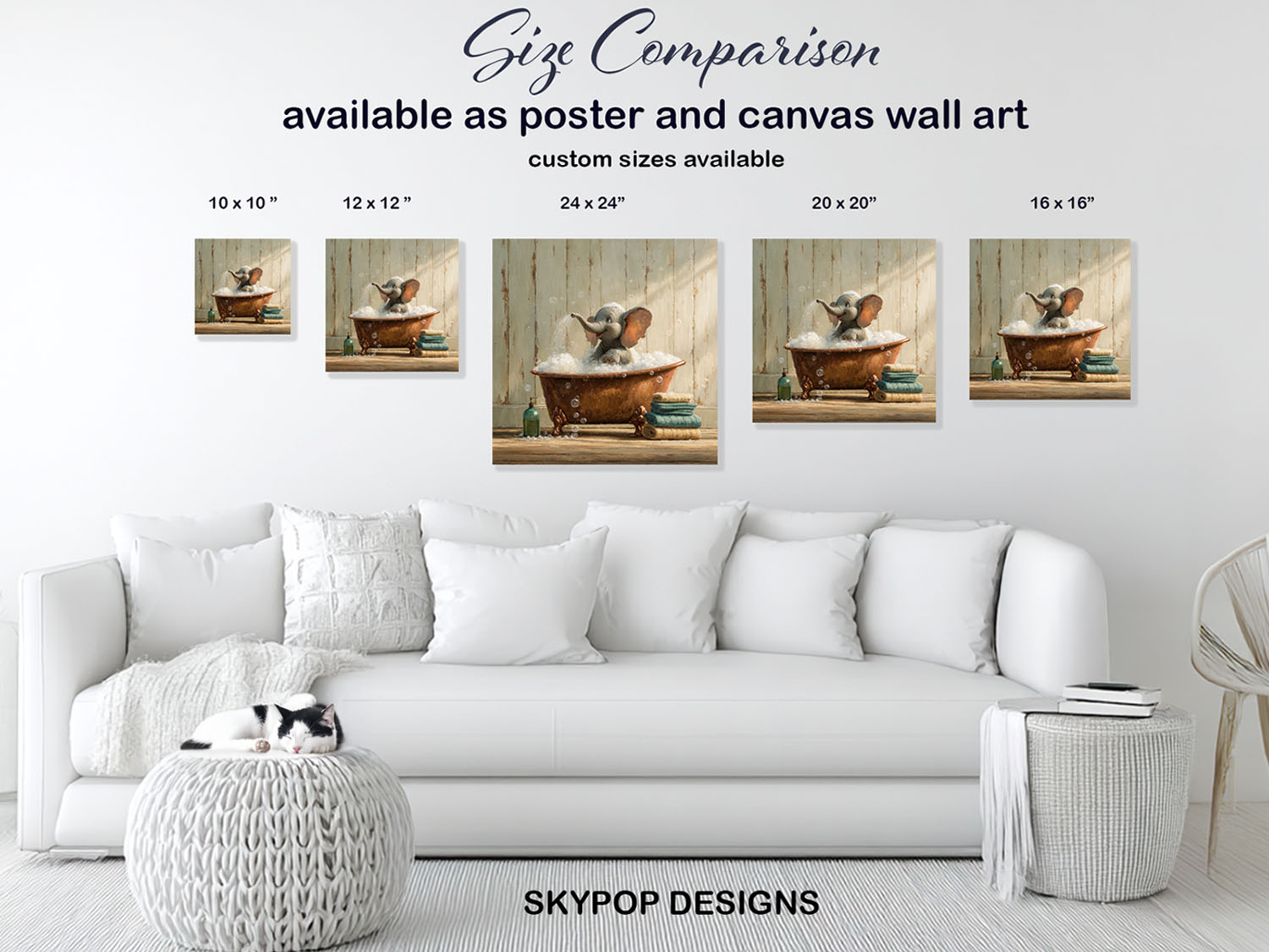 Bring joy and playfulness to your home with this charming elephant canvas wall art, perfect for any space that needs a touch of whimsy. This delightful poster features a smiling baby elephant enjoying a bubble bath, bringing a sense of fun and relaxation to your decor. The vibrant splash of water and fluffy bubbles create a captivating scene, ideal for children’s rooms or bathrooms. This cheerful elephant artwork transforms your walls, bringing a lighthearted atmosphere to your living space. Perfect for modern or Scandinavian decor styles, this canvas wall art adds a unique character that’s both endearing and stylish. The earthy tones of the bathtub and wooden floor complement the elephant’s grey skin and the white bubbles, creating a warm and inviting palette. High-quality printing ensures the details of this playful scene are captured beautifully on canvas or as a poster. This animal art is a wonderful gift for new parents, baby showers, or birthdays, adding a sweet touch to a nursery or child’s bedroom. It’s also a delightful addition to bohemian-themed spaces seeking a touch of playful charm. Elevate your home with this heartwarming elephant canvas wall art that celebrates the simple pleasures of bath time fun. Make this adorable elephant poster a focal point of your wall decor and inspire smiles every day. Transform your bathroom into a sanctuary of peace and fun with this delightful wall art.