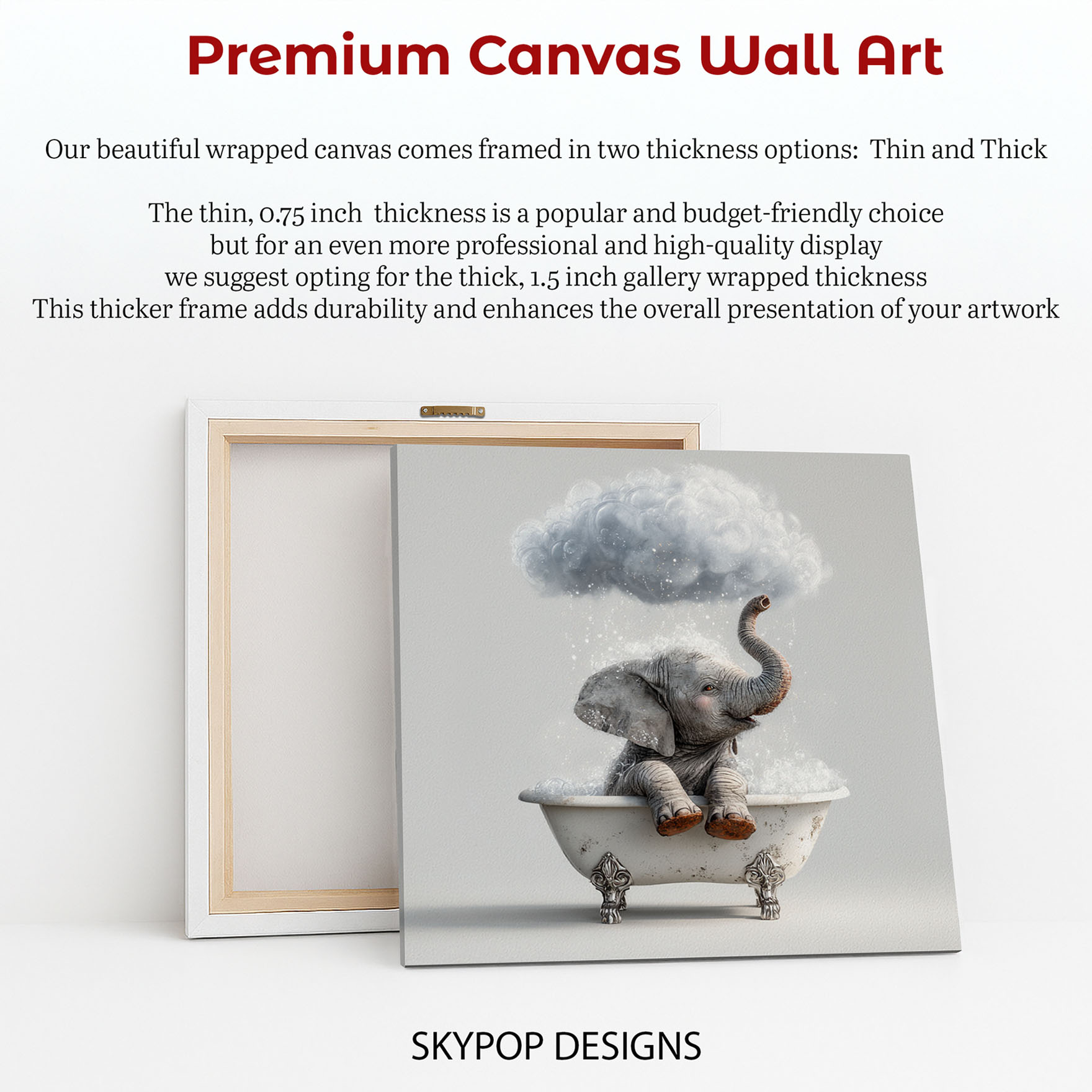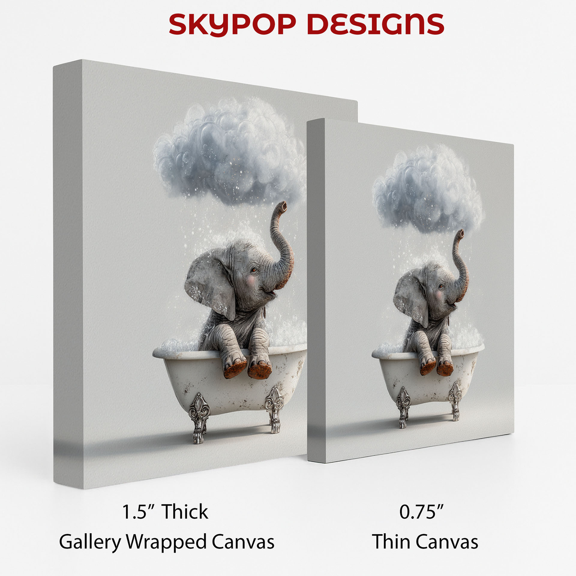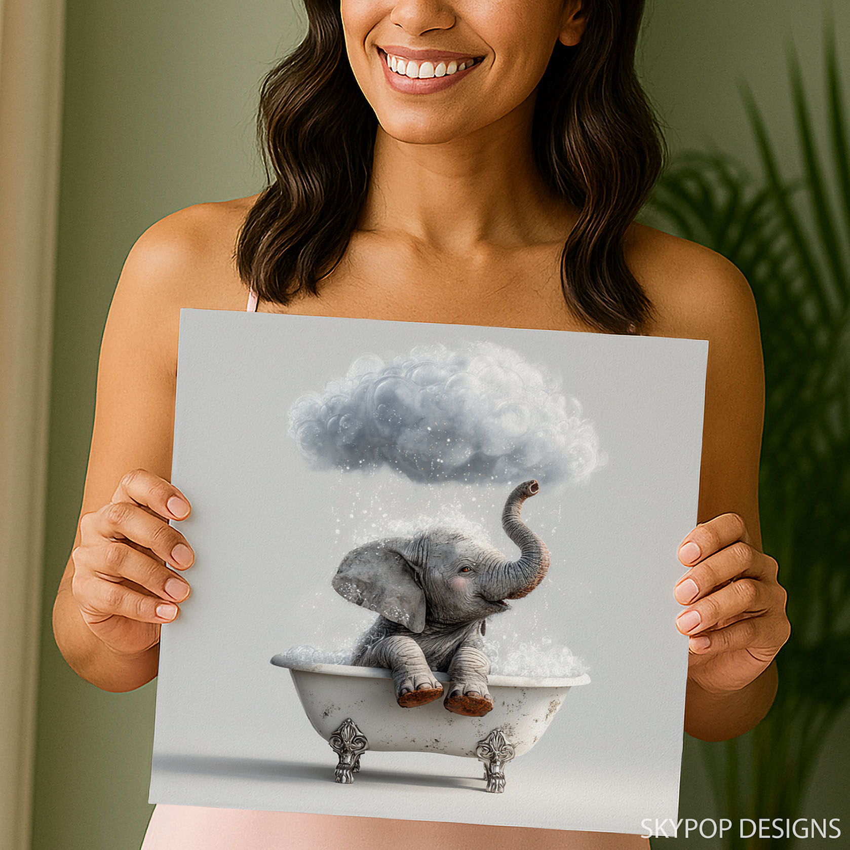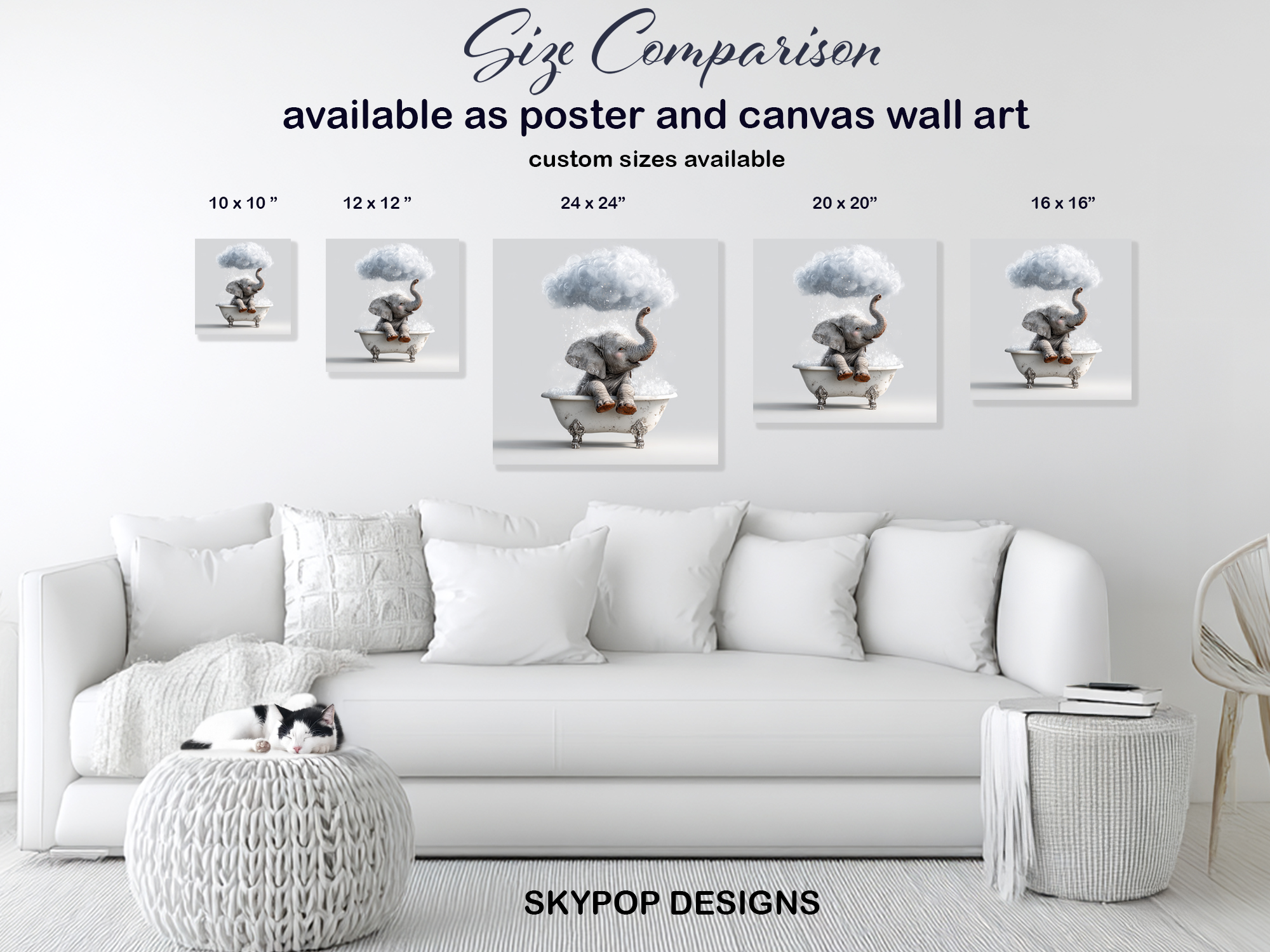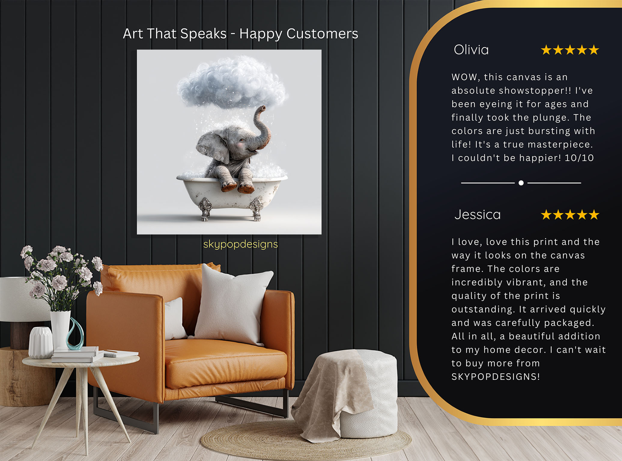 Transform your space with this adorable elephant canvas wall art, perfect for bringing joy and whimsy into any room. This delightful poster or canvas wall art showcases a baby elephant enjoying a bubbly bath, creating a heartwarming and playful scene. The soft grey tones of the elephant and the crisp white of the bathtub, combined with the light blue hues of the bubbles, create a calming and cheerful atmosphere. Ideal for children’s rooms or nurseries, this animal art piece also adds a touch of modern charm to bohemian or coastal decor in living rooms or bathrooms. It’s the perfect way to add personality and a touch of fun to your wall decor, celebrating moments of pure, simple happiness. High-quality printing ensures every detail of the elephant’s playful expression and the sparkling bubbles is captured beautifully on this canvas wall art. This elephant poster is a fantastic gift idea for baby showers, birthdays, or as a housewarming present, bringing smiles to recipients of all ages. The unique concept of an elephant in a bathtub is a conversation starter that adds a unique artistic element to your home. Elevate your space with this captivating and heartwarming piece of wall art that embodies carefree fun. Make your walls pop with this charming elephant canvas art, a treasure for any art lover seeking cheerful and distinctive decor.