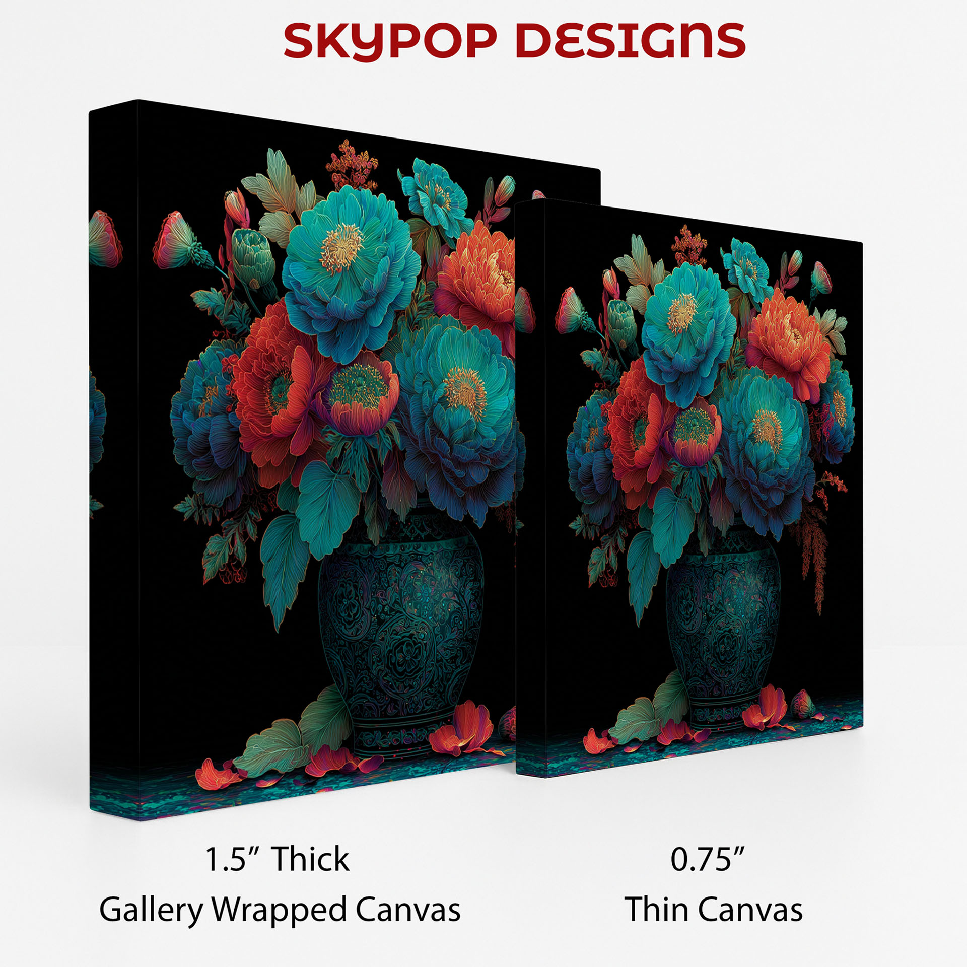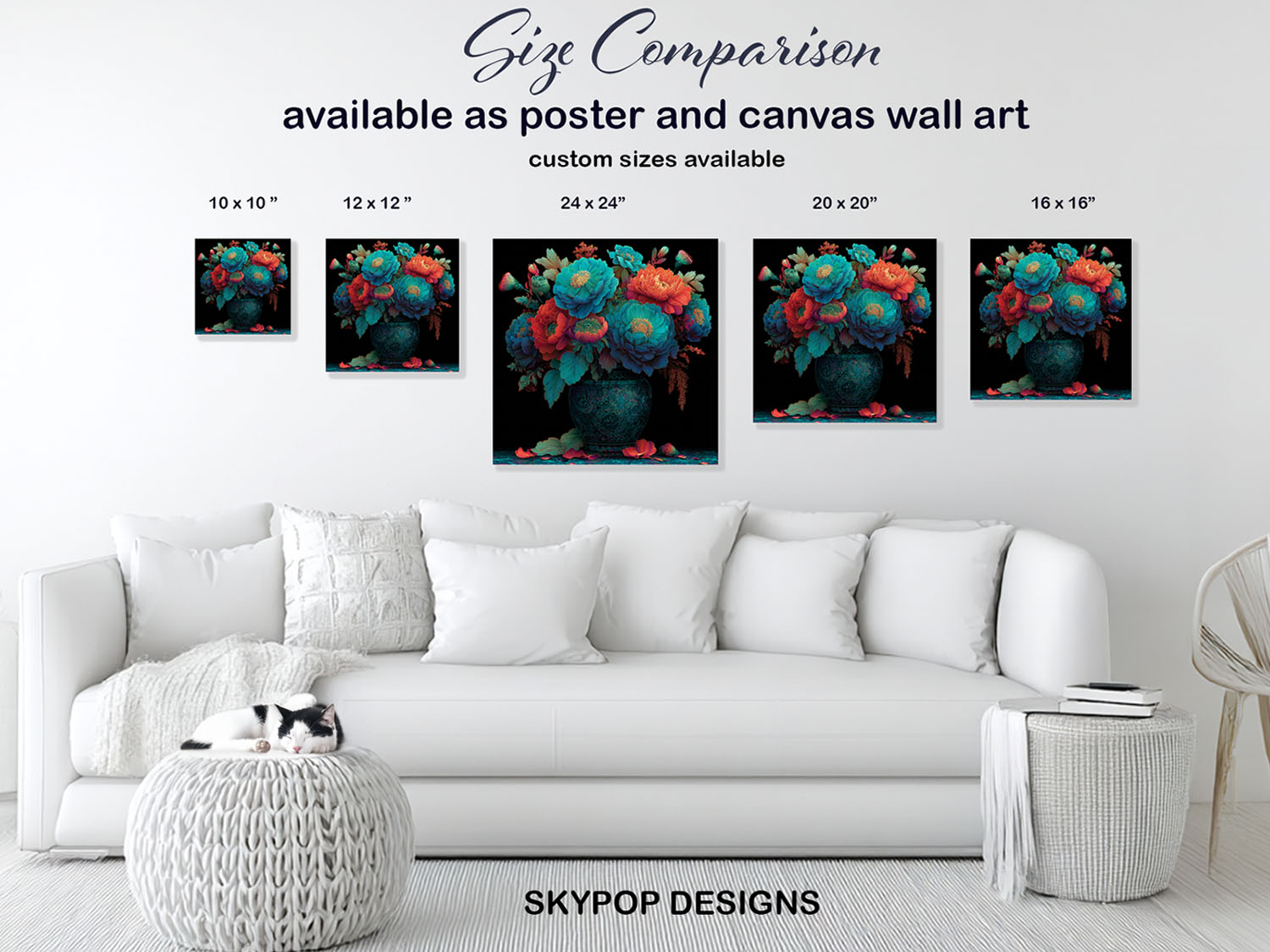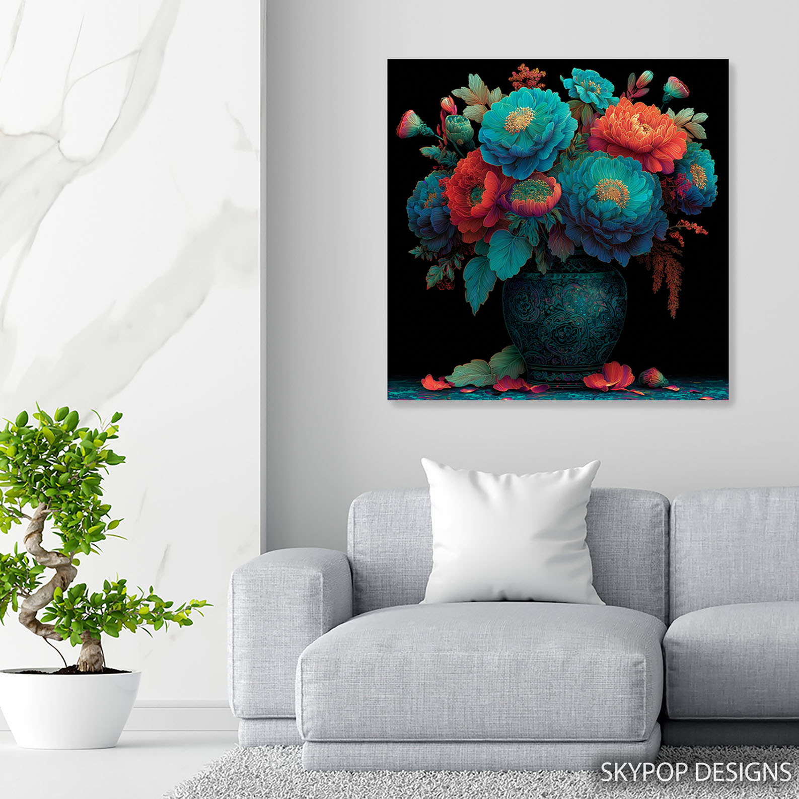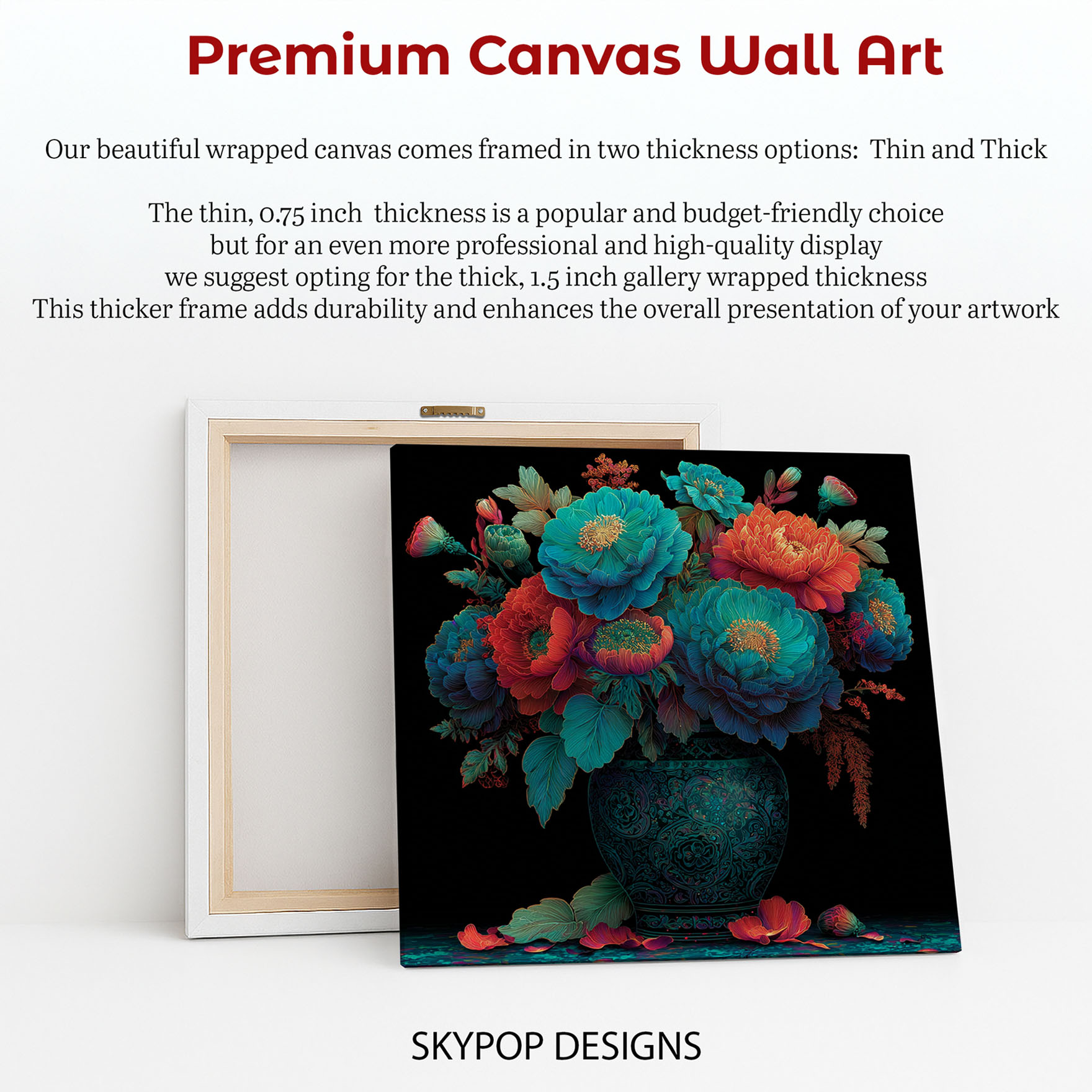 Elevate your home with this stunning abstract floral canvas wall art, featuring a vibrant arrangement of exotic blooms in a richly detailed vase. This captivating poster or canvas wall art is perfect for creating a luxurious focal point in your living room or adding a touch of elegance to your dining room. The striking teal and multicolor palette, accented with deep blacks and hints of gold, creates a dramatic and sophisticated atmosphere. Ideal for Victorian and Asian Zen decor styles, this nature art piece brings life and color to any space. The intricate details of the vase and the textured petals of the flowers showcase high-quality printing techniques, ensuring this wall art is both a visual delight and a durable addition to your home. This floral artwork is perfect for entryways, bedrooms, or even a quiet library, offering a sense of opulence and tranquility. Whether you’re redecorating or searching for the perfect housewarming gift, this canvas wall art provides a timeless and impactful statement. Its versatile design makes it a striking piece of modern living room wall decor or a sophisticated accent in traditional settings. Celebrate the beauty of nature with this breathtaking abstract floral art that will inspire conversation and admiration. Transform your walls today with this eye-catching canvas art, a beautiful blend of contemporary design and classic floral themes. Make this exquisite vase and flower wall art the crowning jewel of your collection.