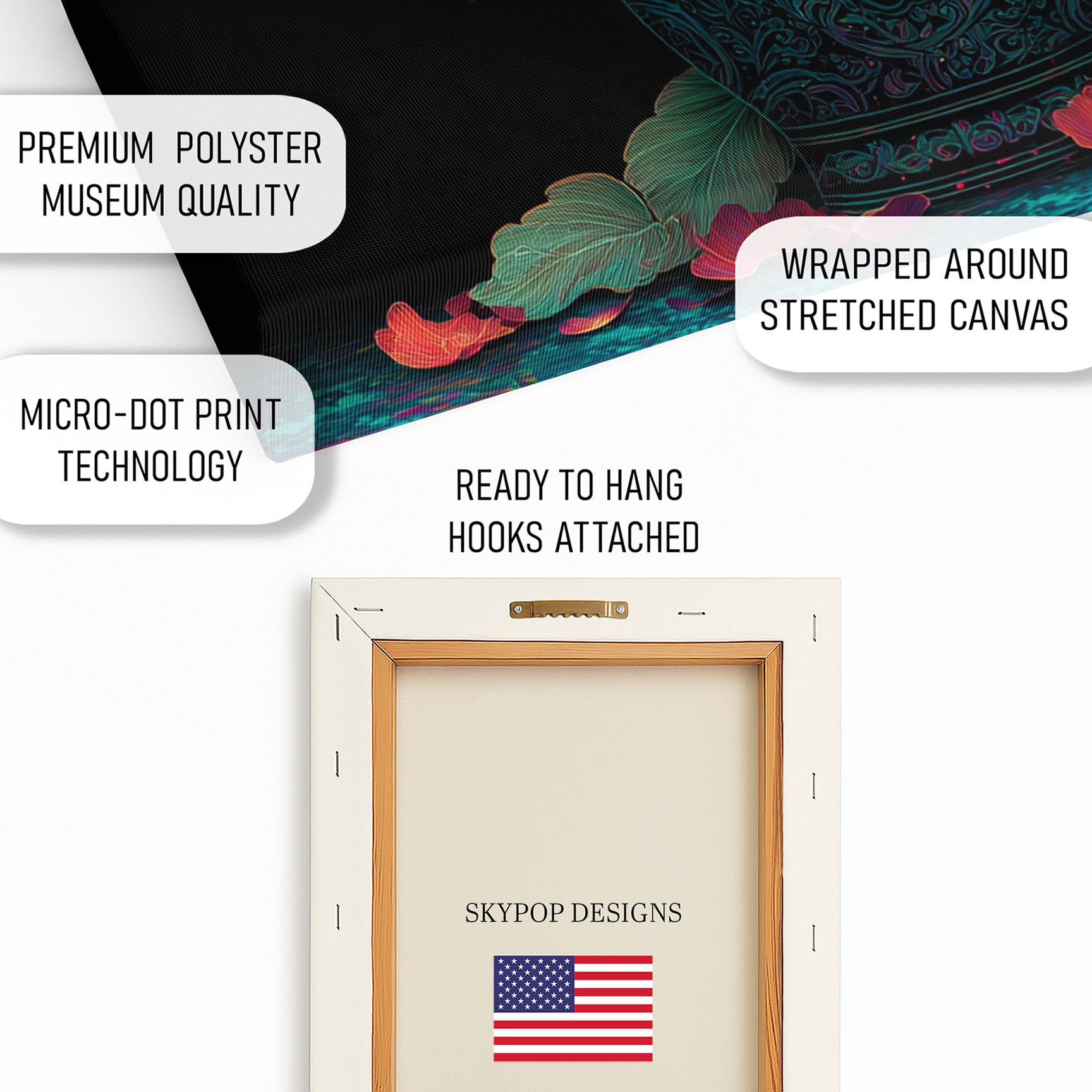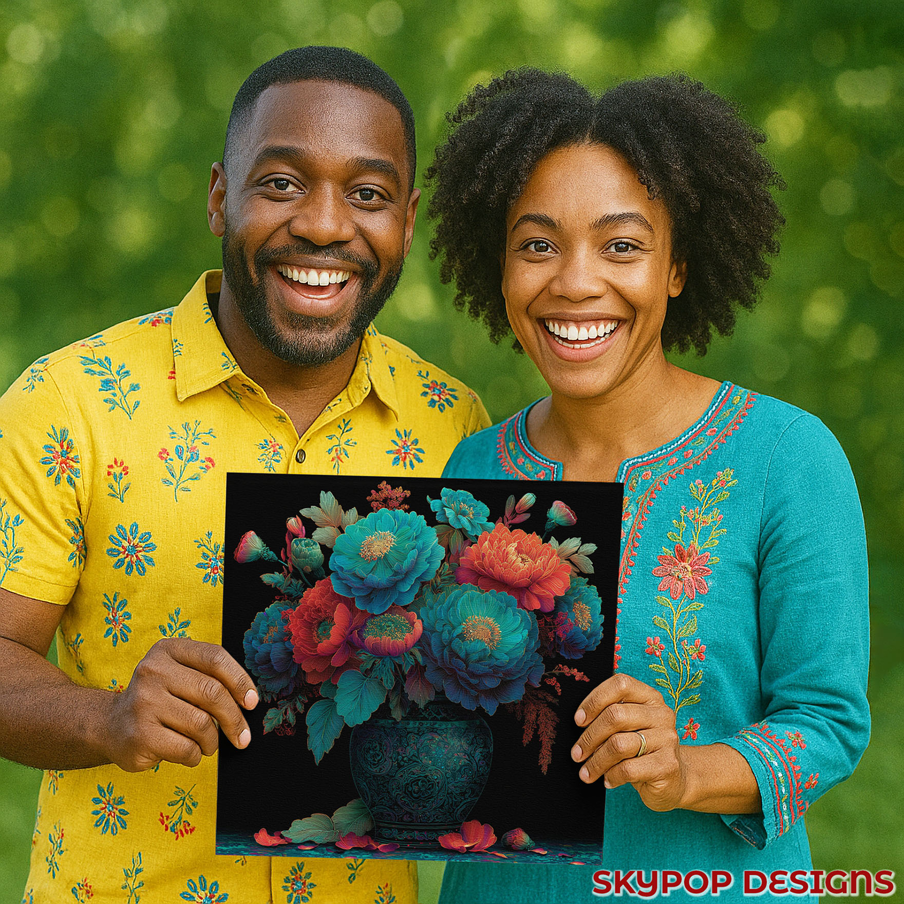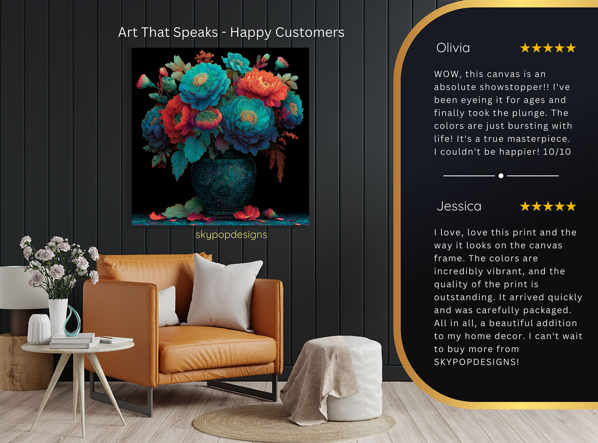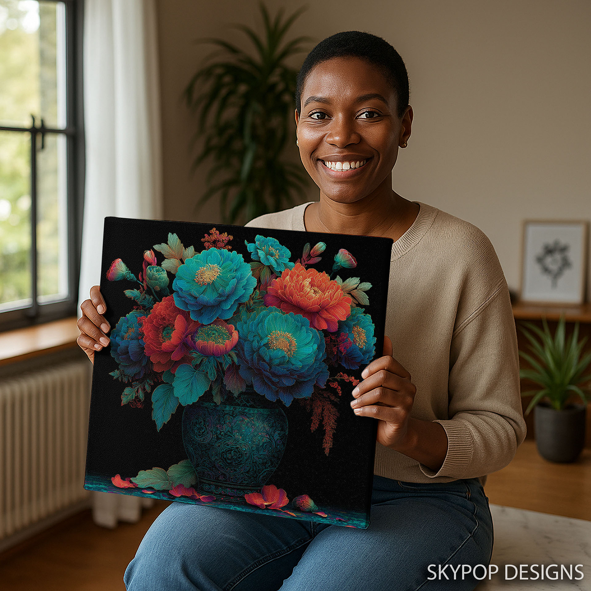 Elevate your home with this stunning abstract floral canvas wall art, featuring a vibrant arrangement of exotic blooms in a richly detailed vase. This captivating poster or canvas wall art is perfect for creating a luxurious focal point in your living room or adding a touch of elegance to your dining room. The striking teal and multicolor palette, accented with deep blacks and hints of gold, creates a dramatic and sophisticated atmosphere. Ideal for Victorian and Asian Zen decor styles, this nature art piece brings life and color to any space. The intricate details of the vase and the textured petals of the flowers showcase high-quality printing techniques, ensuring this wall art is both a visual delight and a durable addition to your home. This floral artwork is perfect for entryways, bedrooms, or even a quiet library, offering a sense of opulence and tranquility. Whether you’re redecorating or searching for the perfect housewarming gift, this canvas wall art provides a timeless and impactful statement. Its versatile design makes it a striking piece of modern living room wall decor or a sophisticated accent in traditional settings. Celebrate the beauty of nature with this breathtaking abstract floral art that will inspire conversation and admiration. Transform your walls today with this eye-catching canvas art, a beautiful blend of contemporary design and classic floral themes. Make this exquisite vase and flower wall art the crowning jewel of your collection.