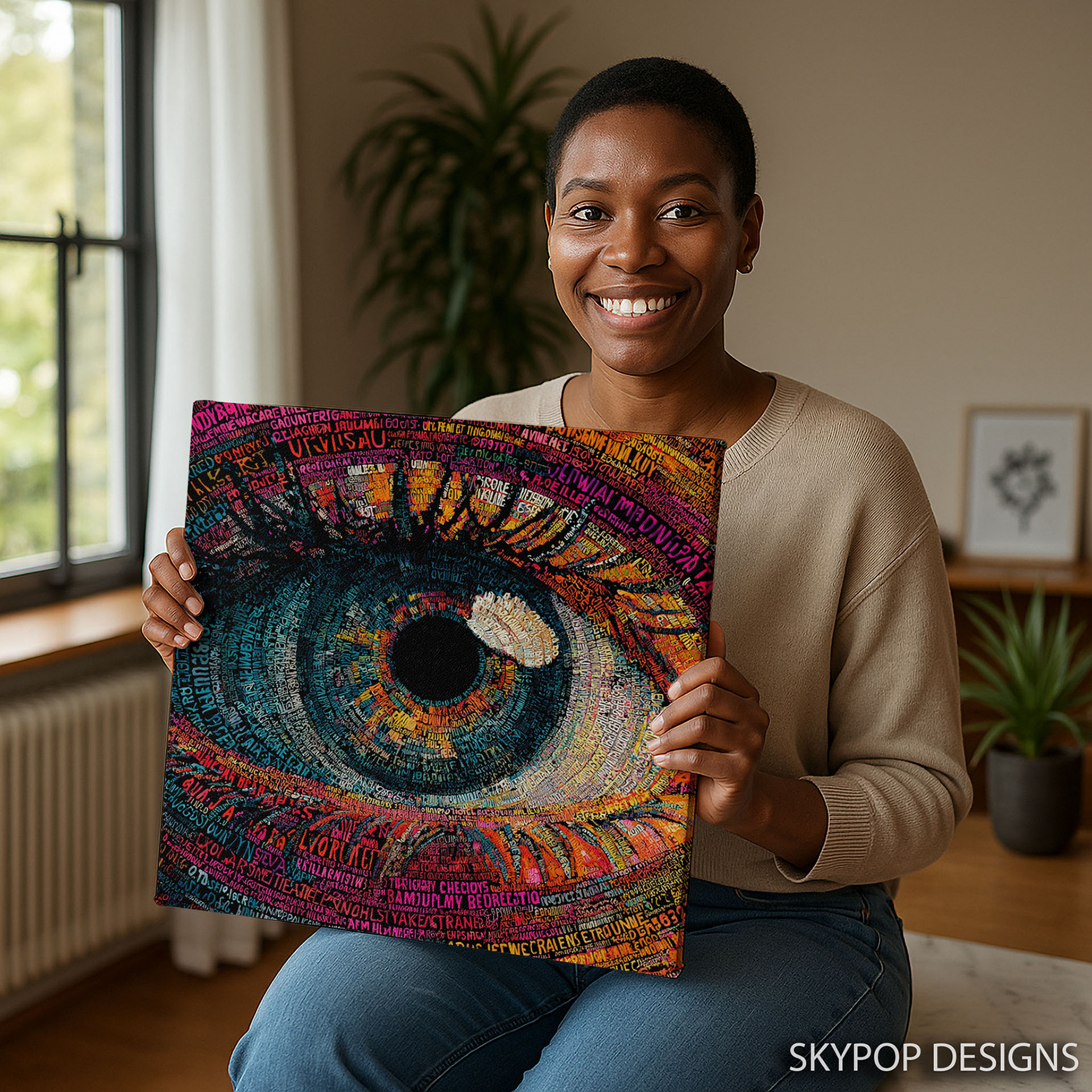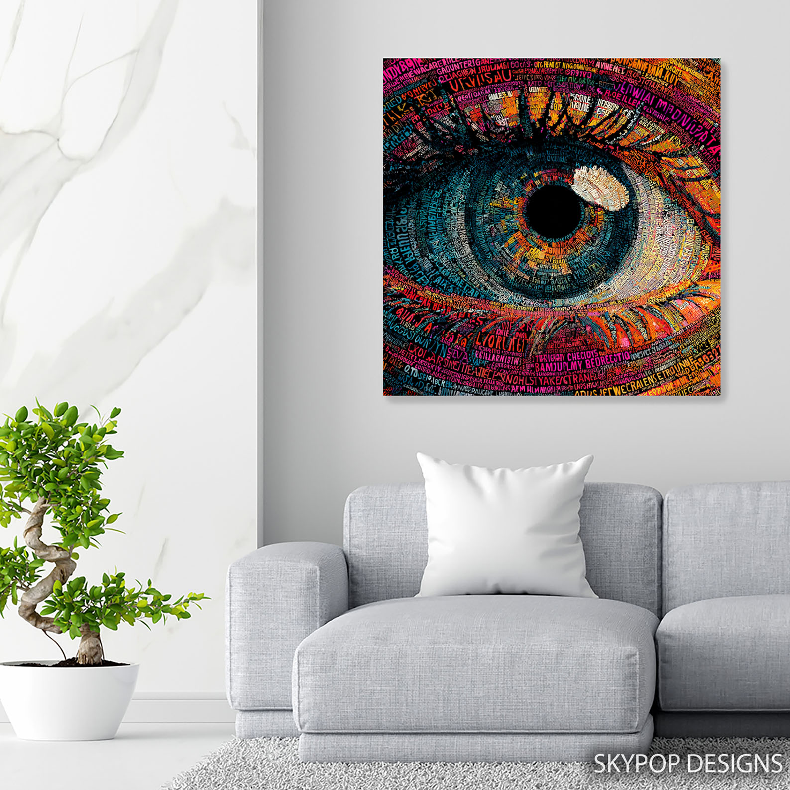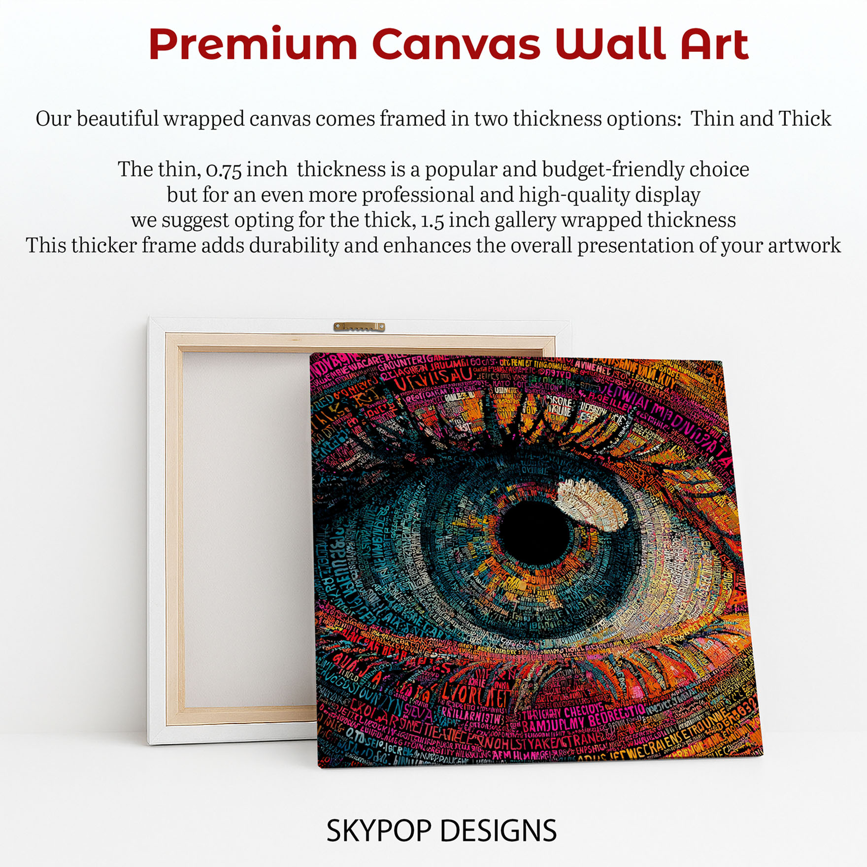 Transform your space with this captivating eye canvas wall art, a stunning piece of abstract contemporary art constructed entirely from words. This unique word art poster or canvas wall art is perfect for adding a bold, modern statement to any room. The intricate design and vibrant multicolor palette create a striking focal point that draws the viewer in, symbolizing knowledge and perception. Ideal for contemporary and modern decor styles, this eye artwork also complements industrial or street art-themed spaces. The rich, deep blues and fiery oranges evoke a sense of energy and intensity, making this poster a conversation starter. High-quality printing ensures every letter and color is sharp and vivid, bringing this intricate eye canvas art to life. This versatile wall art is perfect for living rooms needing an artistic upgrade or offices seeking inspiration. It also makes an exceptional gift for art lovers, creatives, or anyone who appreciates unique wall decor. The sheer detail in this piece means you’ll discover new elements with every glance, ensuring it remains a captivating addition to your home. Elevate your interior design with this powerful and thought-provoking word art canvas wall art today. Showcase your appreciation for innovative art and sophisticated design with this eye-catching piece. Add a dynamic and intellectual flair to your walls with this exceptional canvas art.