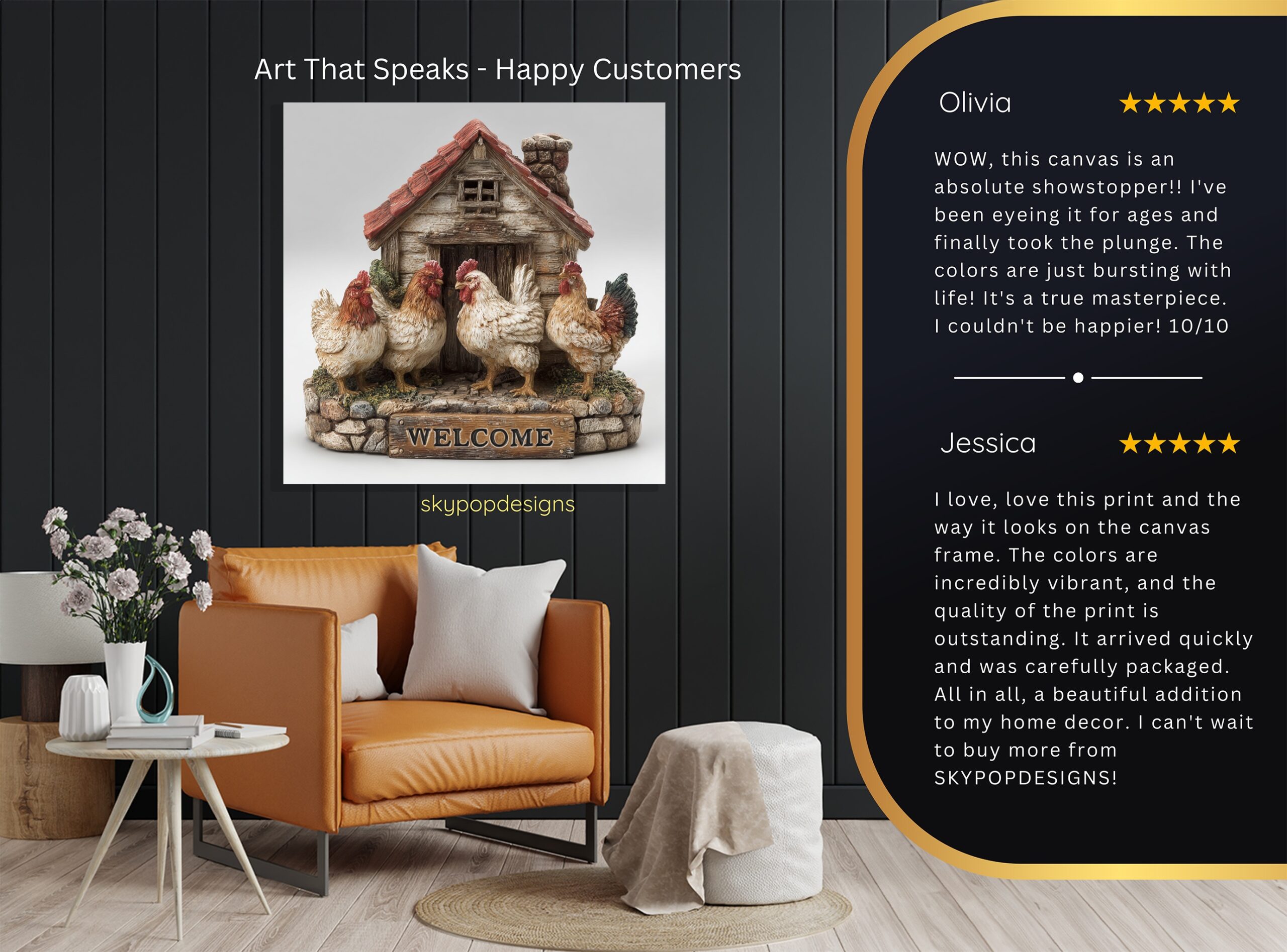 Transform your home with this charming farmhouse chicken welcome canvas wall art, perfect for adding a touch of rustic charm to any space. This delightful poster features a detailed miniature barn scene with four beautifully crafted chickens standing proudly in front. The realistic textures and warm colors create a cozy, inviting atmosphere that’s ideal for country-style kitchens or farmhouse-inspired dining rooms. The red roof of the barn and the chickens’ vibrant combs add pops of color against the weathered wood tones, creating visual interest and depth. This versatile canvas art works wonderfully as entryway decor, greeting guests with its friendly “Welcome” sign. The intricate details, from the stone chimney to the individual feathers on the chickens, showcase high-quality craftsmanship that will be appreciated by animal lovers and country decor enthusiasts alike. Perfect as a housewarming gift or to enhance your own home’s country aesthetic, this piece brings a sense of rural nostalgia to any room. Whether displayed in a cozy breakfast nook or as a focal point in a mudroom, this chicken-themed wall art adds personality and warmth to your space. The durable canvas ensures long-lasting beauty, allowing you to enjoy this cheerful farm scene for years to come. Elevate your home’s country charm and celebrate the simple joys of farm life with this delightful chicken welcome art today.