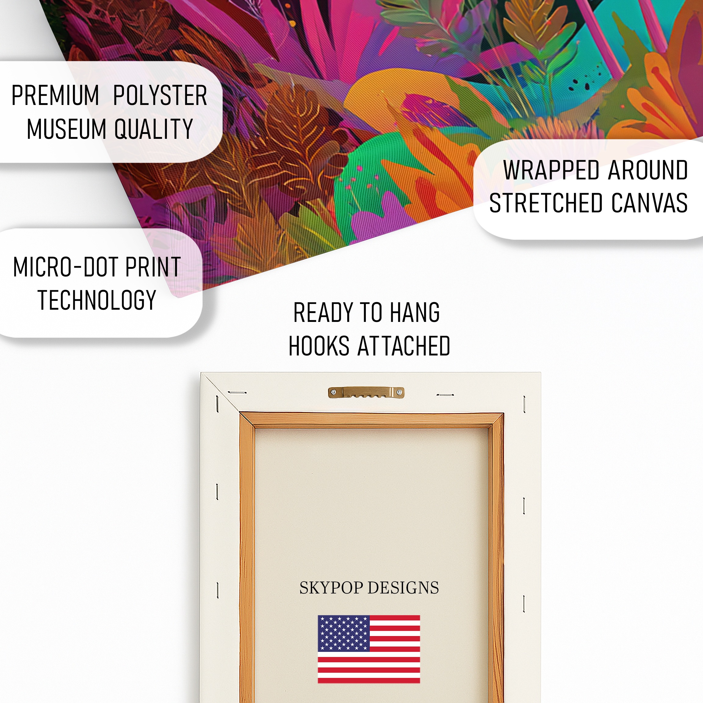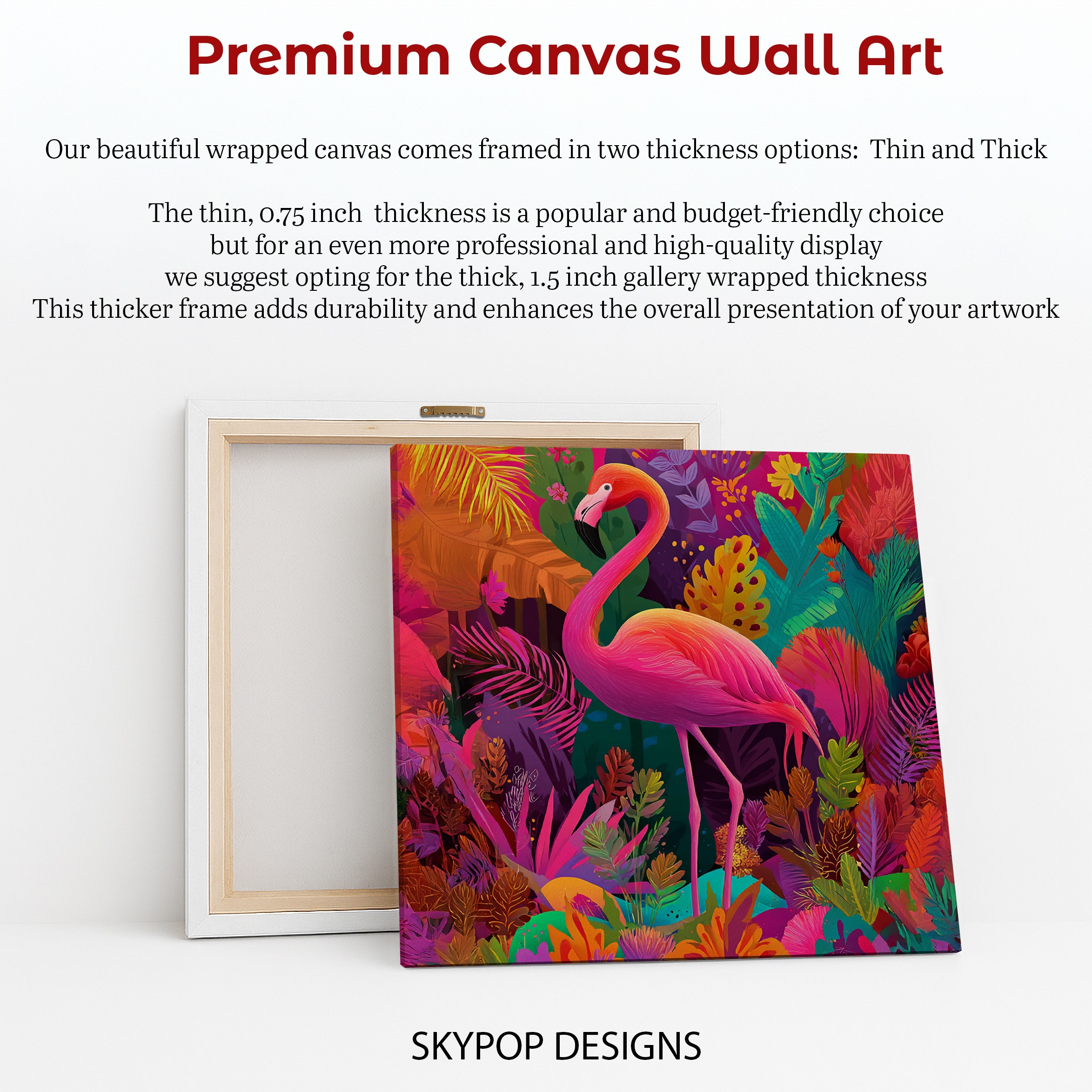 Bring the vibrant energy of a tropical paradise into your home with this stunning flamingo canvas wall art. This eye-catching poster features a striking pink flamingo surrounded by a lush, colorful jungle of exotic plants and flowers. Perfect for adding a pop of color to modern living rooms or creating a focal point in bohemian bedrooms, this vivid artwork instantly transforms any space into a tropical oasis. The bold, saturated colors and contemporary style make this piece ideal for those looking to infuse their decor with personality and flair. Whether displayed as a statement piece in your bathroom or as part of a gallery wall in your sunroom, this flamingo art brings a touch of whimsy and warmth to any room. The intricate details of the flora and the graceful curves of the flamingo showcase the high-quality printing, ensuring this canvas art looks stunning from every angle. Great as a housewarming gift or to refresh your own space, this versatile artwork adapts beautifully to various interior styles. The flamingo’s vibrant pink hues against the lush greens and purples of the tropical foliage create a harmonious yet striking composition that draws the eye and lifts the mood. Elevate your home decor with this playful yet sophisticated piece that celebrates the beauty of nature and the joy of color. Transform your living space today with this captivating flamingo wall art that’s sure to become a conversation starter.