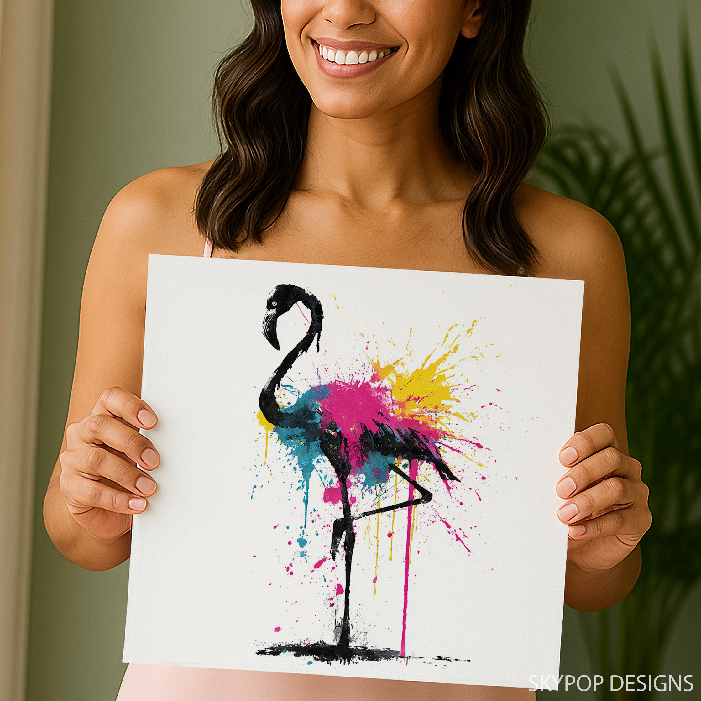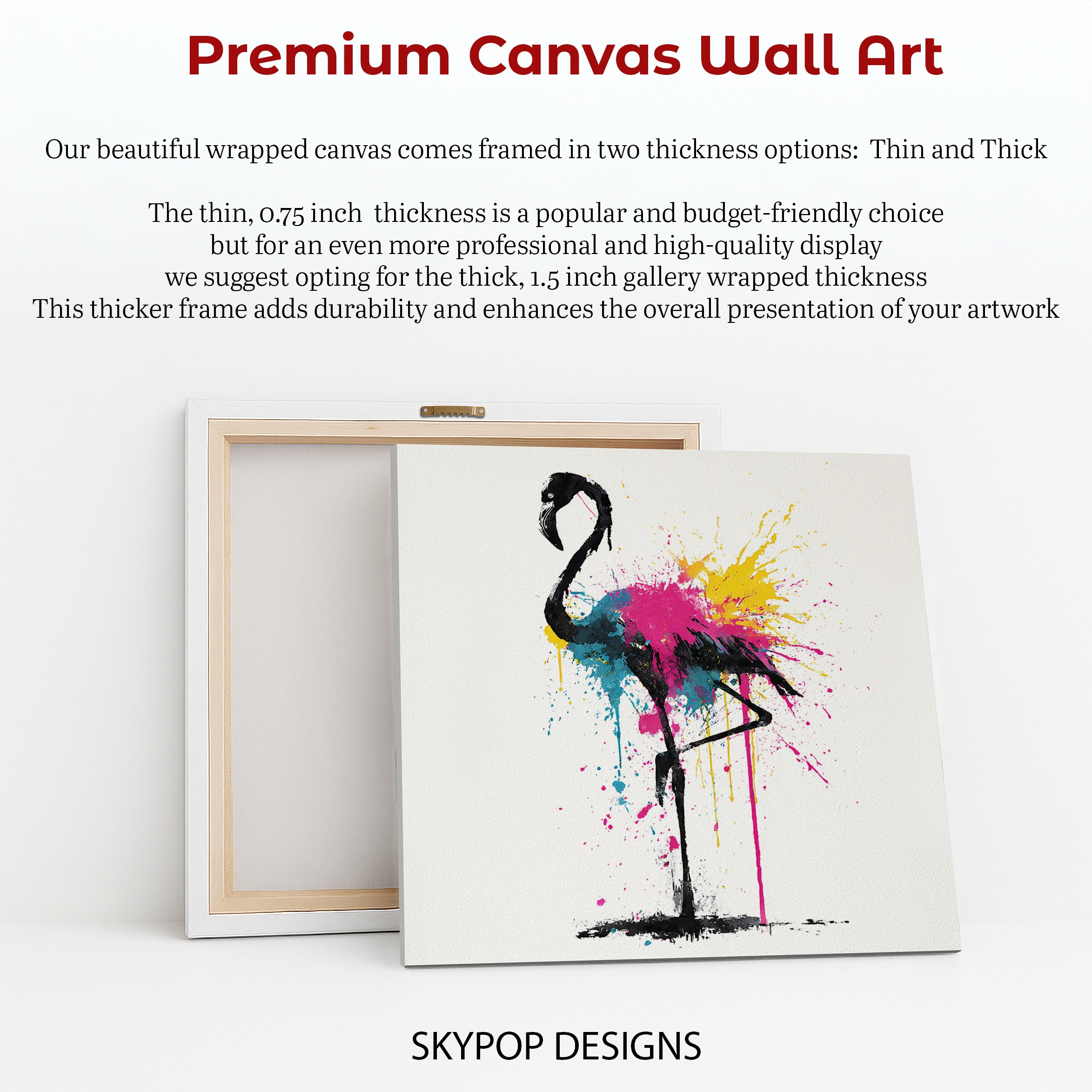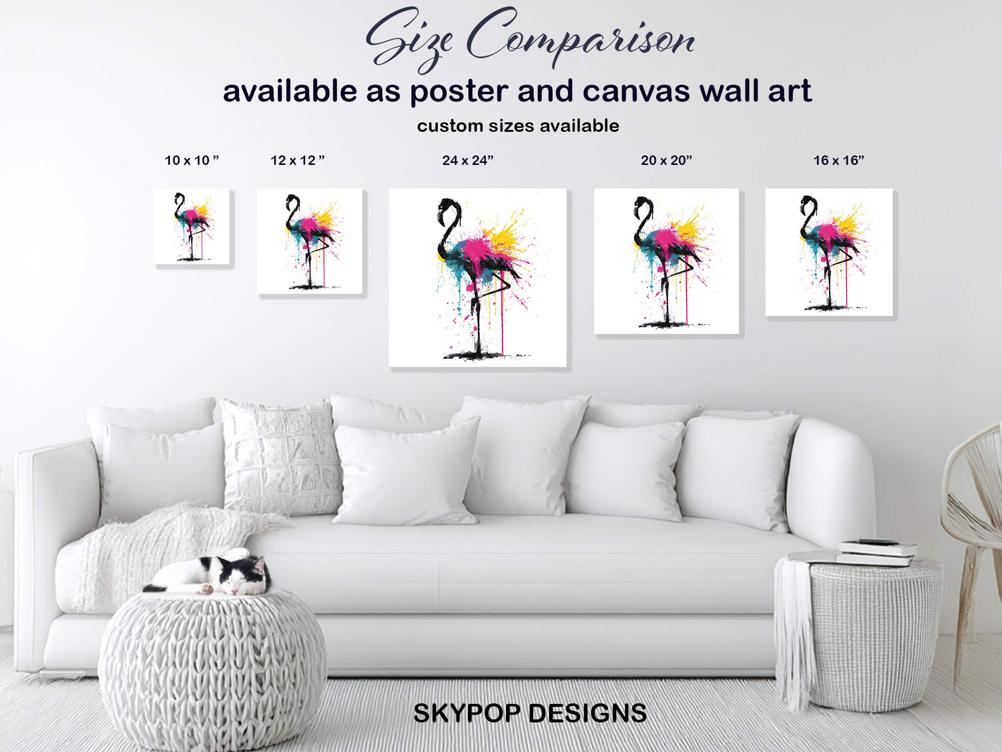 Elevate your space with this stunning flamingo canvas wall art that bursts with vibrant energy and modern flair. This eye-catching poster features a graceful flamingo silhouette brought to life through explosive splashes of pink, yellow, and blue paint. Perfect for adding a pop of color to minimalist living rooms or creating a focal point in bohemian bedrooms, this contemporary piece transforms any wall into a conversation starter. The abstract style beautifully captures the essence of the flamingo while infusing your decor with artistic expression. Ideal for modern offices seeking to inspire creativity or bathrooms in need of a lively touch, this versatile canvas adapts to various interior styles. The contrasting black outline against the colorful splatters creates a visually striking effect that draws the eye and enhances your space’s ambiance. Whether you’re looking for a unique housewarming gift or wanting to refresh your own decor, this flamingo wall art offers the perfect blend of nature-inspired charm and contemporary design. The high-quality printing ensures every vibrant detail and paint splash is captured, making this piece a long-lasting addition to your art collection. Embrace the spirit of summer all year round and let this colorful flamingo artwork breathe new life into your home. Transform your room today with this captivating blend of animal art and abstract expression.