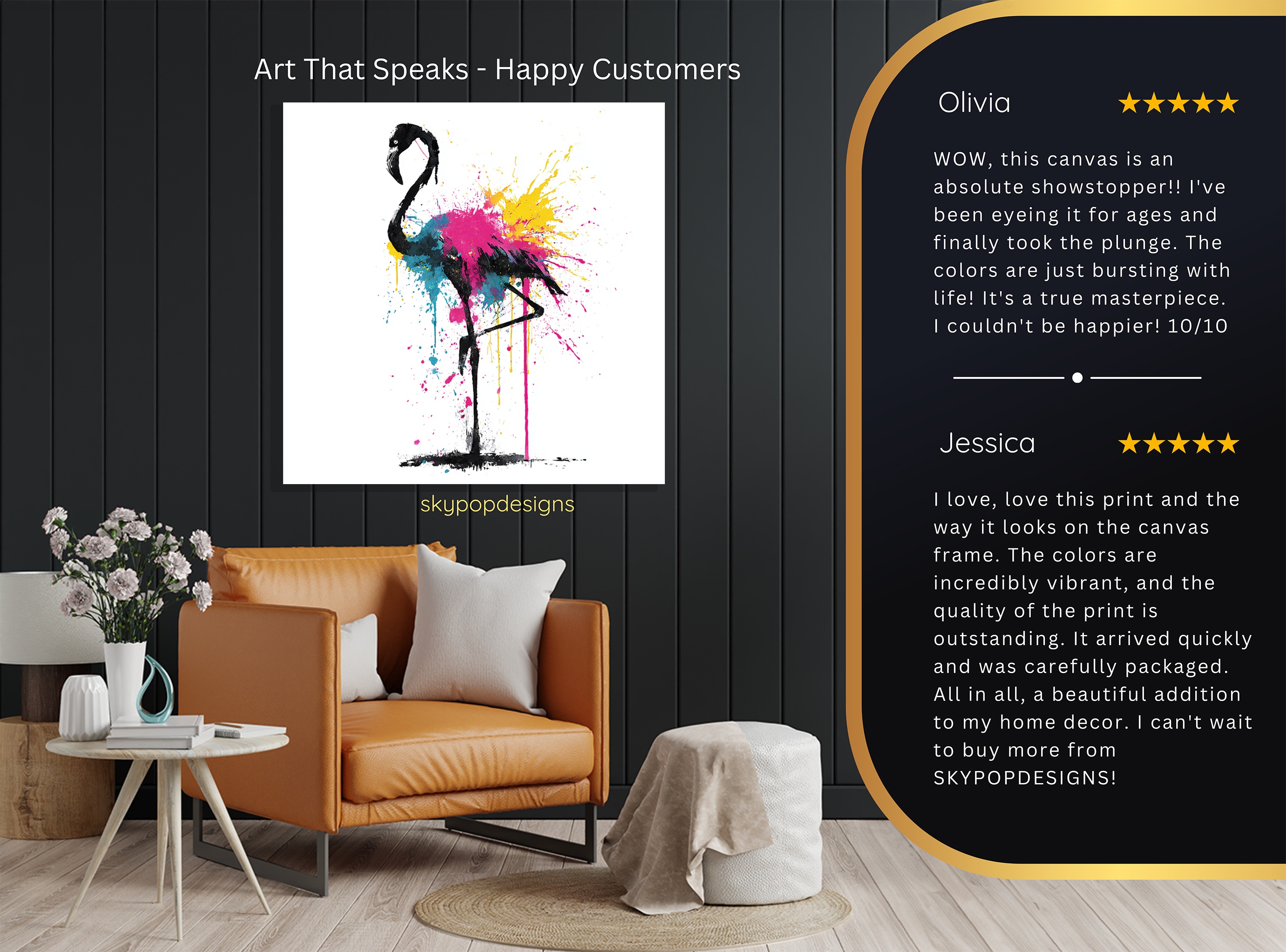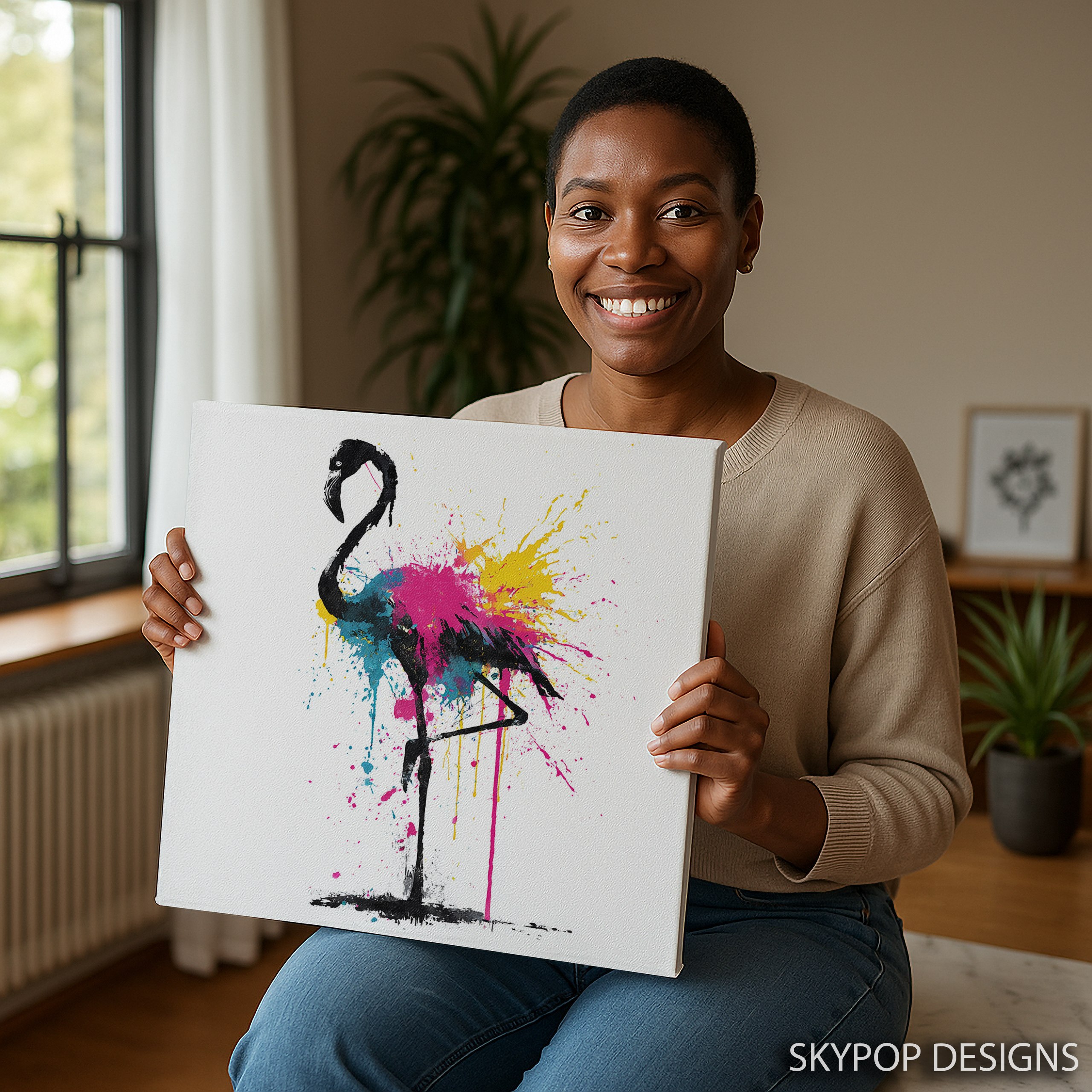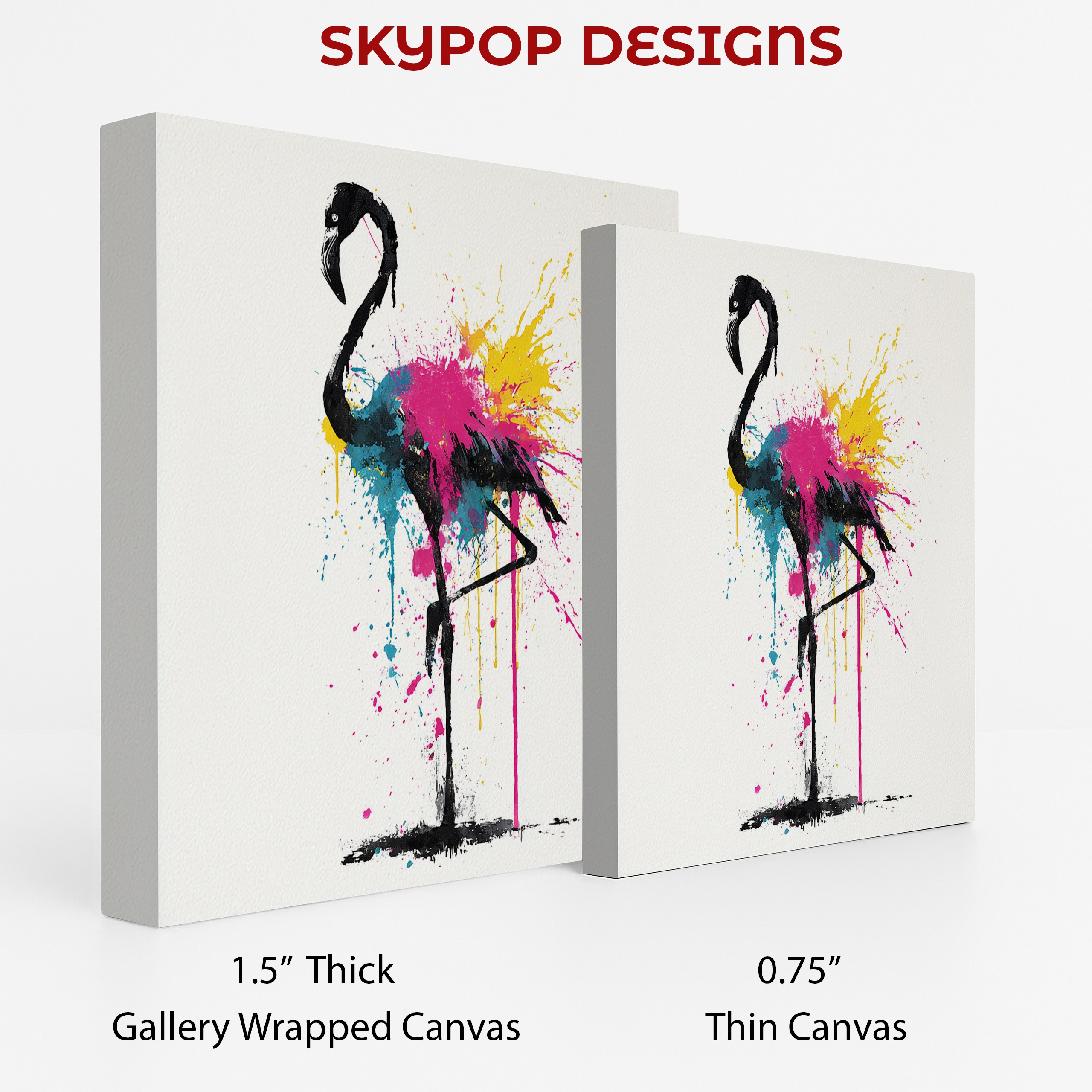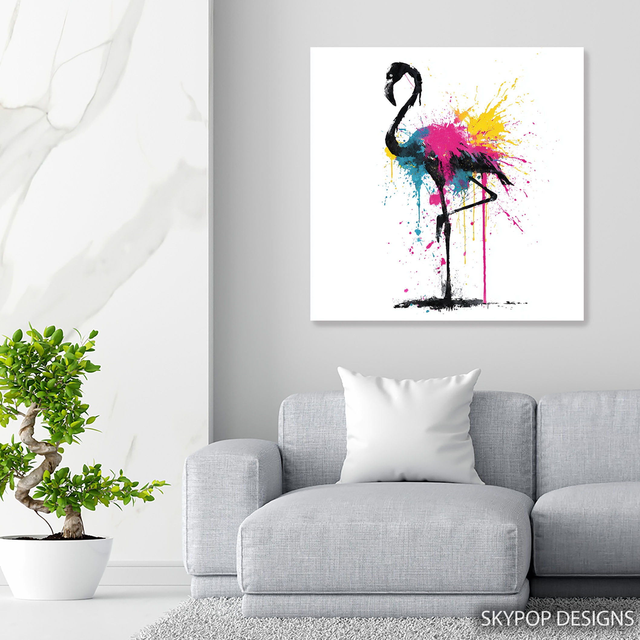 Elevate your space with this stunning flamingo canvas wall art that bursts with vibrant energy and modern flair. This eye-catching poster features a graceful flamingo silhouette brought to life through explosive splashes of pink, yellow, and blue paint. Perfect for adding a pop of color to minimalist living rooms or creating a focal point in bohemian bedrooms, this contemporary piece transforms any wall into a conversation starter. The abstract style beautifully captures the essence of the flamingo while infusing your decor with artistic expression. Ideal for modern offices seeking to inspire creativity or bathrooms in need of a lively touch, this versatile canvas adapts to various interior styles. The contrasting black outline against the colorful splatters creates a visually striking effect that draws the eye and enhances your space’s ambiance. Whether you’re looking for a unique housewarming gift or wanting to refresh your own decor, this flamingo wall art offers the perfect blend of nature-inspired charm and contemporary design. The high-quality printing ensures every vibrant detail and paint splash is captured, making this piece a long-lasting addition to your art collection. Embrace the spirit of summer all year round and let this colorful flamingo artwork breathe new life into your home. Transform your room today with this captivating blend of animal art and abstract expression.