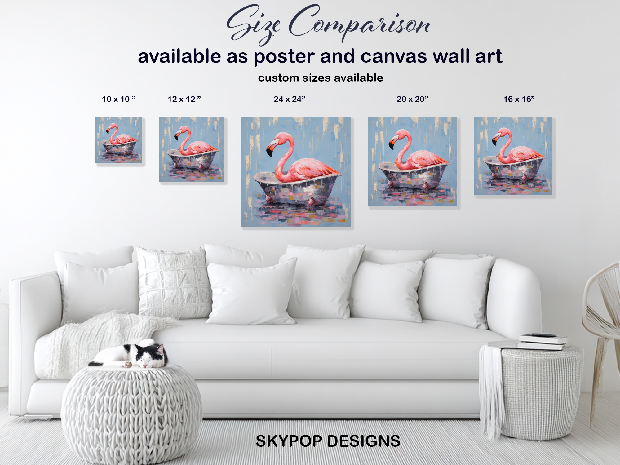 Keywords: Flamingo Art, Canvas Wall Art, Living Room Decor, Bathroom Art, Bedroom Wall Art, Sunroom Decor, Bohemian Decor, Modern Home Decor, Coastal Vibe, Abstract Art, Animal Art, Contemporary Art, Pink Flamingo, Blue Background, Multicolor Art, White Accents, Bathtime Bliss, Textured Brushstrokes, Whimsical Art, Playful Decor, Vibrant Wall Art, Joyful Atmosphere, Relaxing Decor, Eclectic Decor, Statement Piece, Home Decor Gift, Housewarming Gift, Birthday Gift, Animal Lover Gift, Unique Wall Art
