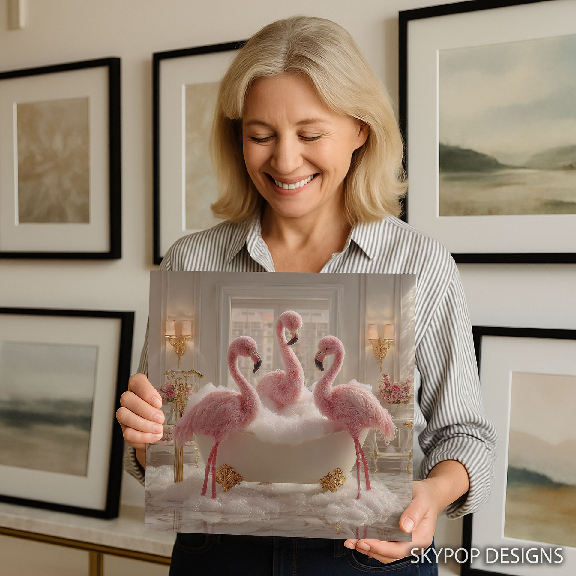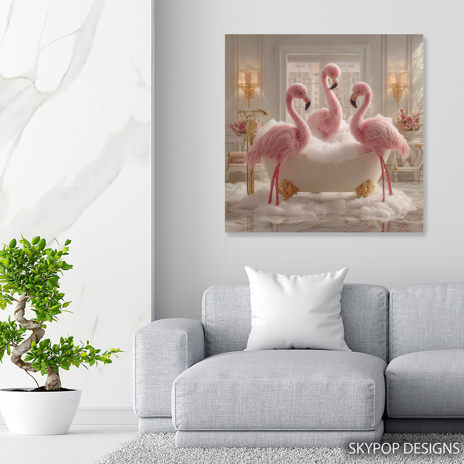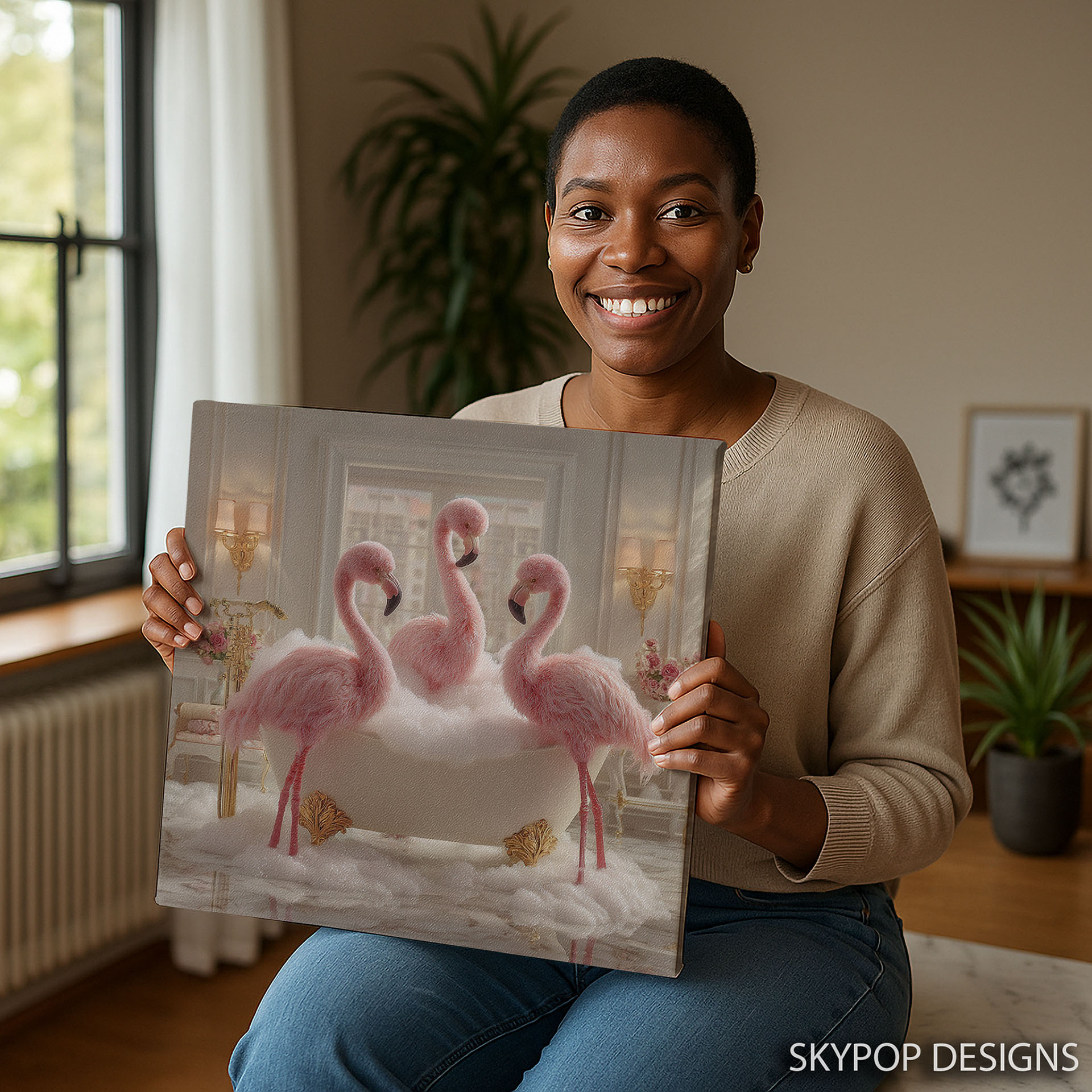 Transform your space with this fun and vibrant flamingo canvas wall art, a playful piece that brings personality to any room. This charming poster or canvas wall art features three fluffy pink flamingos enjoying a bubble bath, creating a whimsical and eye-catching focal point. The soft pink hues combined with the crisp white foam evoke a sense of joy and relaxation, perfect for glam or bohemian decor styles. Ideal for a bathroom, living room, or even a nursery, this animal art piece adds a touch of lighthearted elegance. The striking contrast between the flamingos’ pink feathers and the opulent gold accents in the room makes this wall art truly stand out. This versatile canvas wall art is perfect for creating a modern bedroom atmosphere or adding a unique touch to your contemporary living room decor. High-quality printing ensures every detail of the flamingos’ textured feathers and the overflowing bubbles is captured beautifully. This whimsical artwork serves as a delightful addition to your home, enhancing any space with its striking visuals. Whether you’re looking for a statement piece or a charming accent, this flamingo poster is a fantastic choice for gift-giving occasions like housewarmings or birthdays. Elevate your home decor with this captivating and joyful canvas art that celebrates fun and whimsy. Bring a splash of personality and vibrant color into your home with this delightful flamingo wall art today.