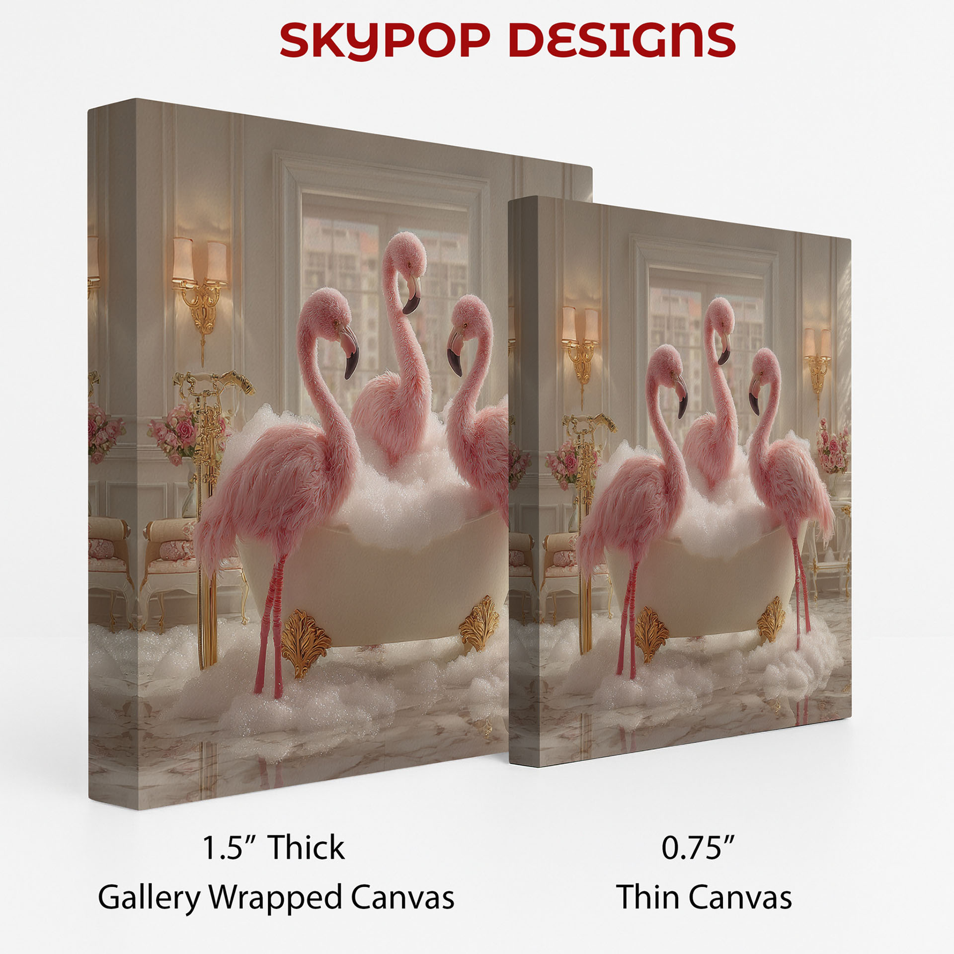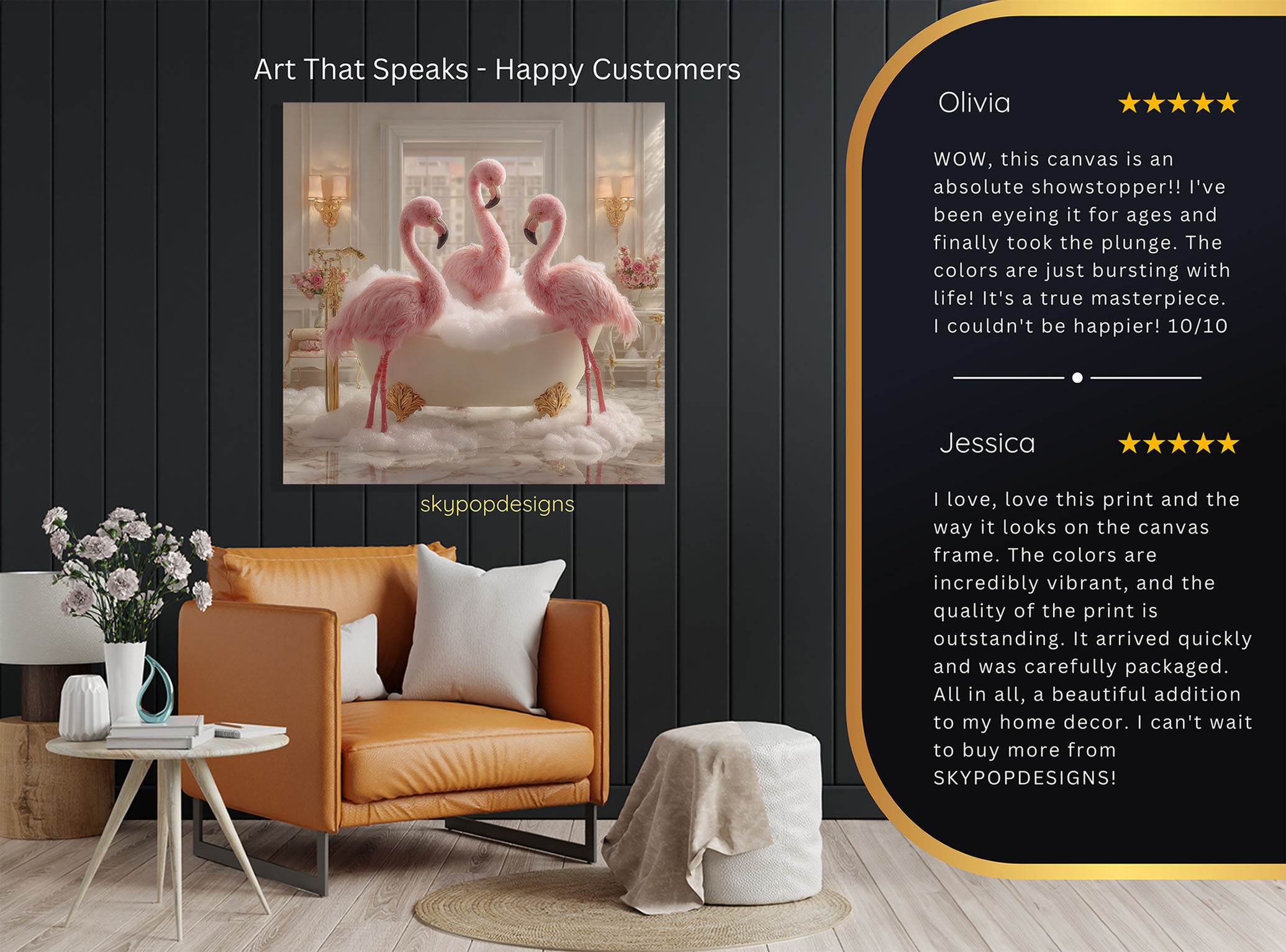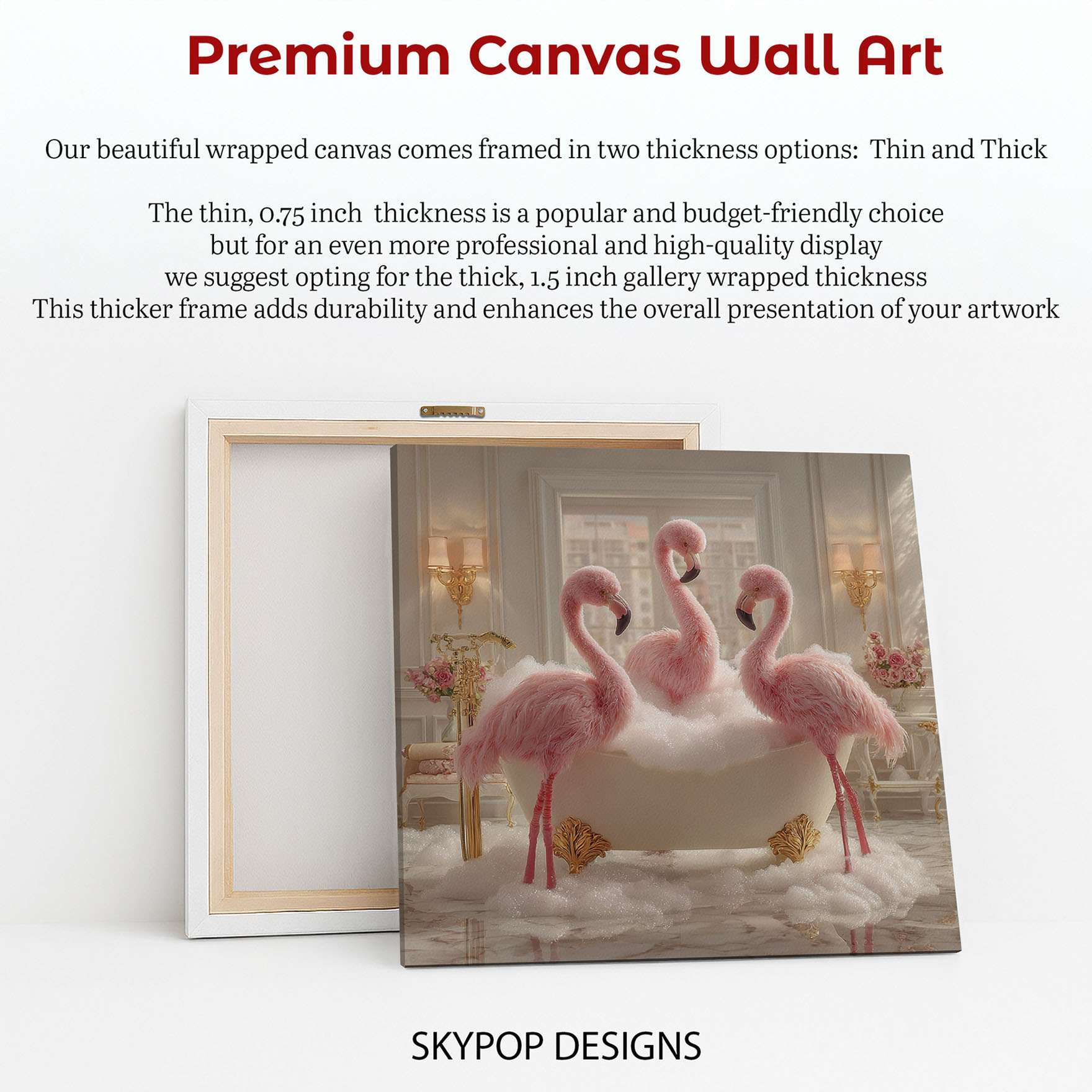 Transform your space with this fun and vibrant flamingo canvas wall art, a playful piece that brings personality to any room. This charming poster or canvas wall art features three fluffy pink flamingos enjoying a bubble bath, creating a whimsical and eye-catching focal point. The soft pink hues combined with the crisp white foam evoke a sense of joy and relaxation, perfect for glam or bohemian decor styles. Ideal for a bathroom, living room, or even a nursery, this animal art piece adds a touch of lighthearted elegance. The striking contrast between the flamingos’ pink feathers and the opulent gold accents in the room makes this wall art truly stand out. This versatile canvas wall art is perfect for creating a modern bedroom atmosphere or adding a unique touch to your contemporary living room decor. High-quality printing ensures every detail of the flamingos’ textured feathers and the overflowing bubbles is captured beautifully. This whimsical artwork serves as a delightful addition to your home, enhancing any space with its striking visuals. Whether you’re looking for a statement piece or a charming accent, this flamingo poster is a fantastic choice for gift-giving occasions like housewarmings or birthdays. Elevate your home decor with this captivating and joyful canvas art that celebrates fun and whimsy. Bring a splash of personality and vibrant color into your home with this delightful flamingo wall art today.