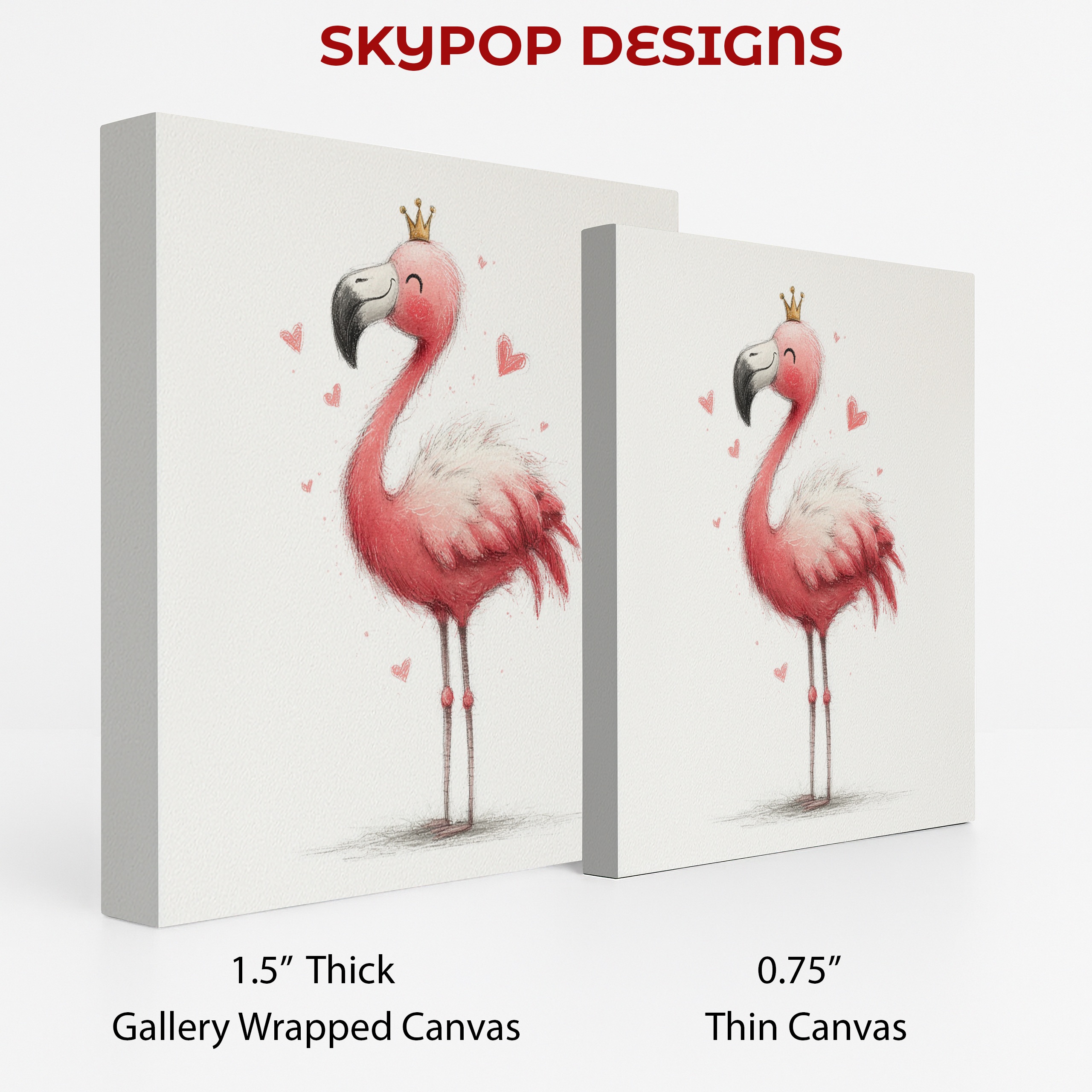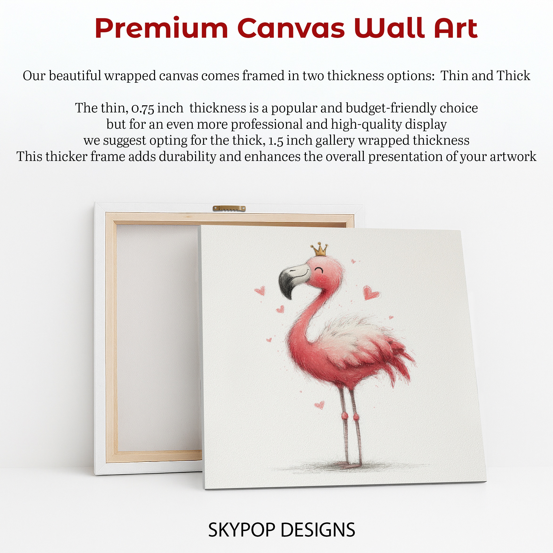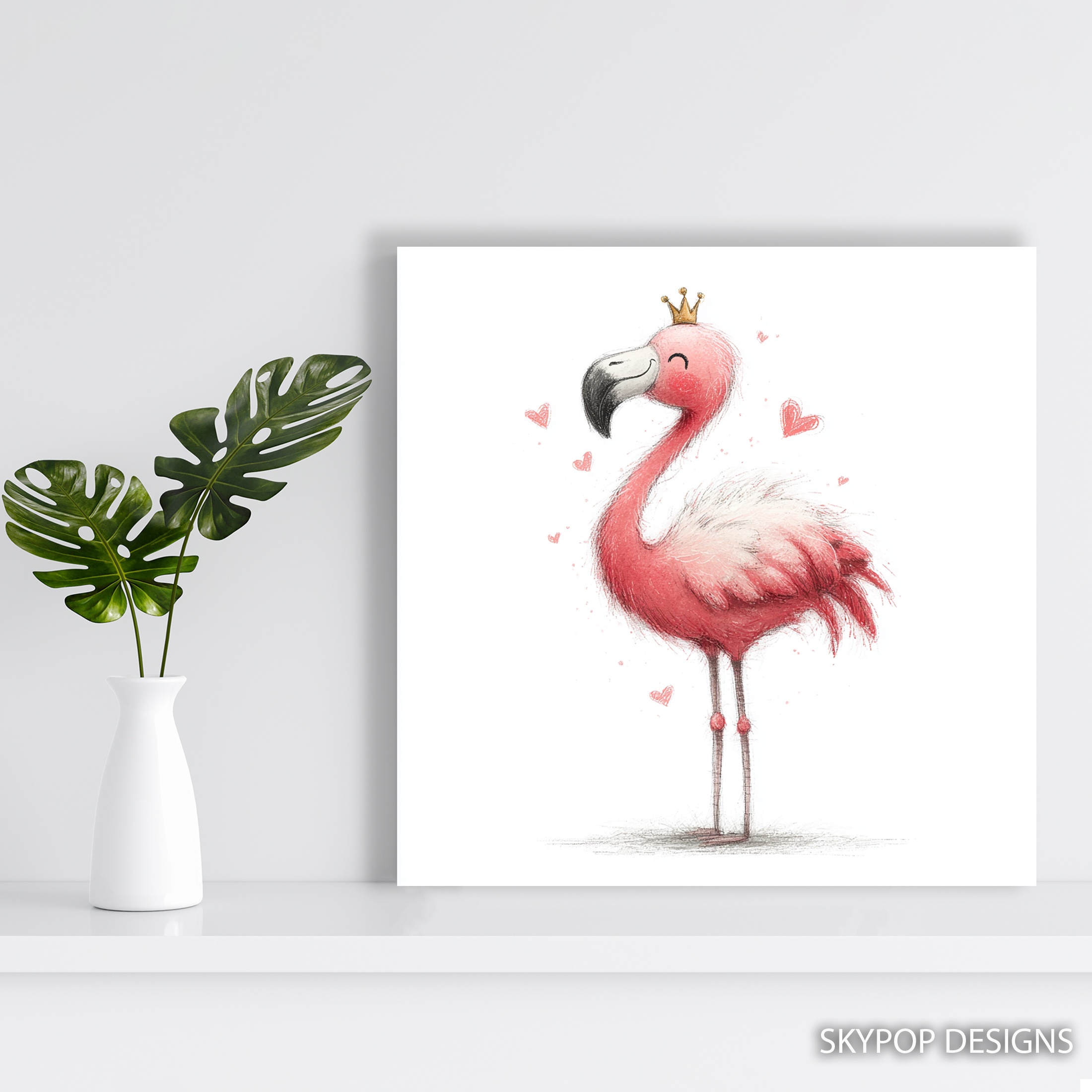 Add a touch of whimsy to your space with this adorable flamingo canvas wall art. This charming poster features a pink flamingo wearing a golden crown, surrounded by delicate heart shapes. Perfect for nurseries, children’s rooms, or any space needing a pop of playful color. The soft watercolor-style illustration brings a dreamy quality to the piece, making it an ideal addition to bohemian or modern decor schemes. The flamingo’s gentle smile and closed eyes evoke a sense of contentment, while the crown adds a regal touch. This versatile canvas art works beautifully as a focal point in bedrooms or as part of a gallery wall in living rooms. The pink and red tones promote feelings of love and warmth, making this poster a thoughtful gift for baby showers or birthdays. High-quality printing ensures every detail shines, from the flamingo’s fluffy feathers to the delicate golden crown. Whether you’re creating a tropical-themed space or simply want to add a dash of fun to your walls, this flamingo art is sure to bring smiles. Transform your room with this sweet and stylish piece that celebrates the beauty of nature with a touch of magic. Elevate your home decor today with this eye-catching flamingo wall art that’s sure to be a conversation starter.
