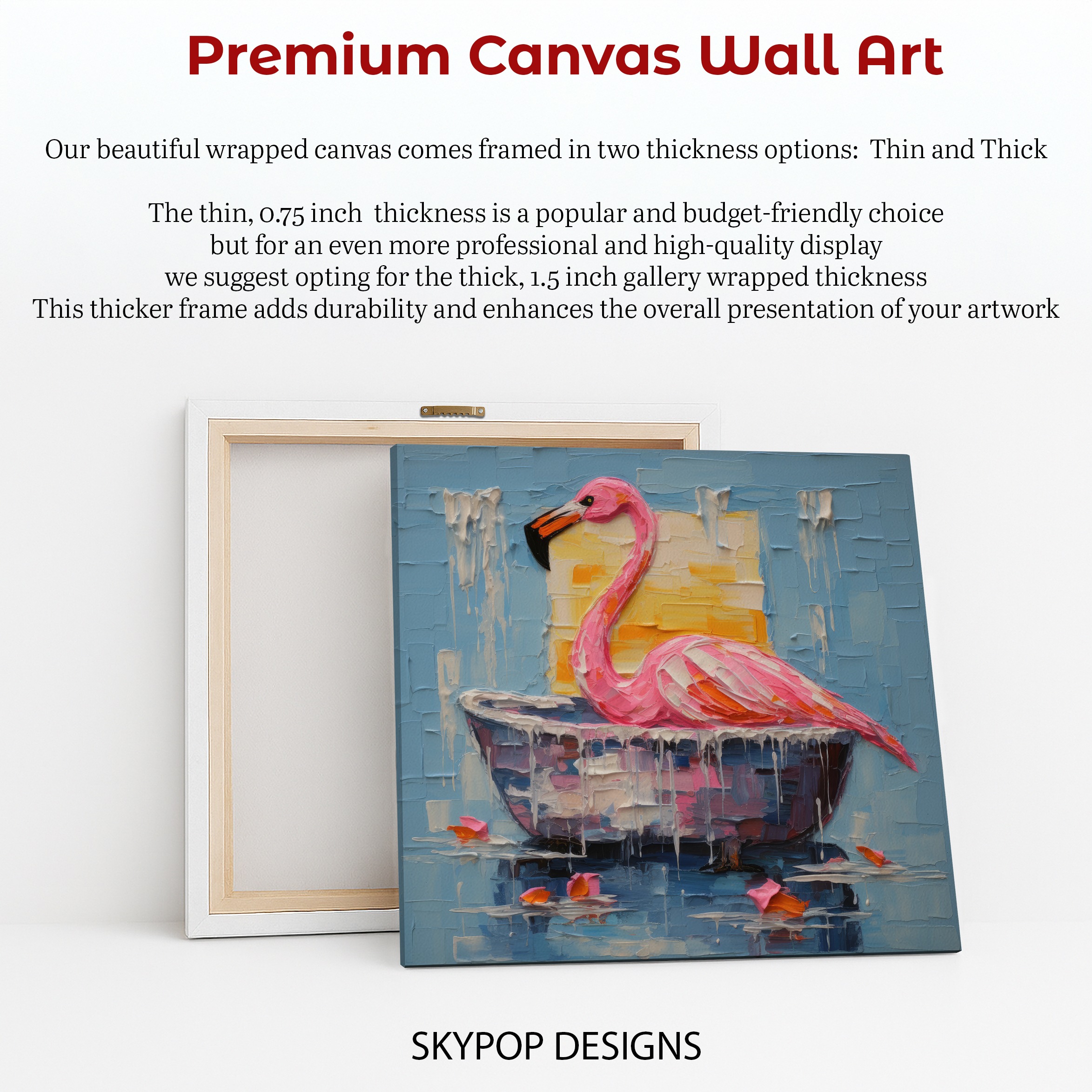 Bring a playful and vibrant touch to your home with this stunning flamingo canvas wall art. This unique poster showcases a charming flamingo enjoying a relaxing bath, rendered in a bold impasto style that adds incredible texture and depth. The striking pink of the flamingo pops against the cool blues and warm yellows, creating a captivating visual that’s sure to be a conversation starter. This eye-catching canvas art is perfect for transforming your living room or adding a splash of personality to your bathroom decor. Ideal for those who love bohemian or contemporary styles, this piece also fits beautifully into modern settings. The vibrant colors evoke a sense of joy and tranquility, making it an inspiring addition to any space. Whether you’re looking for modern living room wall decor or a unique bathroom poster, this artwork delivers. It’s a fantastic gift idea for housewarmings, birthdays, or holidays, celebrated for its whimsical subject and artistic execution. The textured brushwork enhances the visual appeal, making this poster a true statement piece. Elevate your home atmosphere with this delightful flamingo artwork, celebrating a moment of whimsical relaxation. This high-quality canvas wall art transforms any room into a vibrant sanctuary. Embrace the unexpected with this captivating flamingo print today.