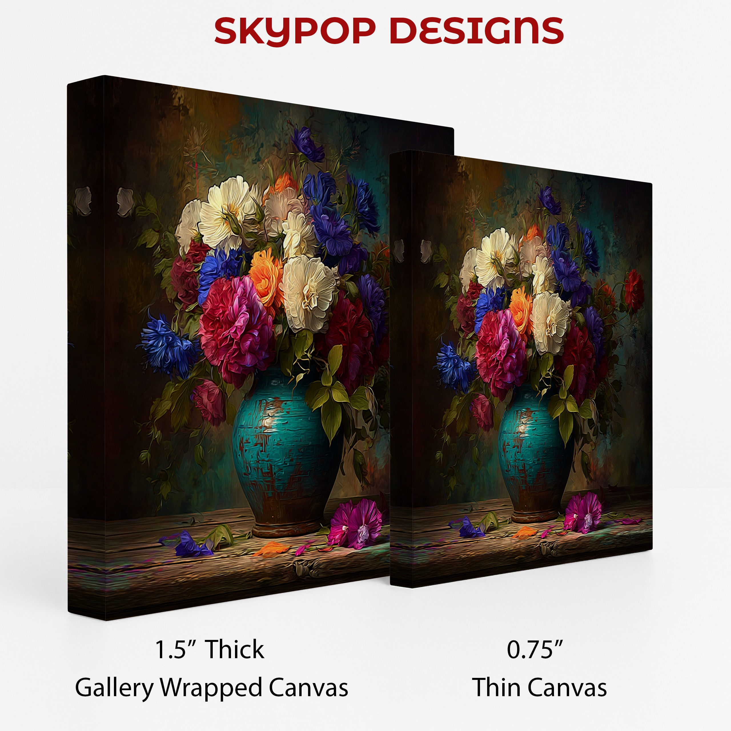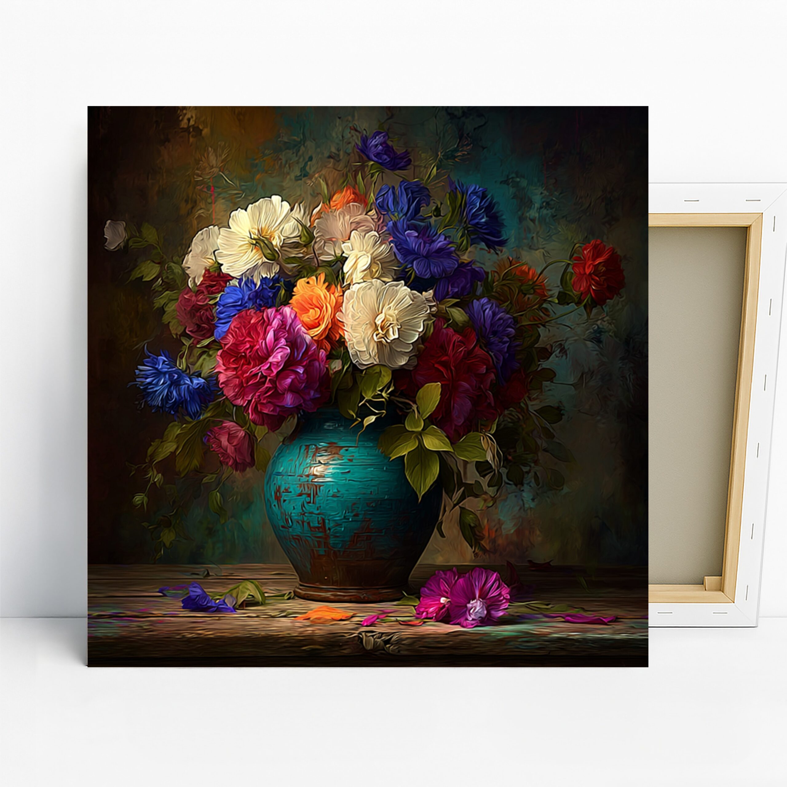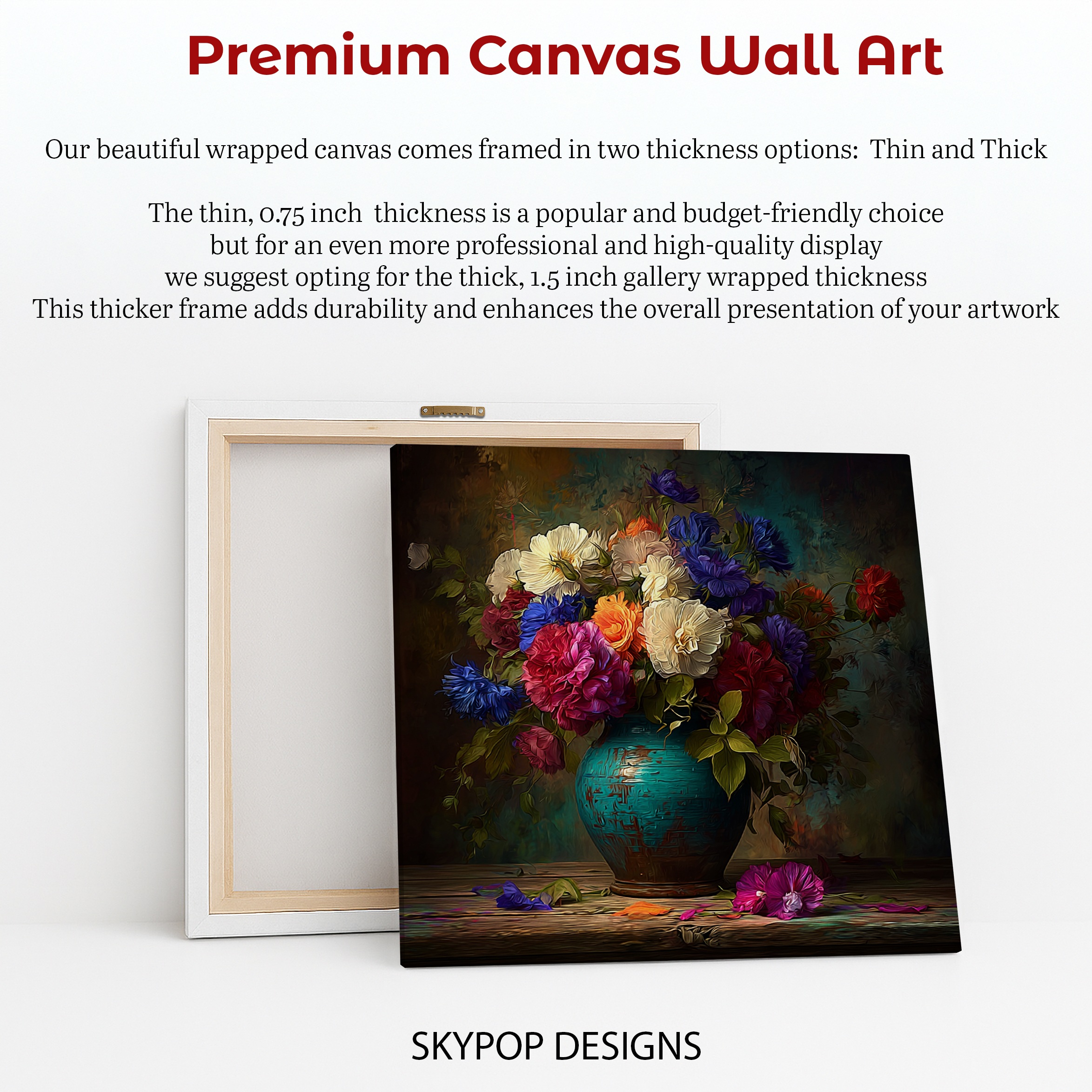 Transform your home with this stunning floral canvas wall art, showcasing a vibrant bouquet of colorful flowers in a rustic teal vase. This captivating poster art brings the beauty of nature indoors, perfect for adding a touch of classic elegance to your living room or dining room decor. The impressionistic style and rich, multicolor palette create an inviting atmosphere, ideal for traditional or farmhouse interiors. The striking teal vase and the deep brown of the wooden table ground the composition, while pops of red, blue, and orange flowers add dynamic energy. This high-quality canvas print is a beautiful display of floral art, capturing the delicate textures and lushness of the blooms. Elevate your space with this eye-catching piece that’s great for enhancing a bedroom or entryway, offering timeless beauty. It makes a thoughtful housewarming gift or an exquisite addition to any art lover’s collection. The intricate details and vibrant colors make this wall art a true statement piece. Add a touch of nature’s splendor to your home or office. Inspire a sense of calm and beauty with this exquisite floral artwork today.