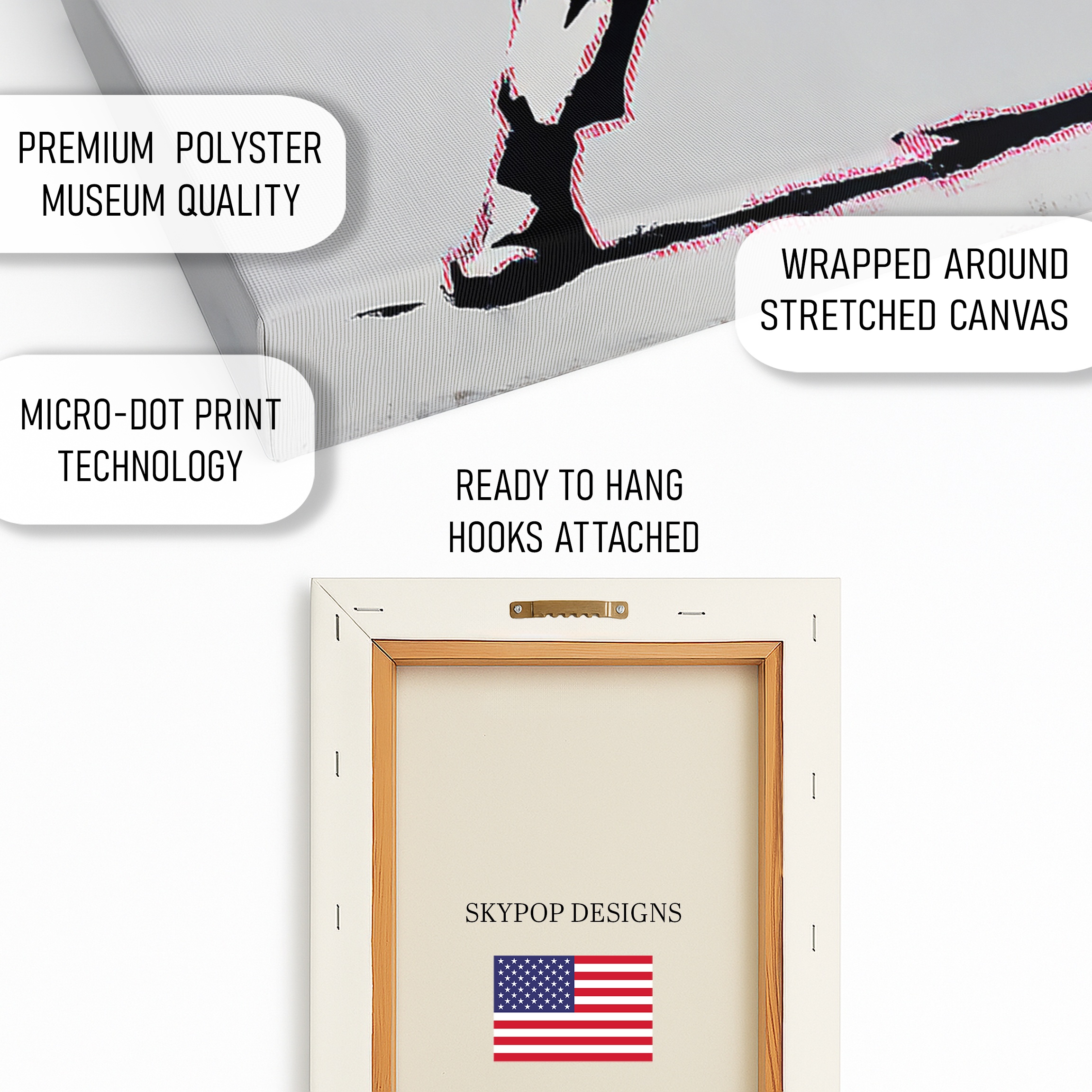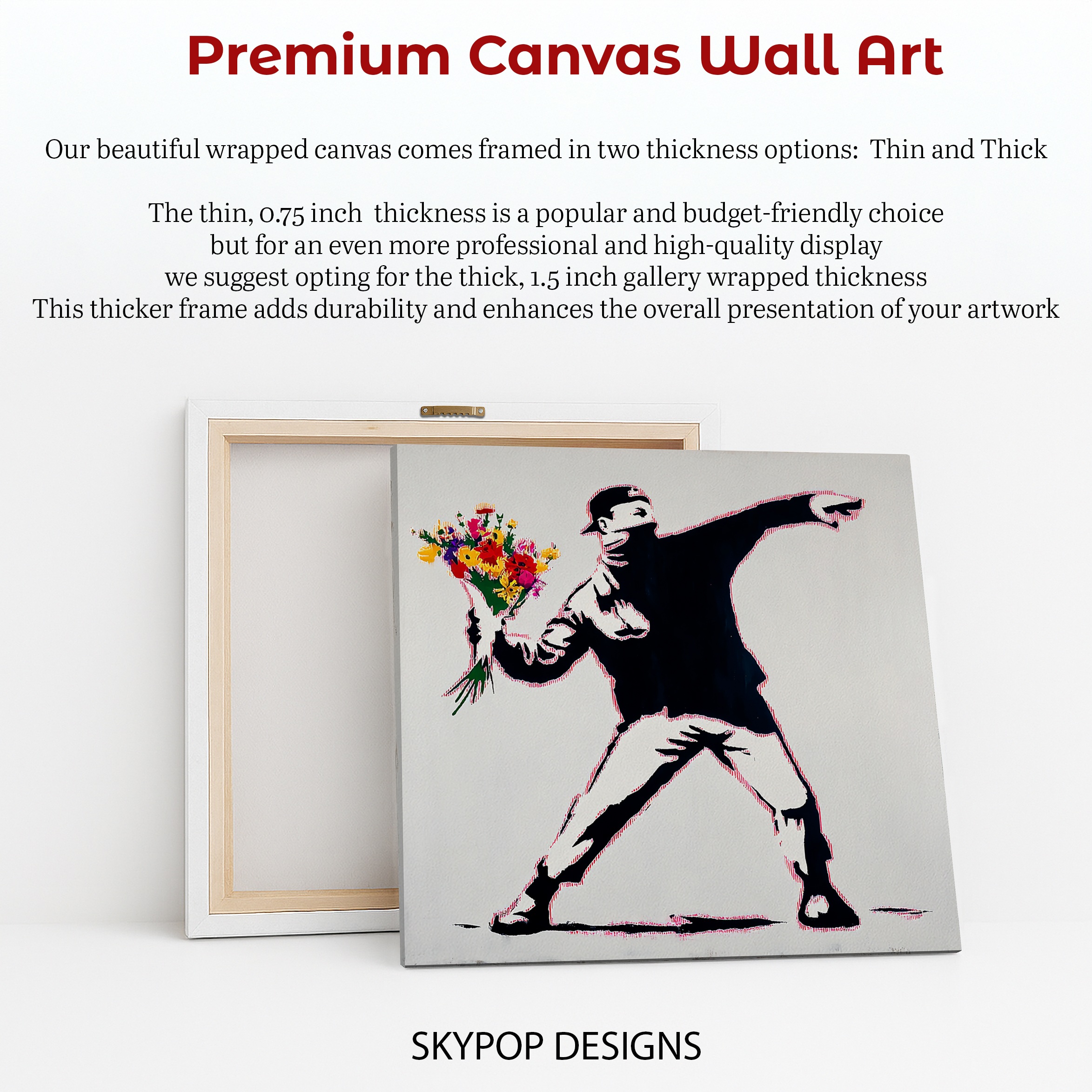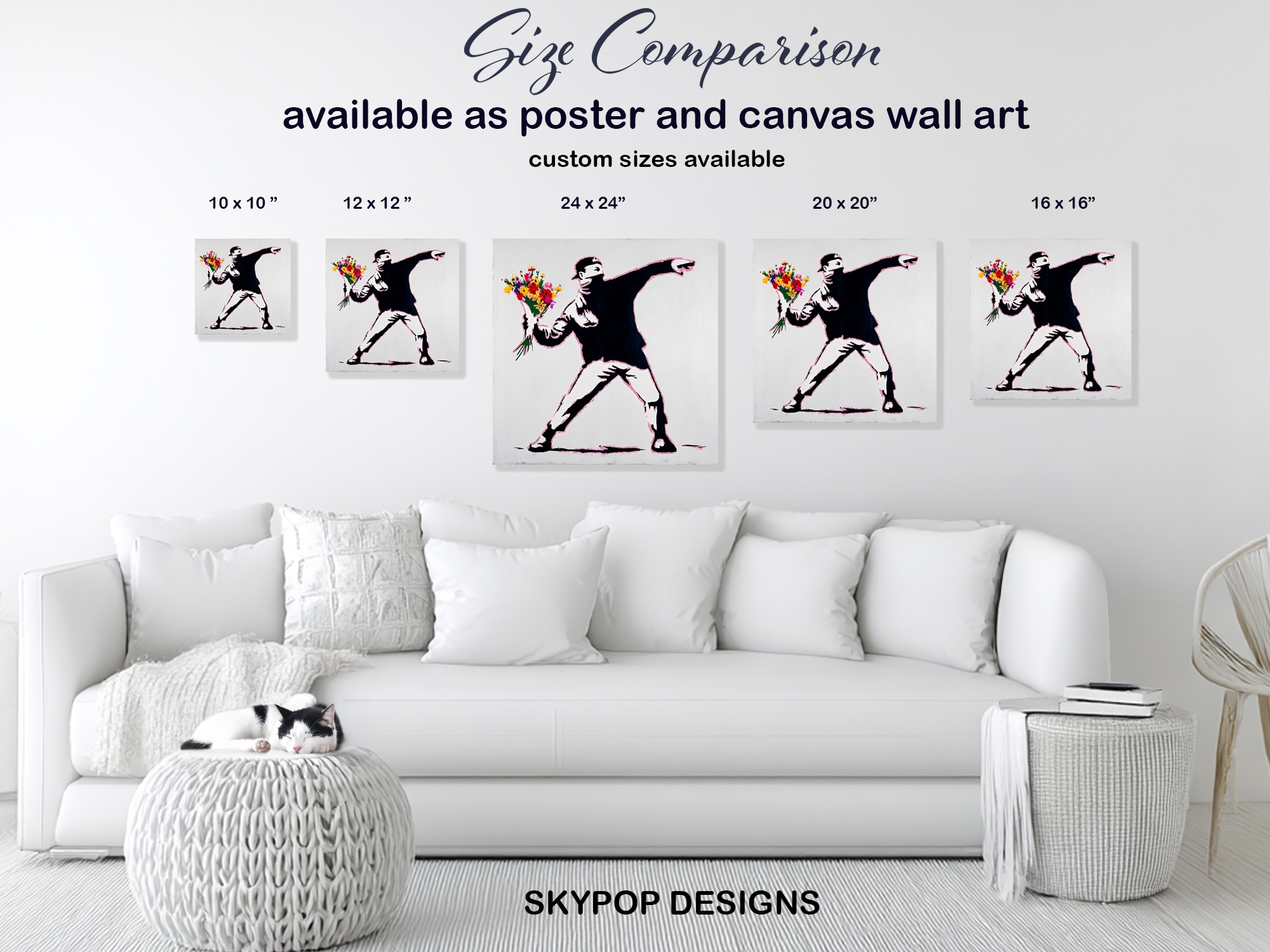 Transform your space with this iconic street art canvas that captures the essence of urban rebellion and hope. This striking poster features a black silhouette figure in a dynamic throwing pose, but instead of a weapon, they’re hurling a vibrant bouquet of colorful flowers. The stark contrast between the monochrome figure and the explosion of floral hues creates a powerful visual impact, perfect for modern living room wall decor or an edgy office space. This canvas wall art embodies the spirit of peaceful protest and the transformative power of art in urban landscapes. The bold, stencil-like style is instantly recognizable and adds a touch of street credibility to any interior. Ideal for contemporary decor enthusiasts, this piece works beautifully in minimalist settings, providing a pop of color and conversation-starting imagery. The artwork’s message of choosing beauty over violence resonates deeply, making it a meaningful addition to your home or a thoughtful gift for art lovers. Whether displayed in a trendy loft, creative studio, or eclectic bedroom, this canvas art piece commands attention and inspires reflection. The high-quality print ensures every detail is captured, from the figure’s determined stance to the delicate petals of the floral bouquet. Elevate your wall decor with this powerful blend of street art edge and floral softness. Make a statement in your space today with this unforgettable piece of urban art that celebrates creativity and peaceful resistance.