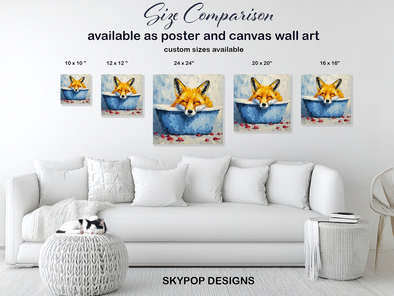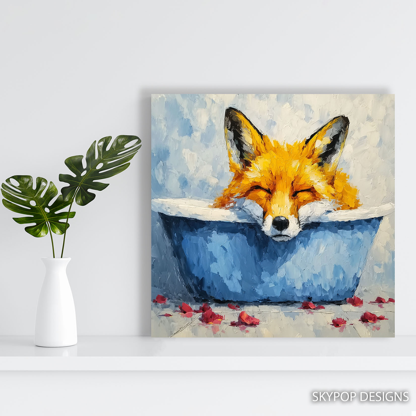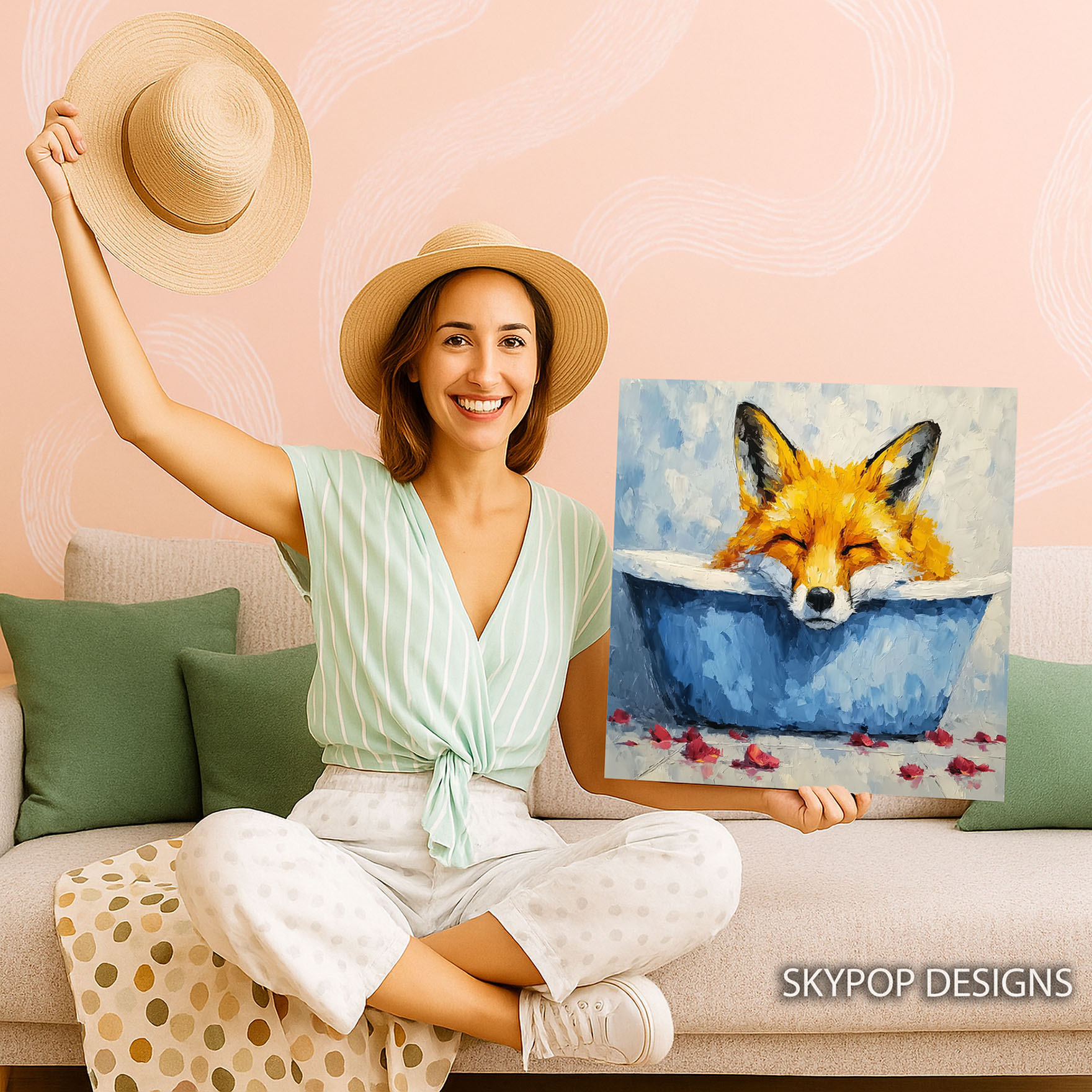 Transform your space with this charming fox canvas wall art that captures a moment of pure relaxation. This delightful poster or canvas wall art features a whimsical fox enjoying a bubbly bath in a blue tub, bringing a touch of playful charm and cozy vibes to any room. The vibrant oranges and yellows of the fox pop against the cool blues and whites, creating a striking and eye-catching piece of wall decor. Perfect for adding personality to a modern bathroom, a fun children’s room, or a cozy living room, this animal art is sure to bring smiles. The textured brushstrokes add depth and visual interest, making this canvas wall art a truly captivating addition to your home. Ideal for bohemian or Scandinavian decor styles, this artwork injects warmth and character into minimalist spaces. The red rose petals scattered around the tub add a romantic and luxurious touch, enhancing the overall appeal of this unique poster. Use it to inspire and uplift, creating a spa-like atmosphere of tranquility and self-care. This versatile art piece is also a fantastic gift idea for housewarmings, birthdays, or holidays, appealing to animal lovers of all ages. Elevate your home decor with this high-quality canvas wall art that celebrates the simple pleasures of life. Make your walls a source of joy and conversation with this adorable fox bath time painting today.