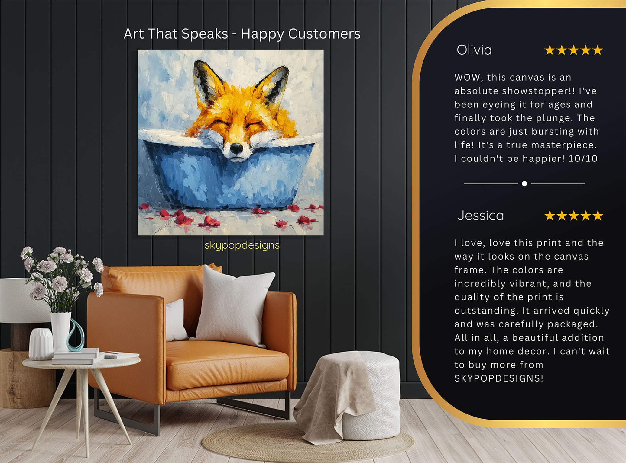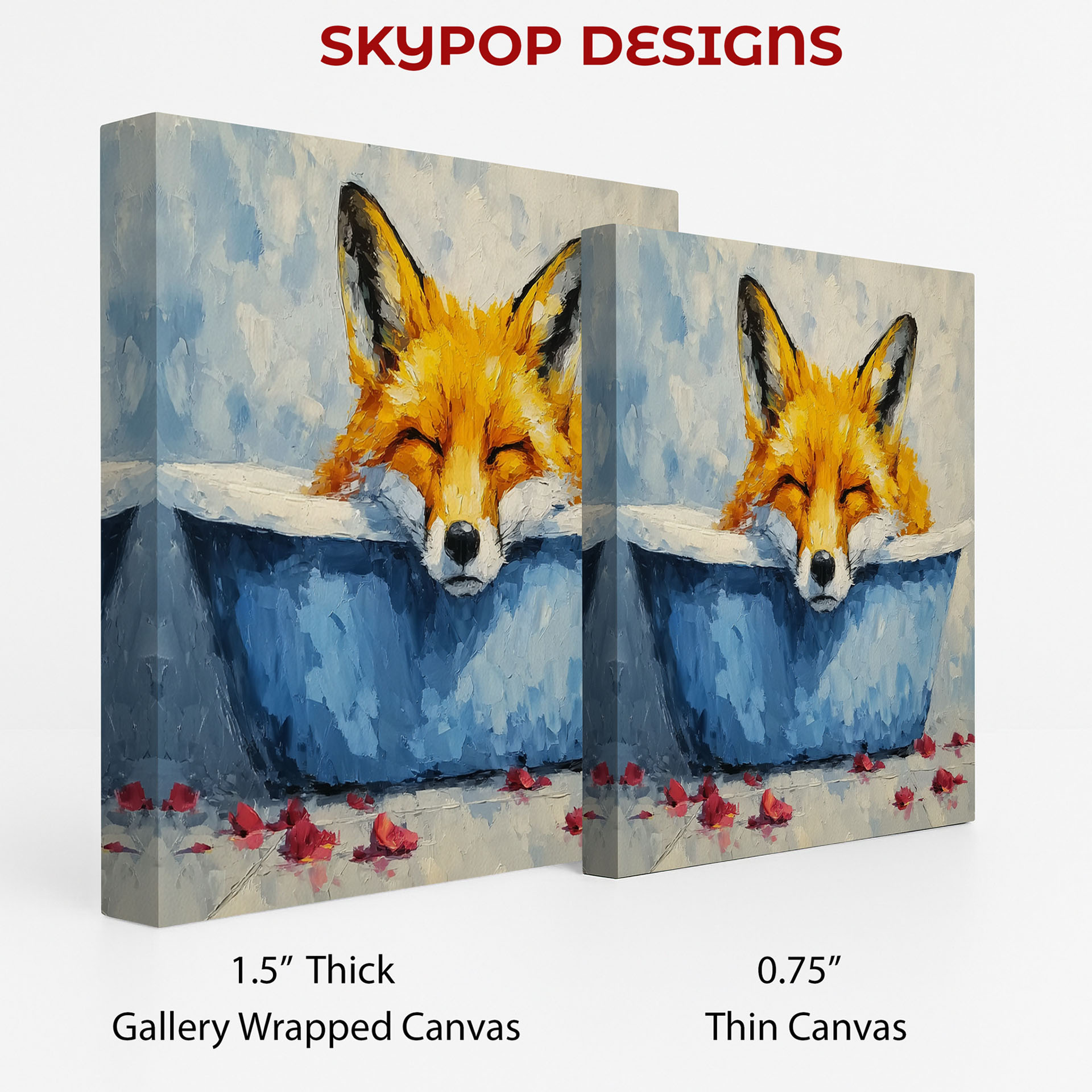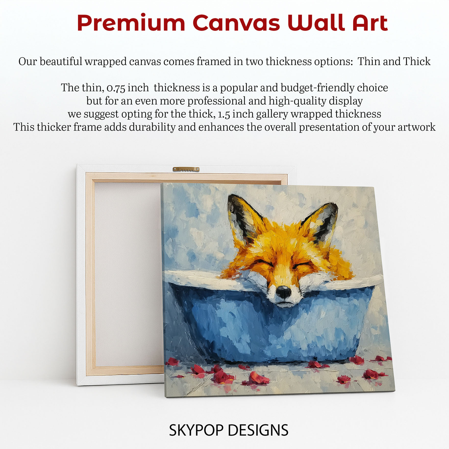 Transform your space with this charming fox canvas wall art that captures a moment of pure relaxation. This delightful poster or canvas wall art features a whimsical fox enjoying a bubbly bath in a blue tub, bringing a touch of playful charm and cozy vibes to any room. The vibrant oranges and yellows of the fox pop against the cool blues and whites, creating a striking and eye-catching piece of wall decor. Perfect for adding personality to a modern bathroom, a fun children’s room, or a cozy living room, this animal art is sure to bring smiles. The textured brushstrokes add depth and visual interest, making this canvas wall art a truly captivating addition to your home. Ideal for bohemian or Scandinavian decor styles, this artwork injects warmth and character into minimalist spaces. The red rose petals scattered around the tub add a romantic and luxurious touch, enhancing the overall appeal of this unique poster. Use it to inspire and uplift, creating a spa-like atmosphere of tranquility and self-care. This versatile art piece is also a fantastic gift idea for housewarmings, birthdays, or holidays, appealing to animal lovers of all ages. Elevate your home decor with this high-quality canvas wall art that celebrates the simple pleasures of life. Make your walls a source of joy and conversation with this adorable fox bath time painting today.