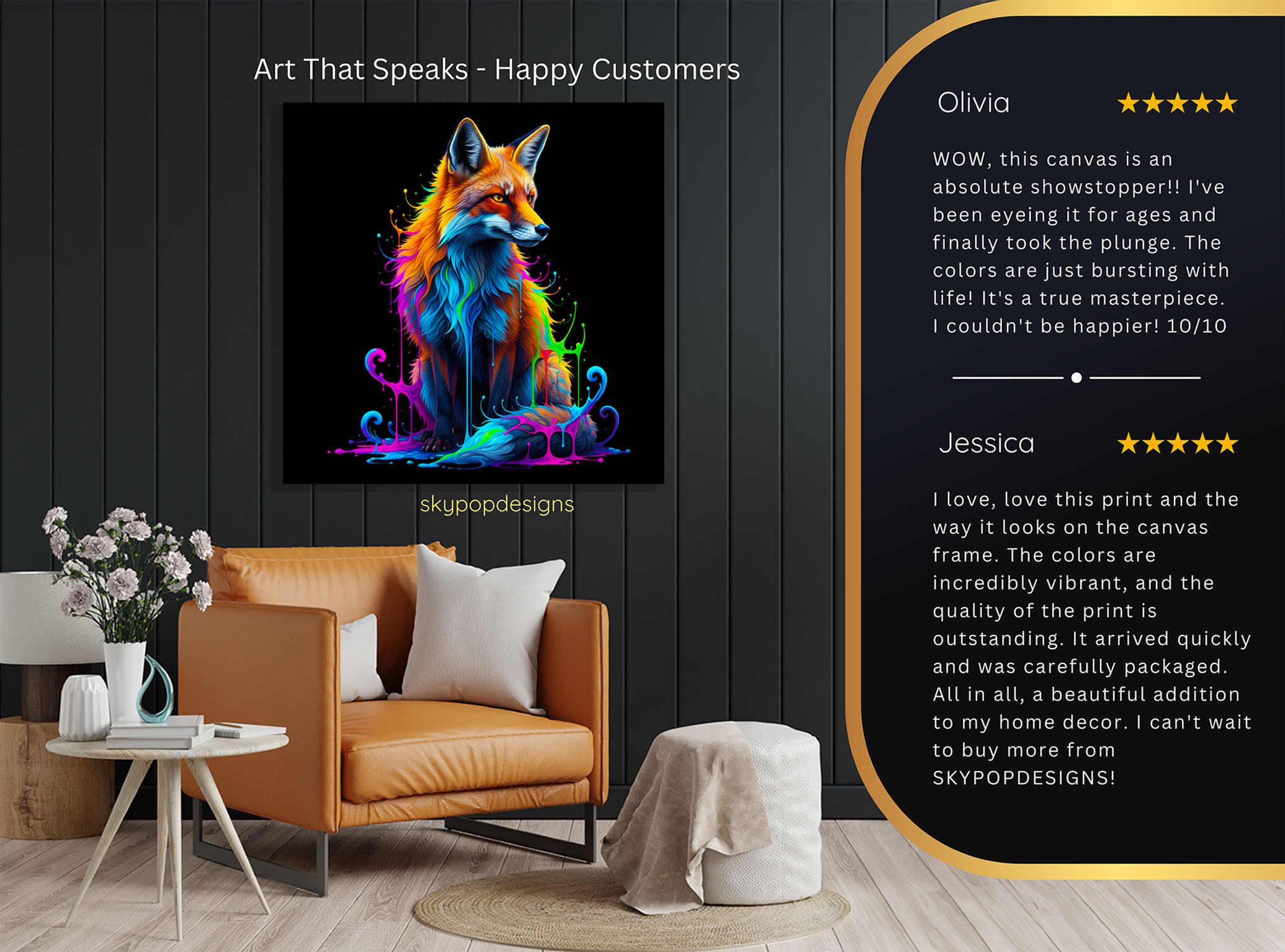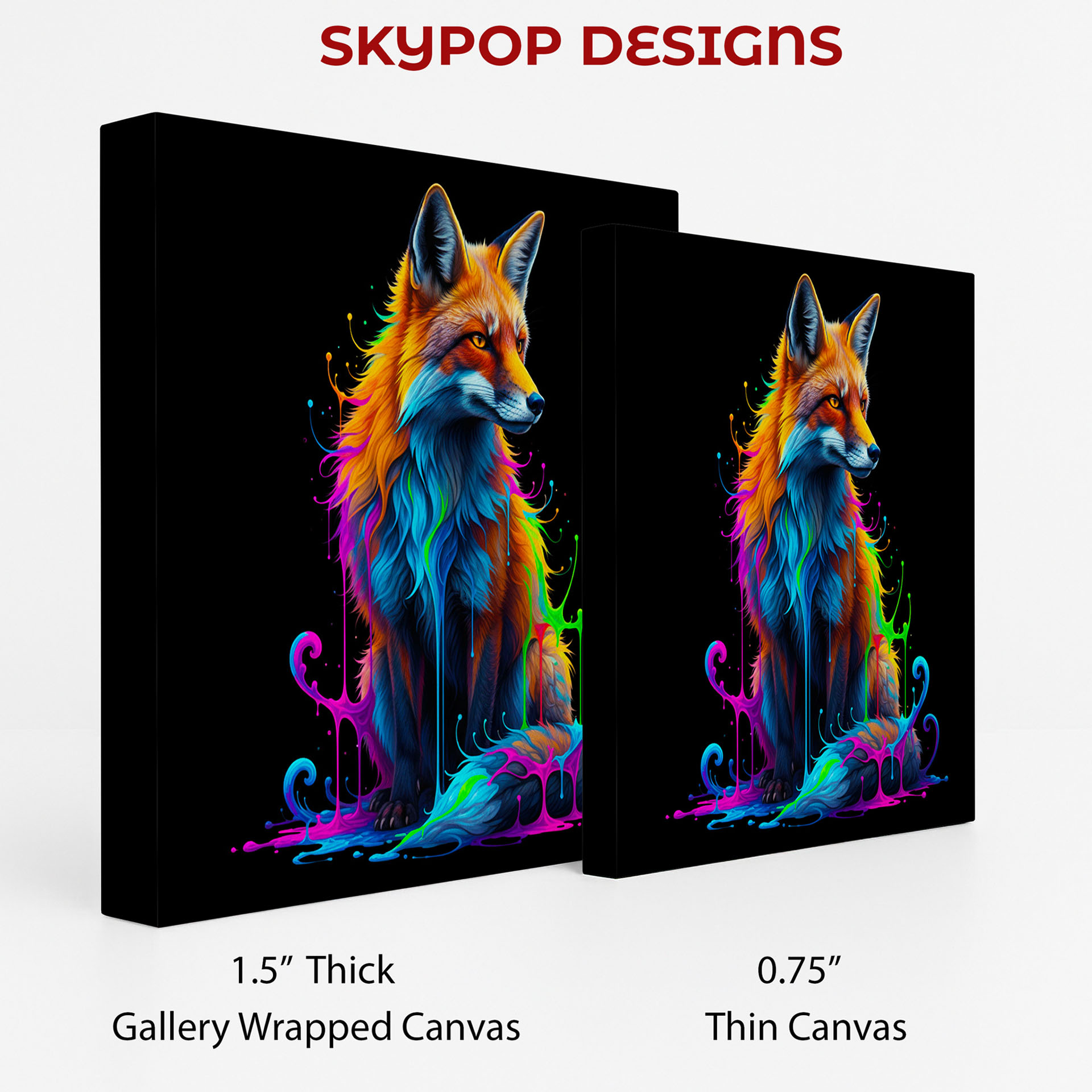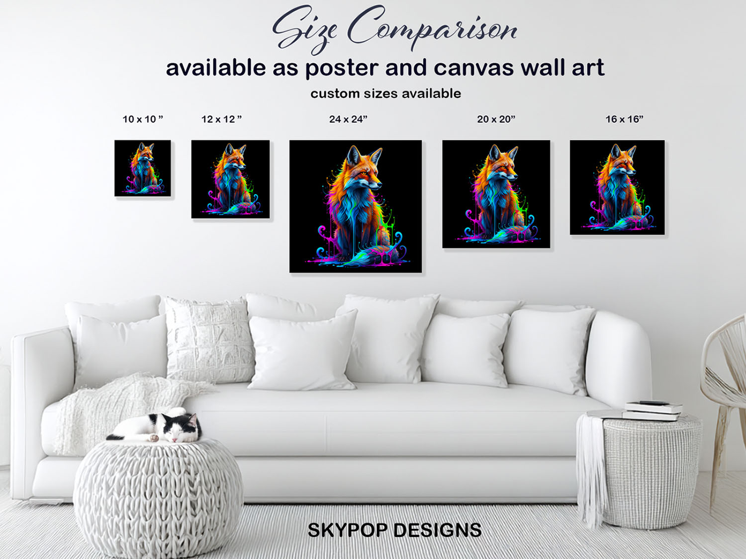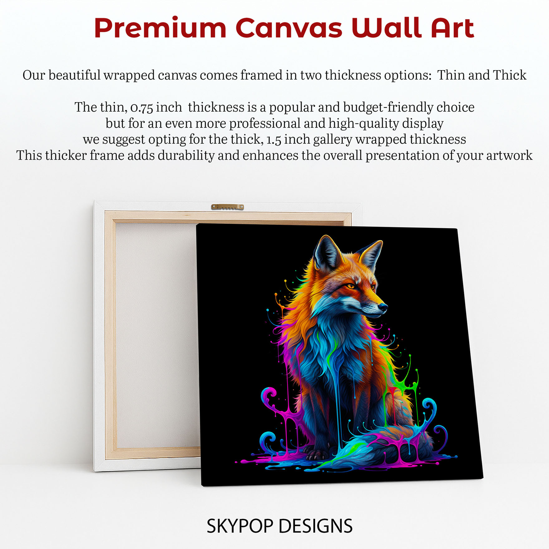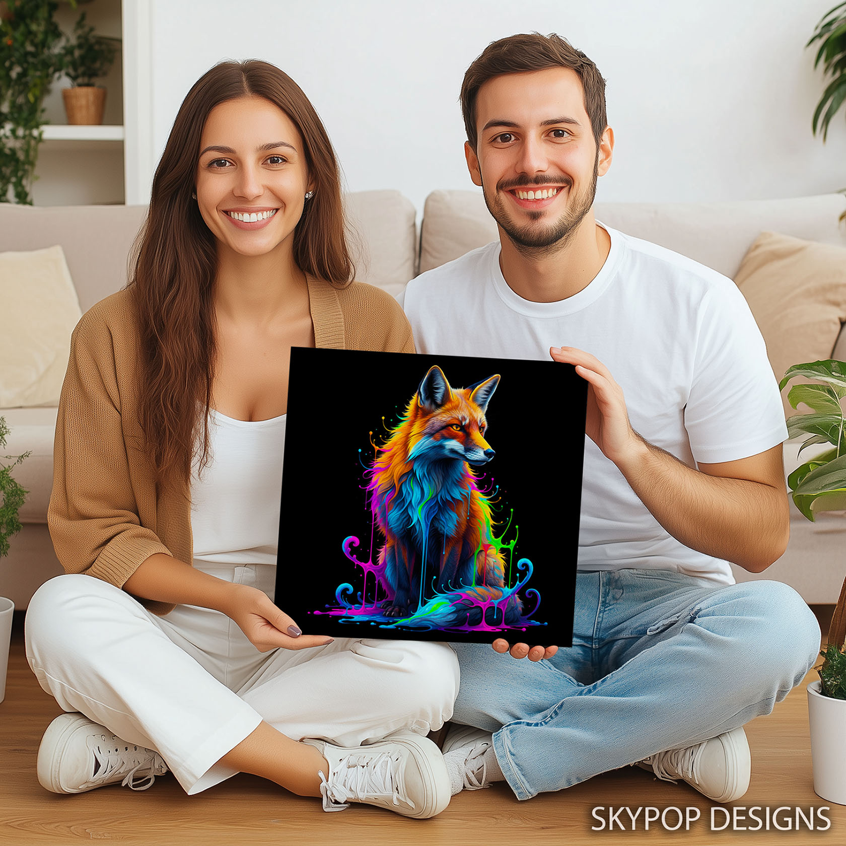 Transform your space with this captivating fox canvas wall art, a striking piece that electrifies any room with its vibrant, neon-infused design. This poster or canvas wall art showcases a fox rendered in a dynamic pop art and street art style, featuring bold colors and dripping paint effects that create a truly eye-catching statement. The multicolor palette, with its pops of electric blue, fiery orange, and neon pink, is perfect for adding a burst of energy to modern living rooms or elevating your workspace decor. Ideal for bohemian interiors, this animal art piece adds a touch of edgy sophistication and playful character. The striking contrast of the fox against the deep black background makes this canvas wall art a powerful focal point that sparks conversation and inspires creativity. High-quality printing ensures the vivid colors and intricate details of the dripping paint are rendered with stunning clarity, making this poster a durable and impressive addition to your wall decor. This versatile fox artwork is perfect for a game room, a contemporary bedroom, or any space wanting a bold artistic touch. It makes an ideal gift for art lovers, animal enthusiasts, or anyone looking to infuse their home with modern, vibrant decor. Elevate your home’s aesthetic with this unique blend of art and nature that celebrates individuality and bold expression. Add this exciting drip fox canvas wall art to your collection and bring a modern, artistic flair to your home today.