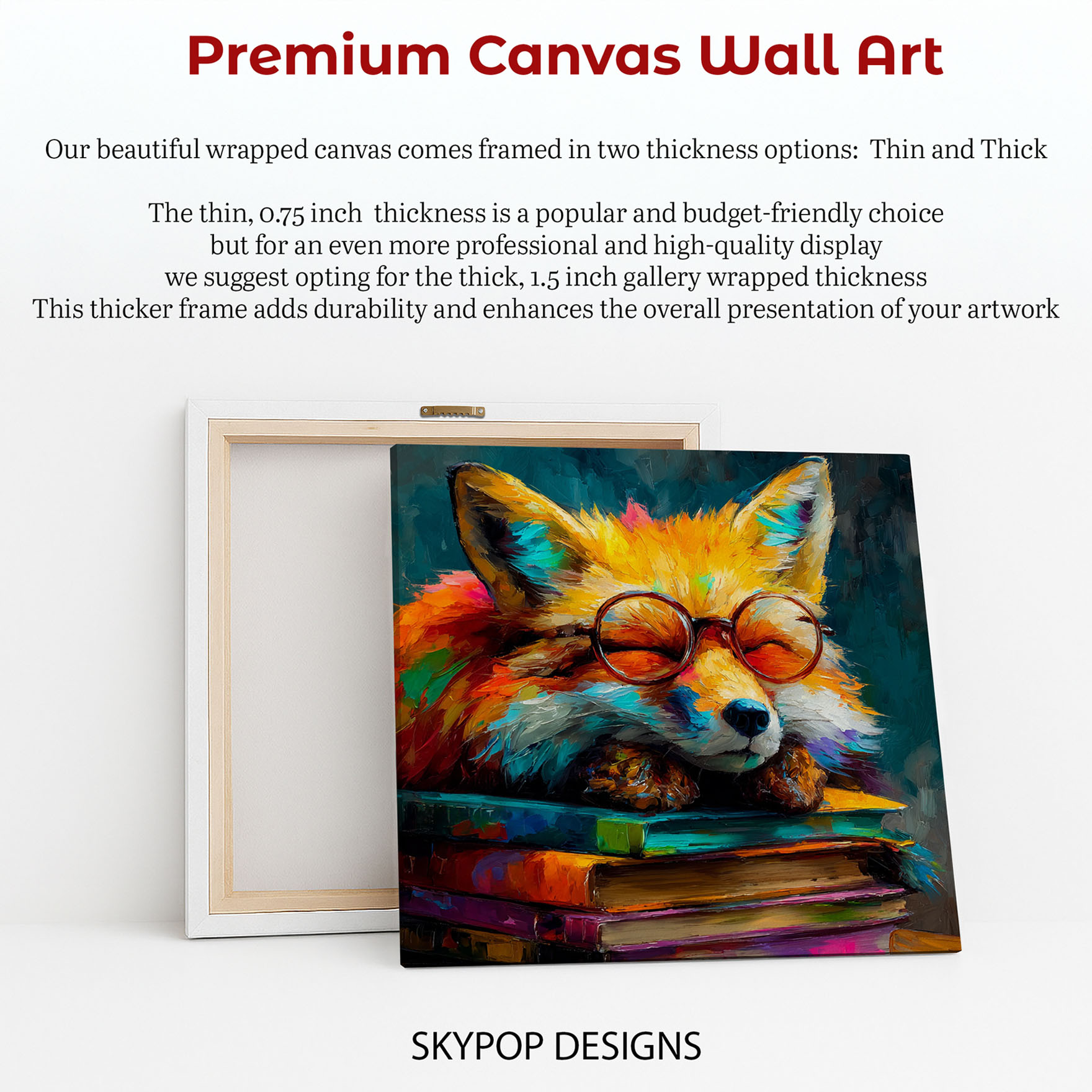 Transform your space with this vibrant fox canvas wall art, a captivating piece that blends contemporary animal art with a whimsical touch. This poster or canvas wall art is perfect for adding personality to modern living room decor or creating a cozy reading nook in your bedroom or office. The striking multicolor palette, dominated by warm oranges and cool teals, creates a visually dynamic piece that sparks imagination. This charming artwork features a hipster fox wearing glasses, resting on a stack of colorful books in a painterly style. It’s ideal for bohemian homes and adds a playful yet sophisticated element to minimalist spaces. The rich textures and bold brushstrokes in this canvas wall art bring the image to life, making it a delightful focal point. This animal art is a fantastic gift for book lovers, fox enthusiasts, or anyone who appreciates unique, expressive wall art. It’s perfect for children’s rooms too, encouraging a love for reading and animals. High-quality printing ensures the vibrant colors and intricate details of this fox poster are preserved, creating a lasting impression. Elevate your home decor with this conversation-starting canvas wall art that radiates creativity and charm. Bring this eye-catching fox artwork into your home to inspire joy and a sense of wonder every day. Make this unique piece the highlight of your art collection.