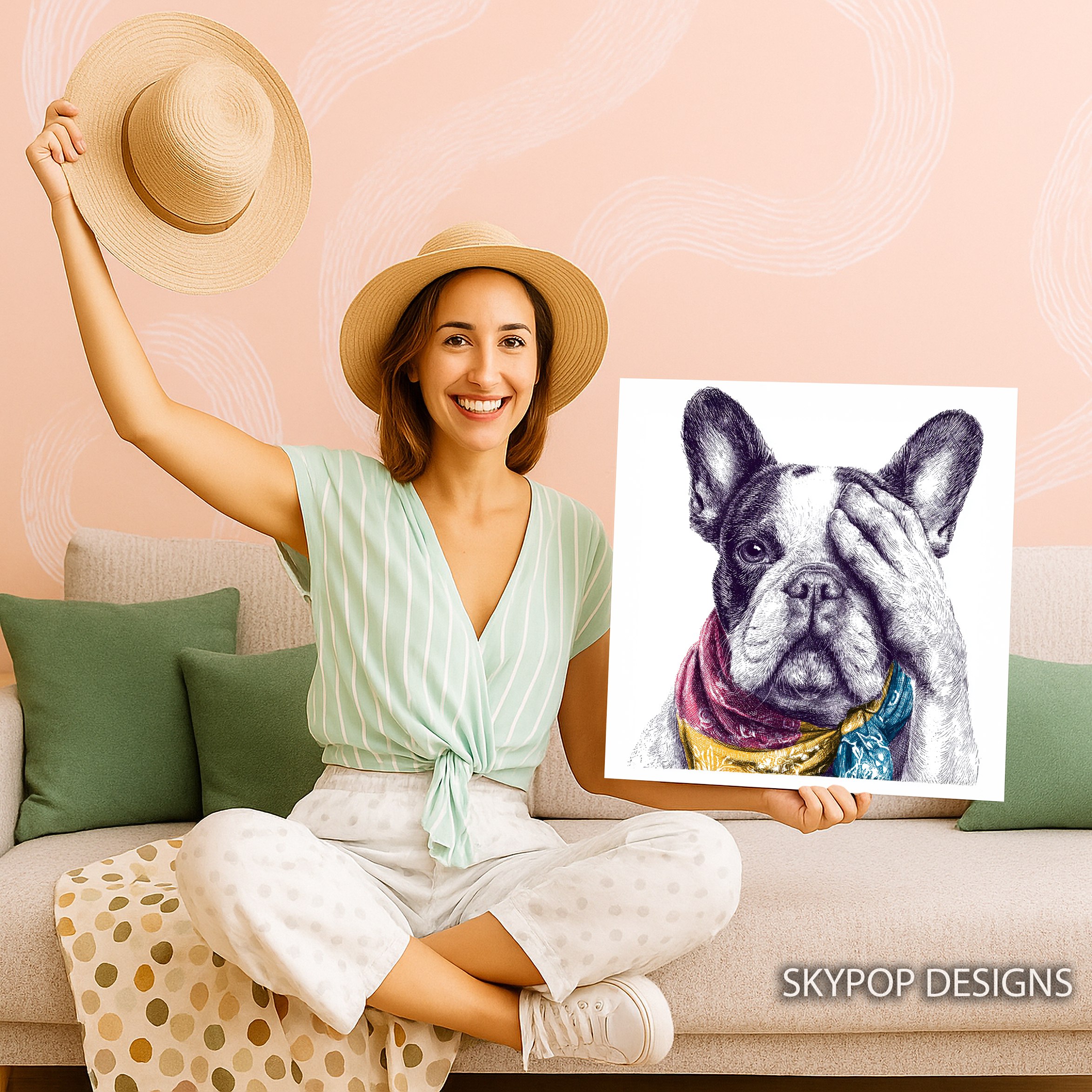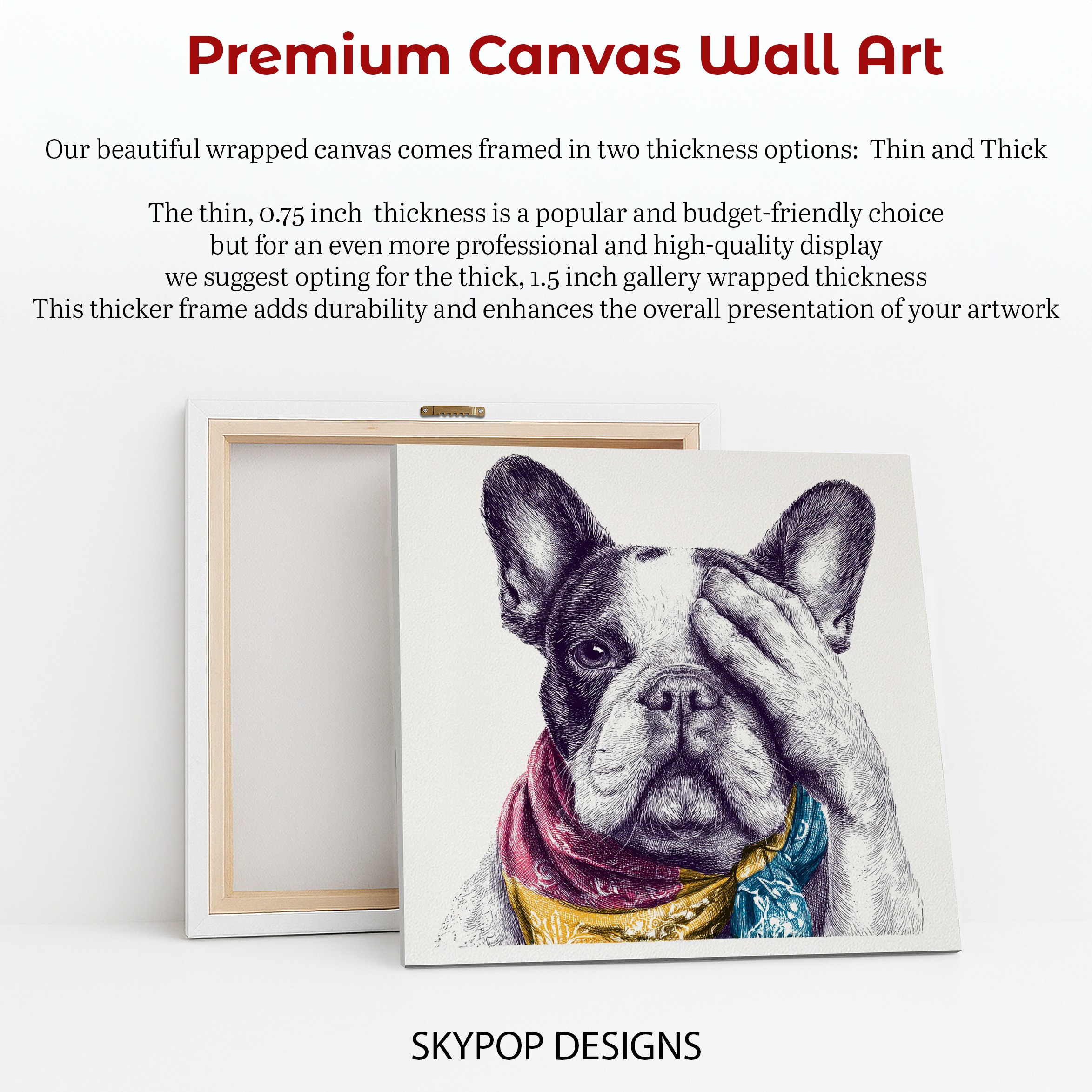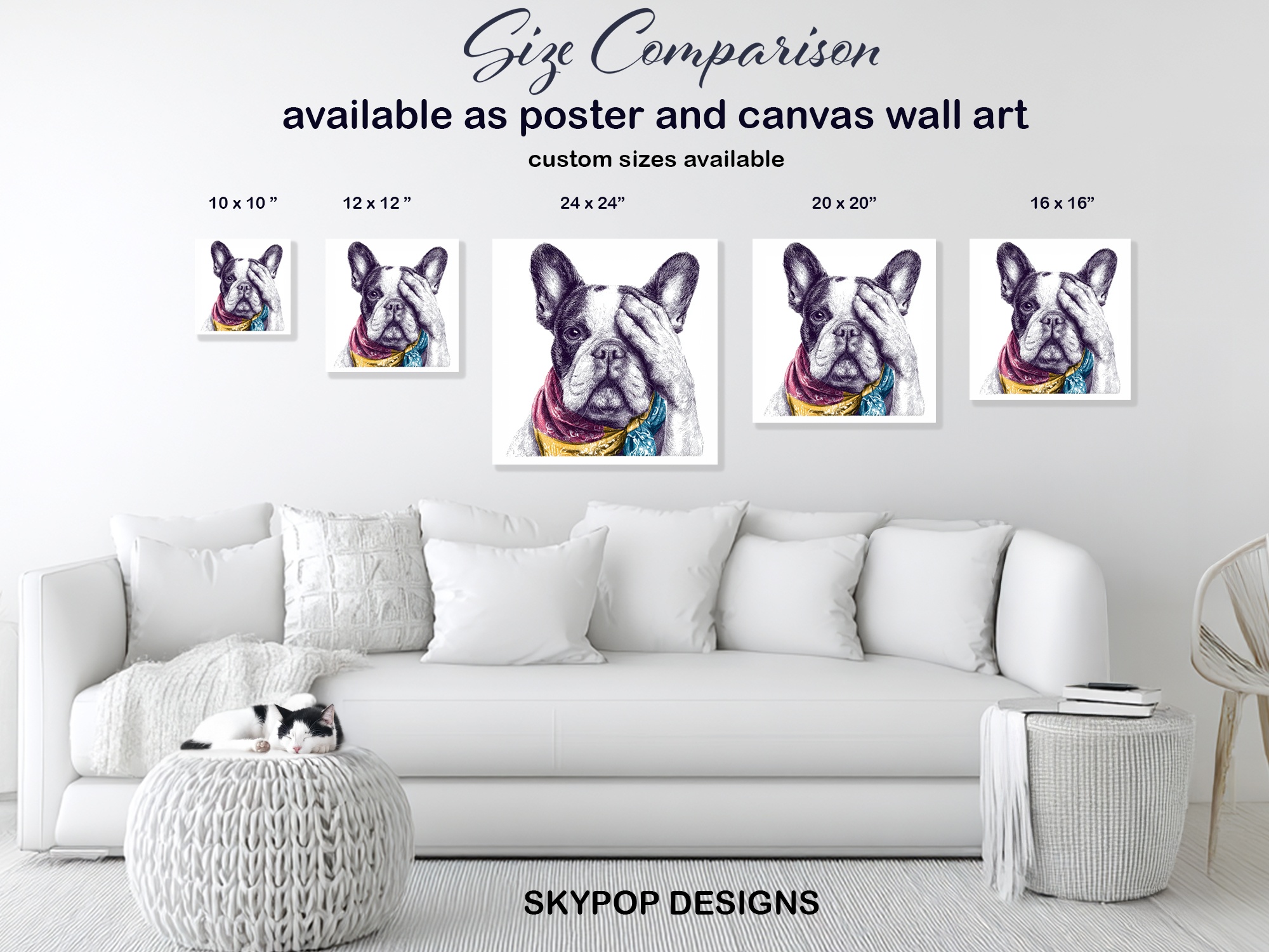 Add a touch of whimsy to your space with this adorable French Bulldog canvas wall art. This charming poster features a detailed pen and ink illustration of a French Bulldog wearing a colorful scarf, perfectly capturing the breed’s distinctive features and playful personality. The striking black and white artwork is beautifully accented by the vibrant pink, yellow, and blue scarf, creating an eye-catching focal point for any room. Ideal for dog lovers and modern decor enthusiasts alike, this canvas print works wonderfully in contemporary living rooms, cozy bedrooms, or stylish home offices. The minimalist style with a pop of color makes it versatile enough to complement various decor themes, from bohemian to scandinavian. This French Bulldog wall art is sure to bring a smile to your face every day, making it a perfect gift for dog owners or anyone who appreciates unique animal art. The high-quality printing ensures every intricate line and texture is captured, bringing this adorable pup to life on your walls. Whether you’re looking to add a touch of personality to a neutral space or create a fun accent in a children’s room, this French Bulldog poster is a delightful choice. Transform your home decor with this playful and stylish piece of dog art that celebrates the charm of our four-legged friends.