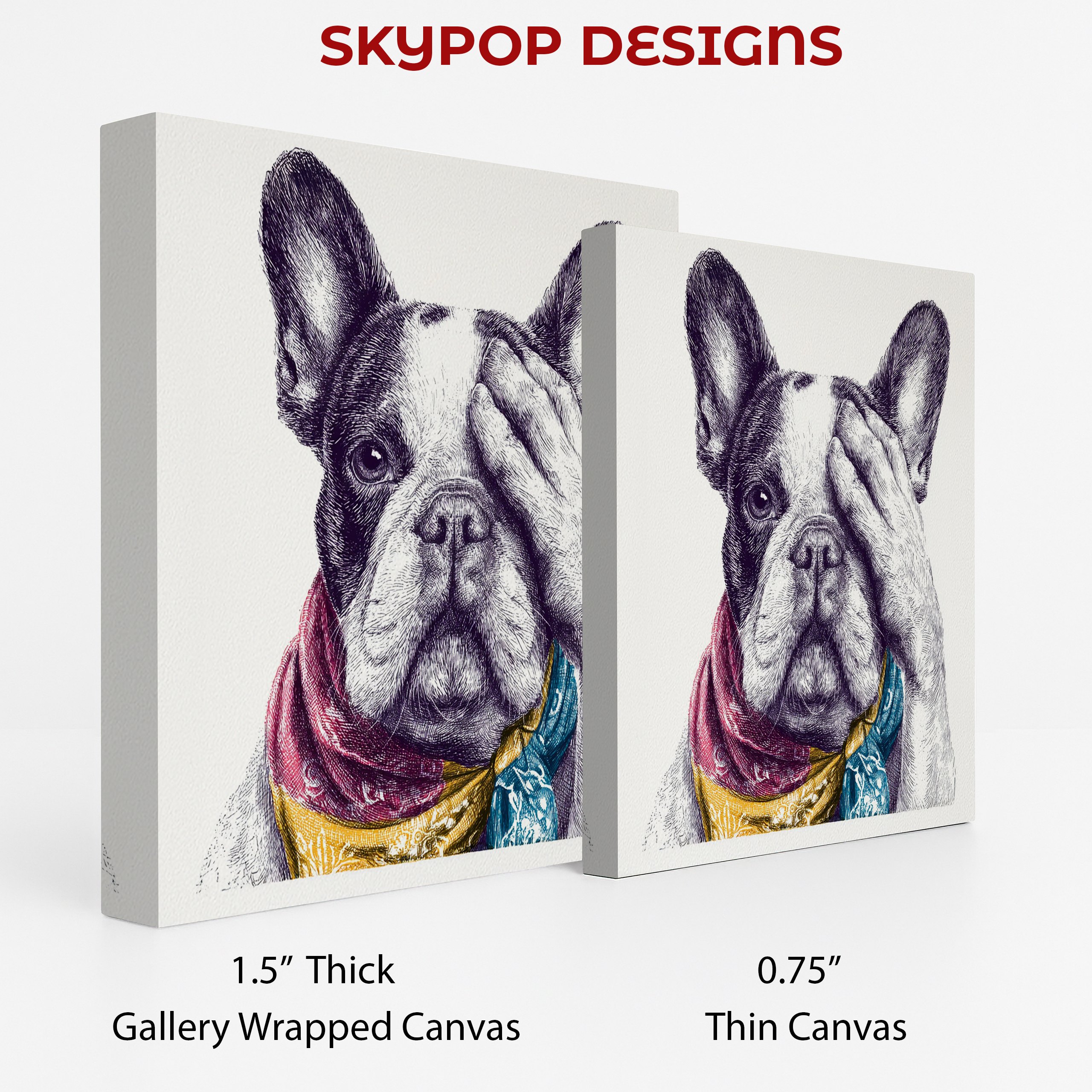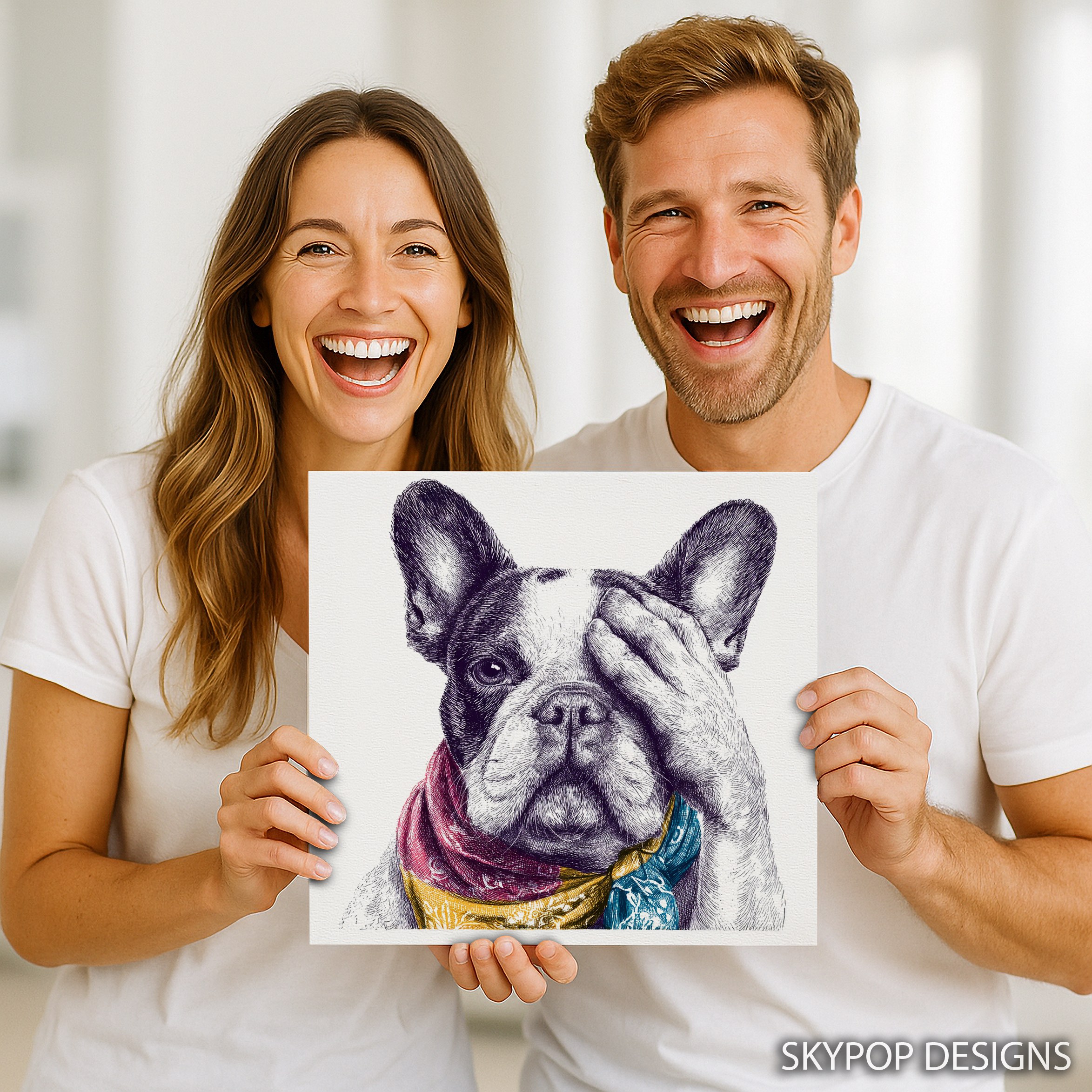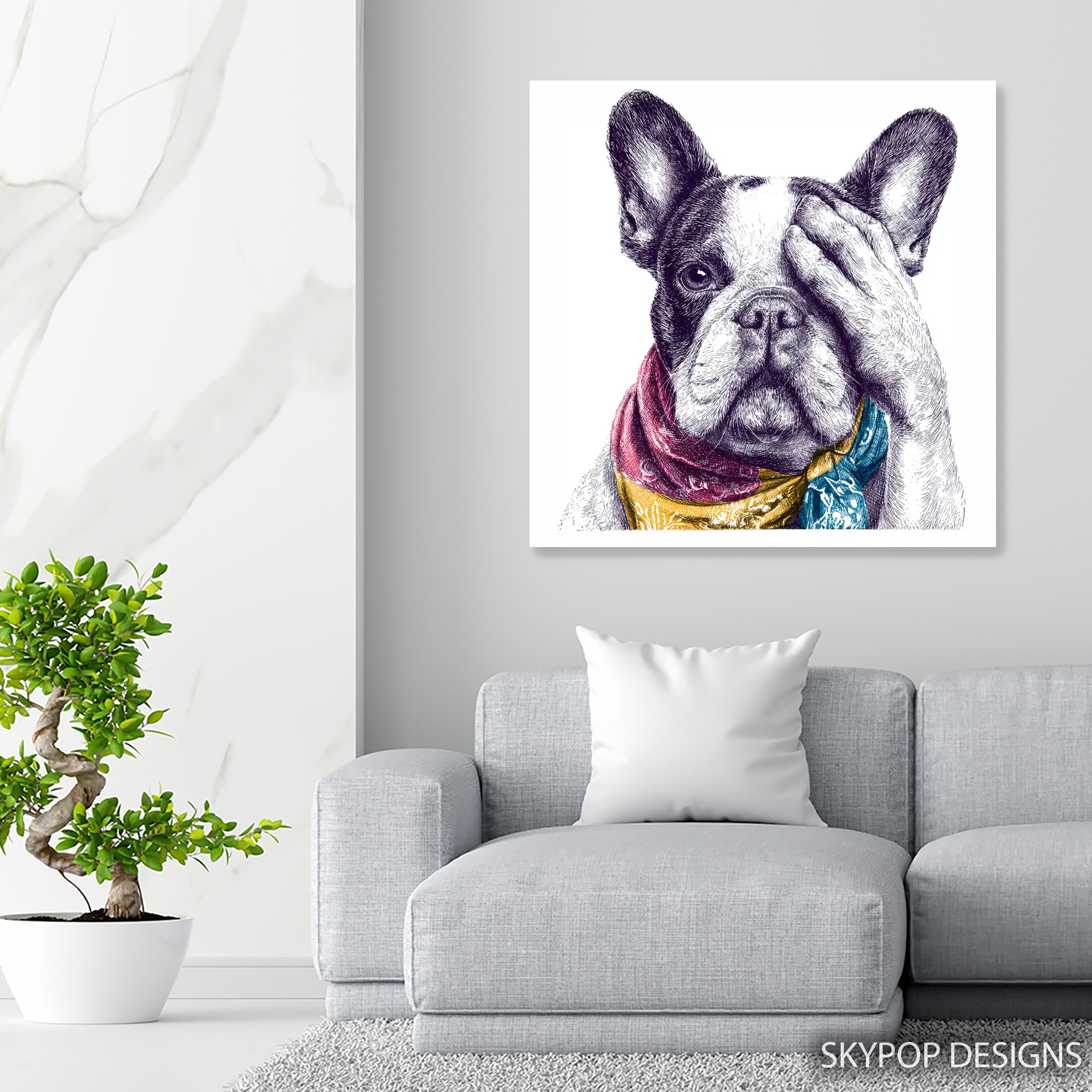 Add a touch of whimsy to your space with this adorable French Bulldog canvas wall art. This charming poster features a detailed pen and ink illustration of a French Bulldog wearing a colorful scarf, perfectly capturing the breed’s distinctive features and playful personality. The striking black and white artwork is beautifully accented by the vibrant pink, yellow, and blue scarf, creating an eye-catching focal point for any room. Ideal for dog lovers and modern decor enthusiasts alike, this canvas print works wonderfully in contemporary living rooms, cozy bedrooms, or stylish home offices. The minimalist style with a pop of color makes it versatile enough to complement various decor themes, from bohemian to scandinavian. This French Bulldog wall art is sure to bring a smile to your face every day, making it a perfect gift for dog owners or anyone who appreciates unique animal art. The high-quality printing ensures every intricate line and texture is captured, bringing this adorable pup to life on your walls. Whether you’re looking to add a touch of personality to a neutral space or create a fun accent in a children’s room, this French Bulldog poster is a delightful choice. Transform your home decor with this playful and stylish piece of dog art that celebrates the charm of our four-legged friends.