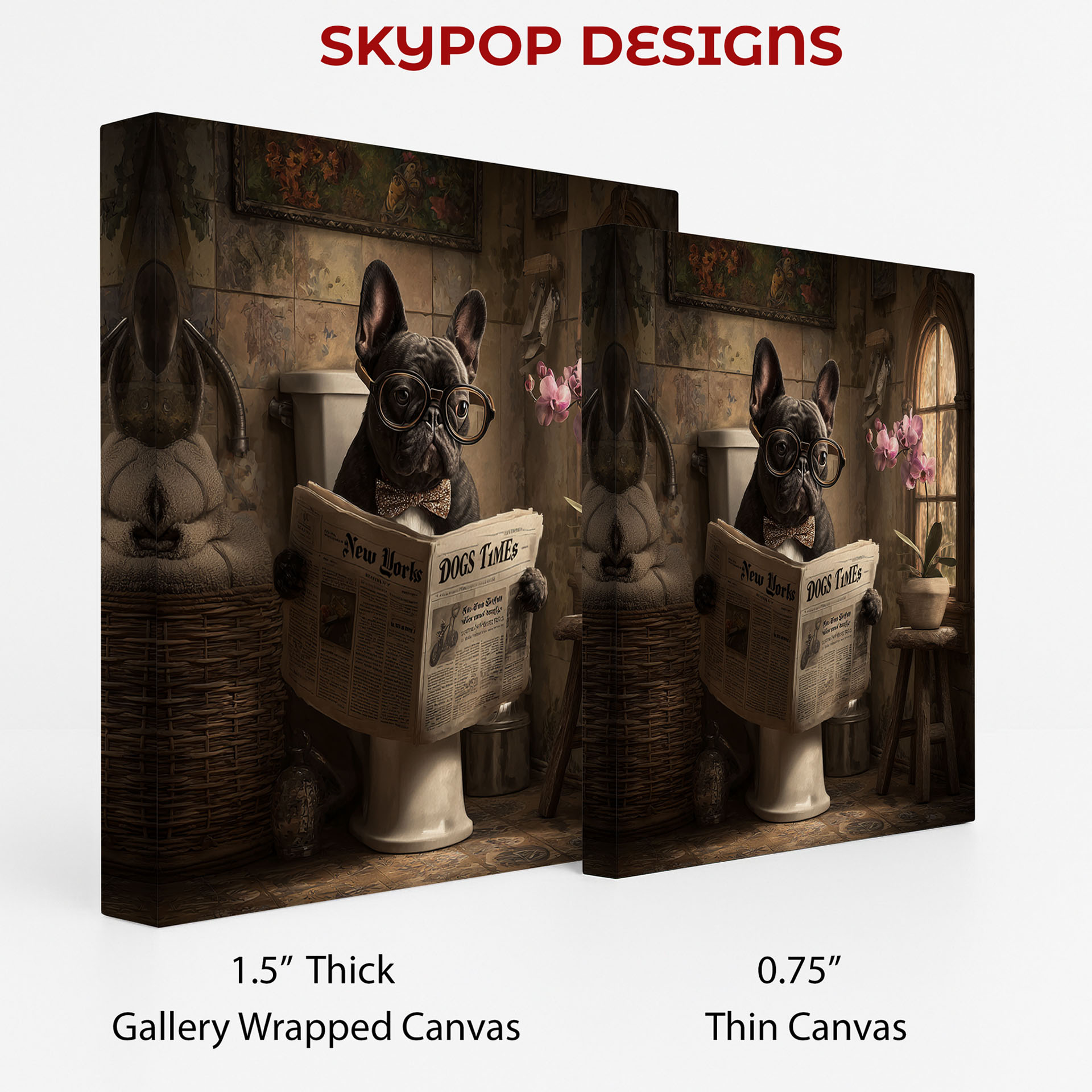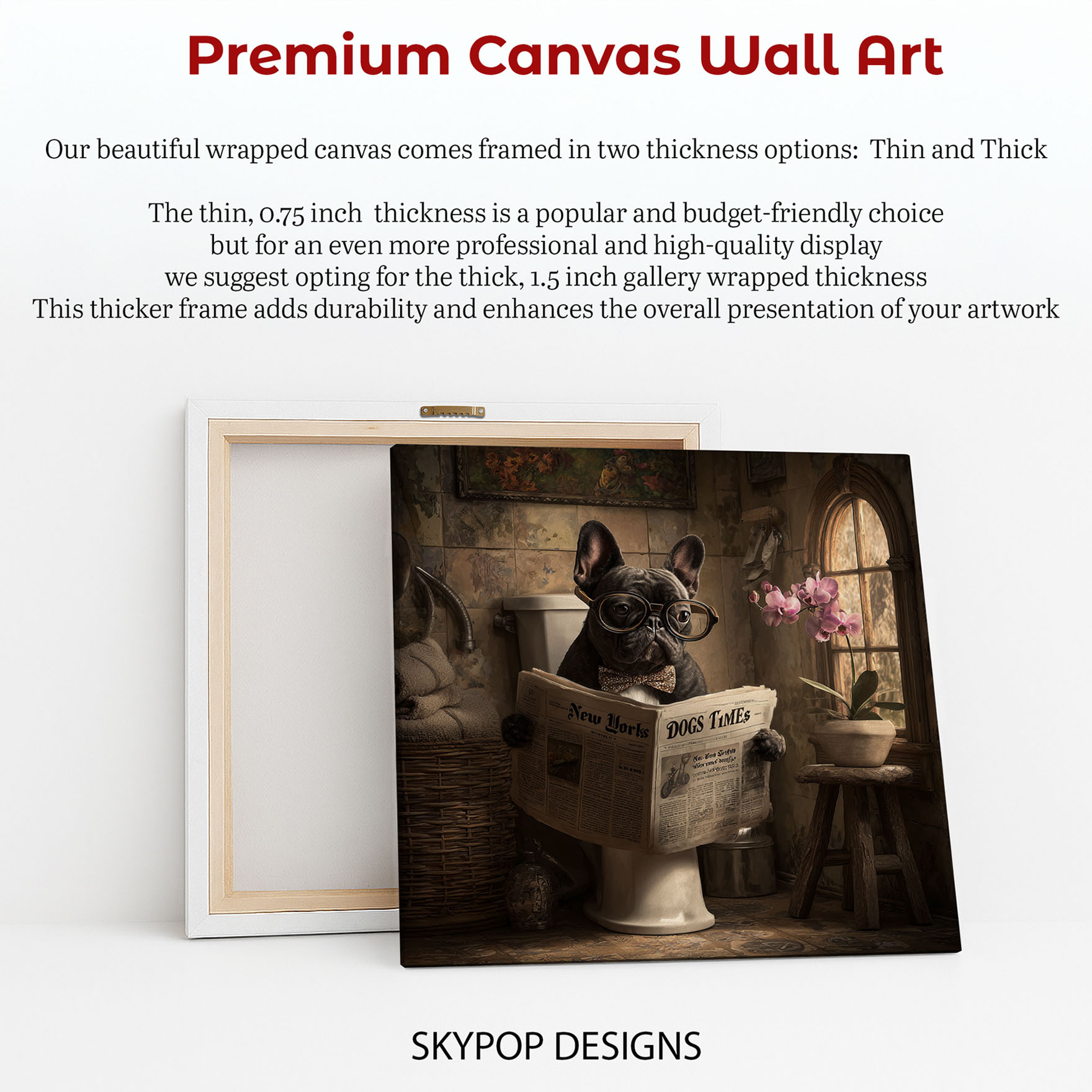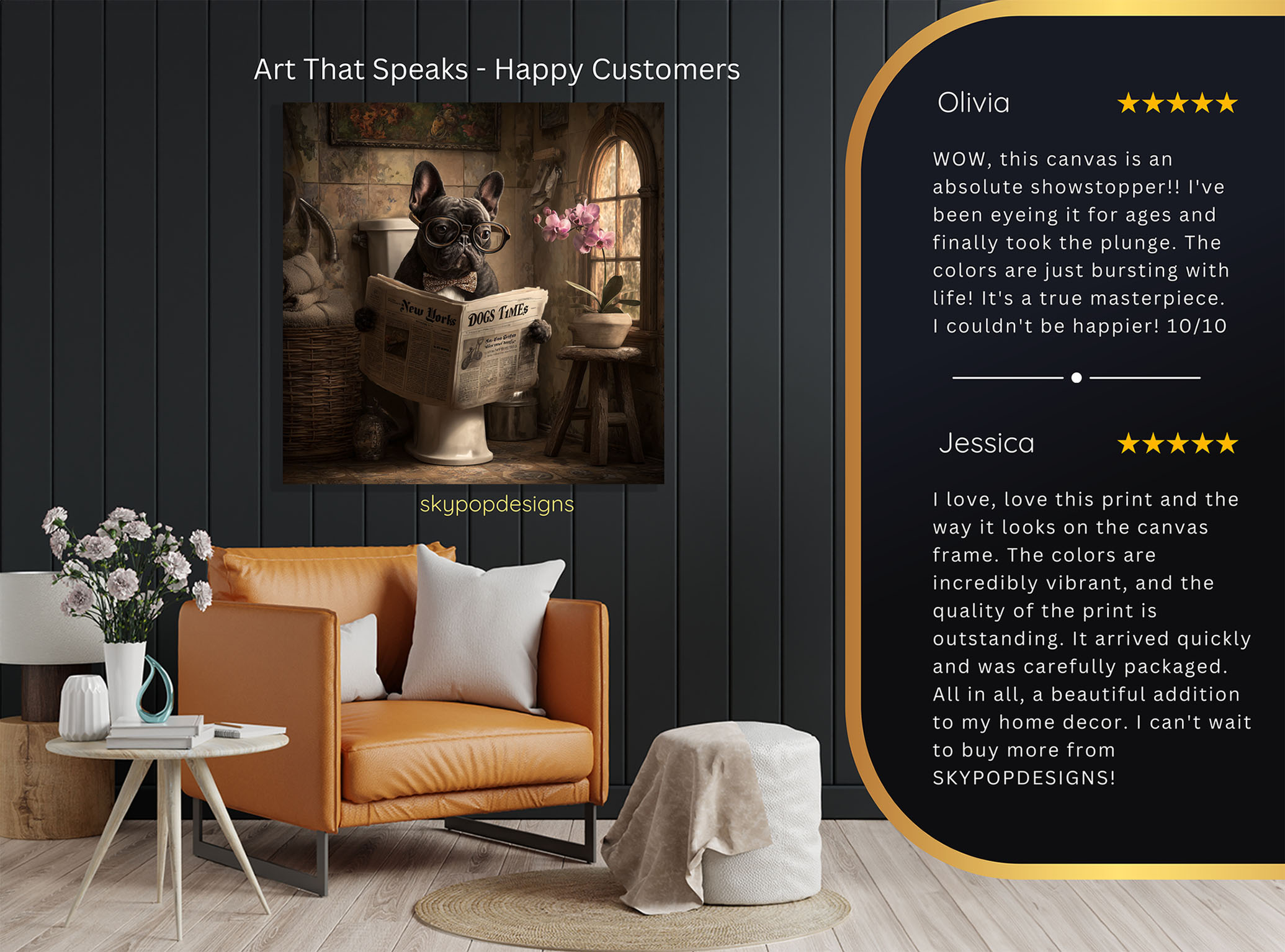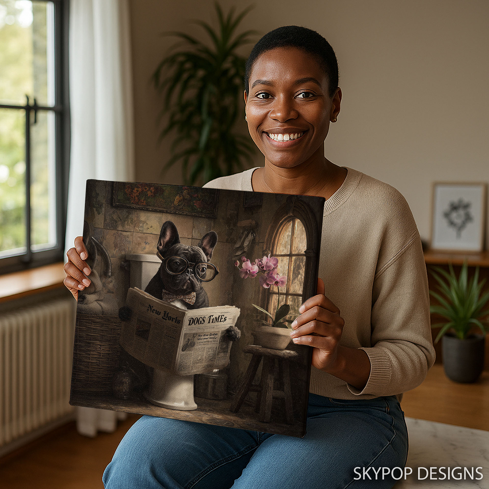 Brighten your space with this charming French Bulldog canvas wall art that humorously depicts a dog reading a newspaper. This delightful poster or canvas wall art is perfect for adding a playful touch to any bathroom decor or creating a unique focal point in a living room. The rich brown and multicolor tones, accented by the soft pink orchids, bring warmth and personality to the artwork. Ideal for bohemian and eclectic interiors, this whimsical animal art brings character to Victorian-inspired spaces. The French Bulldog, with his spectacles and bow tie, embodies sophisticated humor, making this piece a conversation starter. High-quality printing ensures the detailed textures of the newspaper and the dog’s features are vividly captured, creating a captivating visual experience. This versatile canvas wall art fits perfectly in an office or game room, adding a touch of intelligence and whimsy. It makes an excellent gift for dog lovers, housewarmings, or birthdays, offering a unique blend of style and amusement. The warm color palette creates an inviting atmosphere, enhancing any room’s ambiance. Elevate your home with this exceptional French Bulldog artwork that celebrates the quirky side of life and your love for canine companions. This fun poster or framed canvas will undoubtedly inspire smiles and add a dash of dapper charm to your wall art collection. Make your space uniquely yours with this intellectual canine scene today.