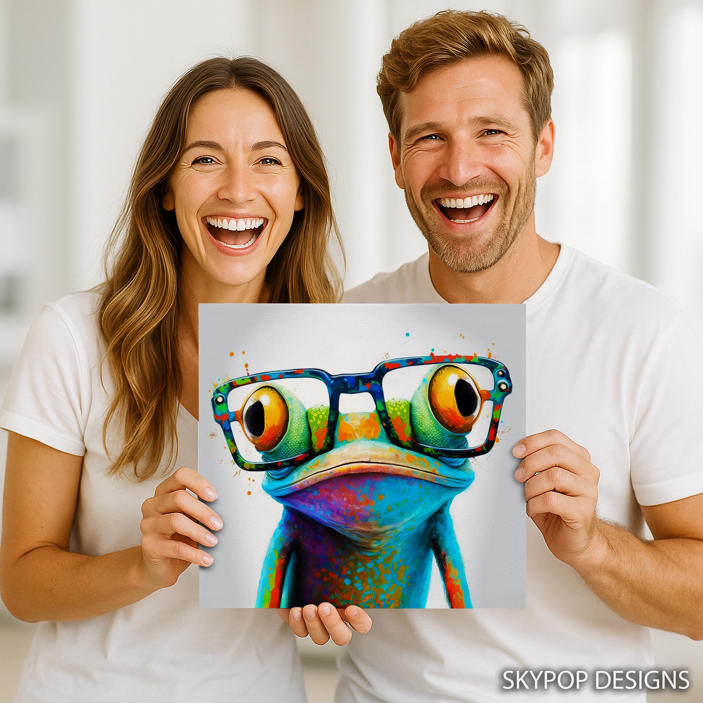 Bring a splash of personality to your space with this vibrant frog canvas wall art, featuring a cool amphibian rocking colorful, oversized glasses. This playful poster or canvas wall art instantly transforms any room with its bold colors and whimsical charm, creating a captivating focal point that sparks joy and conversation. Perfect for modern living rooms or creative office spaces, this unique piece celebrates individuality and brings a touch of fun to your decor. The striking multicolor palette, with prominent teal and orange hues, injects energy and optimism, making it an ideal addition for bohemian and contemporary styles alike. This high-quality canvas wall art captures the frog’s expressive, large eyes, adding a delightful character and quirky appeal to your wall. Whether you’re looking for a statement piece for your home office, a cheerful addition to your child’s room, or a unique gift for a fellow frog lover, this artwork delivers. The dynamic watercolor-like splashes and abstract elements in this poster add a sophisticated, artful touch that complements a variety of interior designs. Showcase your love for quirky art and transform your environment with this lively frog canvas art. Its size versatility makes it a perfect fit for any wall, enhancing your home’s aesthetic with its unique blend of pop art and whimsical animal themes. Elevate your decor and embrace the playful spirit of this eye-catching frog artwork today.