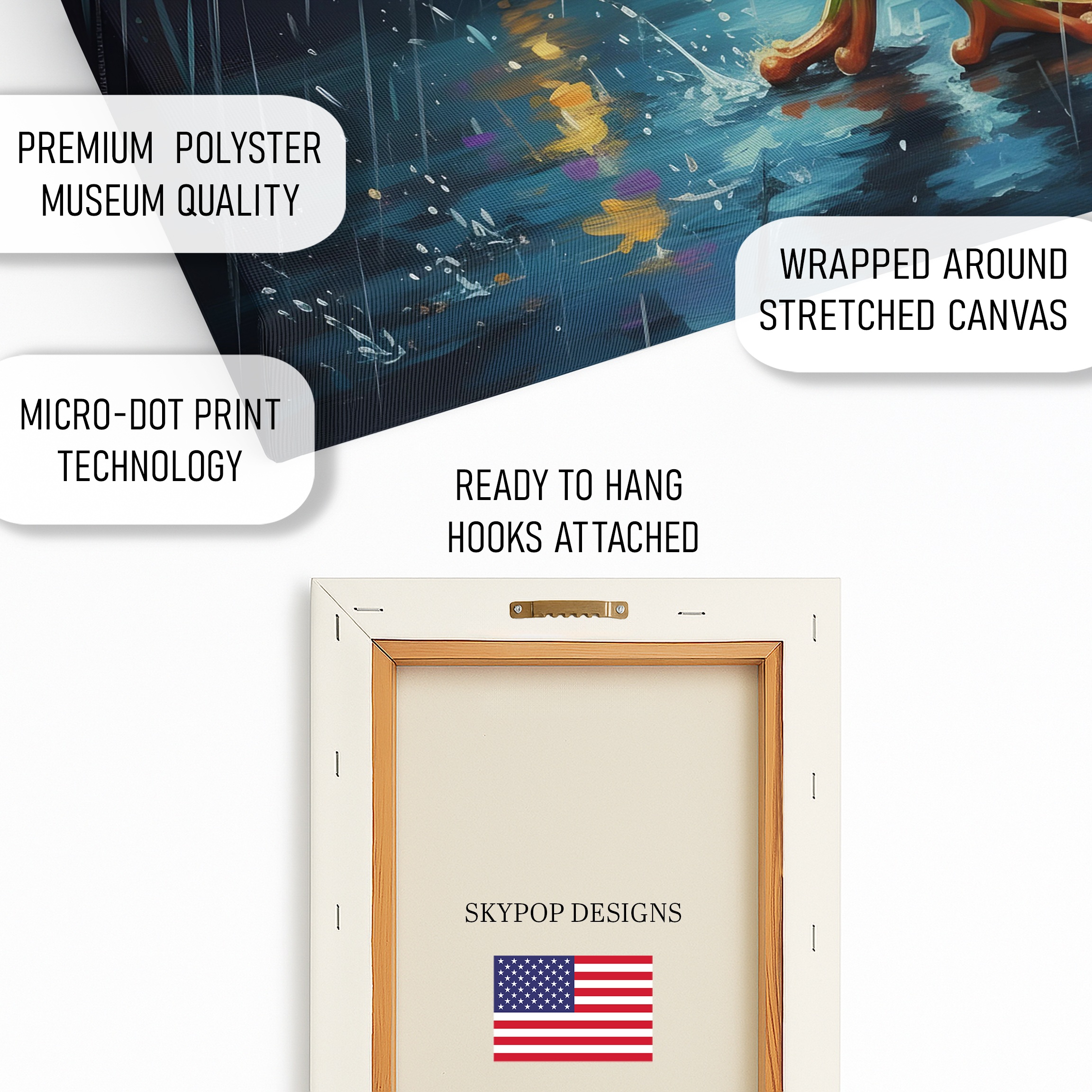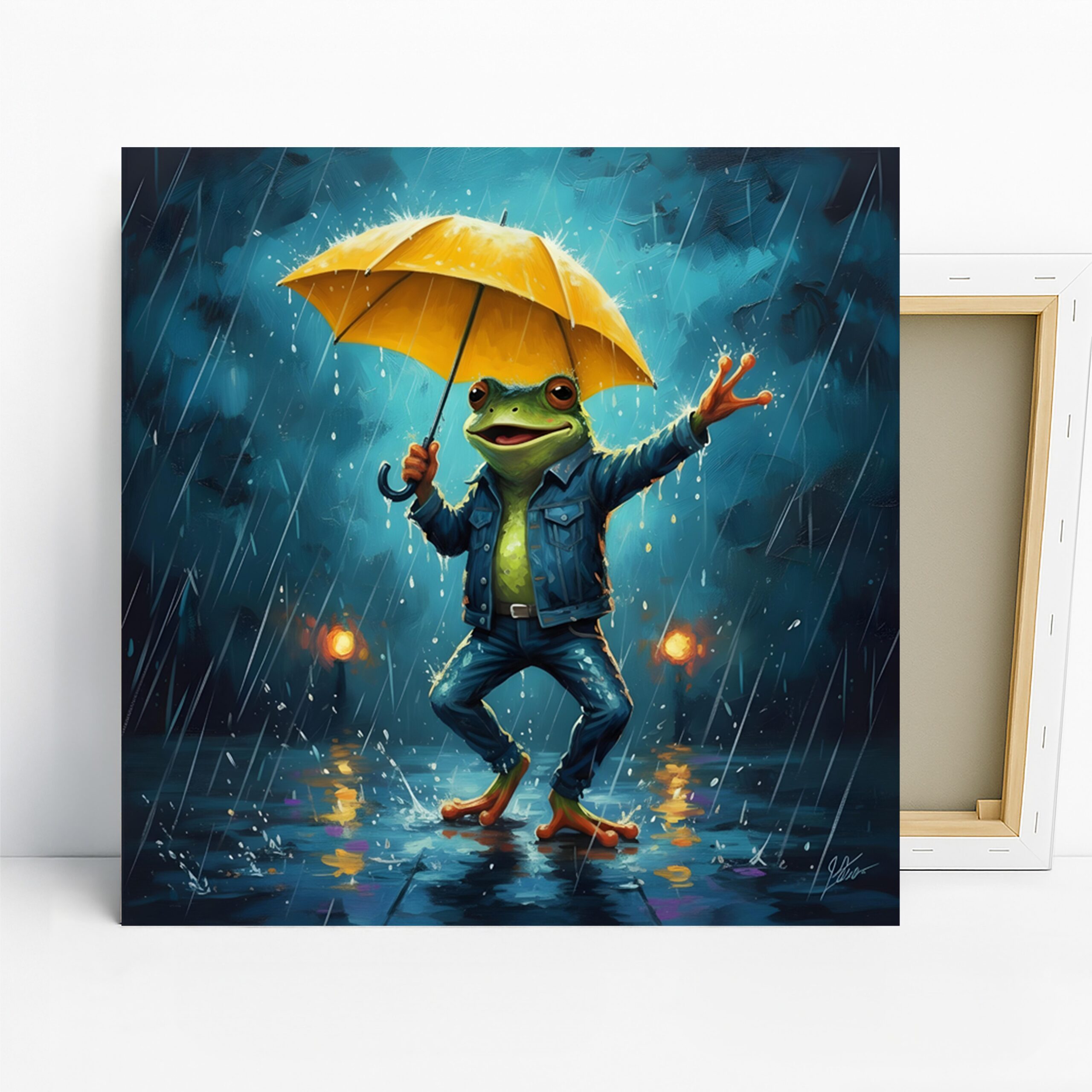 Bring a touch of playful charm to your home with this vibrant frog canvas wall art, capturing a whimsical moment of a frog dancing joyfully in the rain under a bright yellow umbrella. The bold brushstrokes and striking colors create a captivating focal point that instantly elevates any living room or bedroom decor. This unique poster or canvas wall art is perfect for adding personality to eclectic spaces or bringing a splash of color to modern interiors. The interplay of the cheerful yellow against the cool blues of the rainy backdrop evokes a sense of carefree happiness and optimism. Ideal for bringing a smile to your face every day, this artwork is a conversation starter, making it a fantastic addition to a game room or entryway. The energetic composition inspires a feeling of lightheartedness and celebrates the simple pleasures of life. Measuring to fit your space, this high-quality print is a durable and stunning piece of wall art. It serves as an ideal gift for birthdays, housewarmings, or any occasion where a unique and cheerful present is desired. Transform your wall into a vibrant display with this delightful frog artwork. Celebrate fun and individuality with this eye-catching canvas. Add this whimsical poster to your collection and let the joy of the dancing frog brighten your home decor.