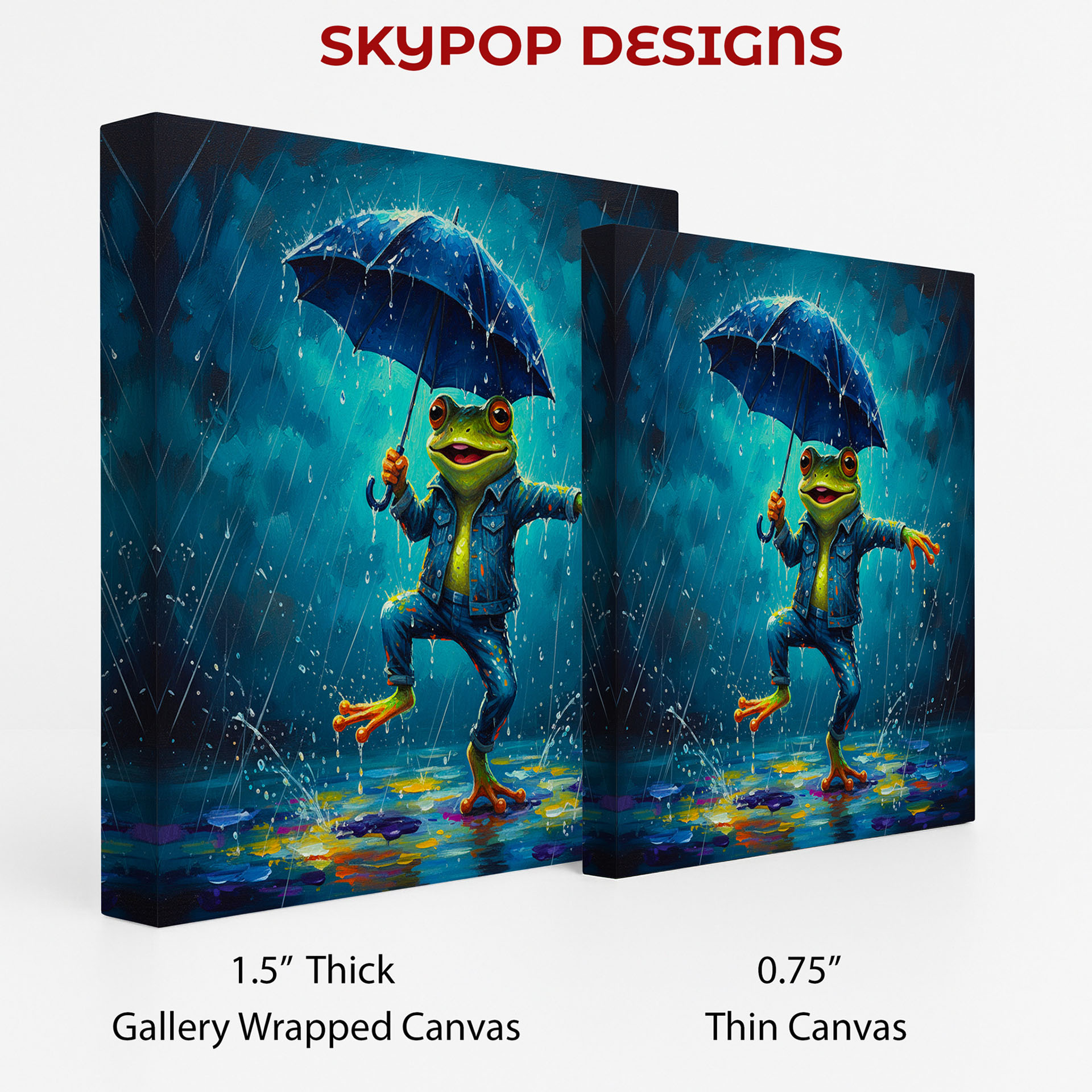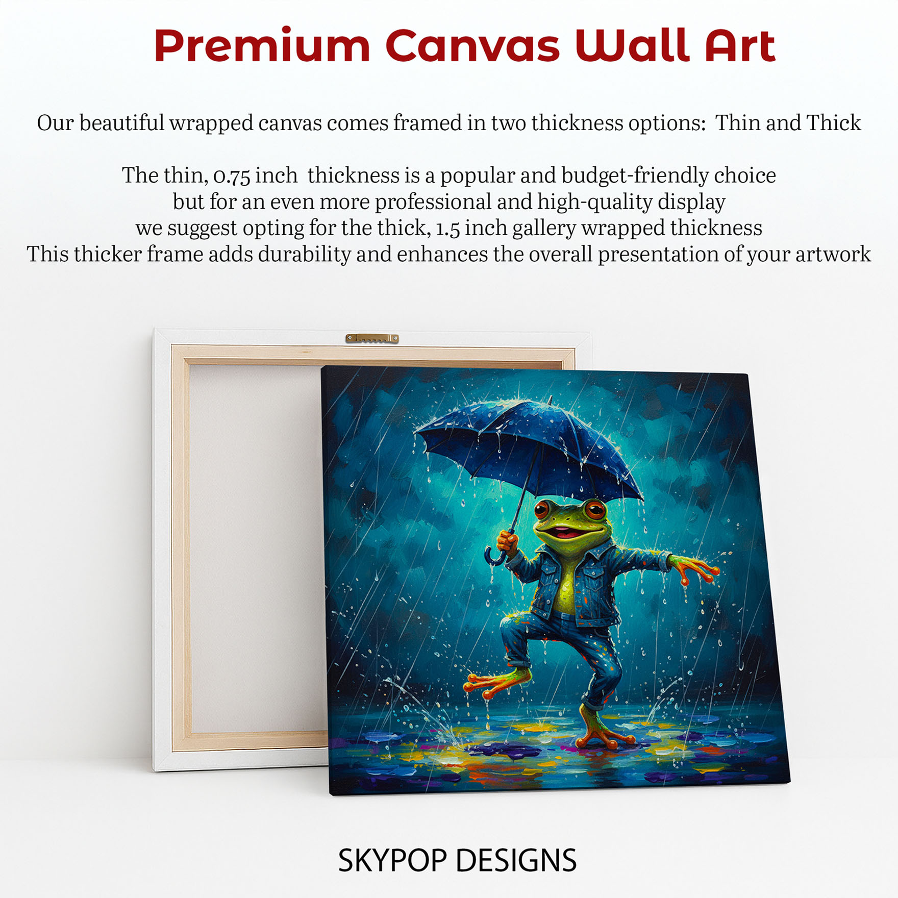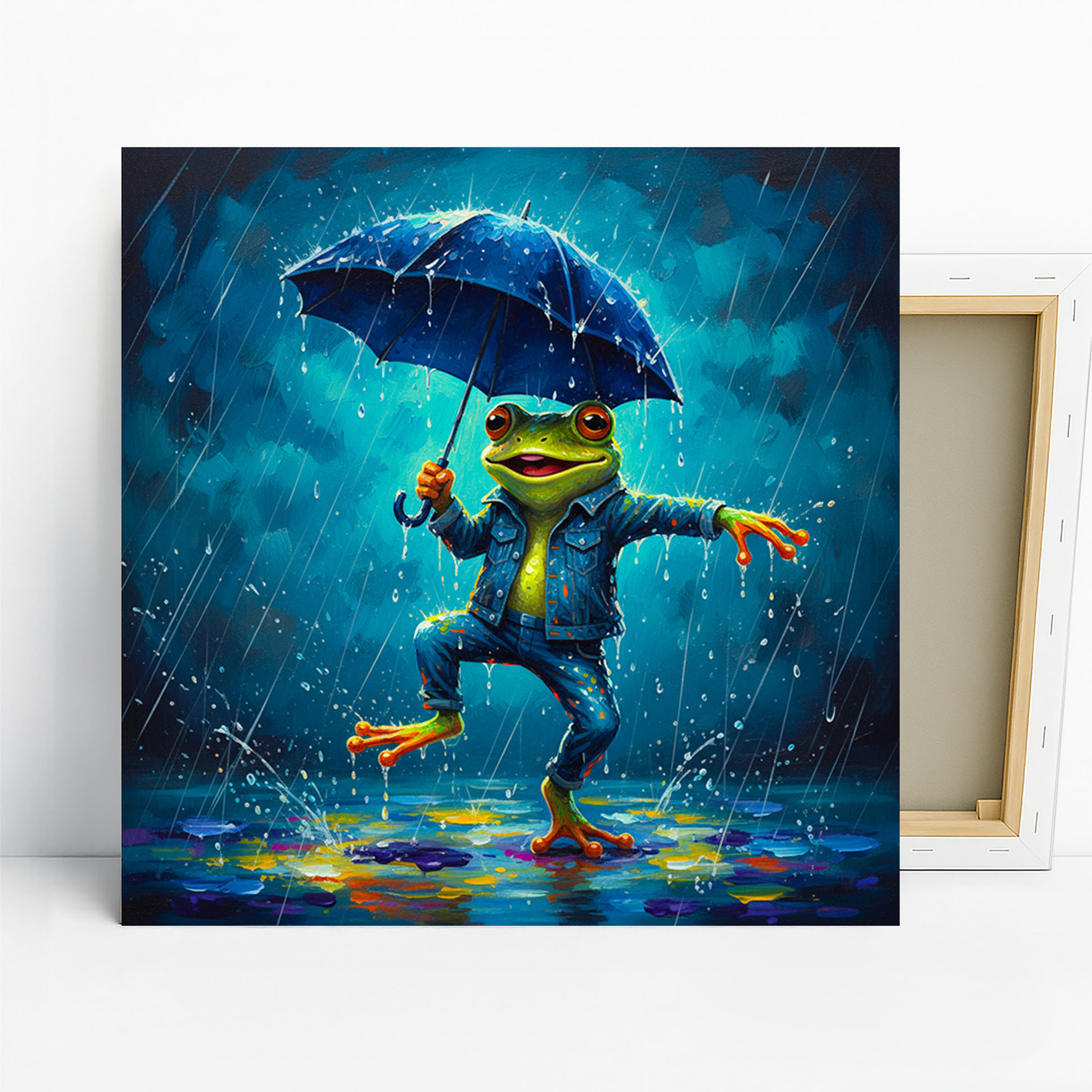 Bring joy and whimsy to your home with this captivating frog canvas wall art, featuring a charming frog dancing in the rain.