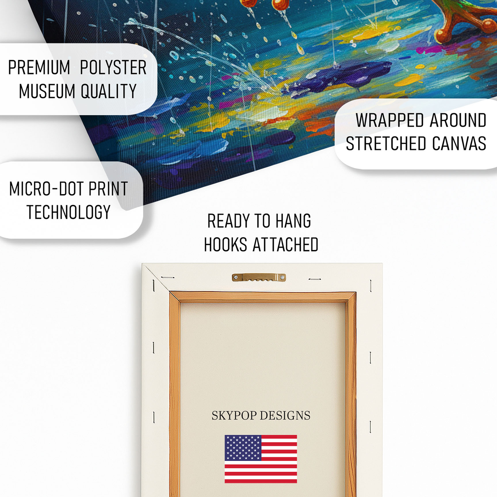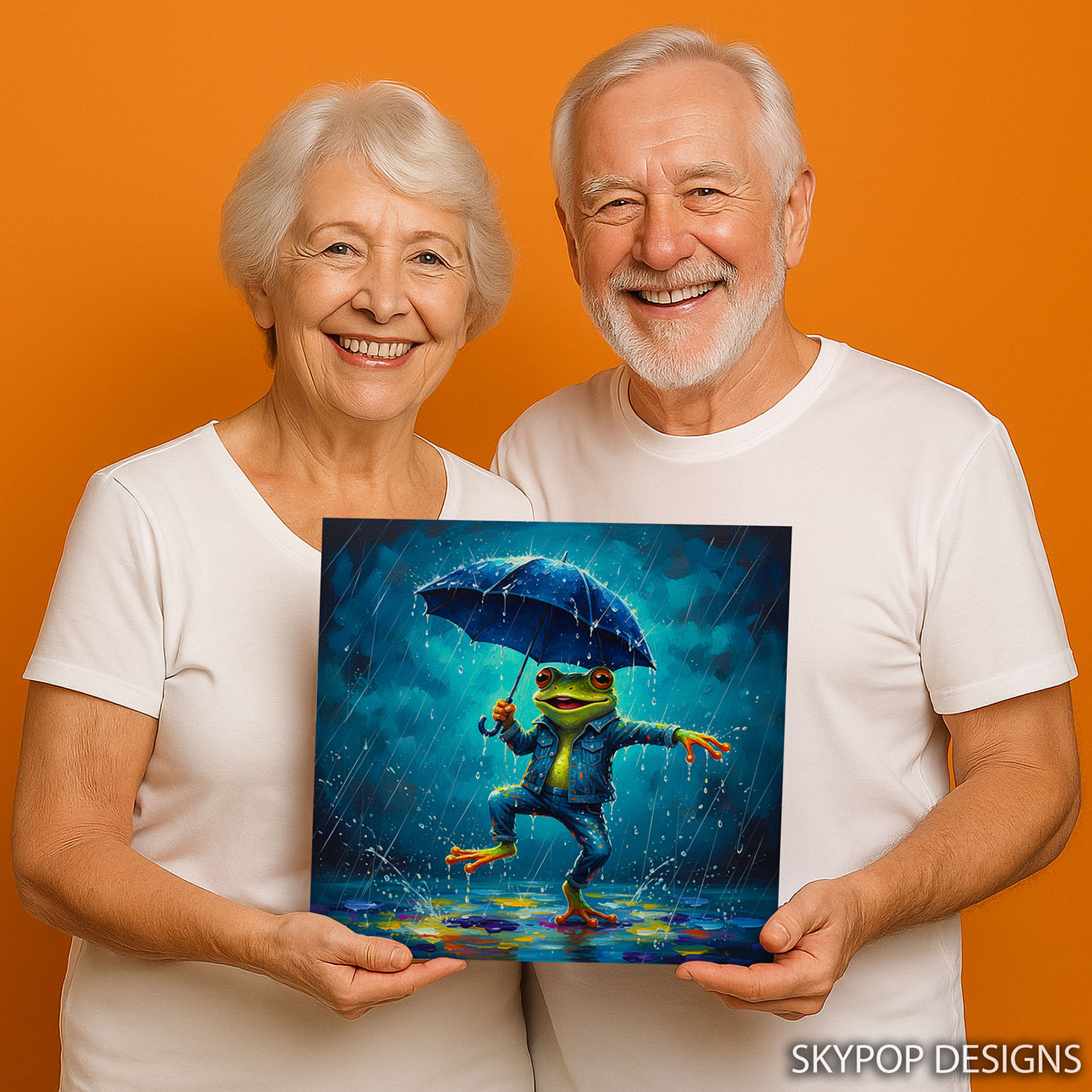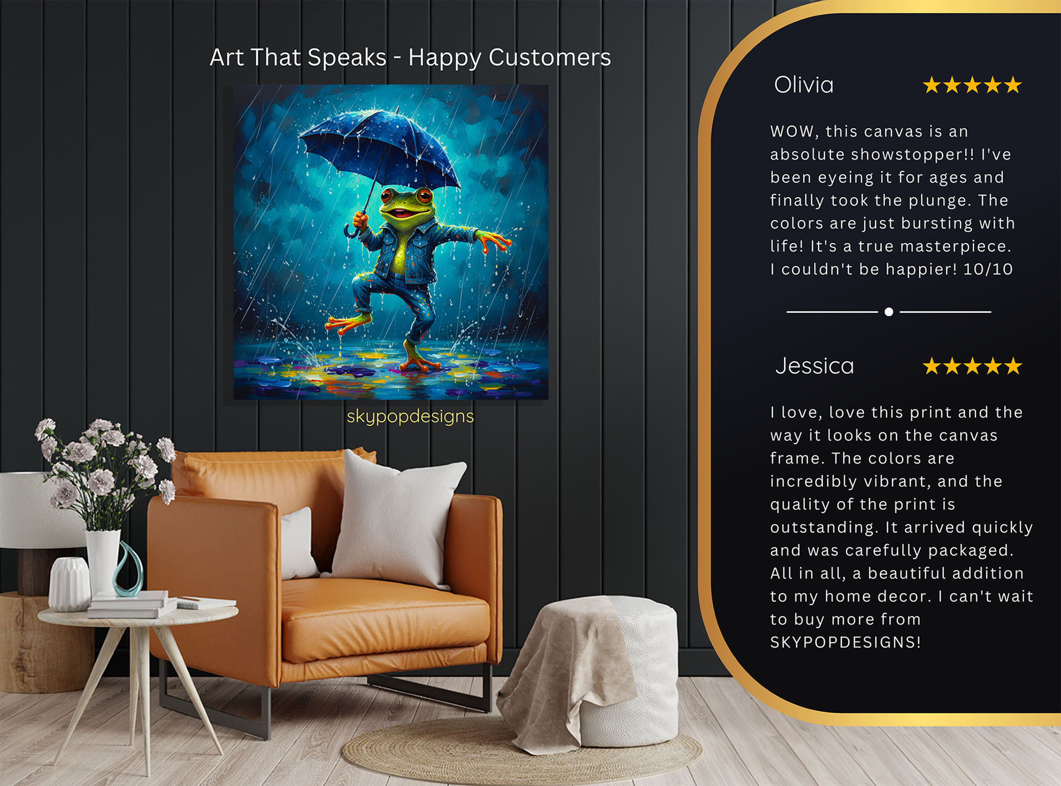 Bring joy and whimsy to your home with this captivating frog canvas wall art, featuring a charming frog dancing in the rain.