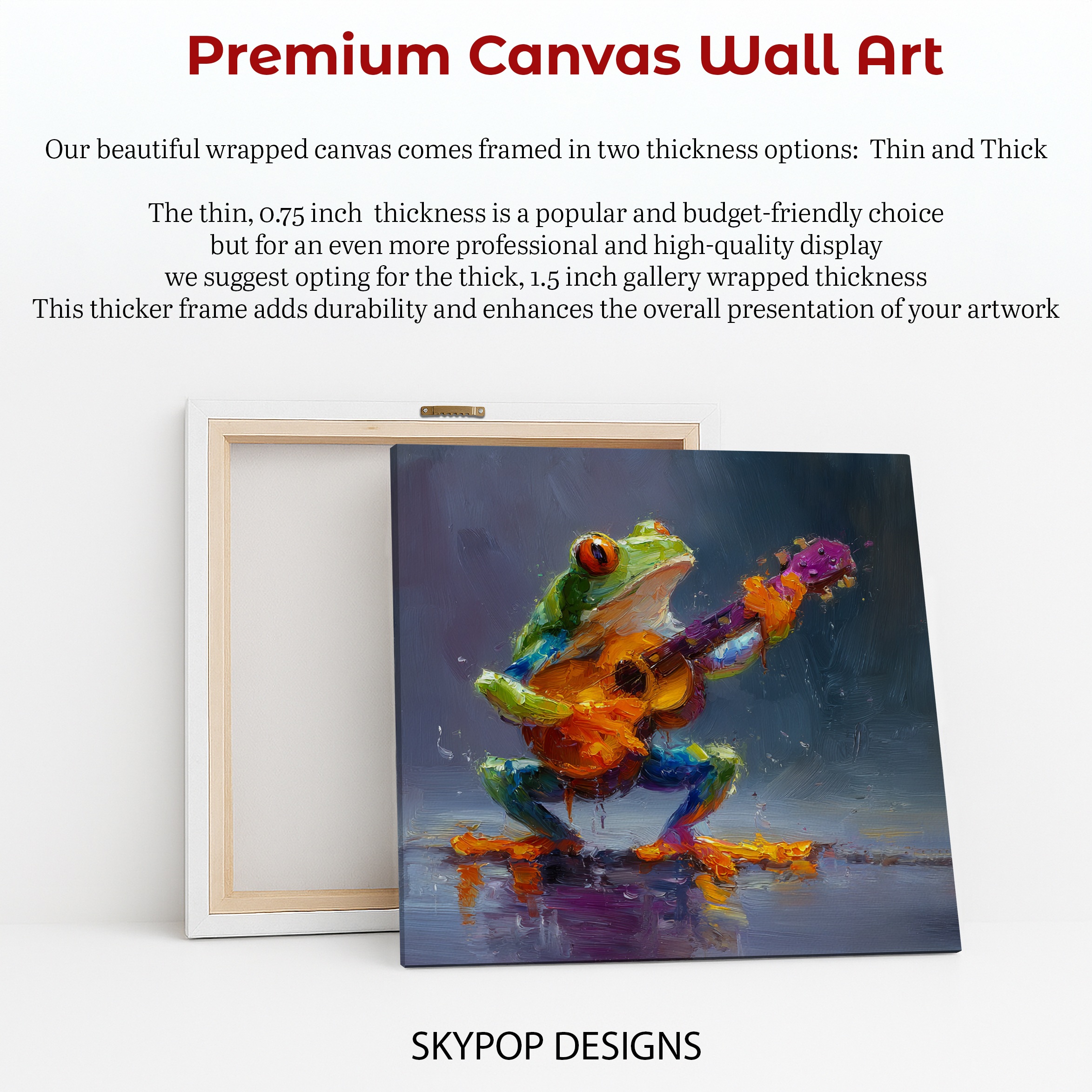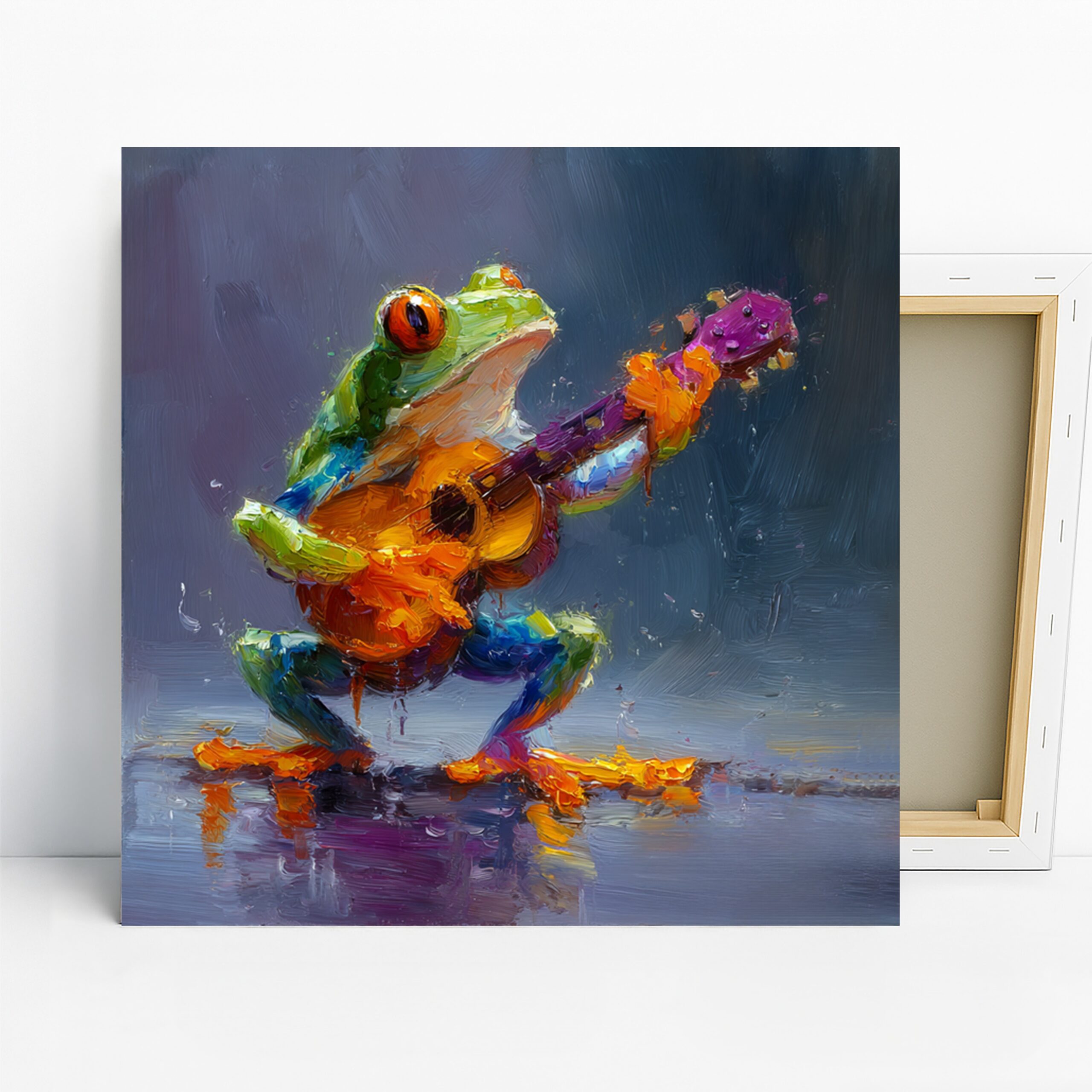 Bring a splash of whimsy to your walls with this vibrant frog guitar canvas art! This eye-catching piece features a colorful amphibian musician strumming away on a bright orange guitar. Perfect for music lovers and animal enthusiasts alike, this playful poster transforms any space into a lively, fun-filled environment. The bold, expressive brushstrokes create a dynamic scene that pops against any wall color, making it an ideal focal point for modern living rooms or eclectic bedrooms. This unique wall art combines the charm of animal-themed decor with the cool vibe of music-inspired design, perfect for adding personality to home studios or children’s playrooms. The vivid color palette of greens, oranges, and purples injects energy and creativity into your space, while the contemporary style keeps it fresh and on-trend. Whether you’re looking to liven up a dorm room, add character to a game room, or create a talking point in your home office, this frog guitarist poster delivers. The high-quality canvas ensures every detail of this whimsical scene is captured, from the frog’s expressive eyes to the guitar’s shiny finish. Give your walls the wow factor with this unique blend of nature and music-themed wall art. It’s not just decor – it’s a conversation starter that brings smiles and brightens any room. Add this charming, quirky frog art to your collection and let the good vibes roll!