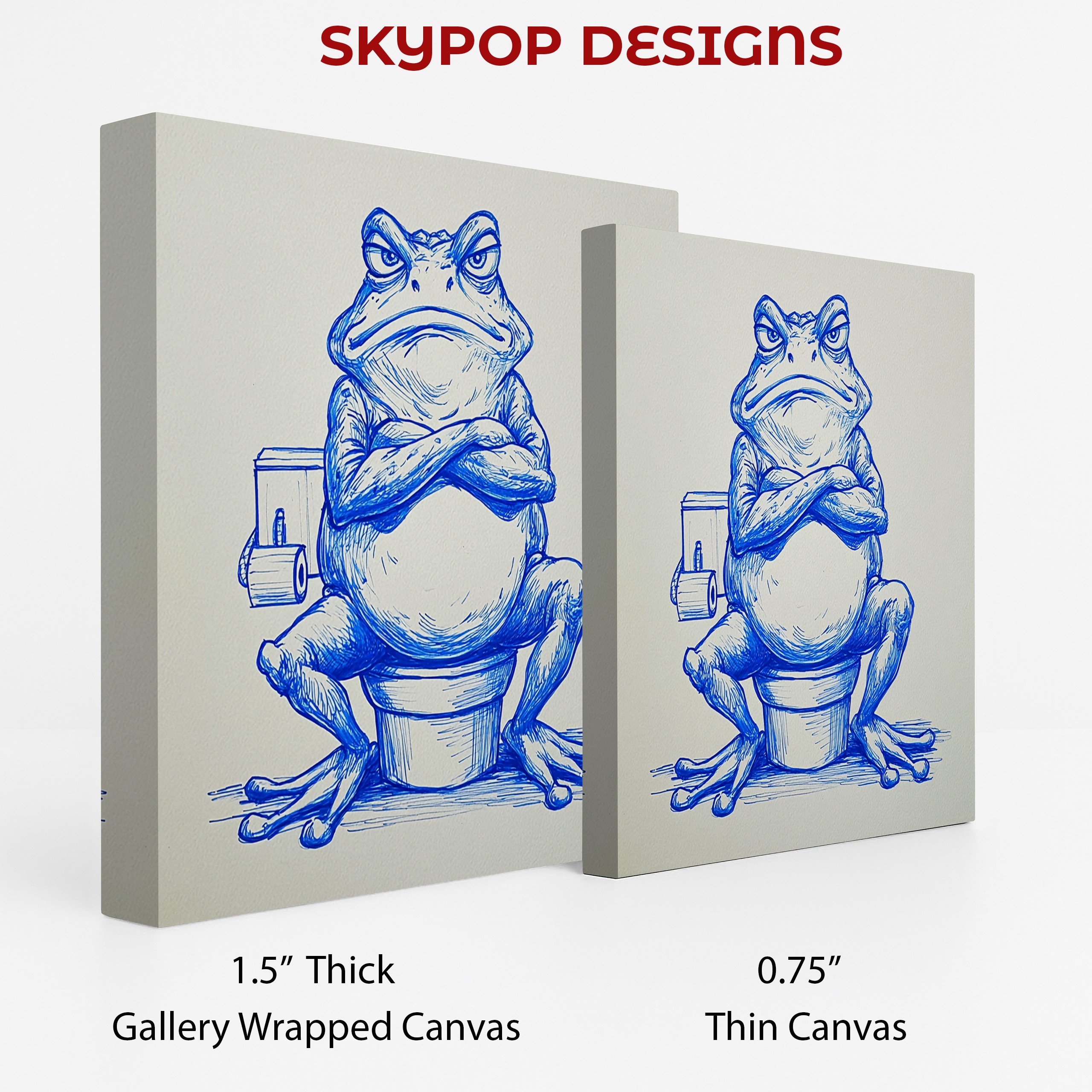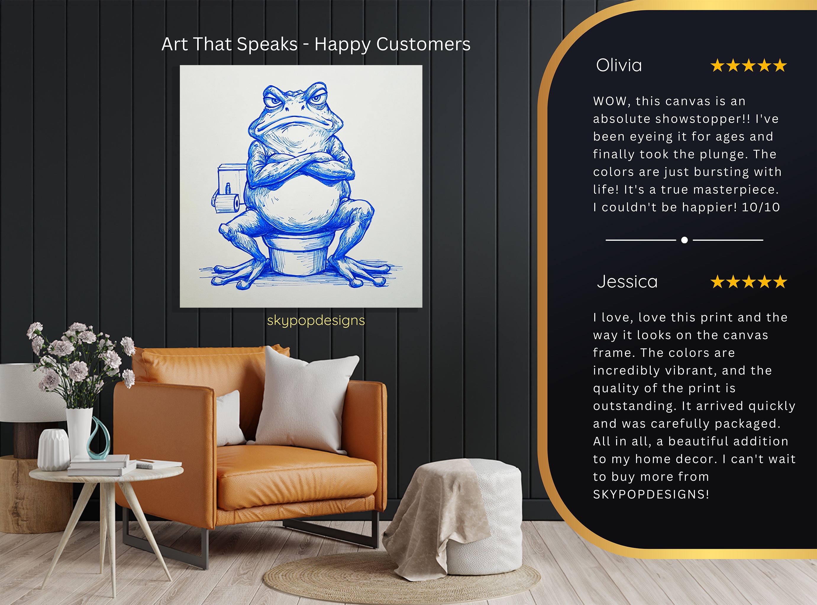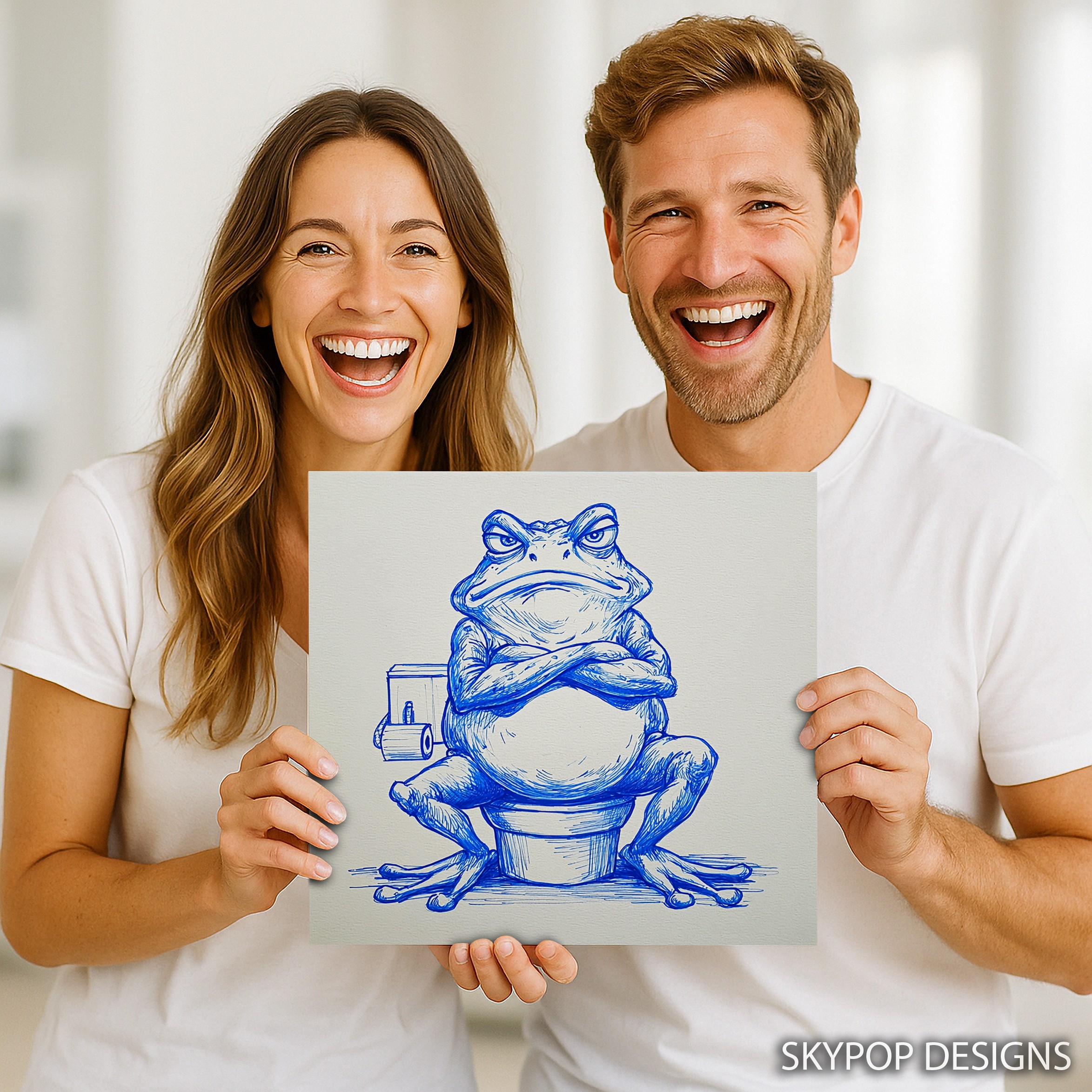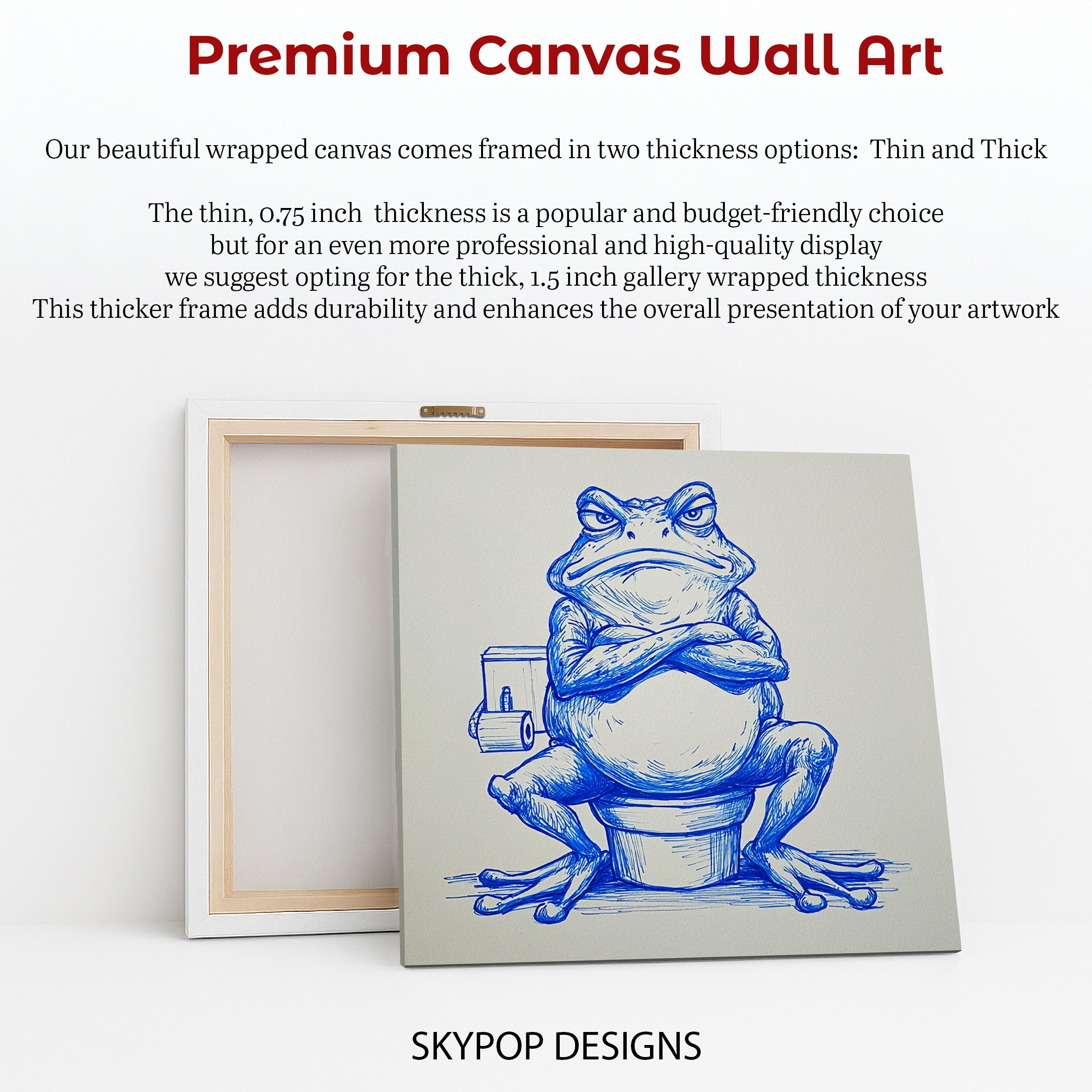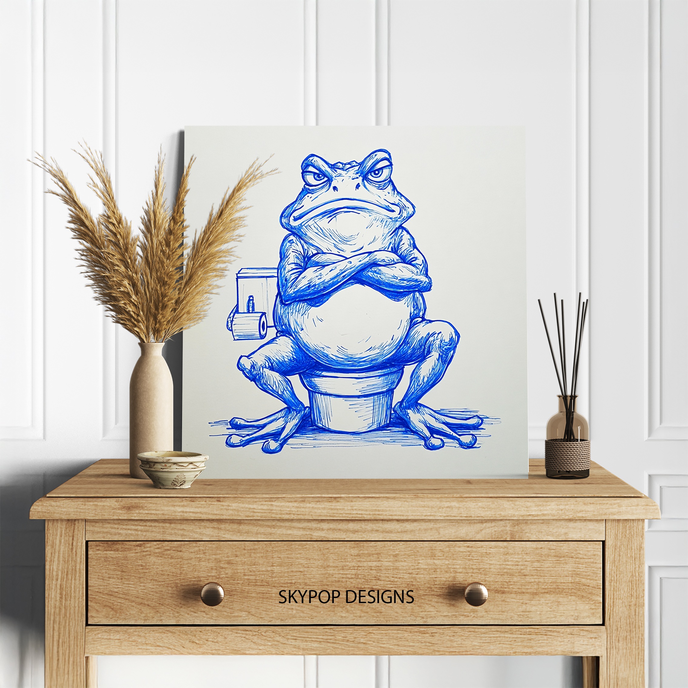 Add a touch of humor to your space with this quirky frog toilet canvas wall art. This eye-catching piece features a grumpy-looking frog perched on a toilet, complete with a roll of toilet paper. The bold blue line drawing on a white background creates a striking contrast that instantly draws attention. Perfect for adding personality to modern bathrooms or injecting fun into minimalist office spaces. The whimsical design combines contemporary art style with a rustic, hand-drawn feel, making it versatile for various decor themes. Ideal as a conversation starter in living rooms or a playful addition to game rooms. The large-eyed frog’s annoyed expression adds humor to everyday spaces, helping to lighten the mood. This canvas art or poster print is a unique gift for frog lovers or anyone with a sense of humor. The simple color scheme allows it to blend seamlessly with existing decor while making a statement. High-quality printing ensures every detail of the expressive frog and toilet is captured. Whether you’re looking to add character to a guest bathroom or liven up a dull corner, this frog toilet art is sure to bring smiles. Transform your space with this blend of whimsy and modern design – a perfect example of how art can be both fun and stylish.
