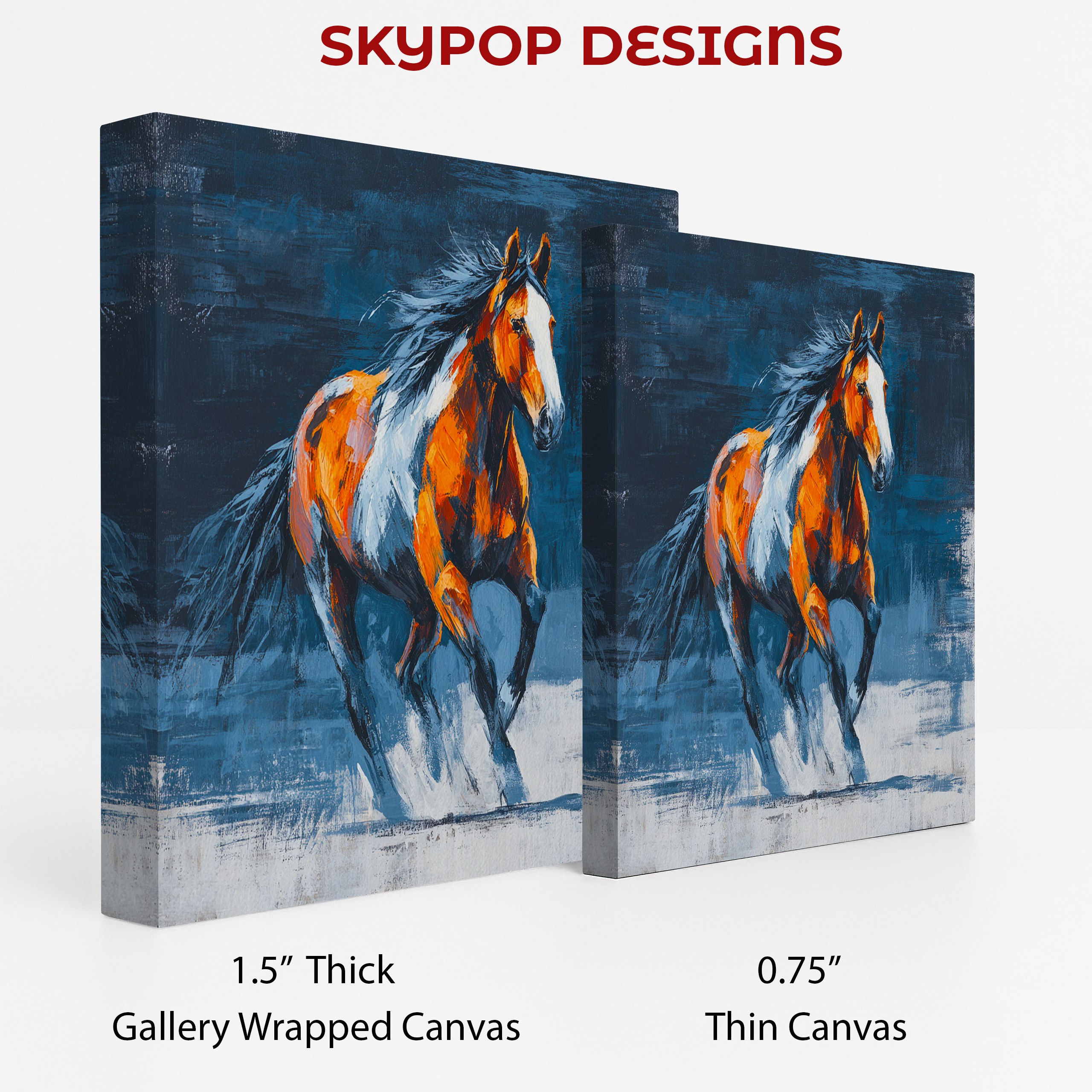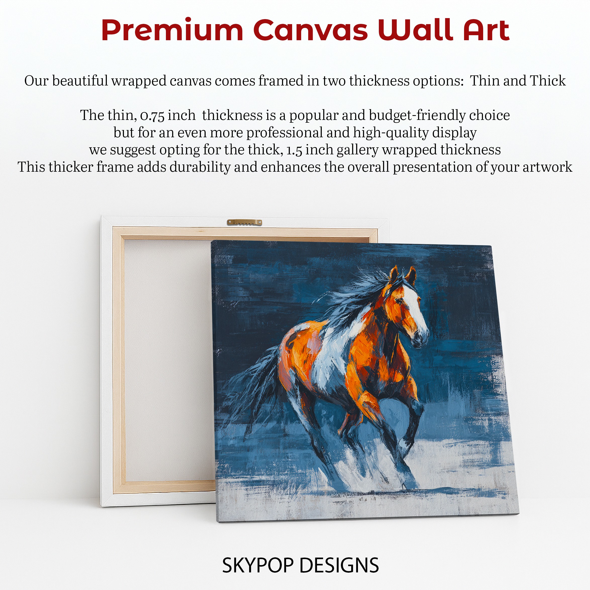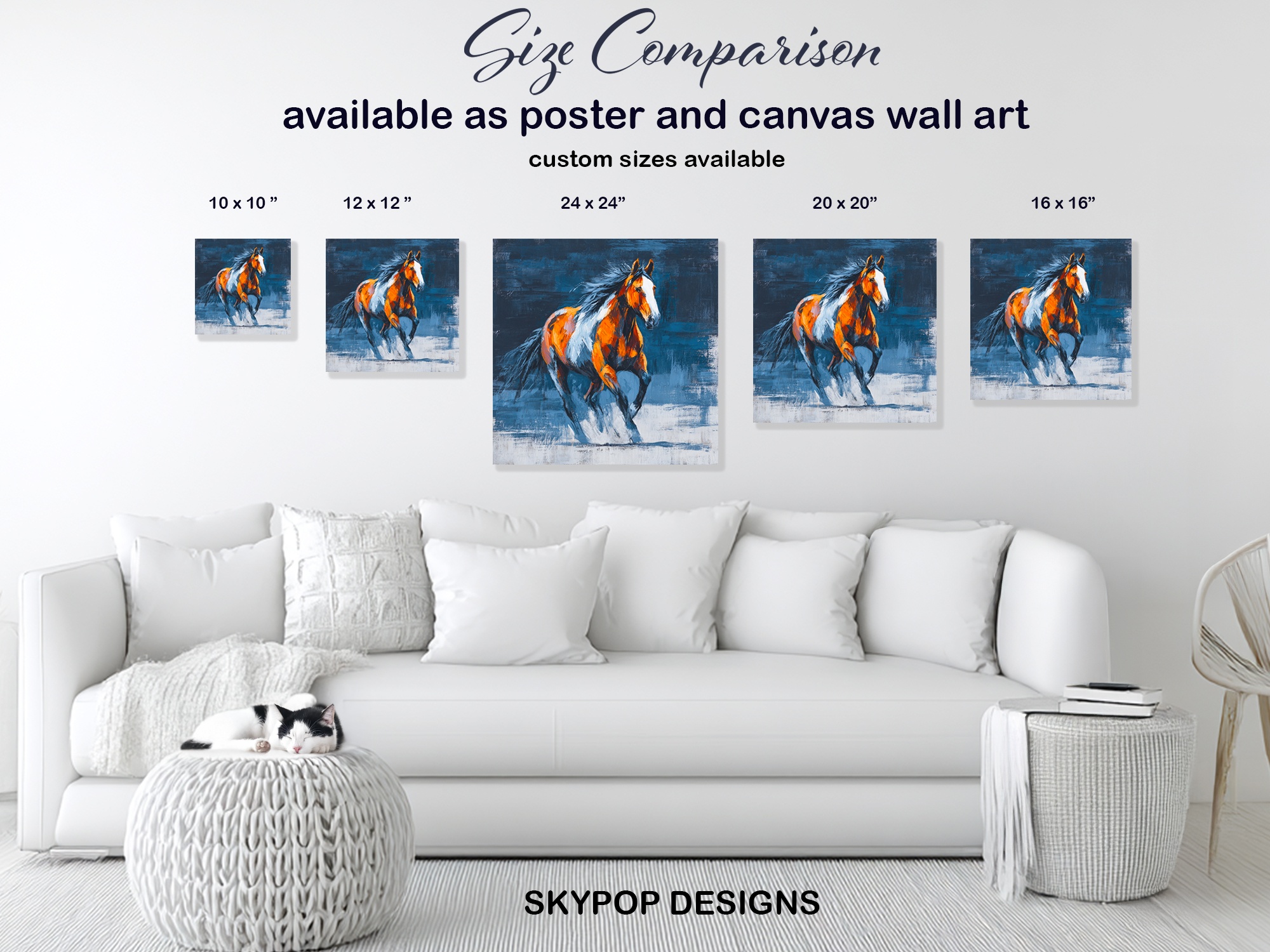 Bring the untamed spirit of the wild into your home with this striking galloping horse canvas wall art. The vibrant orange and white horse leaps off the deep blue background, creating a stunning contrast that immediately catches the eye. Perfect for modern living rooms or rustic bedrooms, this dynamic poster transforms any space with its energy and movement. The bold brushstrokes and contemporary style make this piece ideal for those who love expressive animal art that breaks traditional boundaries. As a focal point in your dining room or office, this canvas celebrates the beauty and power of horses while adding a touch of bohemian flair to your decor. The warm orange tones evoke feelings of passion and creativity, while the cool blue backdrop provides a sense of calm and depth. Whether you’re an equestrian enthusiast or simply appreciate captivating wall art, this versatile piece adapts beautifully to various interior styles. The large-scale design works well as a statement piece in spacious rooms or as an attention-grabbing accent in smaller areas. High-quality printing ensures every detail of the horse’s flowing mane and muscular form is captured with precision. Give your space an instant refresh or surprise a loved one with this unique and expressive horse artwork. Elevate your home’s ambiance with this powerful blend of color and motion that’s sure to inspire and energize your daily life.