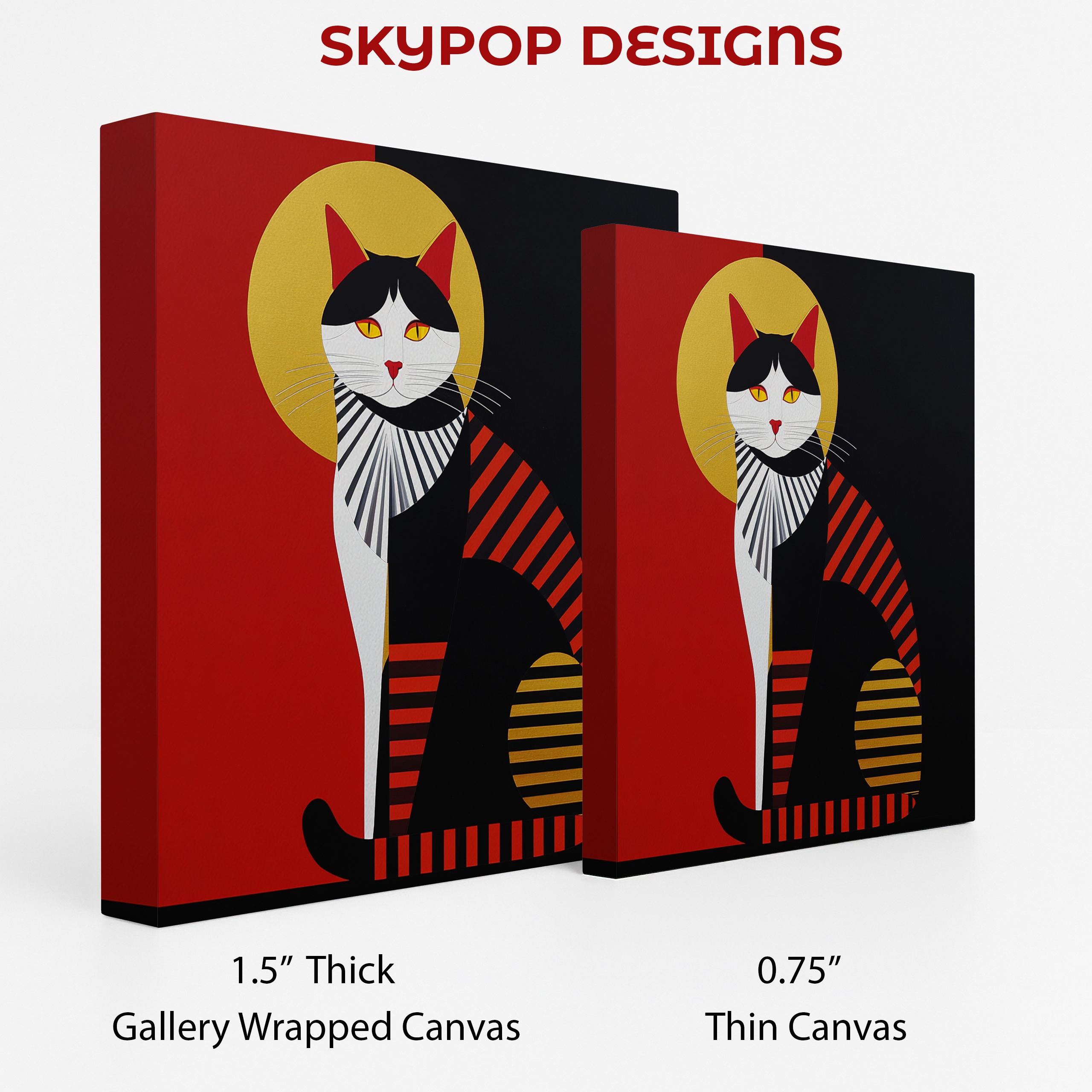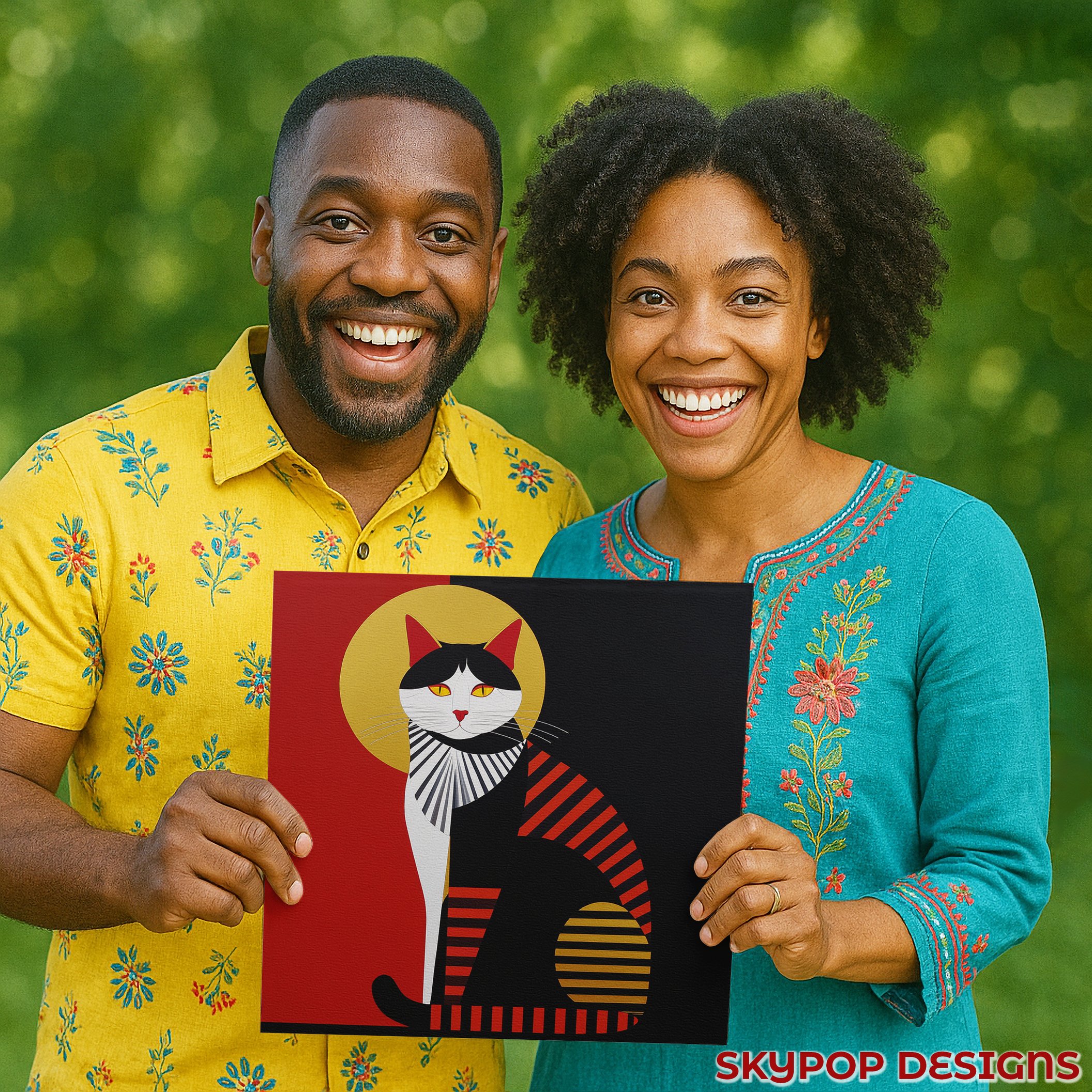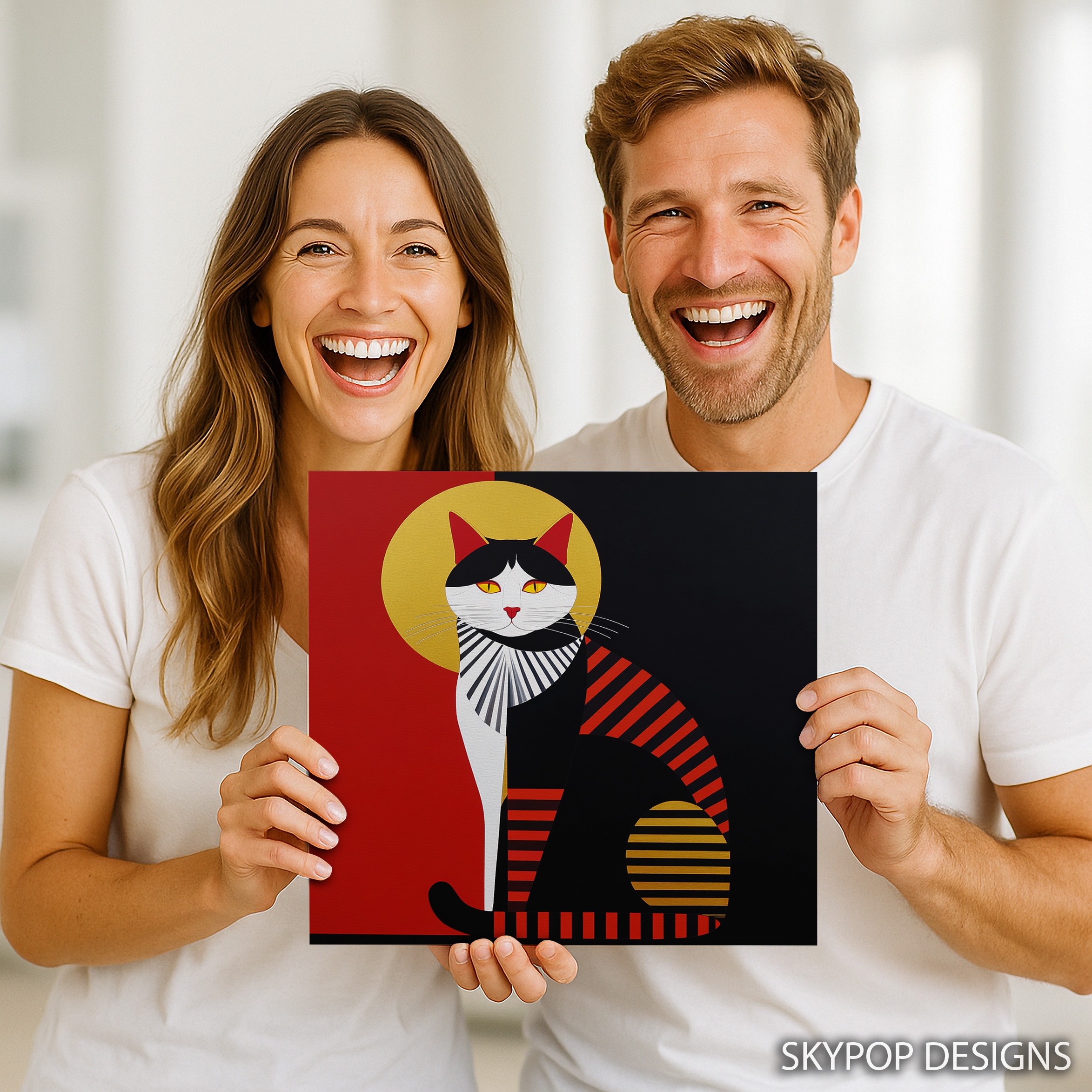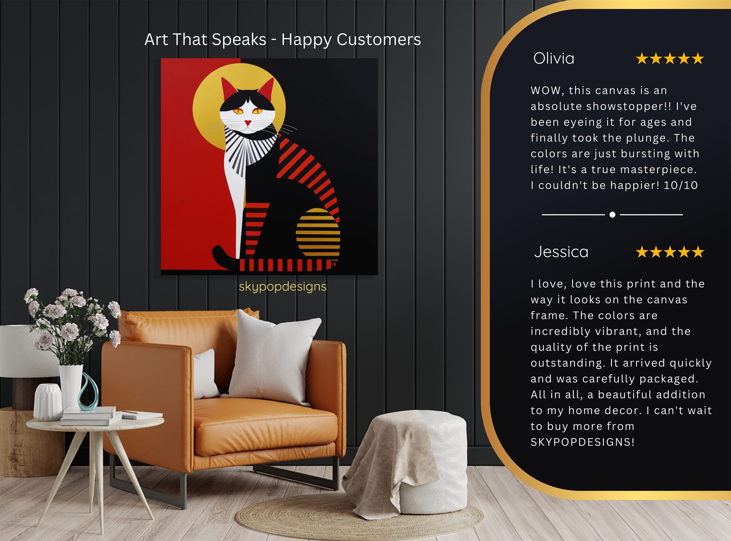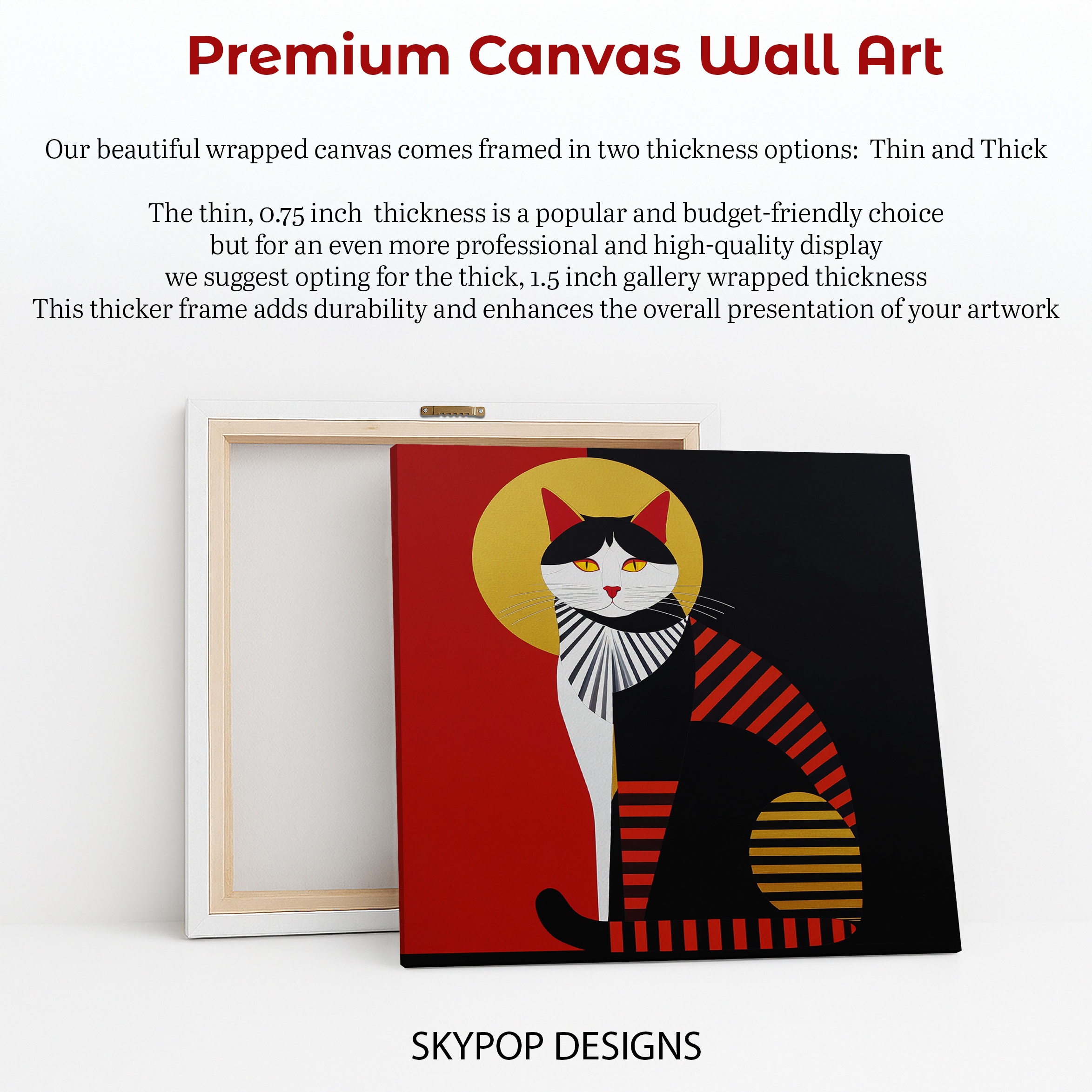Elevate your space with this striking geometric cat canvas wall art, perfect for cat lovers and modern art enthusiasts alike. This bold and vibrant poster features a stylized feline design that combines sharp lines and color blocking for a truly eye-catching effect. The contrasting red, black, yellow, and white palette creates a dynamic visual impact, instantly transforming any room into a contemporary art gallery. Ideal for modern living rooms or minimalist bedrooms, this canvas wall art adds a pop of personality to your decor. The cat’s piercing yellow eyes draw you in, while the geometric patterns and stripes create a sense of movement and energy. This versatile piece works beautifully as a standalone statement or as part of a gallery wall, making it perfect for offices, dining rooms, or creative spaces. The retro-inspired design nods to classic pop art while maintaining a fresh, contemporary feel. Whether you’re a dedicated cat person or simply appreciate bold, graphic art, this canvas poster offers a unique way to showcase your style. The high-quality printing ensures vibrant colors and crisp details that will last for years to come. Give your home an artistic upgrade with this geometric cat wall art – it’s sure to be a conversation starter and the purrfect addition to any modern or eclectic interior. Transform your space today with this captivating feline-inspired masterpiece!