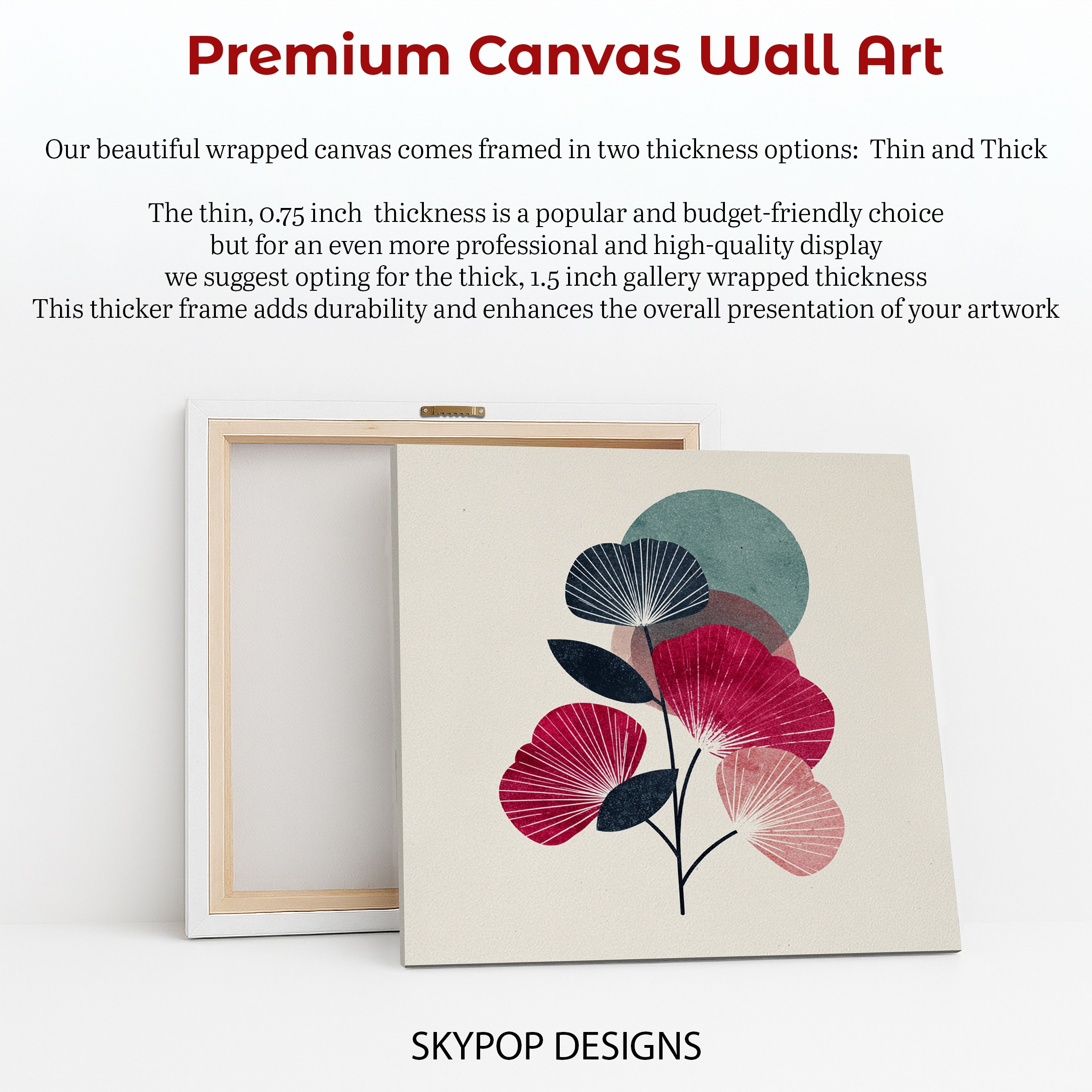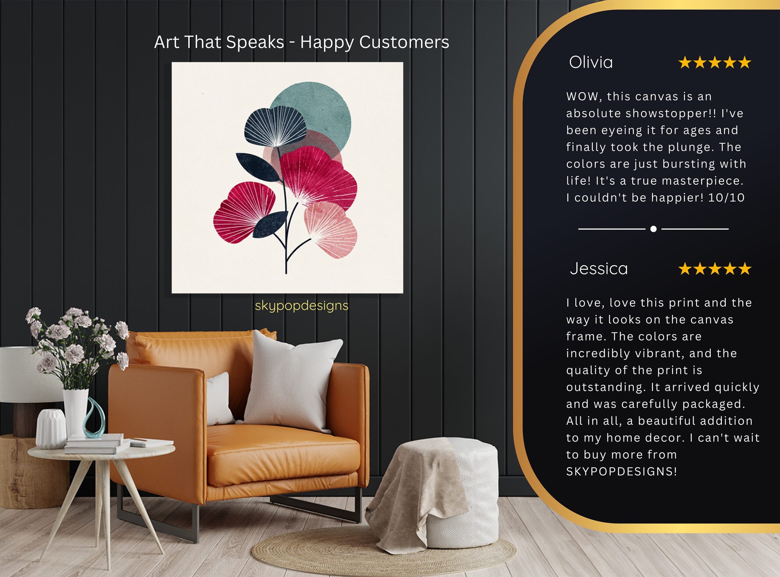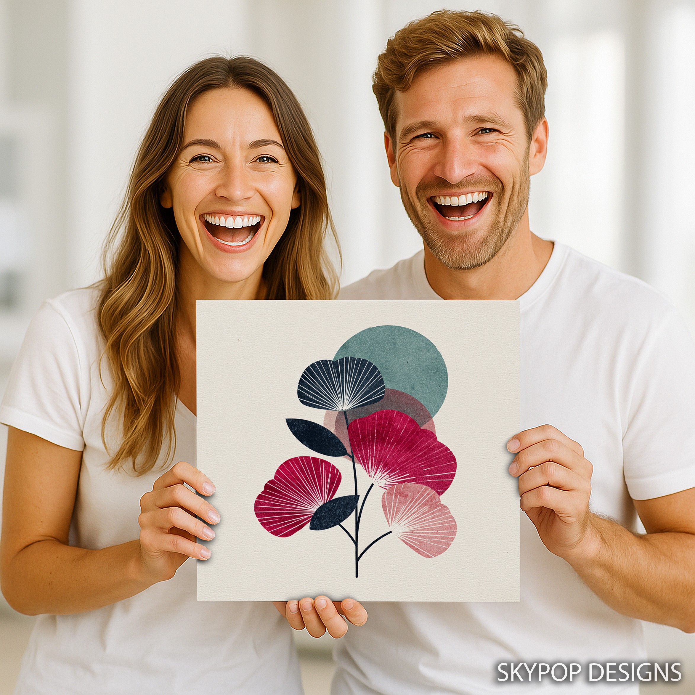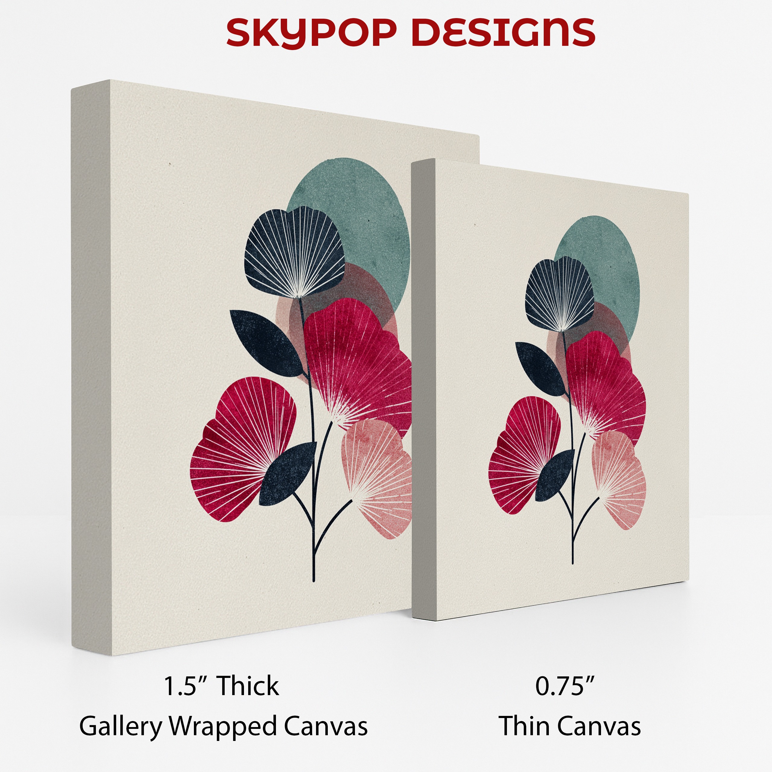 Elevate your space with this stunning geometric floral canvas wall art that seamlessly blends nature-inspired elements with modern design. This eye-catching poster features stylized fan-shaped leaves in vibrant red, soft pink, and deep blue hues, set against a crisp white background. Perfect for contemporary living rooms or minimalist bedrooms, this piece adds a pop of color and organic shapes to any interior. The striking composition balances bold shapes with delicate line work, creating a captivating visual that draws the eye and sparks conversation. Ideal for those who love Scandinavian-inspired decor, this canvas art brings a fresh, botanical touch to clean, uncluttered spaces. The geometric interpretation of floral forms offers a unique twist on traditional nature art, making it a versatile choice for modern offices or dining rooms. With its soothing color palette and balanced design, this wall art has the power to transform the mood of any room, infusing it with a sense of calm and creativity. Whether you’re looking to refresh your home decor or searching for the perfect housewarming gift, this geometric floral artwork delivers style and sophistication. Available in various sizes, this high-quality canvas print ensures vivid colors and crisp details that will enhance your walls for years to come. Embrace the beauty of nature with a contemporary edge – add this striking floral wall art to your collection today and breathe new life into your living space.