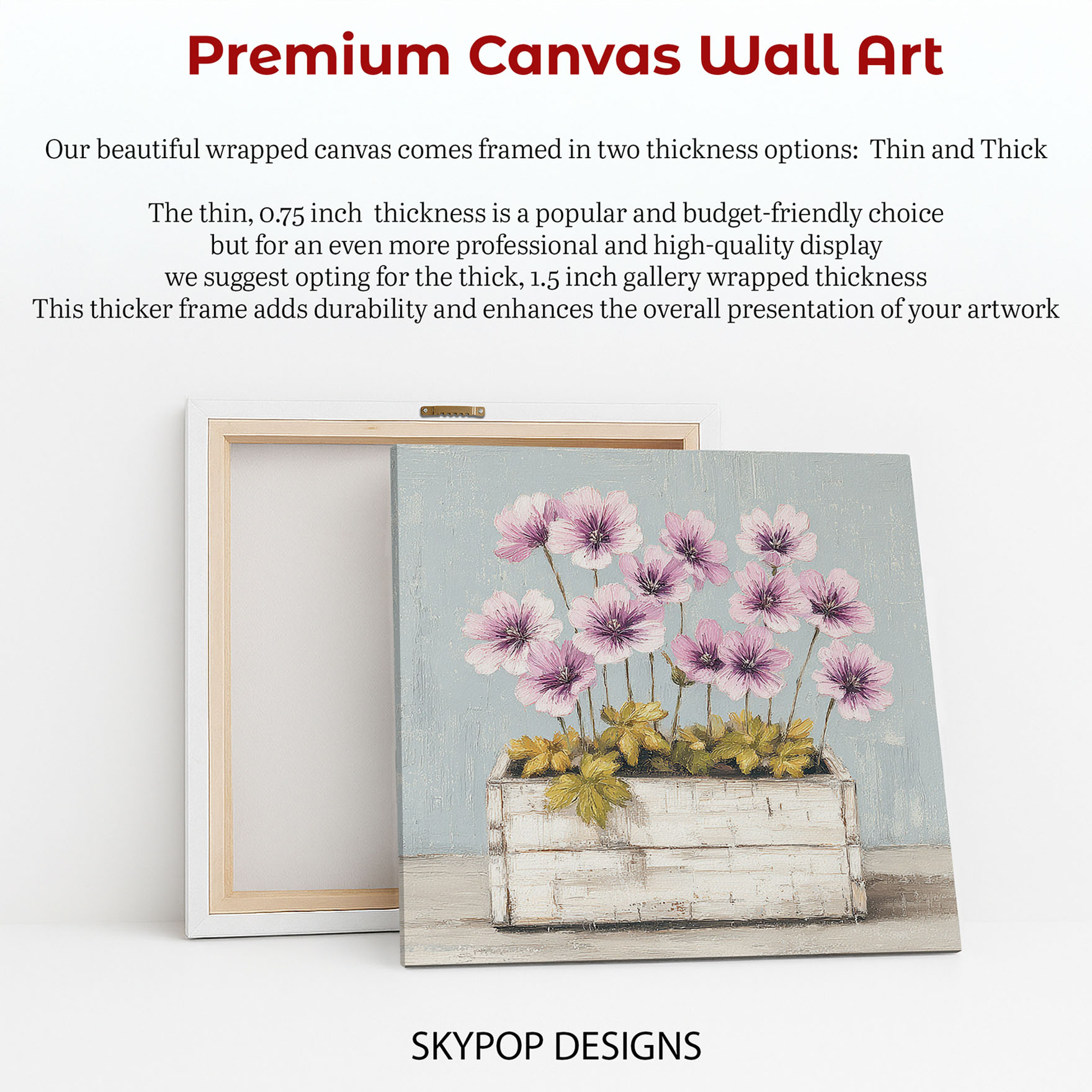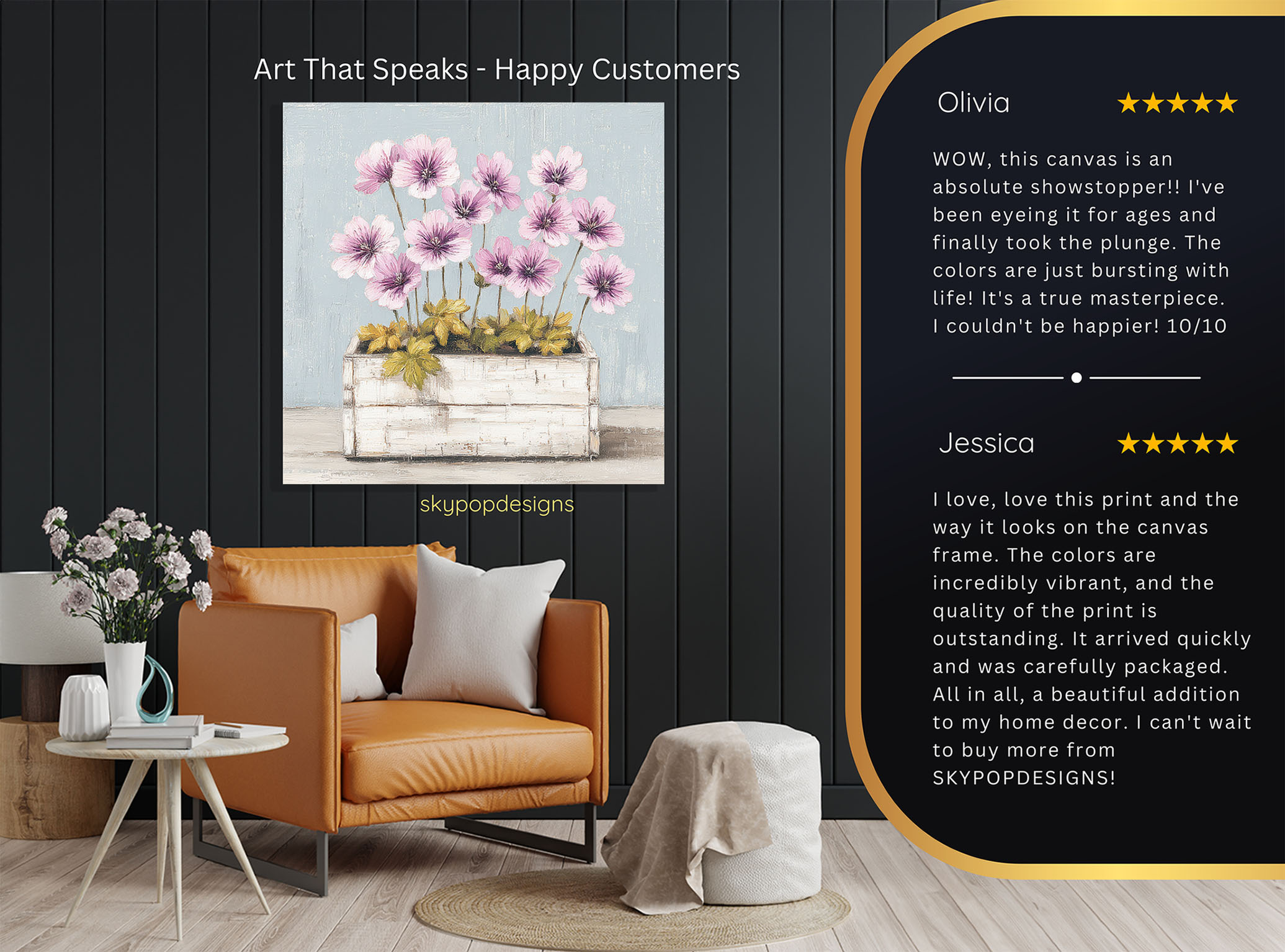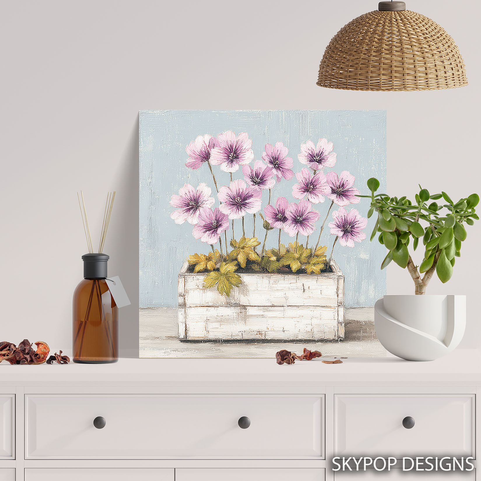 Enhance your home with this beautiful pink geranium canvas wall art, a stunning piece that brings the charm of a garden indoors. This poster or canvas wall art features delicate pink flowers in a rustic white planter, perfect for adding a touch of nature-inspired beauty to any space. The soft blue textured background complements the vibrant pink petals, creating a serene and inviting atmosphere. Ideal for farmhouse, shabby chic, or coastal decor styles, this floral artwork adds warmth and elegance to your living room or bedroom walls. The impressionistic style of the painting captures the light and movement of the blossoms, making this canvas wall art a captivating focal point. High-quality printing ensures the rich colors and delicate brushstrokes are vividly reproduced for lasting enjoyment. This versatile piece works wonderfully in dining rooms, entryways, or sunrooms, bringing a breath of fresh air to your home decor. Makes a thoughtful gift for housewarmings, birthdays, or Mother’s Day, bringing joy to any flower lover. The soothing color palette of pink, blue, and green creates a calming mood, perfect for unwinding after a long day. Elevate your home’s aesthetic with this charming floral wall art that celebrates the simple beauty of nature. Add this eye-catching geranium poster or canvas to your collection and transform your walls into a blooming sanctuary today. This artwork is a perfect way to showcase your love for nature and timeless style.