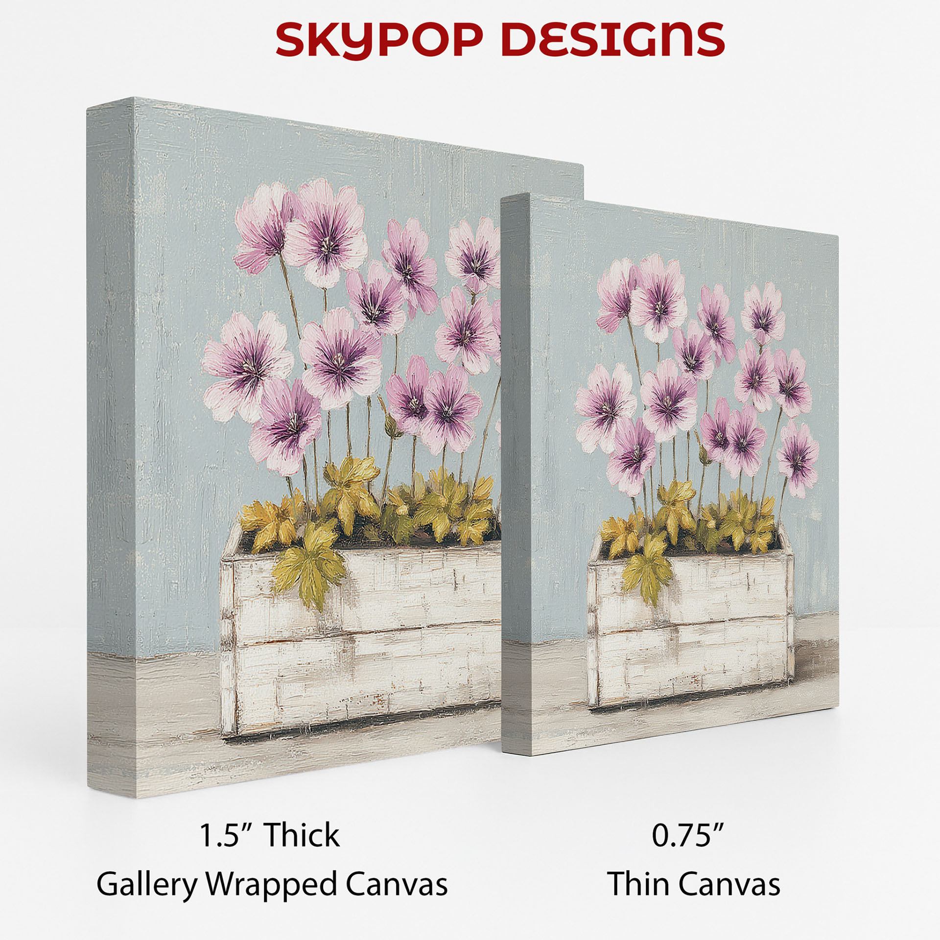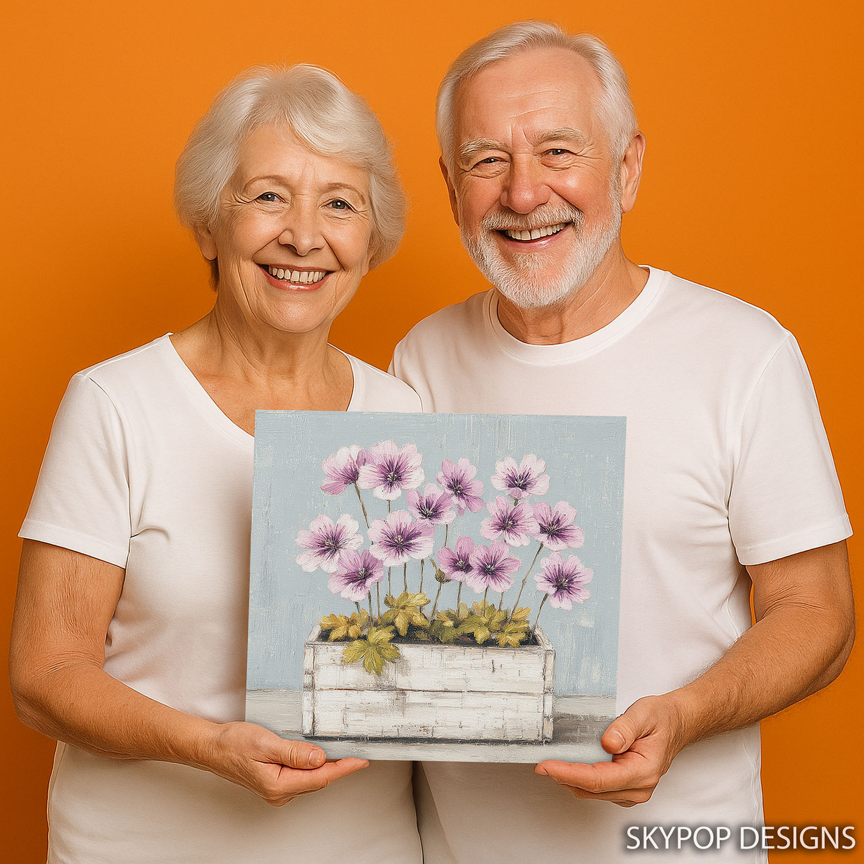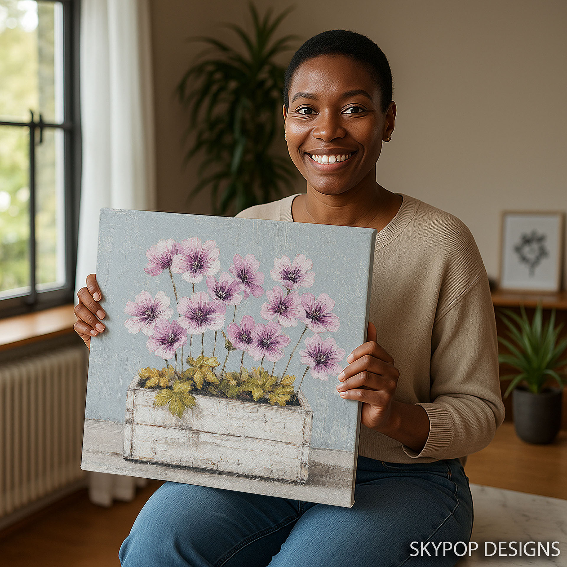 Enhance your home with this beautiful pink geranium canvas wall art, a stunning piece that brings the charm of a garden indoors. This poster or canvas wall art features delicate pink flowers in a rustic white planter, perfect for adding a touch of nature-inspired beauty to any space. The soft blue textured background complements the vibrant pink petals, creating a serene and inviting atmosphere. Ideal for farmhouse, shabby chic, or coastal decor styles, this floral artwork adds warmth and elegance to your living room or bedroom walls. The impressionistic style of the painting captures the light and movement of the blossoms, making this canvas wall art a captivating focal point. High-quality printing ensures the rich colors and delicate brushstrokes are vividly reproduced for lasting enjoyment. This versatile piece works wonderfully in dining rooms, entryways, or sunrooms, bringing a breath of fresh air to your home decor. Makes a thoughtful gift for housewarmings, birthdays, or Mother’s Day, bringing joy to any flower lover. The soothing color palette of pink, blue, and green creates a calming mood, perfect for unwinding after a long day. Elevate your home’s aesthetic with this charming floral wall art that celebrates the simple beauty of nature. Add this eye-catching geranium poster or canvas to your collection and transform your walls into a blooming sanctuary today. This artwork is a perfect way to showcase your love for nature and timeless style.