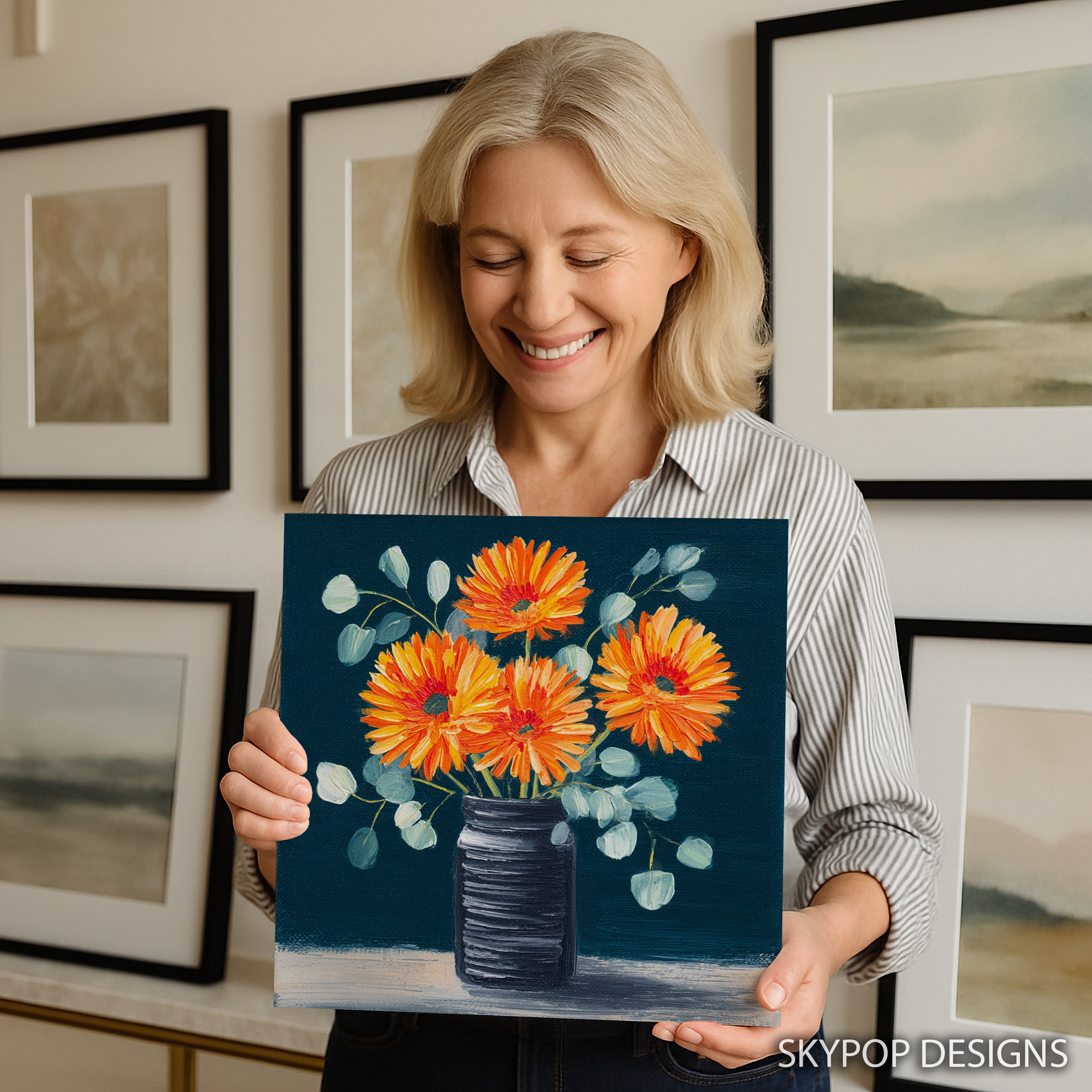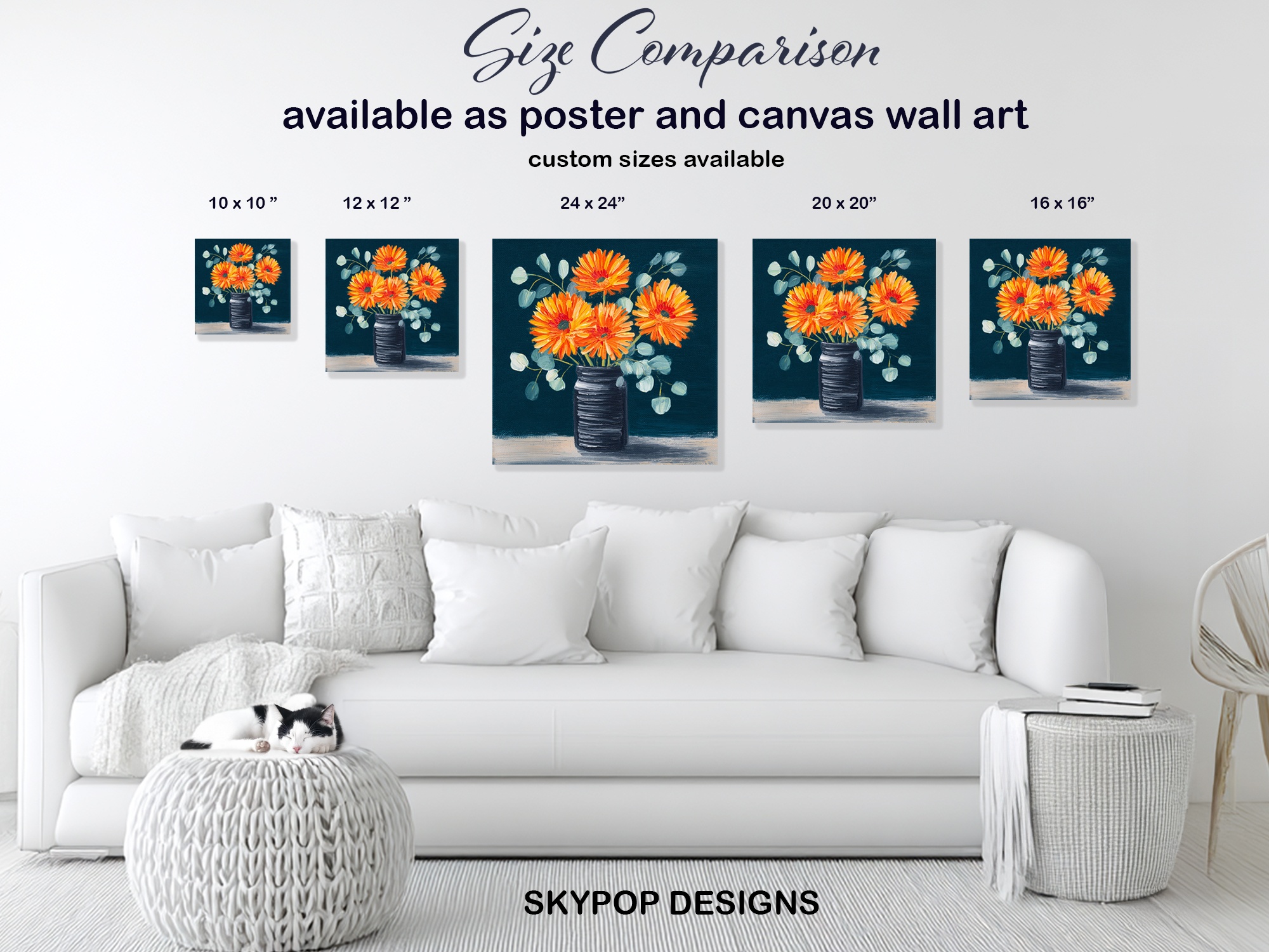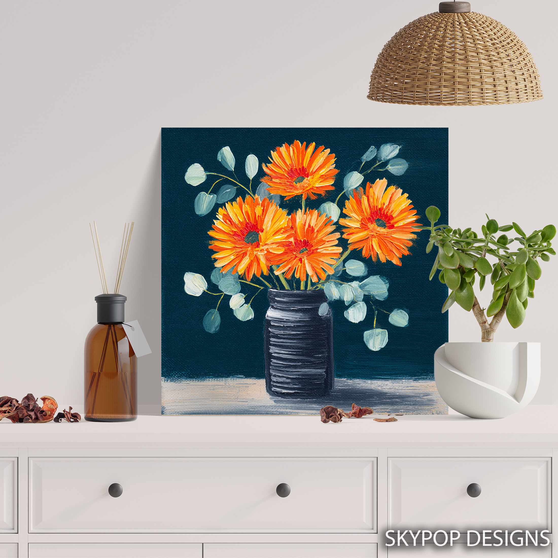 Brighten your space with this stunning gerbera daisy canvas wall art, featuring a burst of vibrant orange blooms against a deep blue background. This eye-catching poster transforms any room with its bold color contrast and contemporary style. The striking floral arrangement, set in a sleek black vase, adds a touch of modern elegance to your home decor. Perfect for creating a focal point in your living room or adding a pop of color to a minimalist bedroom. The vivid orange petals seem to dance with life, bringing energy and warmth to your walls. Ideal for those who love modern farmhouse aesthetics or want to infuse their space with a touch of nature. The delicate green leaves provide a lovely complement to the orange flowers, creating a balanced and harmonious composition. This versatile canvas wall art works beautifully in dining rooms, offices, or as an accent piece in entryways. The high-quality printing captures every brushstroke, giving the artwork a rich, textured appearance that mimics an original painting. Whether you’re looking to refresh your seasonal decor or searching for the perfect housewarming gift, this gerbera daisy art delivers instant impact. Elevate your interior design with this captivating blend of floral beauty and contemporary style. Transform your living space today with this vibrant and cheerful gerbera bouquet wall art.