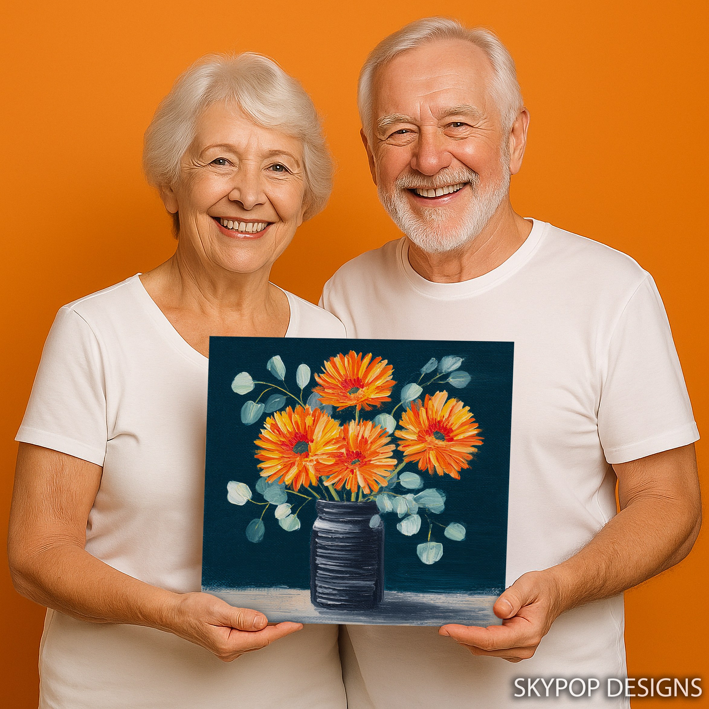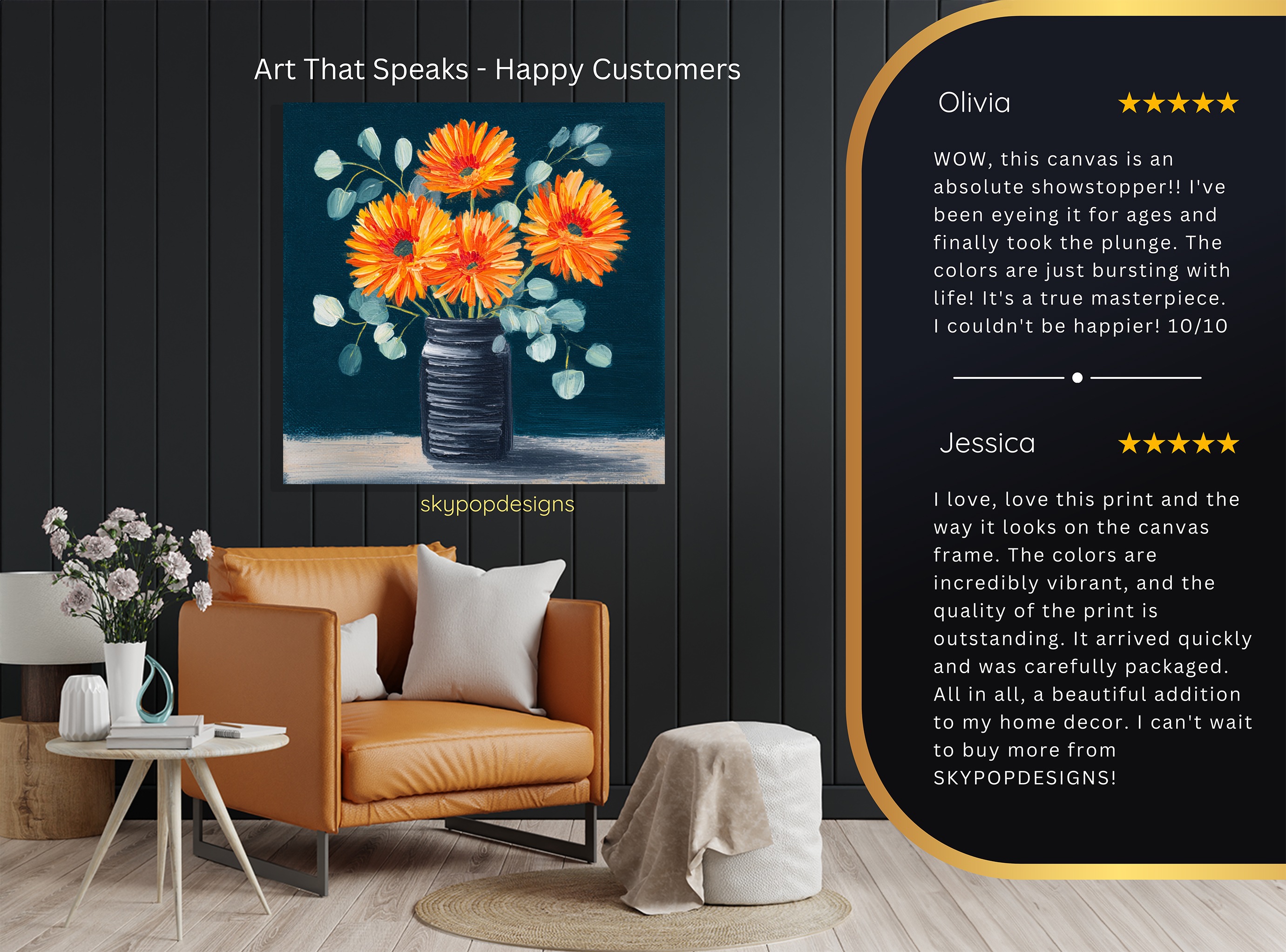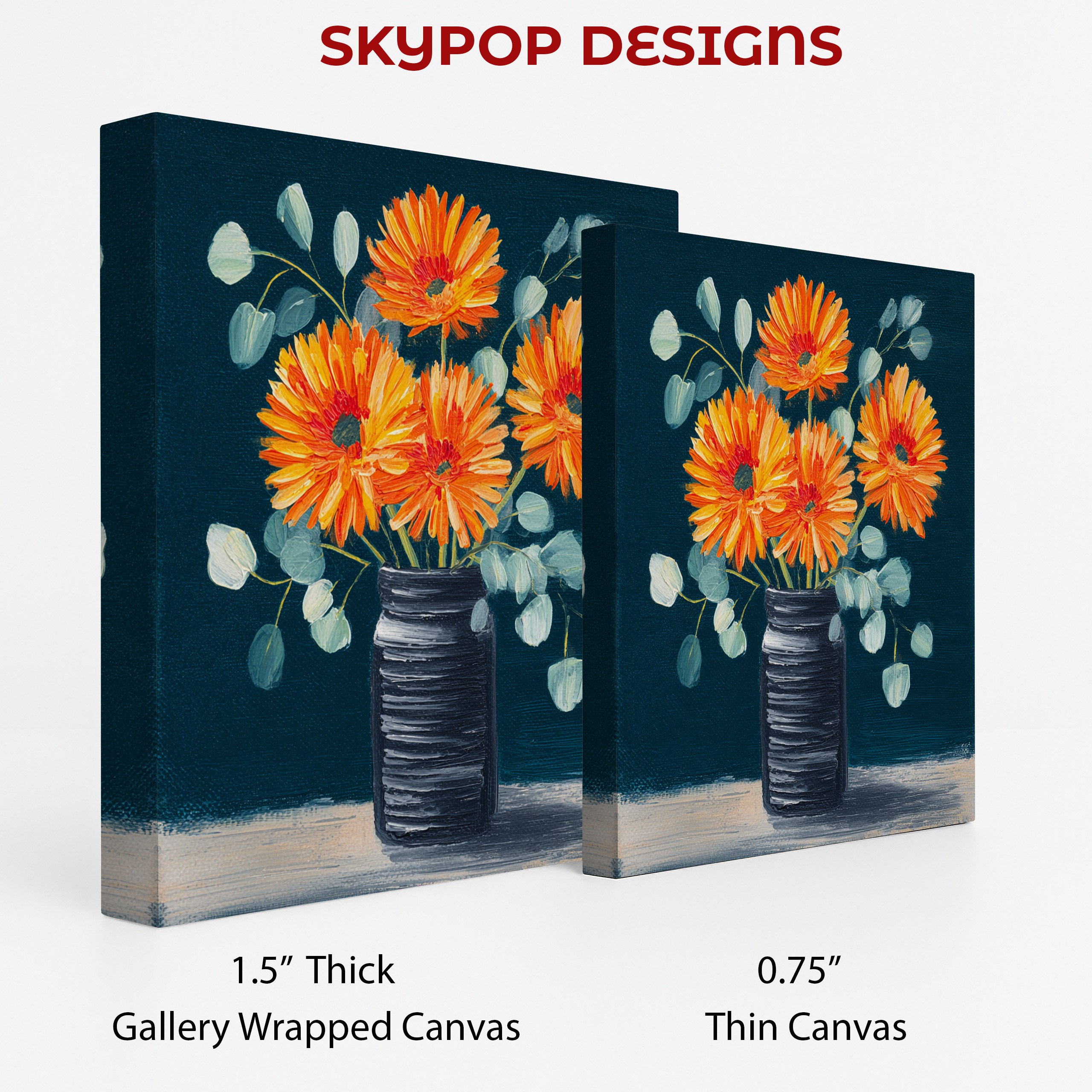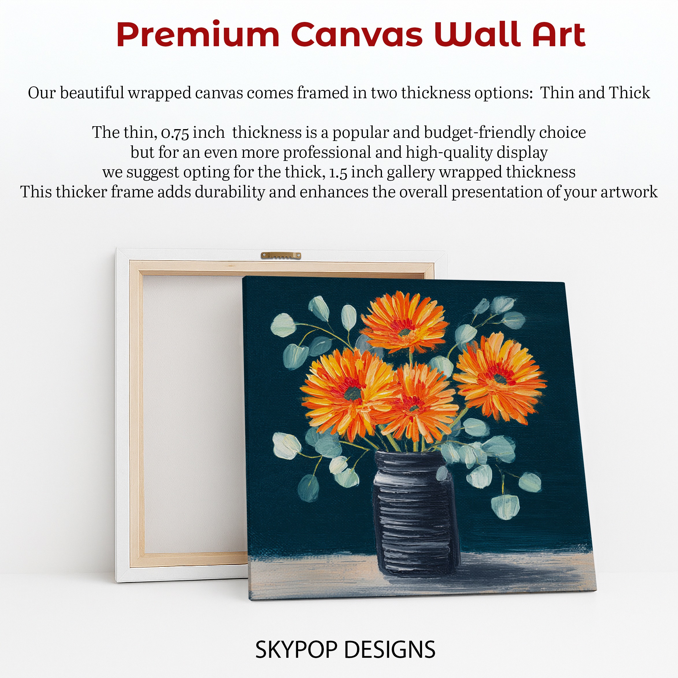 Brighten your space with this stunning gerbera daisy canvas wall art, featuring a burst of vibrant orange blooms against a deep blue background. This eye-catching poster transforms any room with its bold color contrast and contemporary style. The striking floral arrangement, set in a sleek black vase, adds a touch of modern elegance to your home decor. Perfect for creating a focal point in your living room or adding a pop of color to a minimalist bedroom. The vivid orange petals seem to dance with life, bringing energy and warmth to your walls. Ideal for those who love modern farmhouse aesthetics or want to infuse their space with a touch of nature. The delicate green leaves provide a lovely complement to the orange flowers, creating a balanced and harmonious composition. This versatile canvas wall art works beautifully in dining rooms, offices, or as an accent piece in entryways. The high-quality printing captures every brushstroke, giving the artwork a rich, textured appearance that mimics an original painting. Whether you’re looking to refresh your seasonal decor or searching for the perfect housewarming gift, this gerbera daisy art delivers instant impact. Elevate your interior design with this captivating blend of floral beauty and contemporary style. Transform your living space today with this vibrant and cheerful gerbera bouquet wall art.