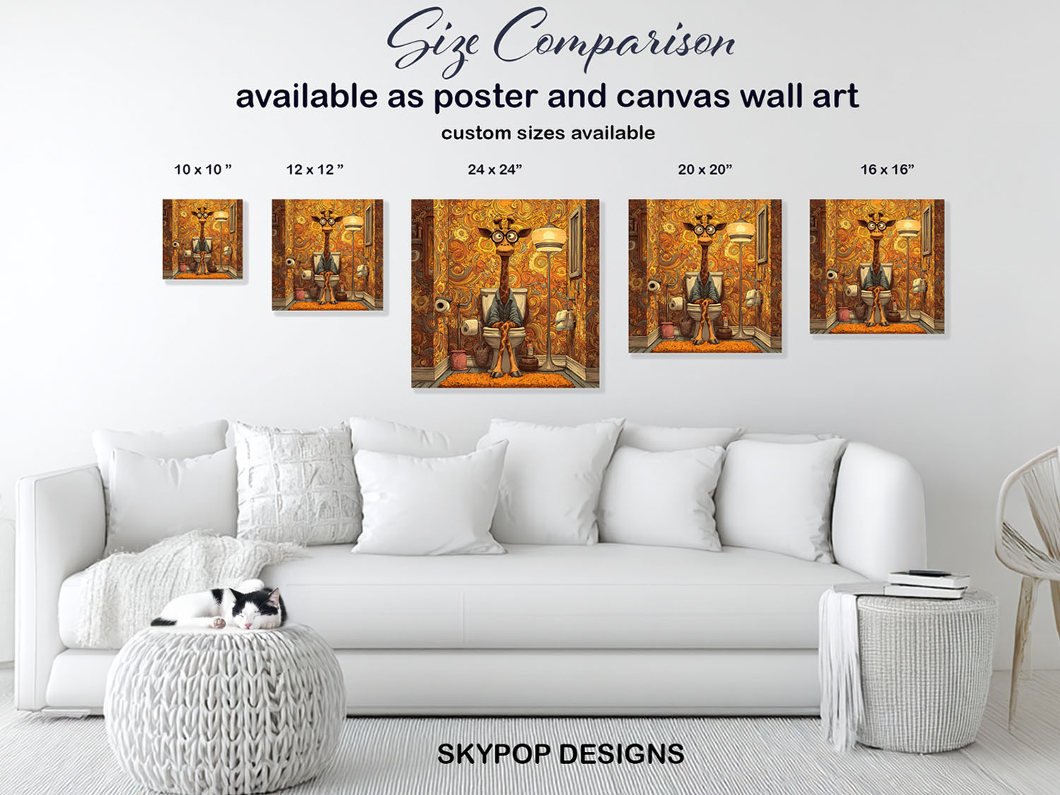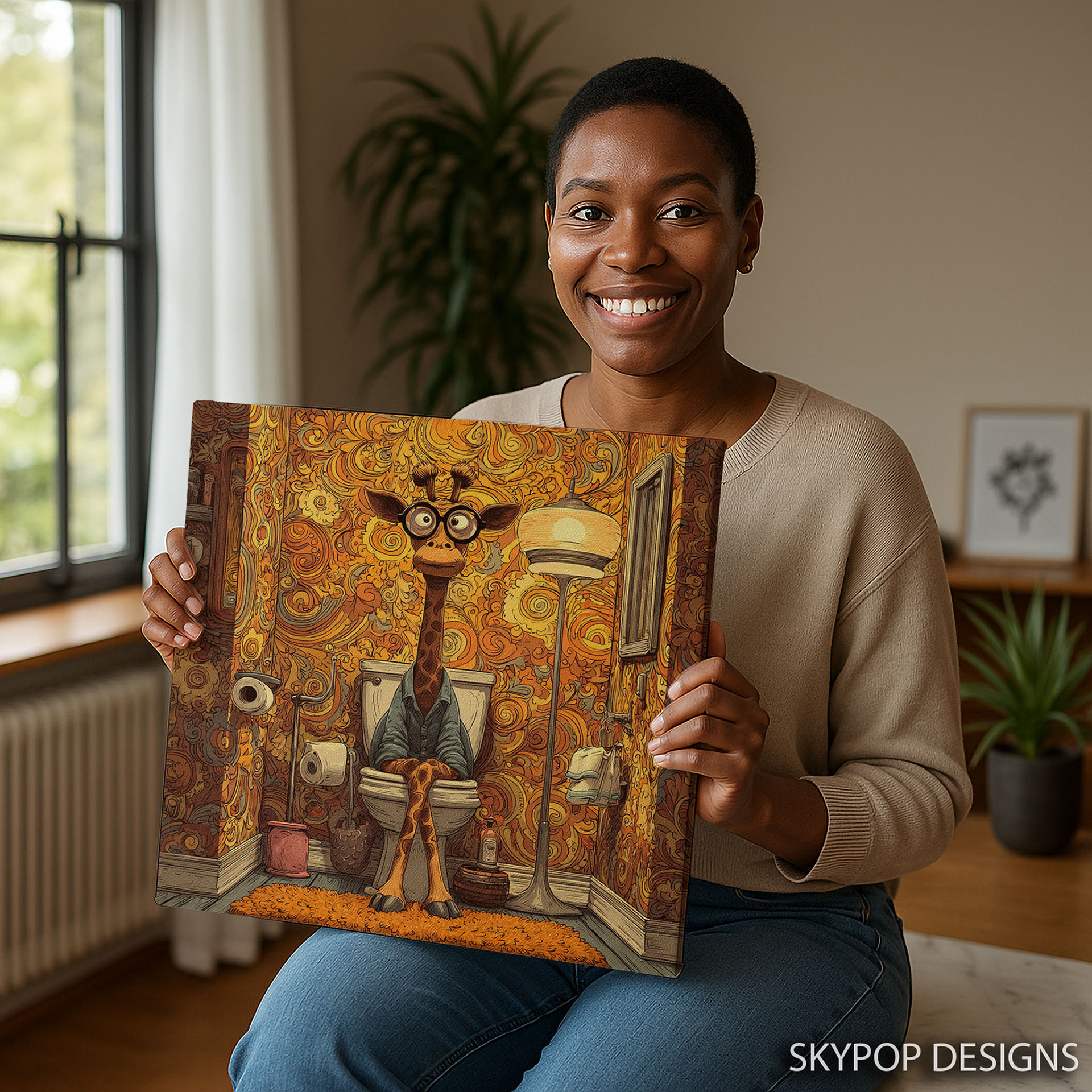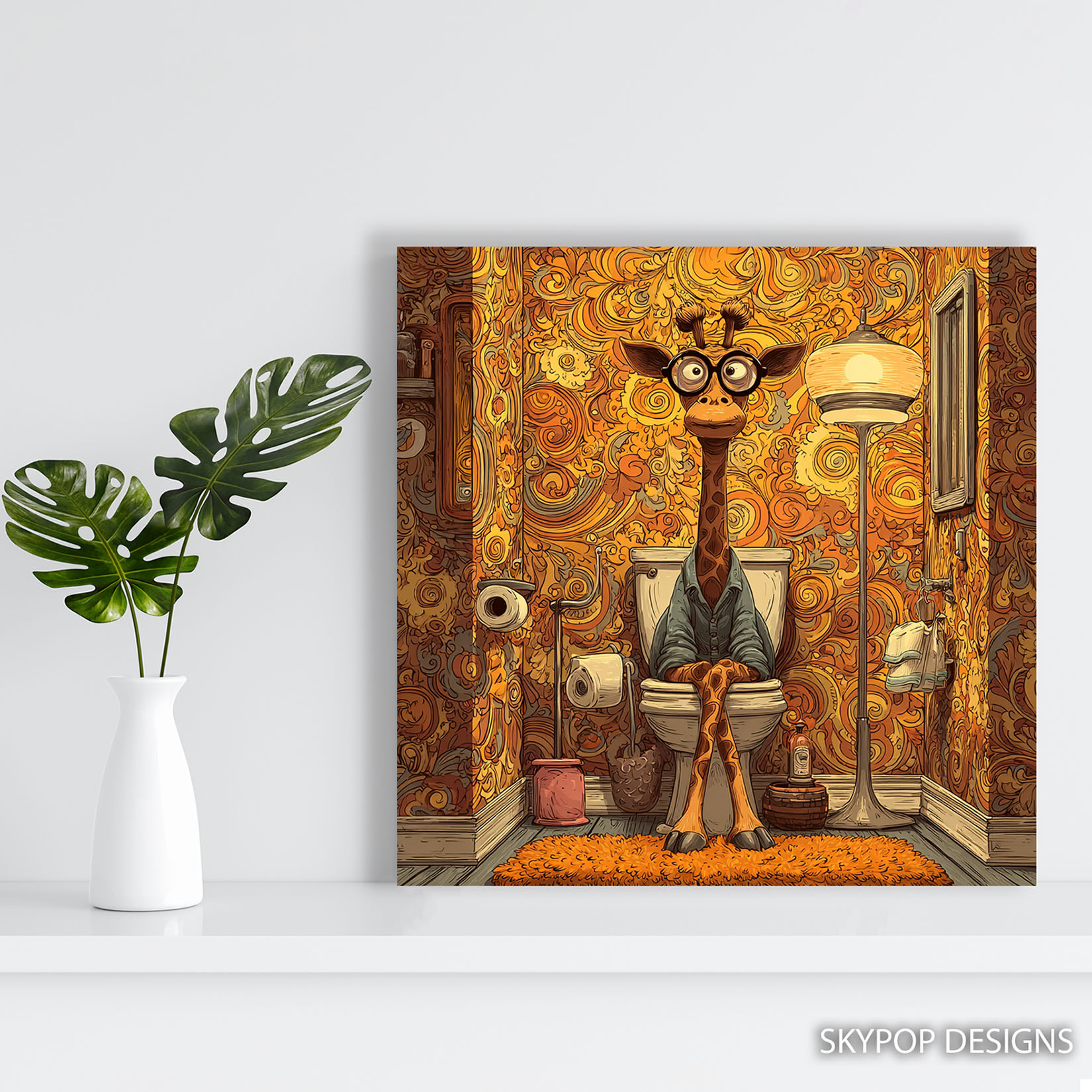 Transform your space with this hilarious and captivating giraffe canvas wall art, a true conversation starter for any bathroom. This unique poster or canvas wall art features a giraffe hilariously perched on a toilet, set against a vibrant, swirly orange and yellow patterned wallpaper. The pop art style and whimsical illustration bring a playful touch to modern, bohemian, or eclectic decor. This eye-catching artwork is perfect for a guest bathroom, adding a memorable element that guests will adore, or as a quirky addition to a living room or entryway. The striking color palette of warm oranges and yellows, with hints of teal, creates an energetic and joyful atmosphere, designed to bring smiles and laughter. Ideal for those who appreciate bold and unusual animal art, this piece makes a fantastic gift for housewarmings, birthdays, or just because. The detailed linework and vibrant colors ensure this canvas wall art will stand out, adding personality and fun to your home. Elevate your interior design with this expressive giraffe wall art that celebrates individuality and humor. High-quality printing captures the intricate details of the pattern and the giraffe’s endearing expression for a stunning visual impact. Make your bathroom or any room the most talked-about in your home with this unforgettable piece of animal wall art. Embrace this unique blend of pop art and animal art today and inject some serious fun into your decor.