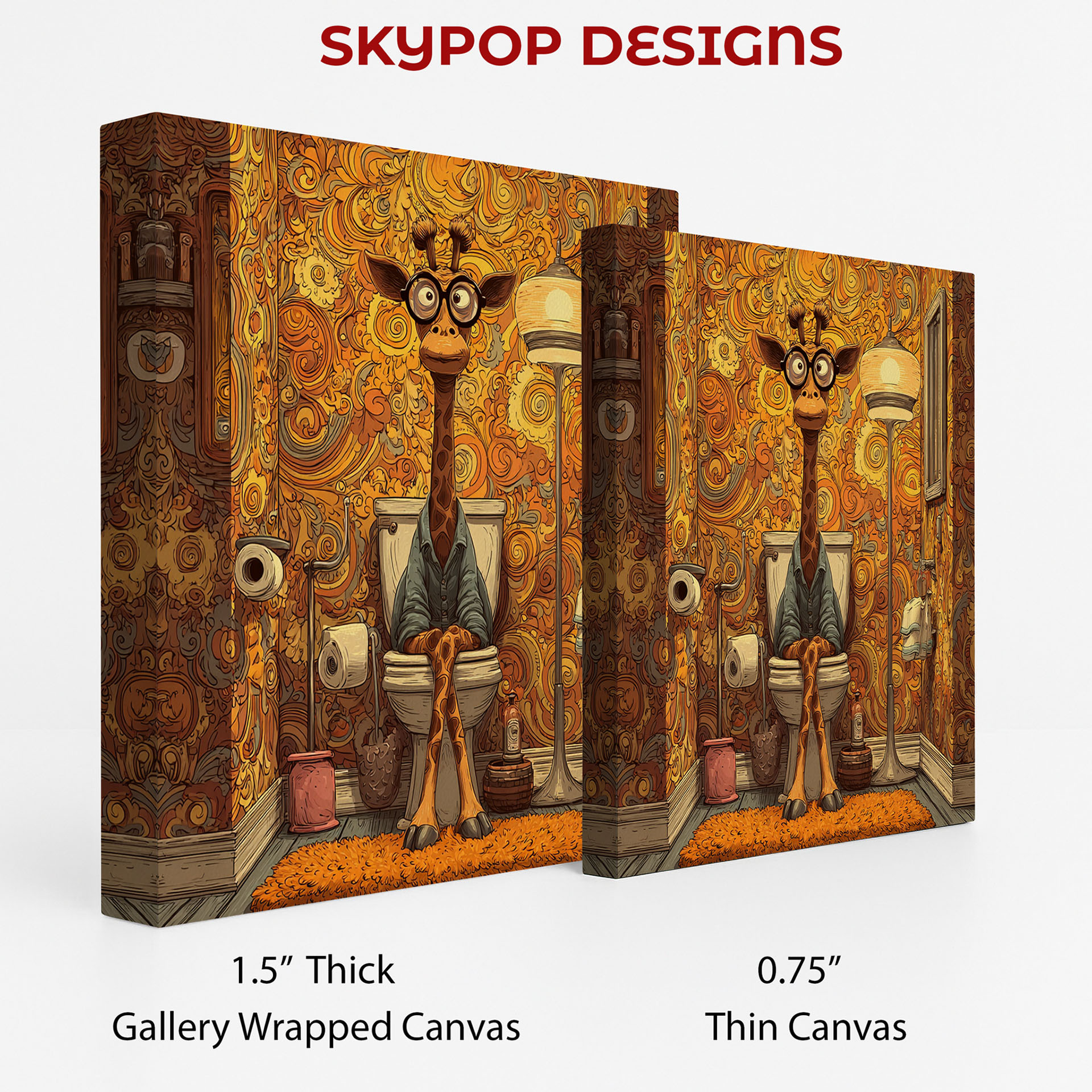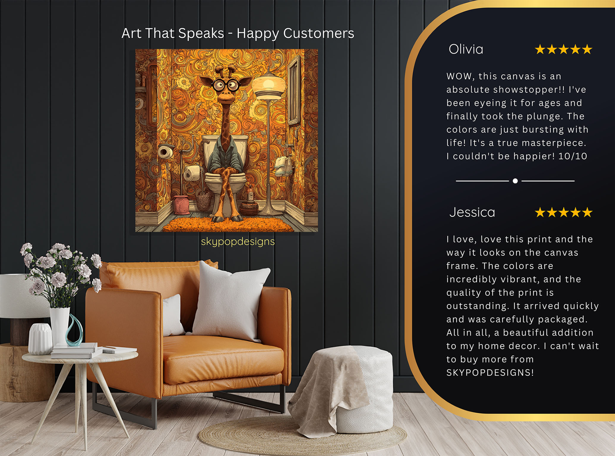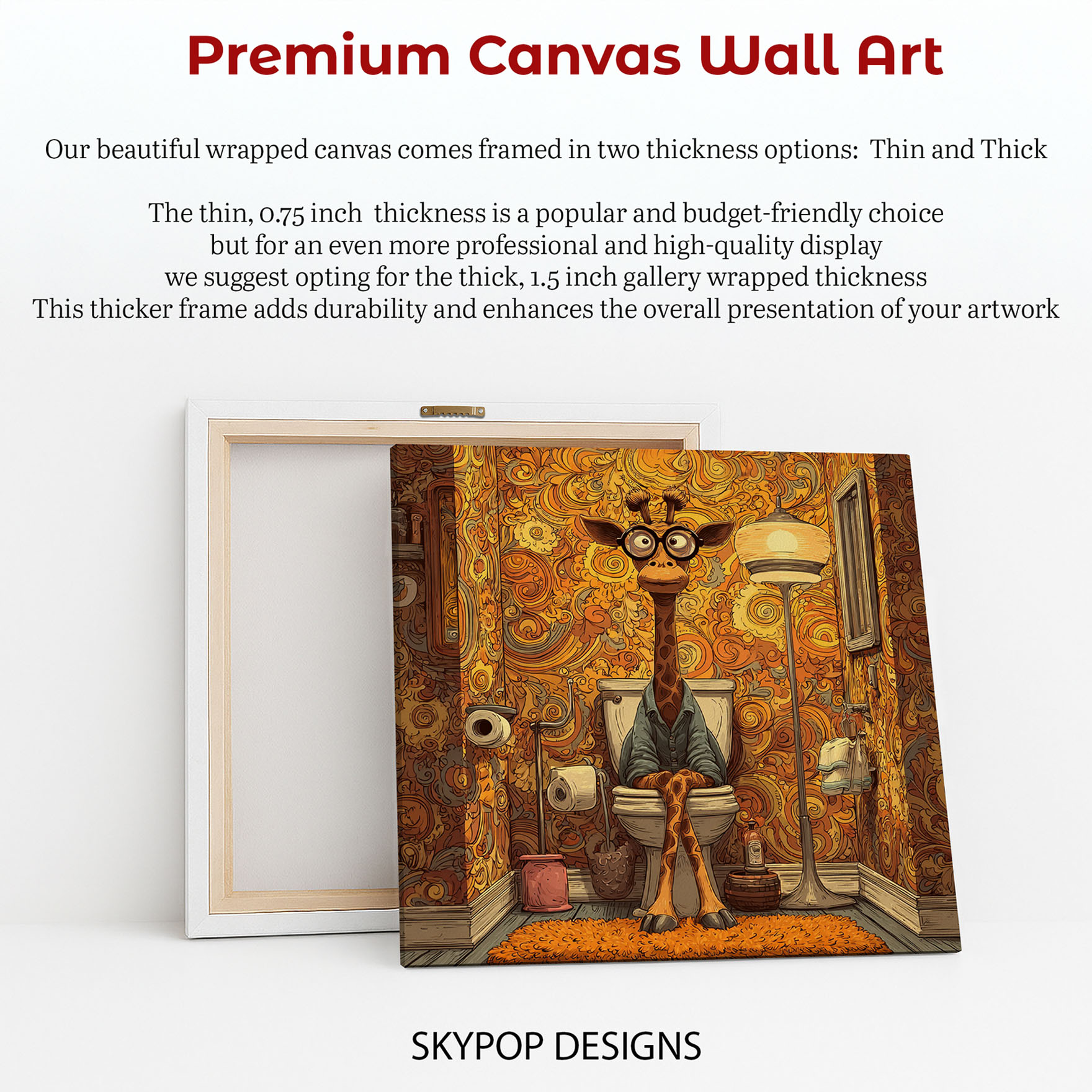 Transform your space with this hilarious and captivating giraffe canvas wall art, a true conversation starter for any bathroom. This unique poster or canvas wall art features a giraffe hilariously perched on a toilet, set against a vibrant, swirly orange and yellow patterned wallpaper. The pop art style and whimsical illustration bring a playful touch to modern, bohemian, or eclectic decor. This eye-catching artwork is perfect for a guest bathroom, adding a memorable element that guests will adore, or as a quirky addition to a living room or entryway. The striking color palette of warm oranges and yellows, with hints of teal, creates an energetic and joyful atmosphere, designed to bring smiles and laughter. Ideal for those who appreciate bold and unusual animal art, this piece makes a fantastic gift for housewarmings, birthdays, or just because. The detailed linework and vibrant colors ensure this canvas wall art will stand out, adding personality and fun to your home. Elevate your interior design with this expressive giraffe wall art that celebrates individuality and humor. High-quality printing captures the intricate details of the pattern and the giraffe’s endearing expression for a stunning visual impact. Make your bathroom or any room the most talked-about in your home with this unforgettable piece of animal wall art. Embrace this unique blend of pop art and animal art today and inject some serious fun into your decor.
