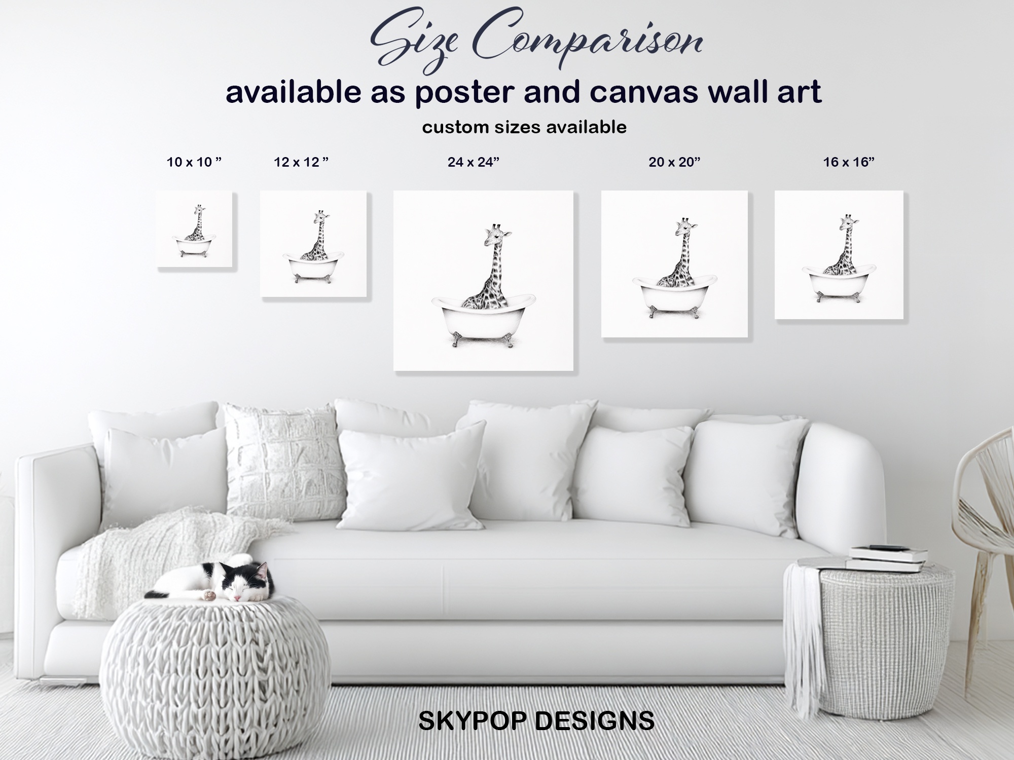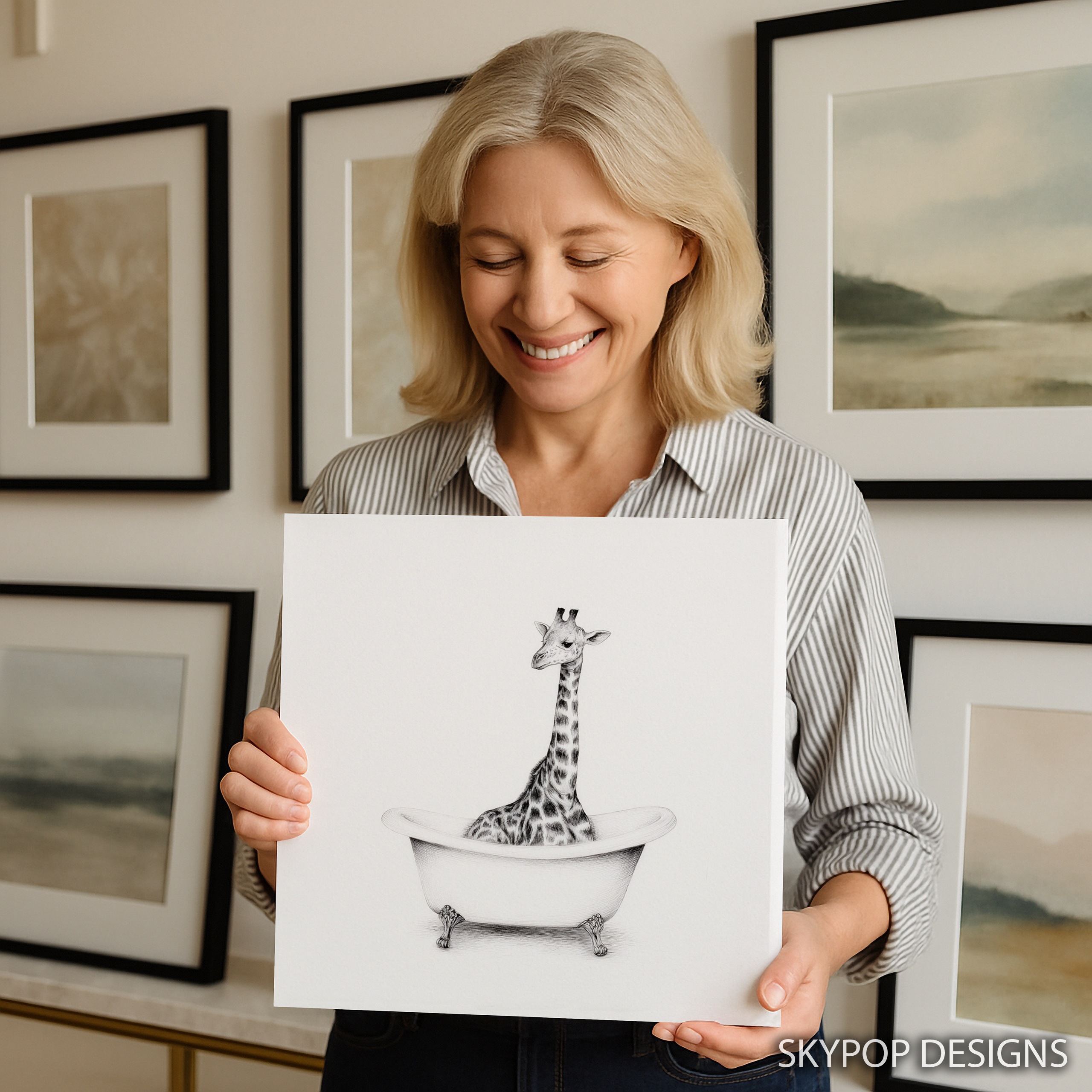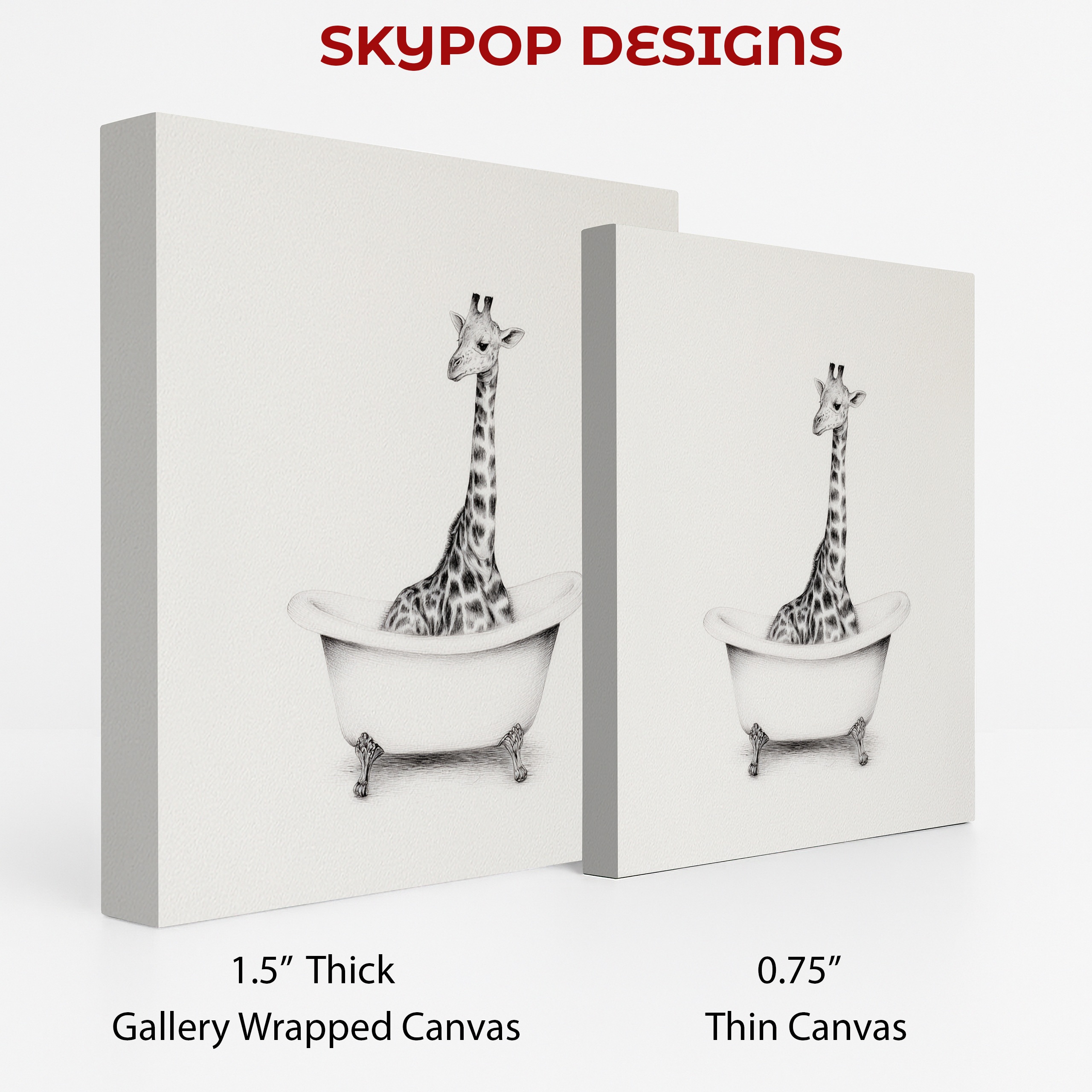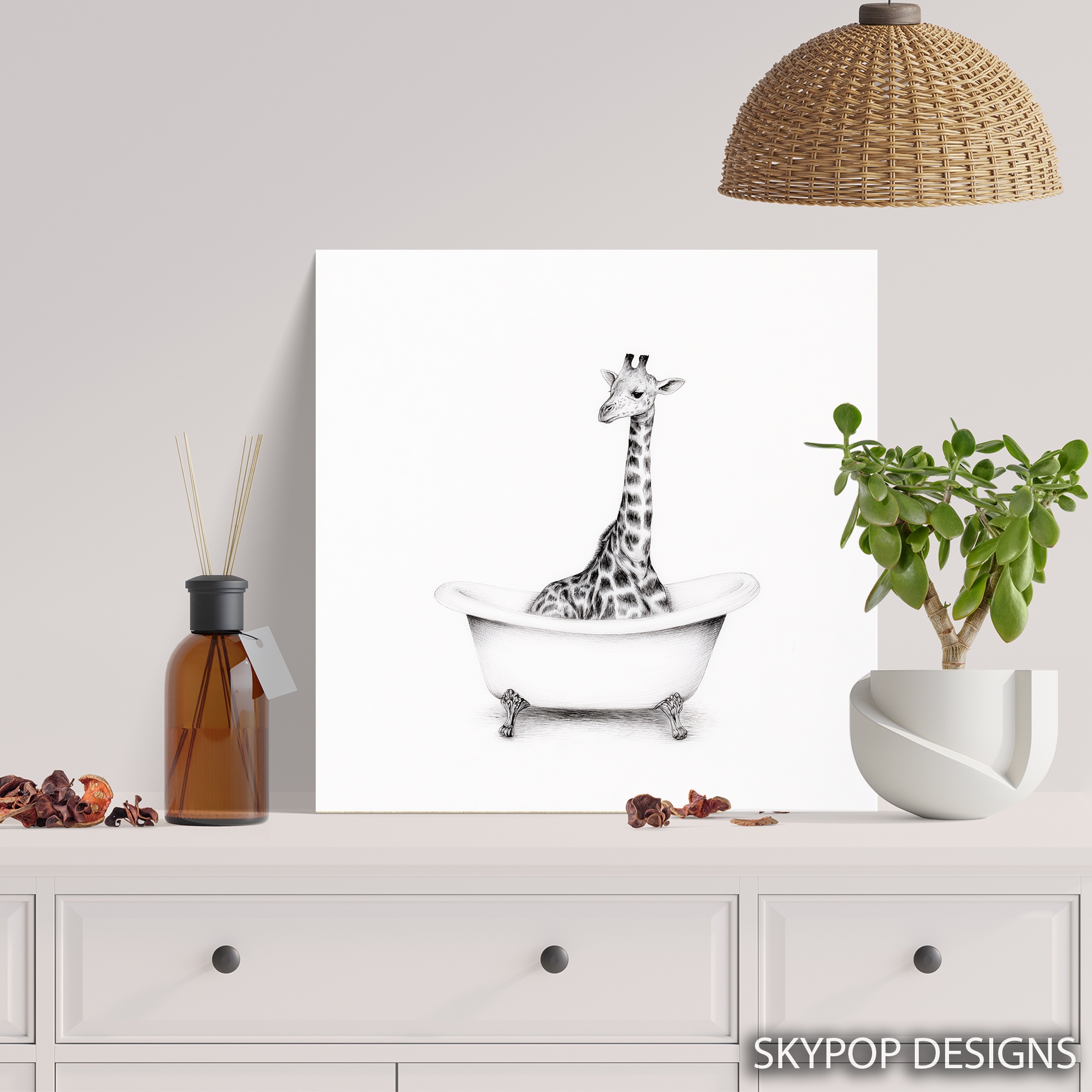 Elevate your space with this whimsical giraffe canvas wall art that brings a touch of humor and charm to any room. This striking poster features a tall giraffe comically situated in a classic clawfoot bathtub, creating an unexpected and delightful scene. Perfect for modern bathrooms or as a quirky accent in living rooms, this canvas art instantly becomes a conversation starter. The minimalist black and white design allows the surreal image to take center stage, making it an ideal complement to Scandinavian or contemporary decor styles. Transform your bedroom or office with this playful yet sophisticated piece that adds personality without overwhelming your existing color scheme. The intricate pencil-like details capture every spot on the giraffe’s coat and the texture of the bathtub, showcasing high-quality printing that ensures longevity. This versatile wall art works wonderfully as a standalone statement piece or as part of a gallery wall, adding a touch of whimsy to clean, modern spaces. Great as a housewarming gift or to inject some fun into your own home, this giraffe bathtub art celebrates the joy of the unexpected in interior design. The large-scale giraffe contrasted with the small bathtub creates a visually engaging composition that draws the eye and sparks imagination. Whether you’re a animal lover or simply appreciate unique wall decor, this canvas poster offers a perfect blend of artistry and humor. Enhance your living space today with this captivating and playful giraffe artwork that’s sure to bring smiles for years to come.